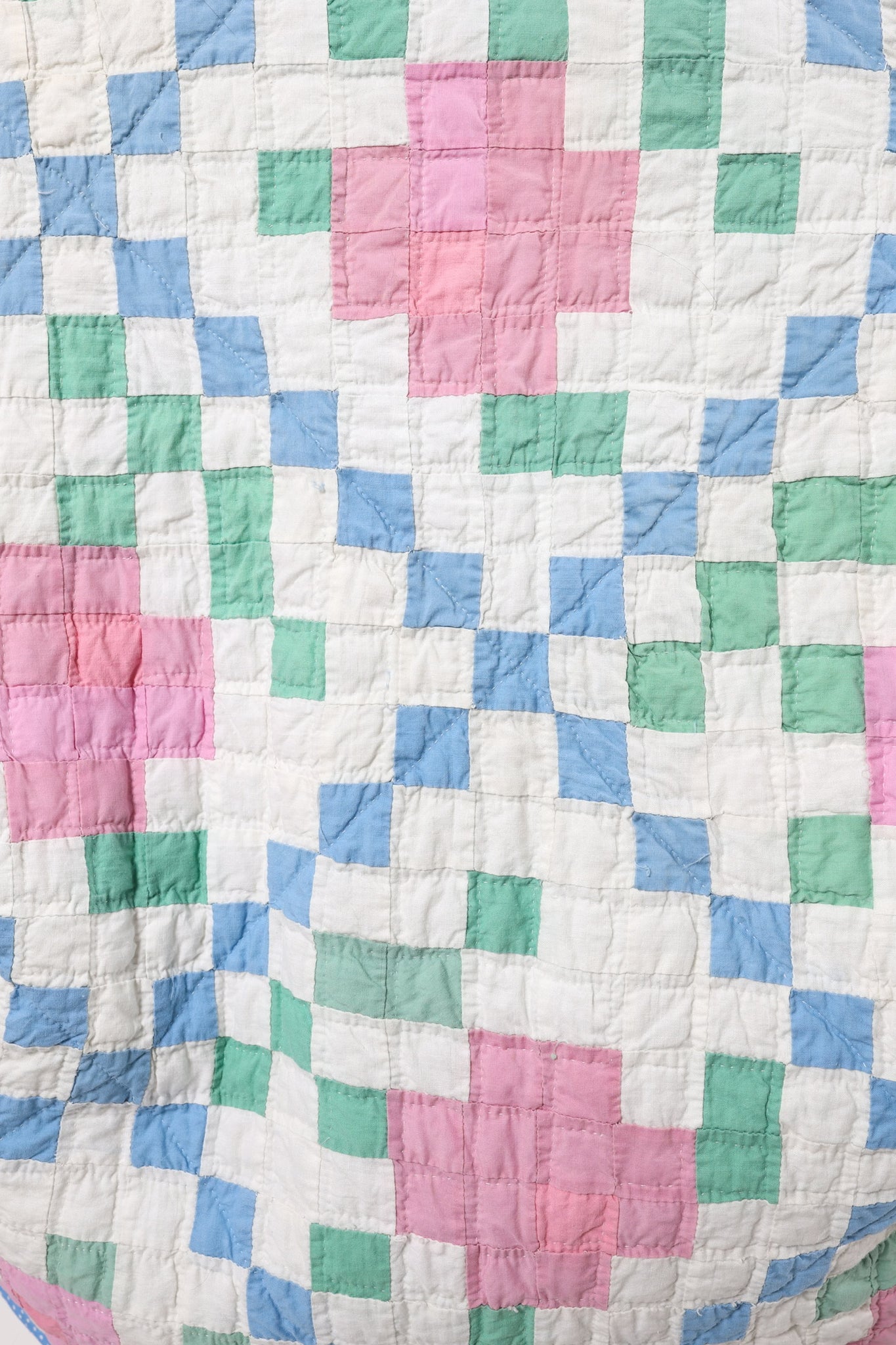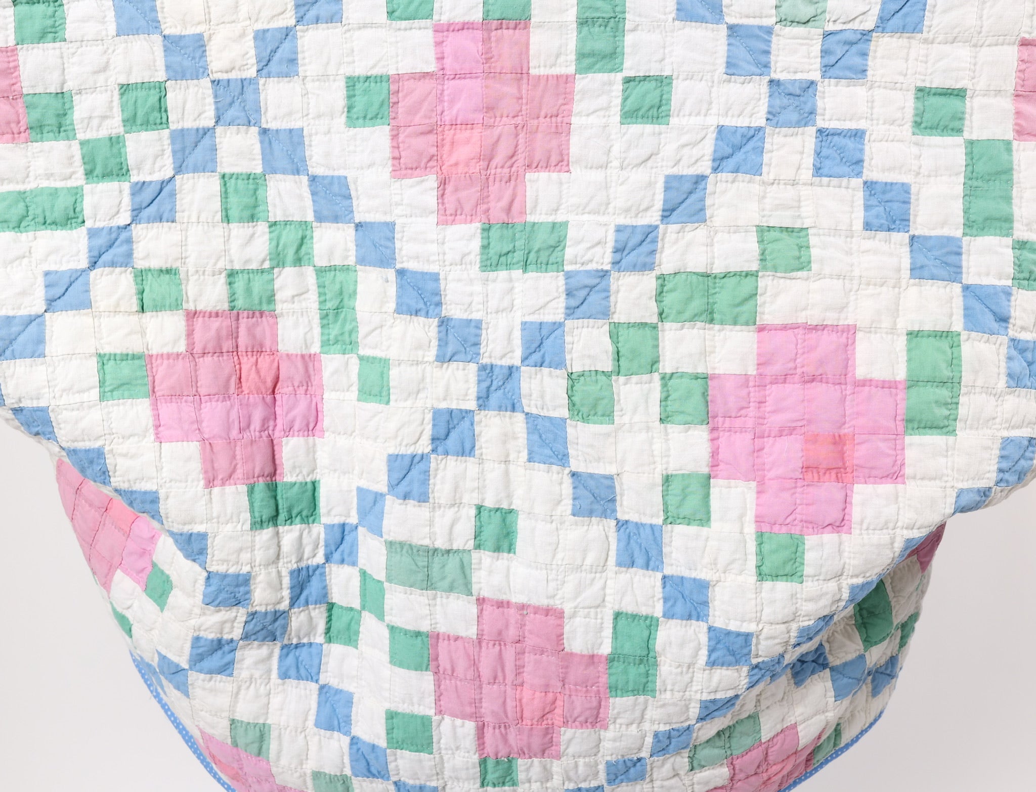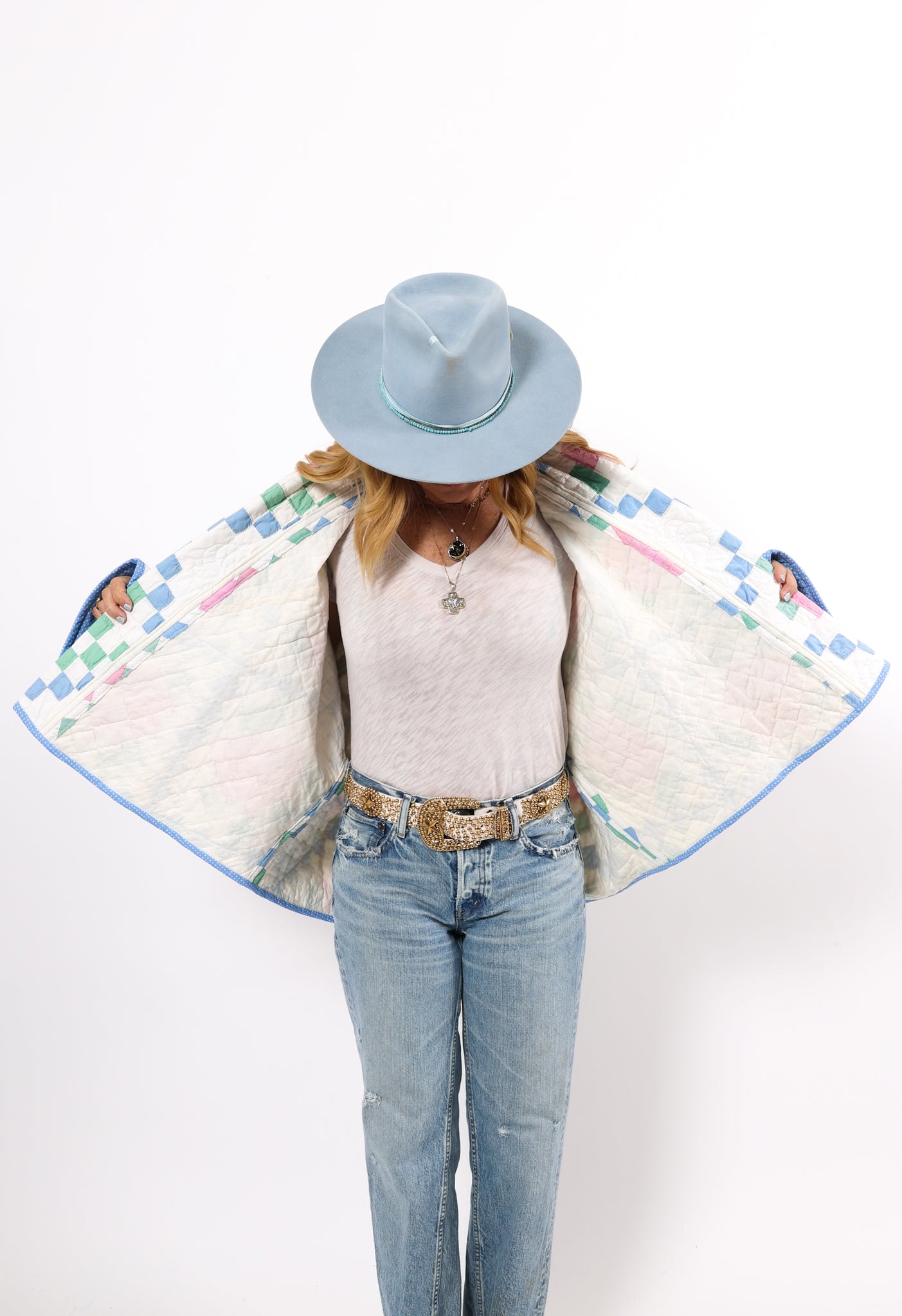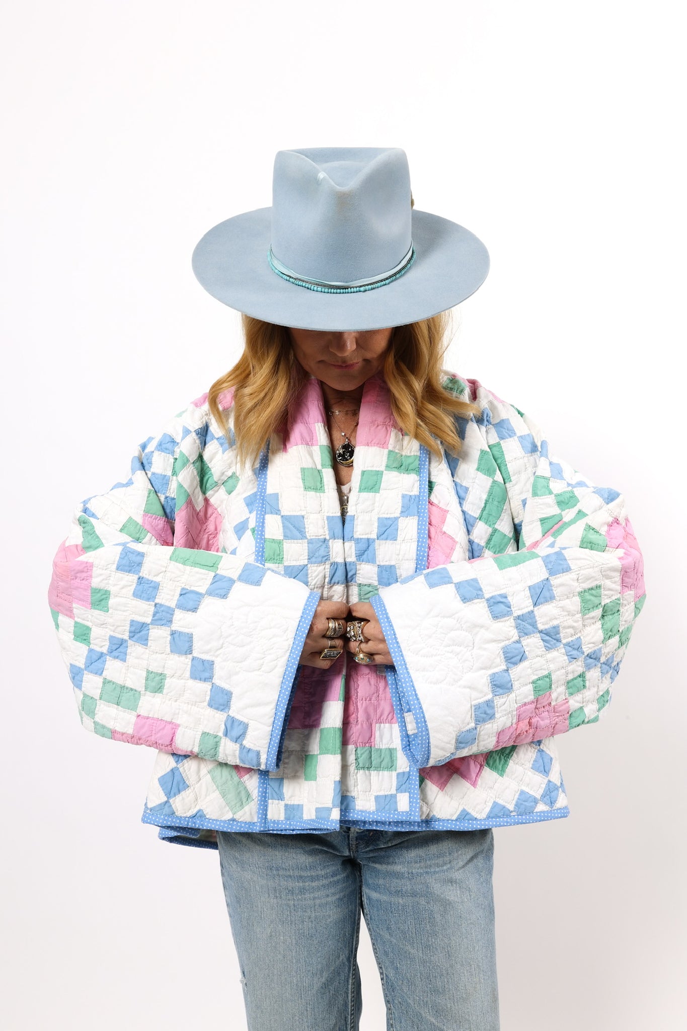This is an American antique quilt started in 1935 and completed in 1936 by Kittie J. Loughlin. We know this because Kittie hand embroidered her name and these dates into the quilt. Kittie beautifully hand quilted and hand sewed this quilt, which is a labor of love and a lost art. It is a traditional Irish Chain quilt pattern with the addition of flowers inside the Irish Chain. The quilt is absolutely gorgeous. In our opinion, the quilt is thin, soft, lightweight, and has a super flattering drape. Please note to add interest and fun to the piece we lined the sleeves with coordinating blue polka dot fabric. You will want to cuff the sleeves to show this off! If you have further questions, please direct message us and we are happy to send you a video.