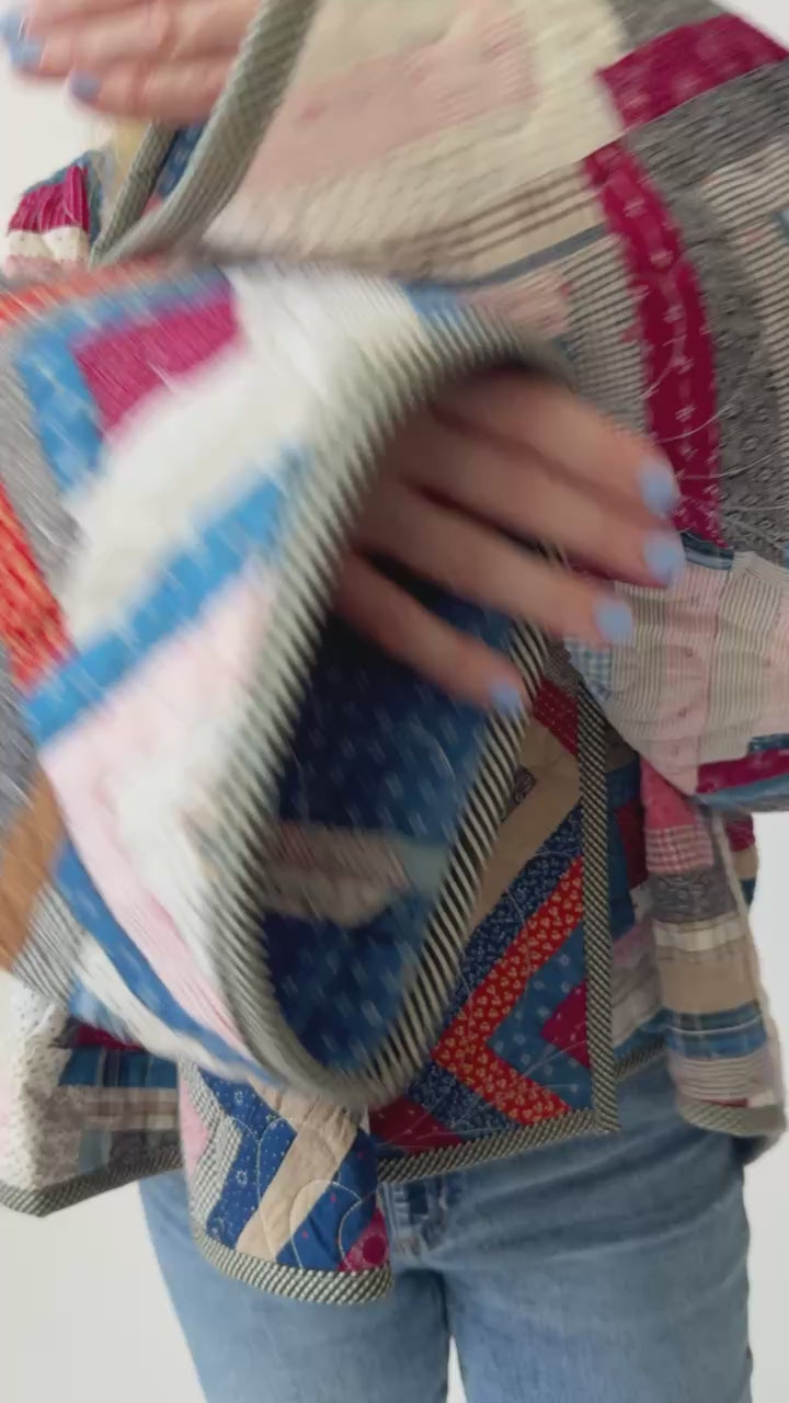 This is an antique American quilt top made circa 1880s to 1920s. It is a traditional Sunshine and Shadows quilt pattern. The quilt was made by combining an orphaned quilt top and reproduction indigo fabric. The quilt top is overflowing with rare and valuable turn-of-the-century fabrics, it acts as a textile time capsule. This jacket is a fashion multitasker, it looks great when worn inside out and upside down. You will want to use this everyday as it goes great with denim and all kinds of black. The quilt top was hand sewn and the piece was quilted by Zoe Dawn. In our opinion, the jacket is thin and lightweight. The drape will get better with every wear. Please note there is a small age spot on the front of the jacket, but it blends into the fabrics. If you have further questions, please direct message us and we are happy to send you a video.