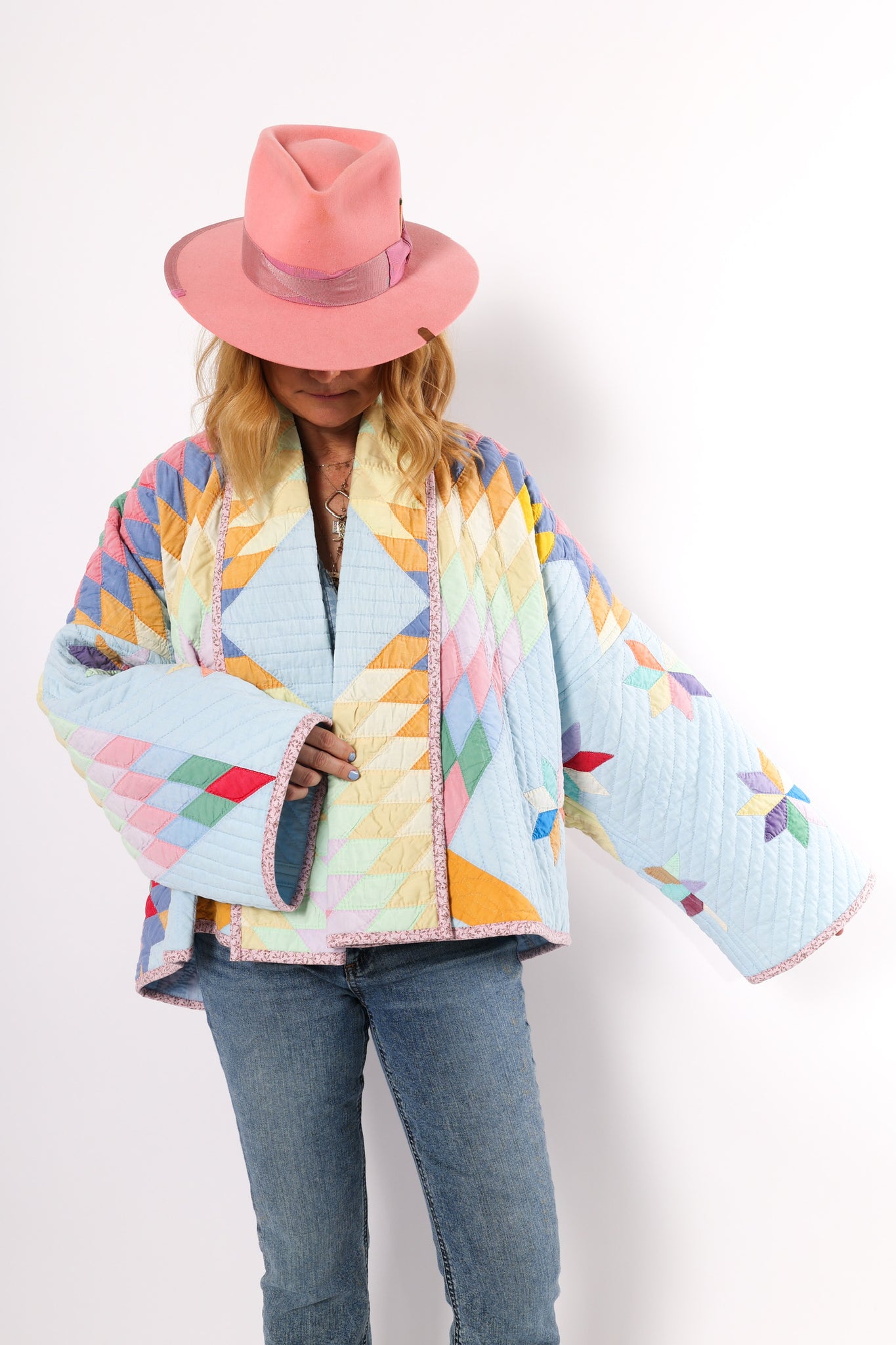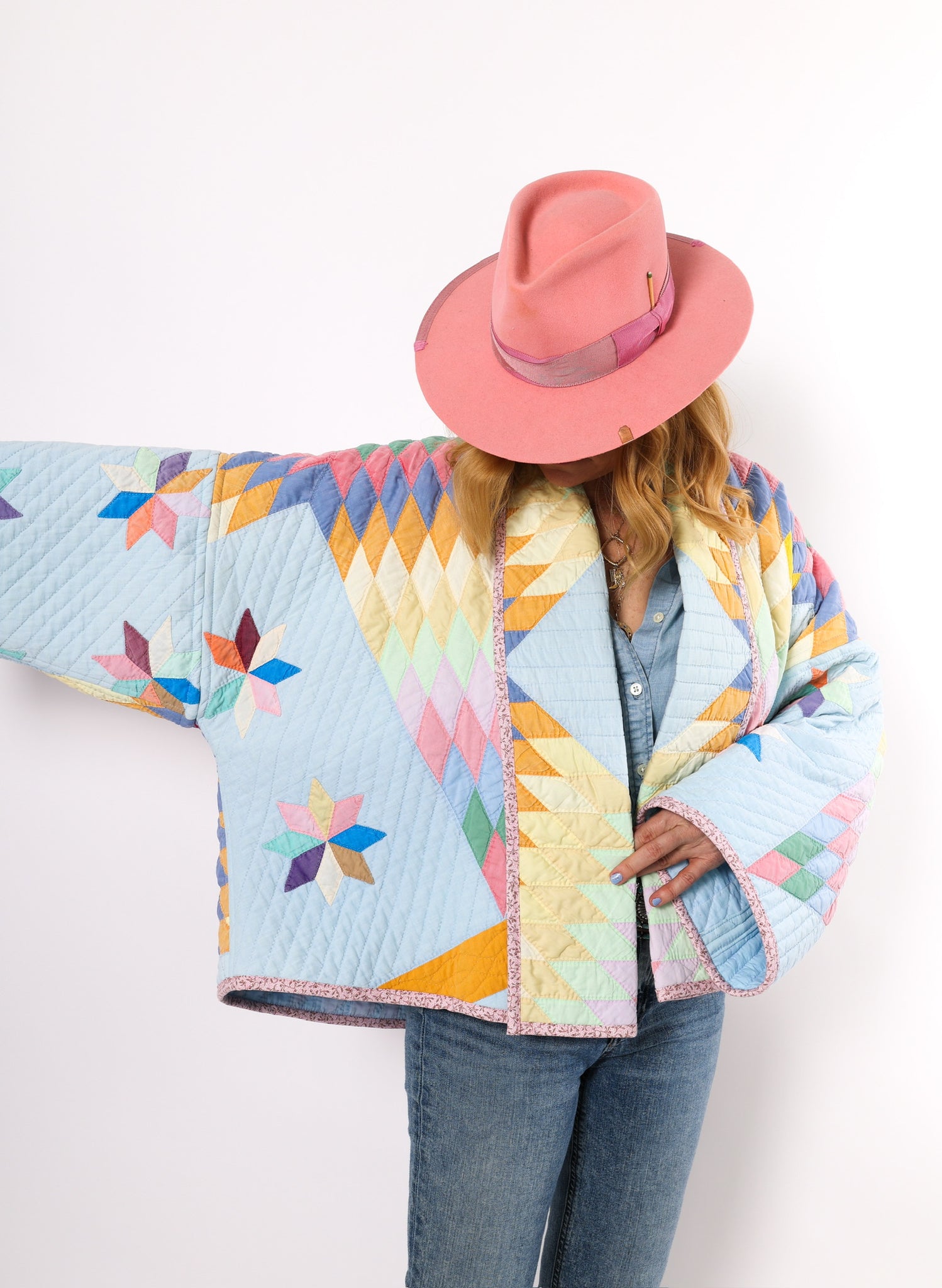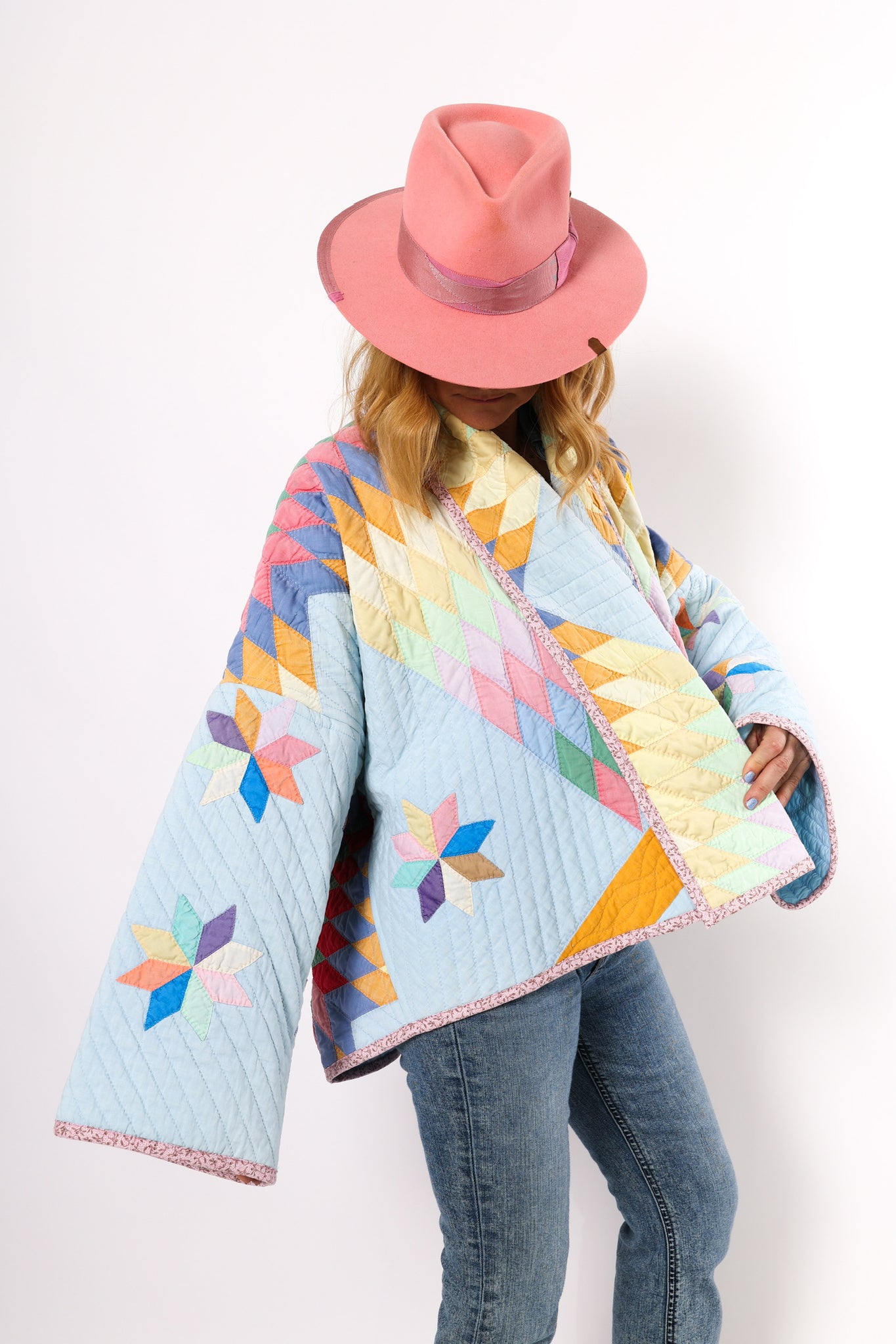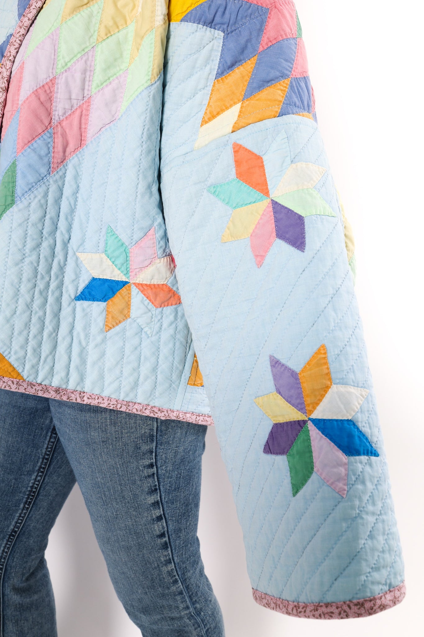 This is an antique American quilt made circa 1930s to 1960s. It is an elevated Lone Star quilt pattern with extra satellite stars. The quilt has been hand sewn and meticulously hand quilted. It is museum-worthy for its crisp points and tiny pieces. It is an absolute masterpiece! The maker used very luxe soft cotton. In our opinion, the jacket is thin, lightweight, has very little loft, and has an excellent drape. This piece is very comfy to wear. Please note, there a very small zig zag mend which we have captured in a photograph. We love the baby blue palette. This piece will look excellent with white jeans or cut offs. This is the perfect spring jacket! If you have further questions, please direct message us and we are happy to send you a video.