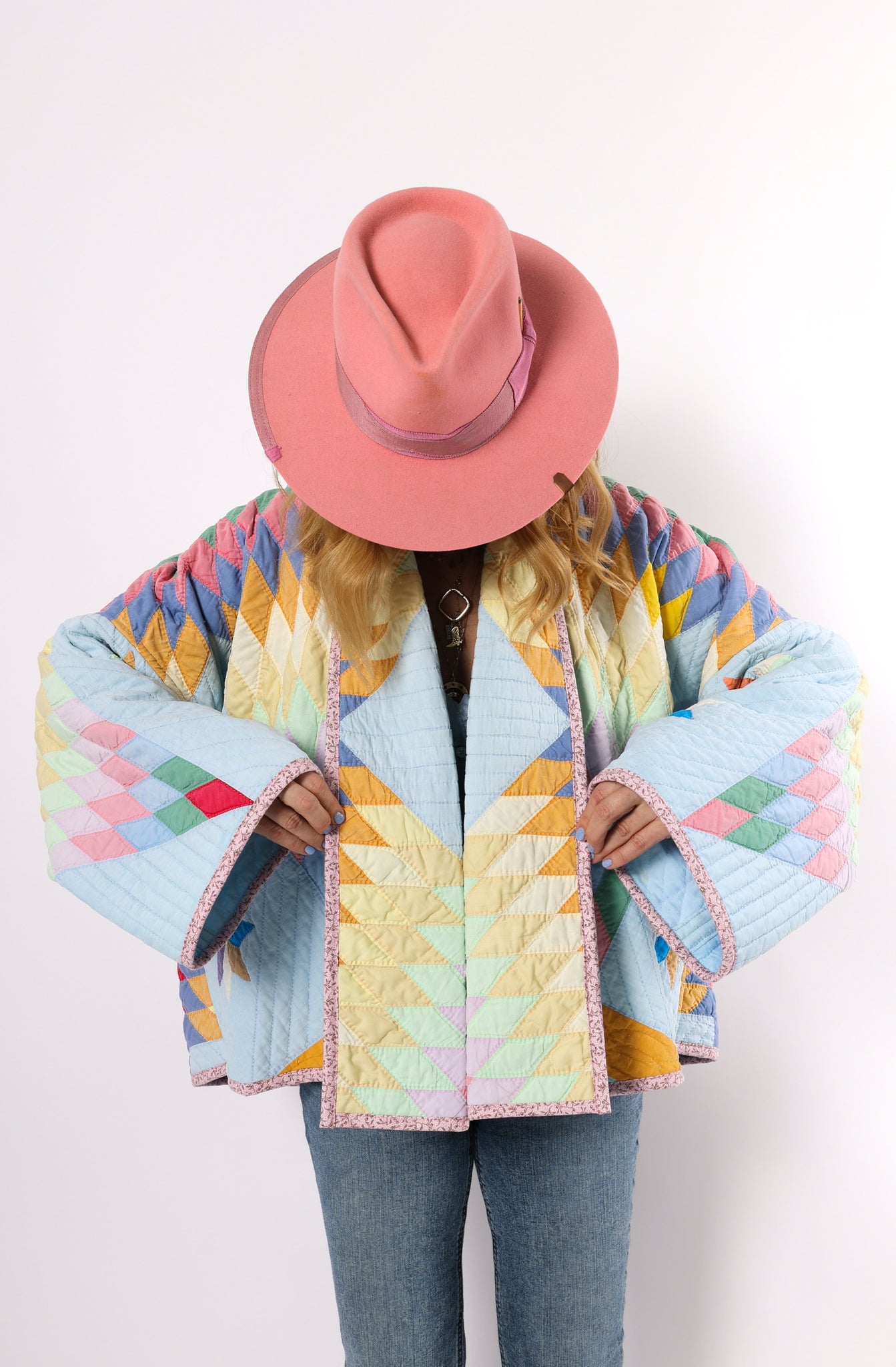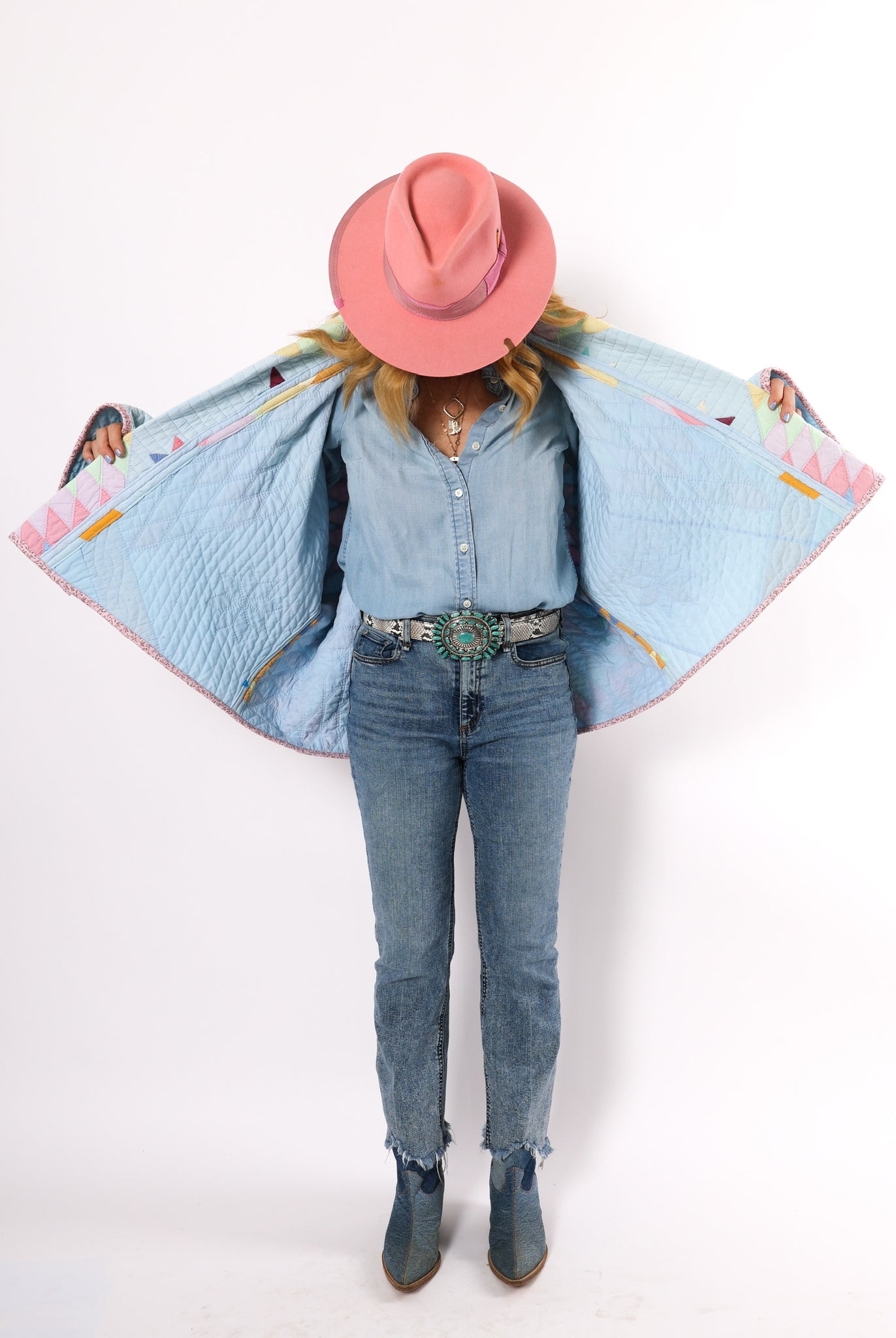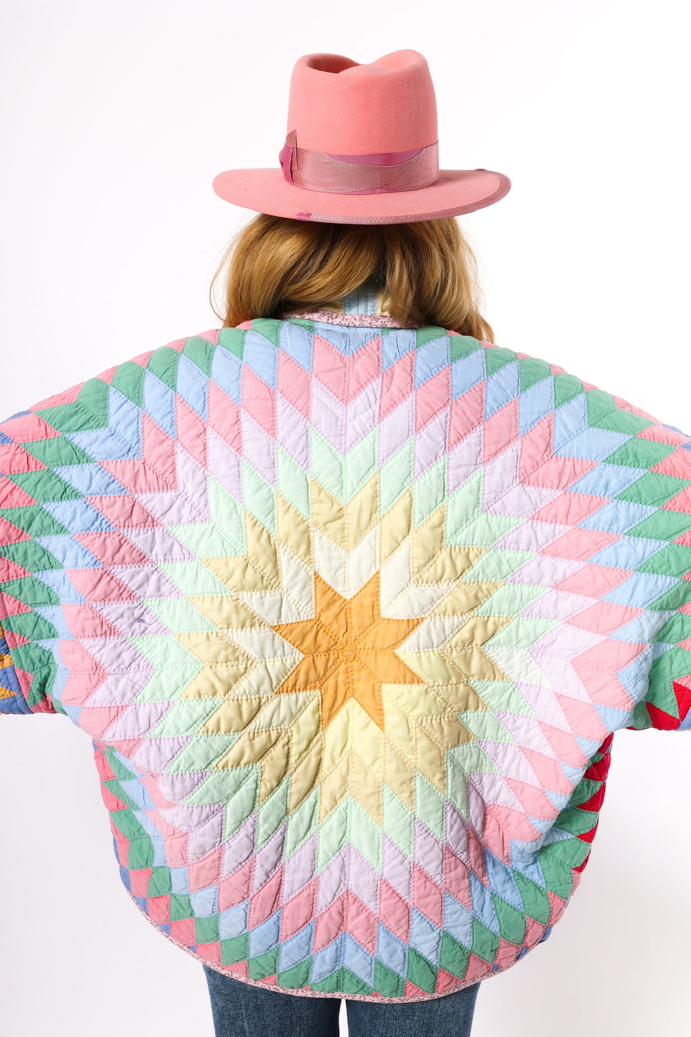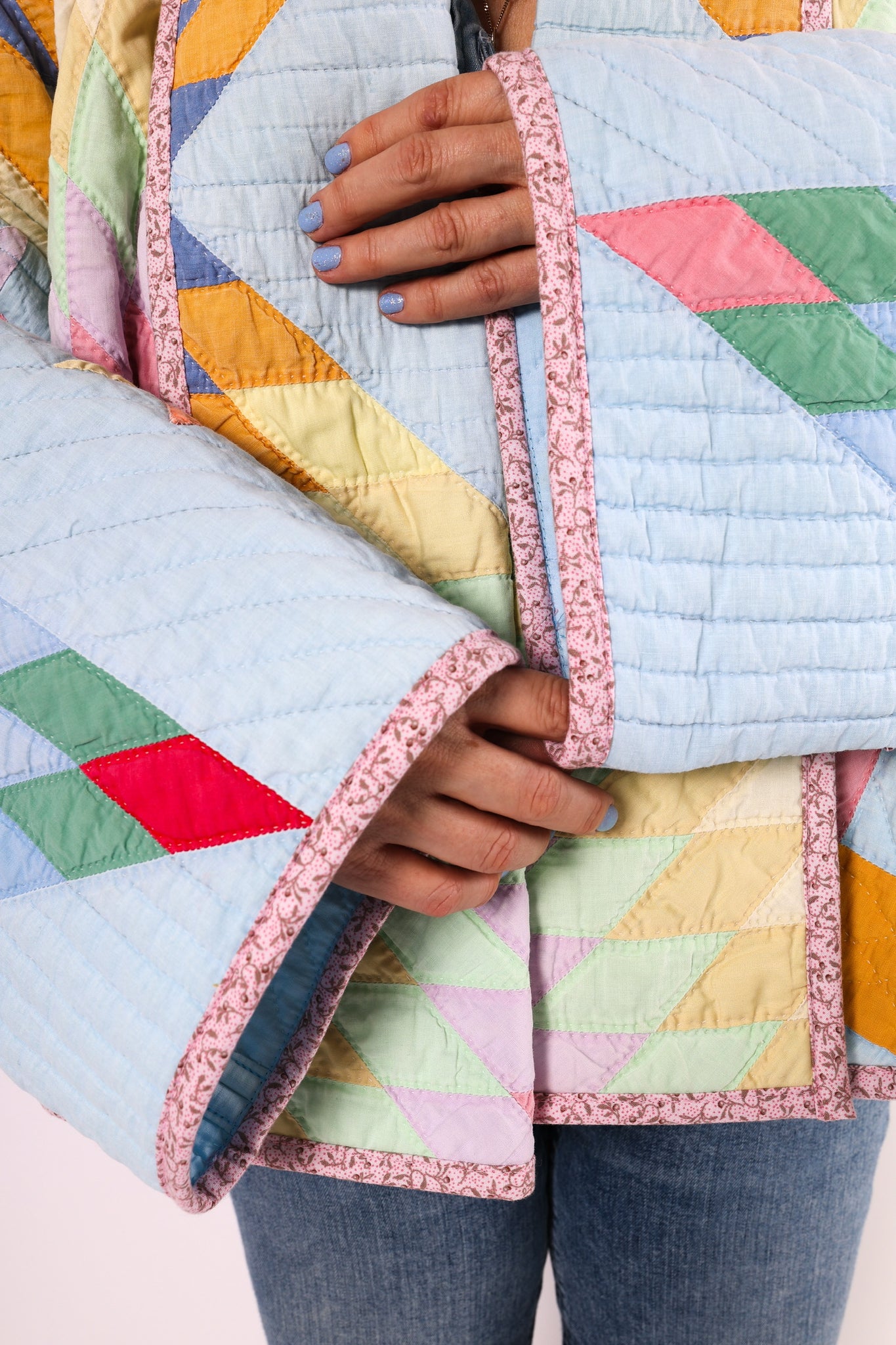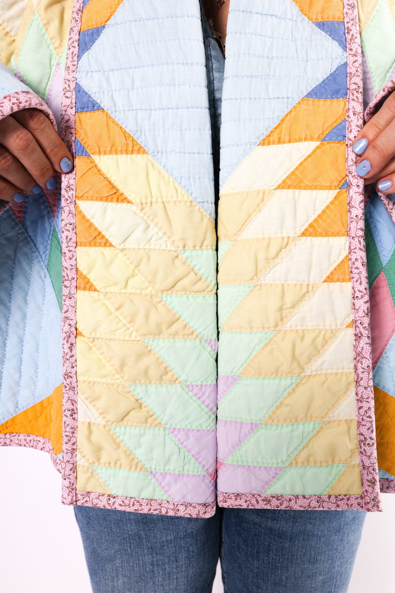 This is an antique American quilt made circa 1930s to 1960s. It is an elevated Lone Star quilt pattern with extra satellite stars. The quilt has been hand sewn and meticulously hand quilted. It is museum-worthy for its crisp points and tiny pieces. It is an absolute masterpiece! The maker used very luxe soft cotton. In our opinion, the jacket is thin, lightweight, has very little loft, and has an excellent drape. This piece is very comfy to wear. Please note, there a very small zig zag mend which we have captured in a photograph. We love the baby blue palette. This piece will look excellent with white jeans or cut offs. This is the perfect spring jacket! If you have further questions, please direct message us and we are happy to send you a video.