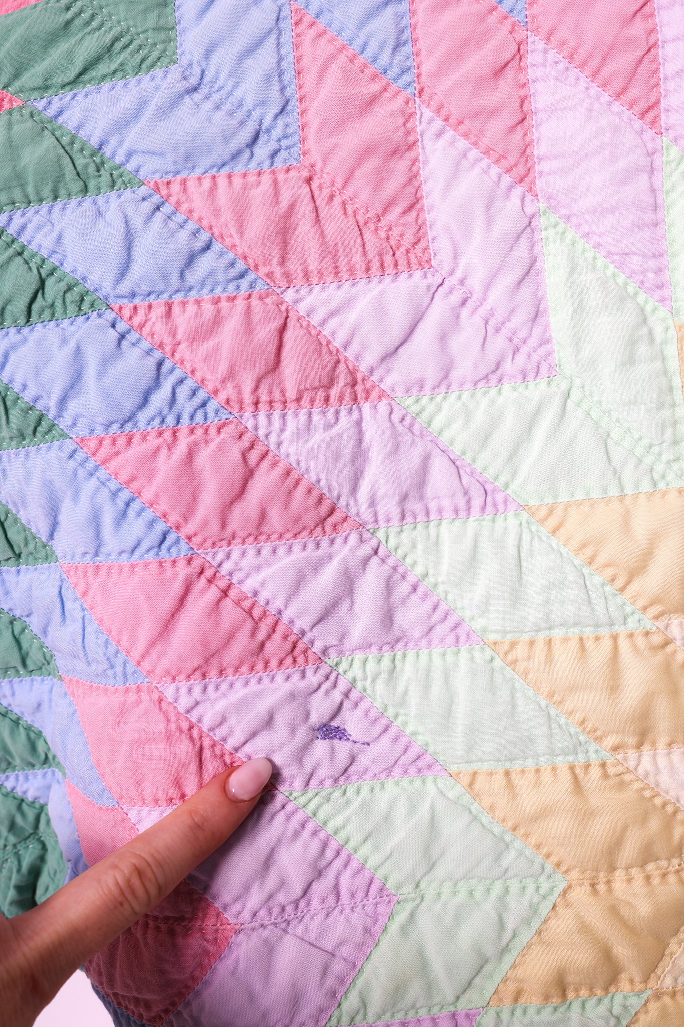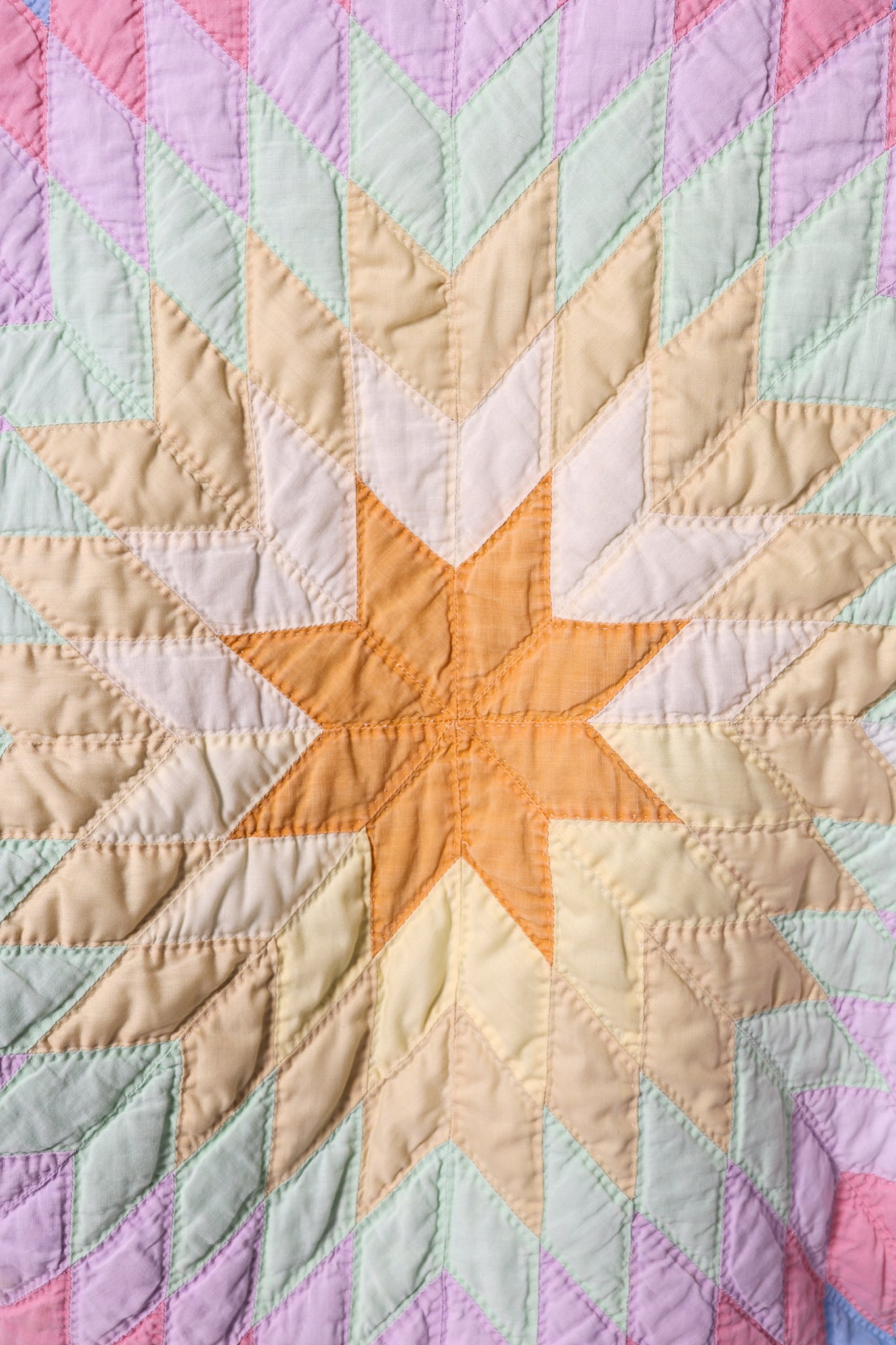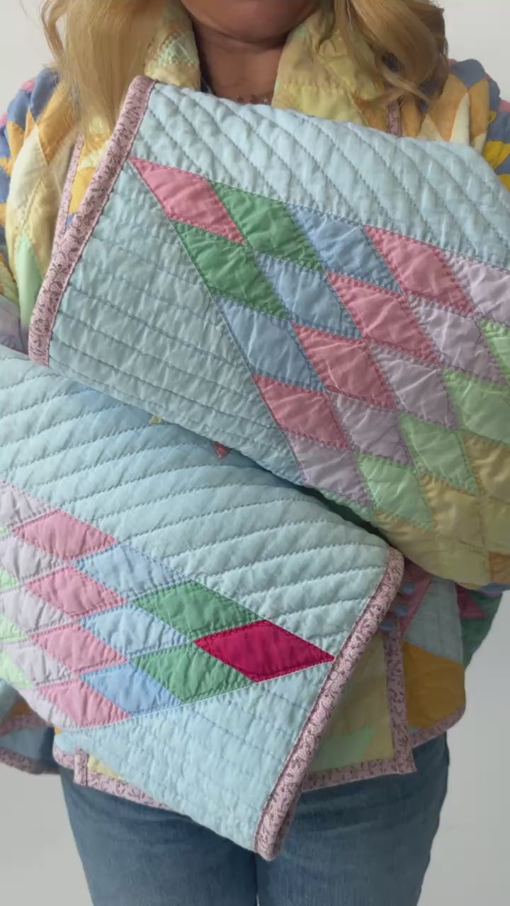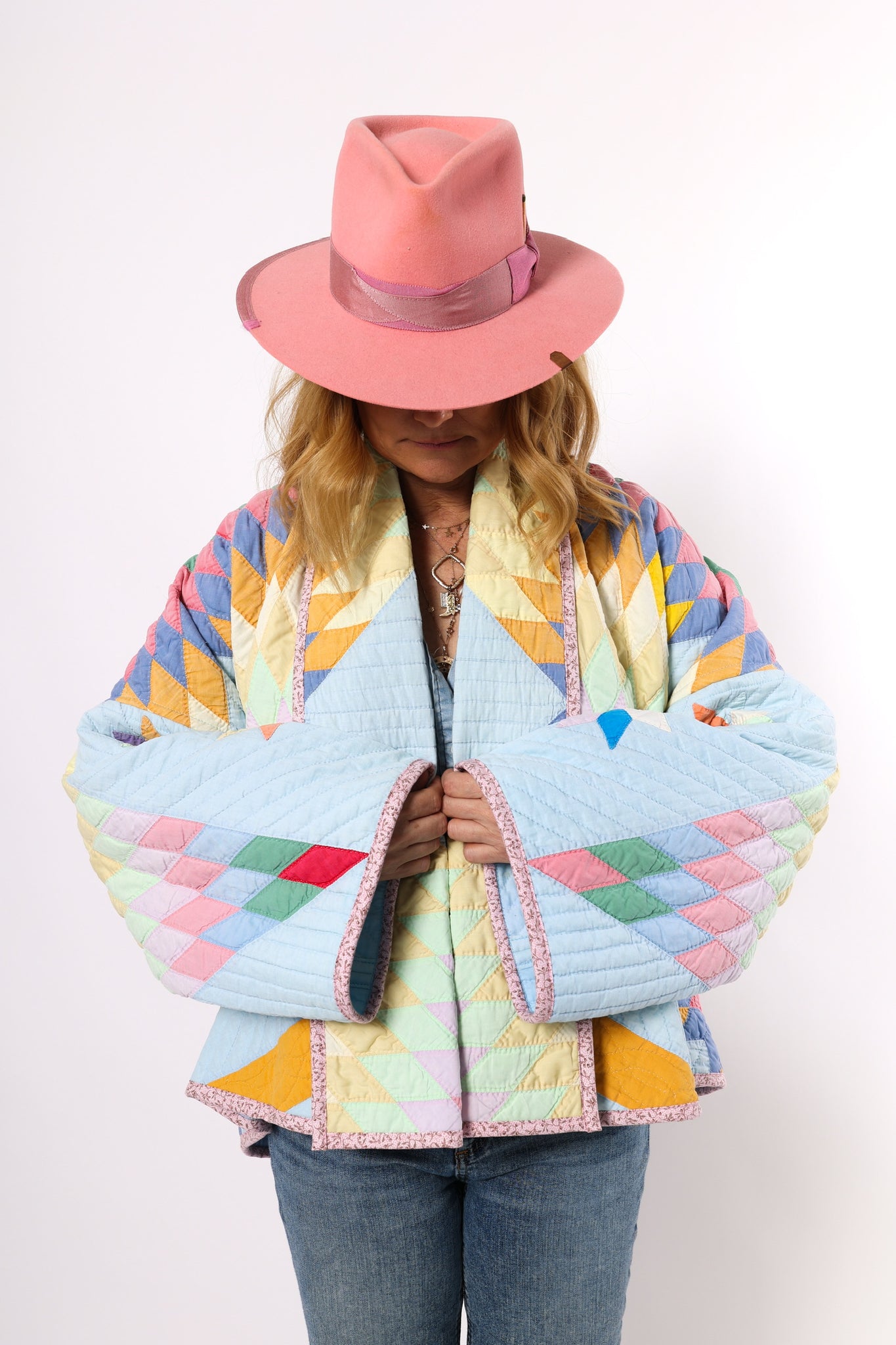 This is an antique American quilt made circa 1930s to 1960s. It is an elevated Lone Star quilt pattern with extra satellite stars. The quilt has been hand sewn and meticulously hand quilted. It is museum-worthy for its crisp points and tiny pieces. It is an absolute masterpiece! The maker used very luxe soft cotton. In our opinion, the jacket is thin, lightweight, has very little loft, and has an excellent drape. This piece is very comfy to wear. Please note, there a very small zig zag mend which we have captured in a photograph. We love the baby blue palette. This piece will look excellent with white jeans or cut offs. This is the perfect spring jacket! If you have further questions, please direct message us and we are happy to send you a video.