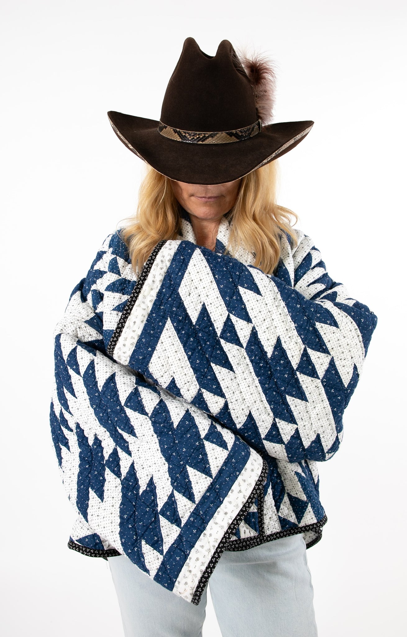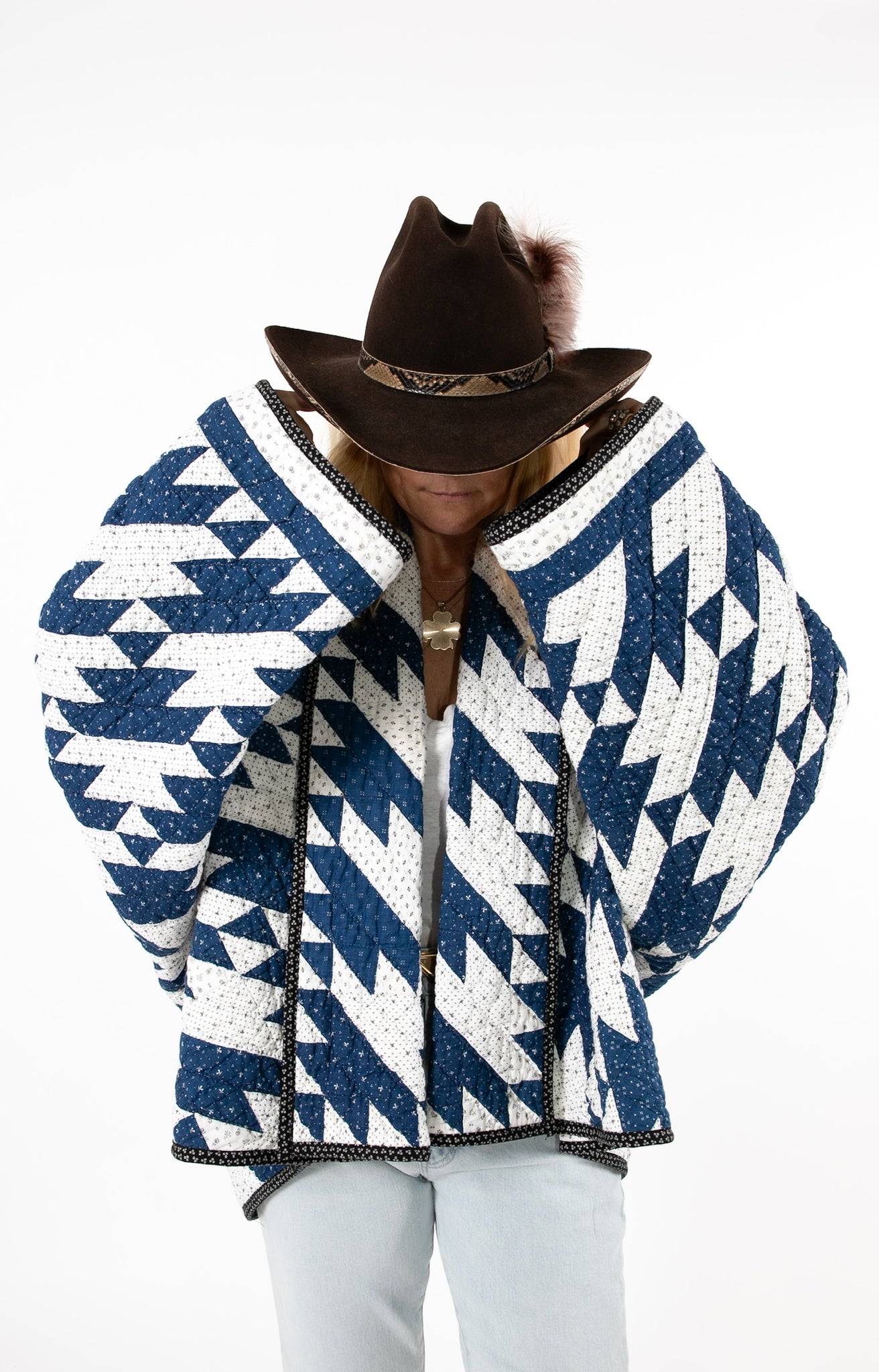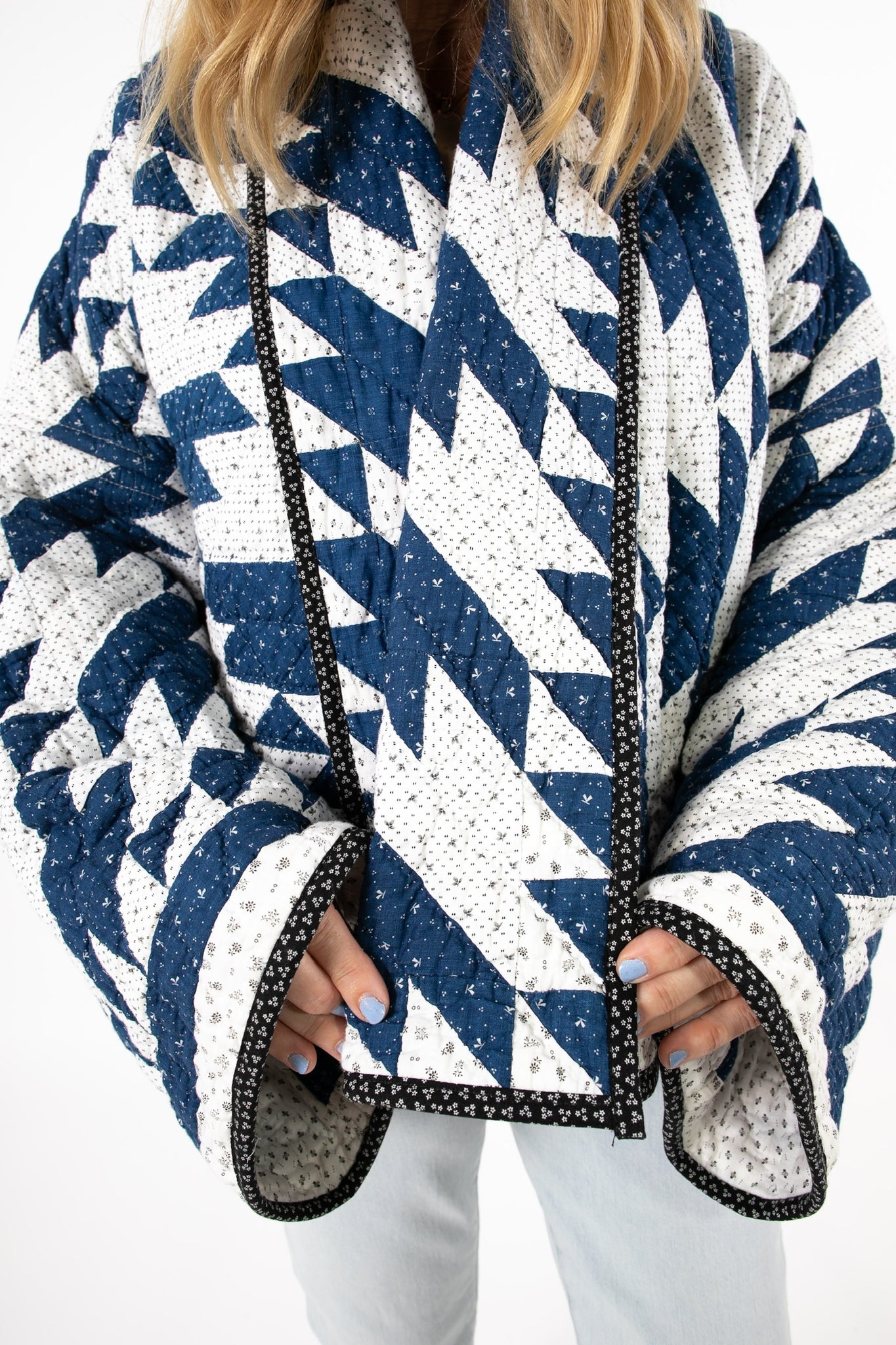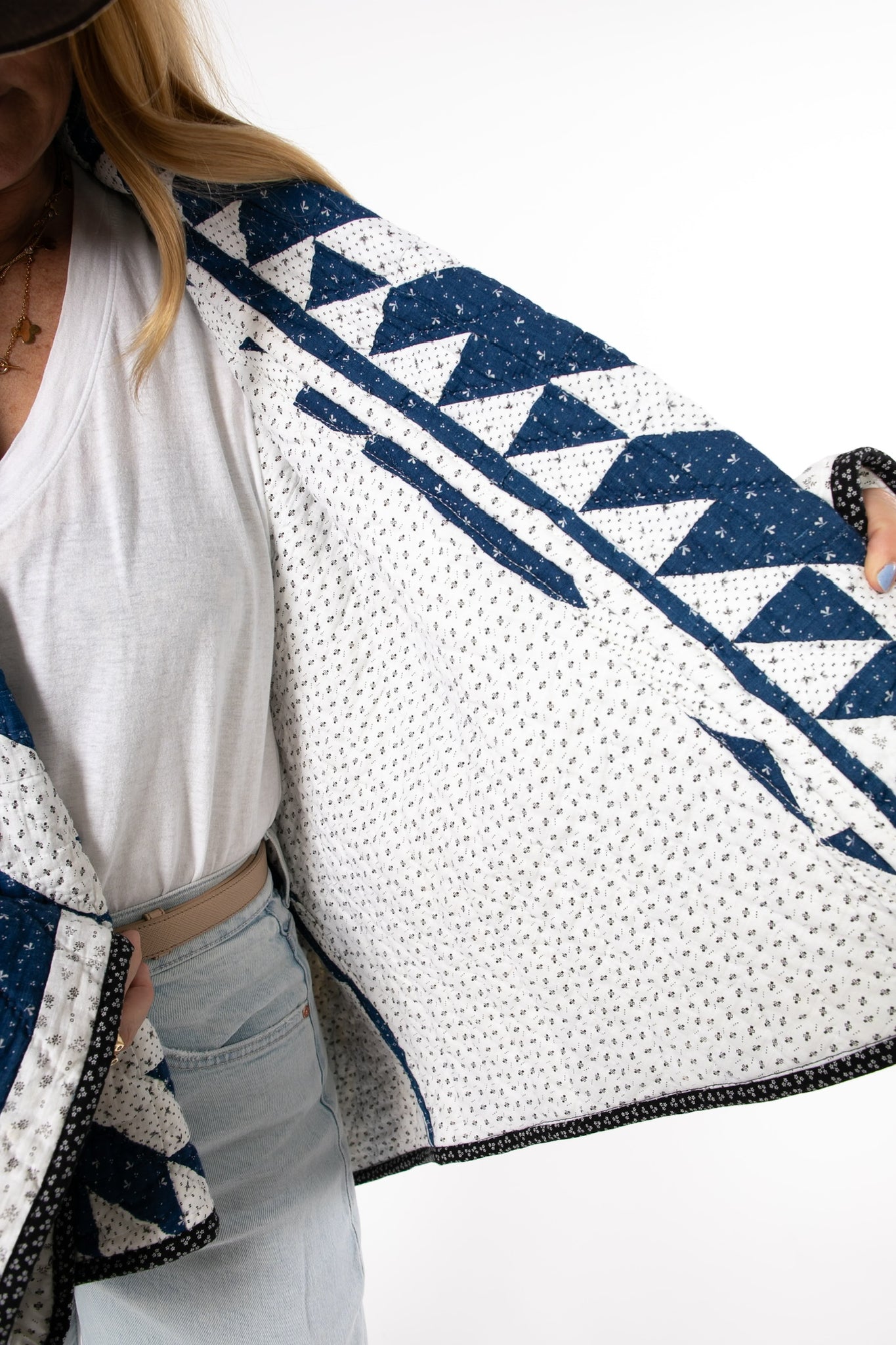 This is an antique American quilt made circa 1890s to 1920s. This is a traditional The Lost Ship quilt pattern. The quilt has been beautifully hand quilted and hand sewn, which is a labor of love and a lost art. This piece is overflowing with very rare and highly collectible indigo fabric. These indigo quilts are becoming harder and harder to find, we are very proud to offer this one in our collection. In our opinion, the jacket is lightweight with medium loft (puffiness). We do not recommend this for a warmer climate because of its medium loft, not weight but puffiness. The jacket was made with very luxe and soft cotton. This quilt did not come from a humble home, the backing fabric(inside of jacket) is a novelty fabric as well! It is in excellent condition for its age and it was made by a master. If you have further questions, please direct message us and we are happy to send you a video.