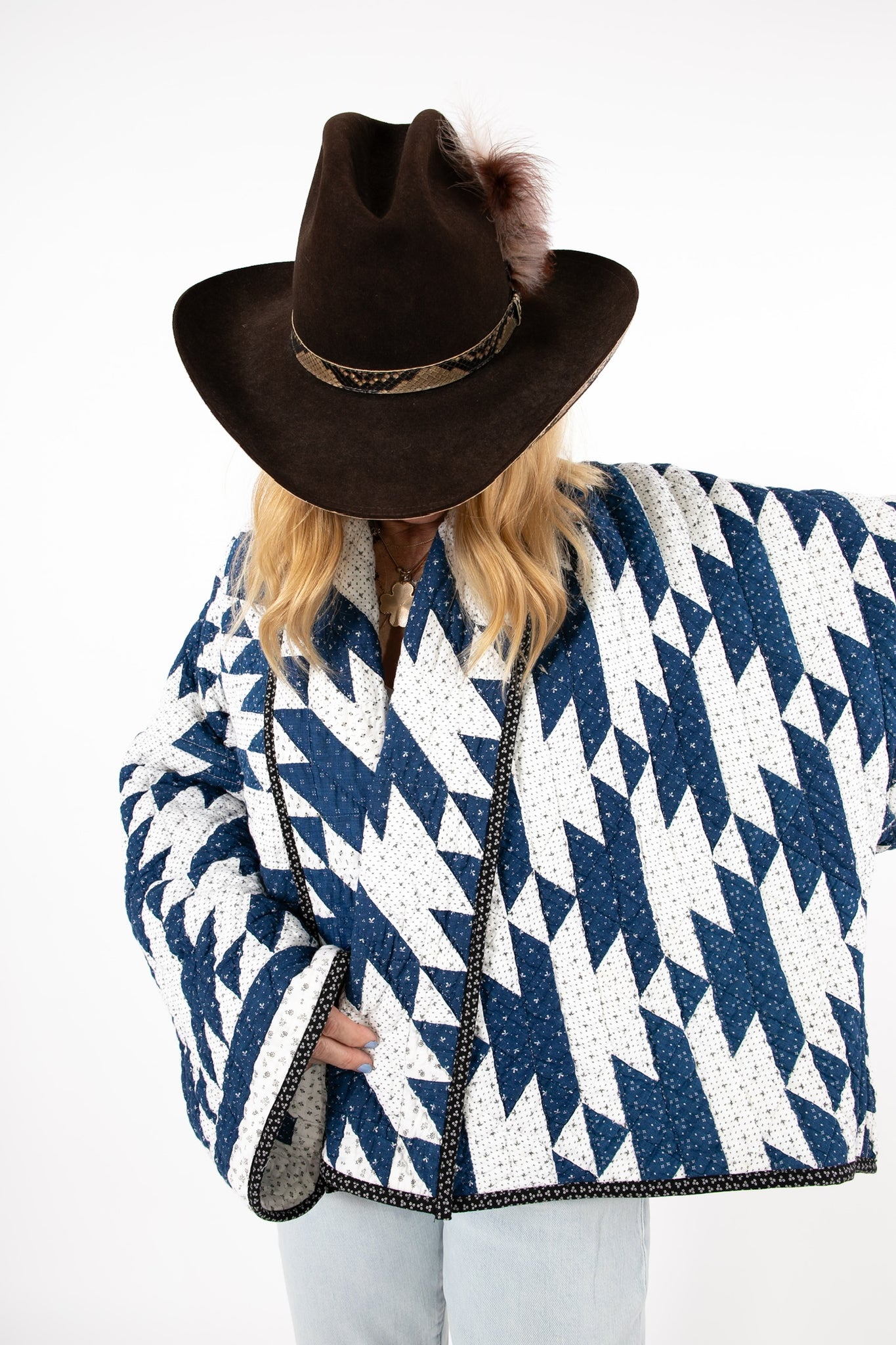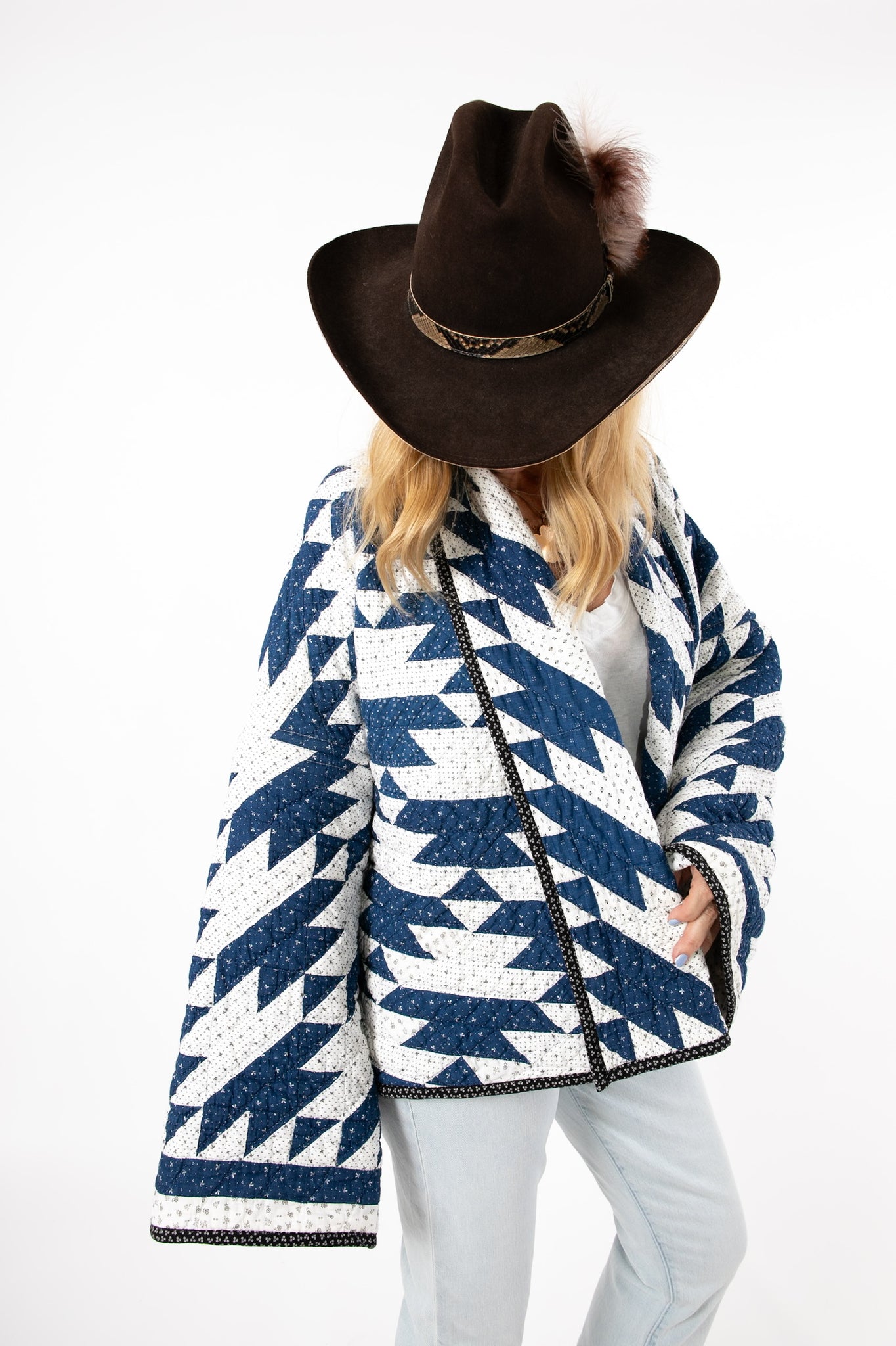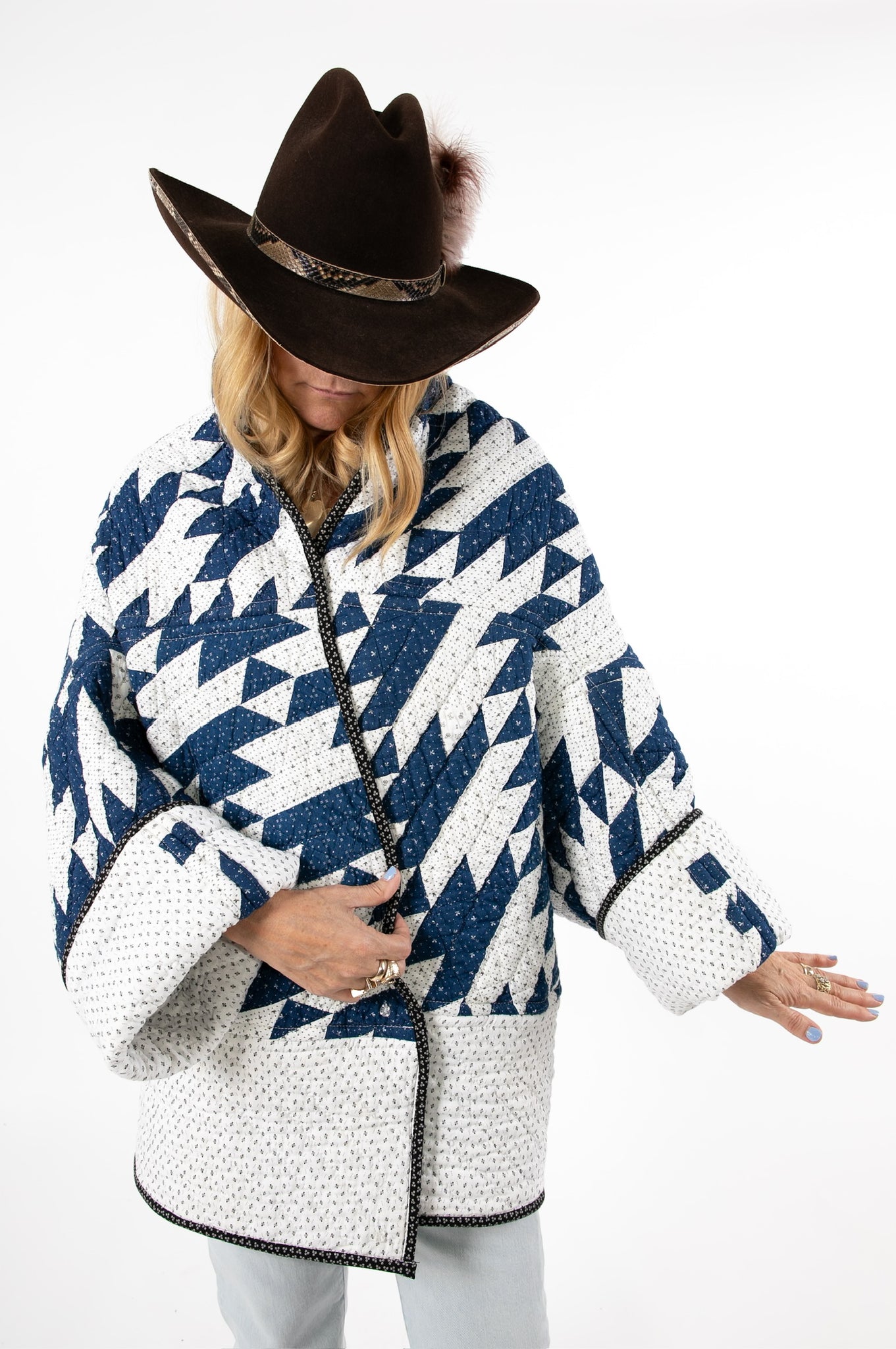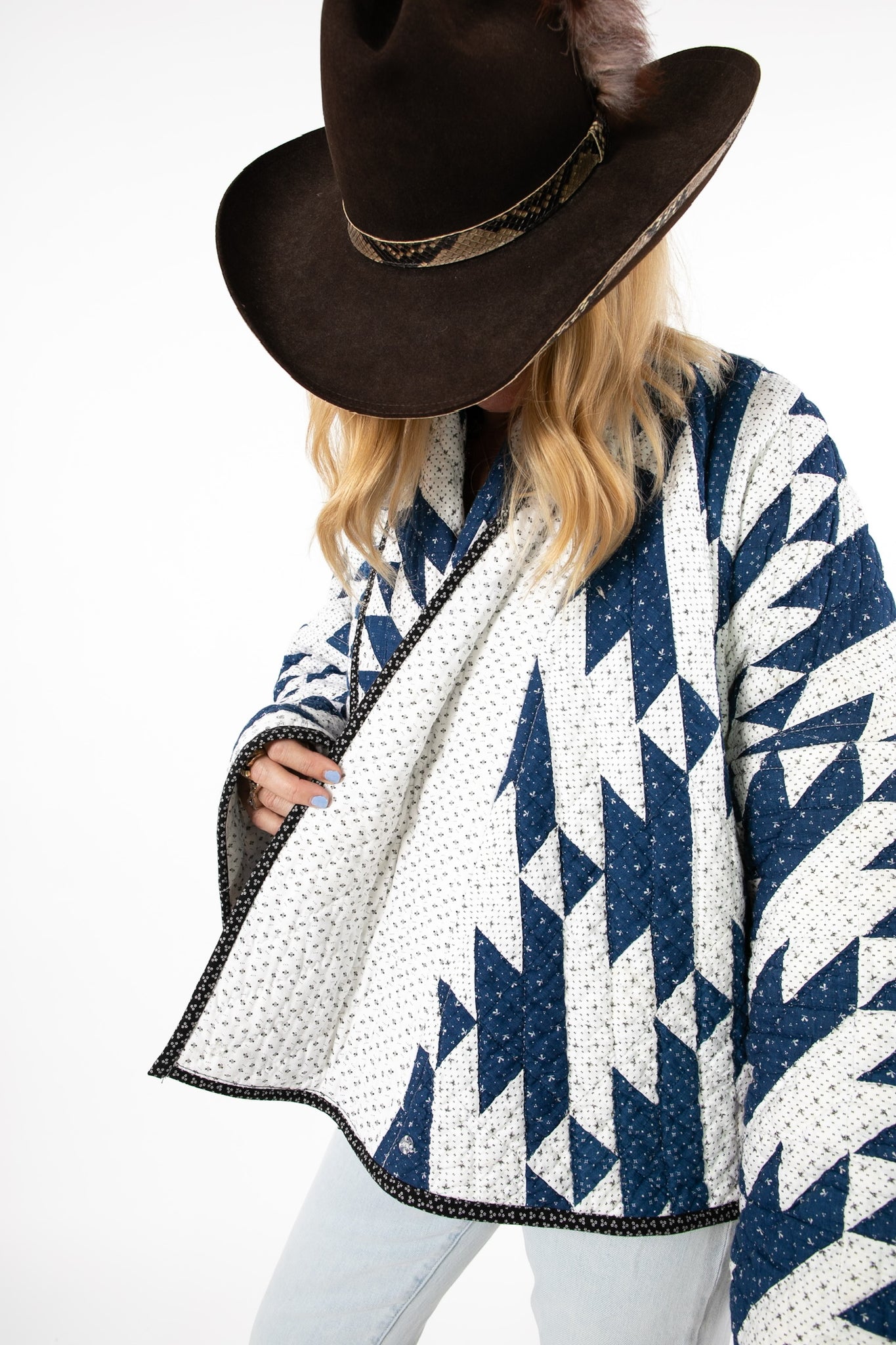 This is an antique American quilt made circa 1890s to 1920s. This is a traditional The Lost Ship quilt pattern. The quilt has been beautifully hand quilted and hand sewn, which is a labor of love and a lost art. This piece is overflowing with very rare and highly collectible indigo fabric. These indigo quilts are becoming harder and harder to find, we are very proud to offer this one in our collection. In our opinion, the jacket is lightweight with medium loft (puffiness). We do not recommend this for a warmer climate because of its medium loft, not weight but puffiness. The jacket was made with very luxe and soft cotton. This quilt did not come from a humble home, the backing fabric(inside of jacket) is a novelty fabric as well! It is in excellent condition for its age and it was made by a master. If you have further questions, please direct message us and we are happy to send you a video.