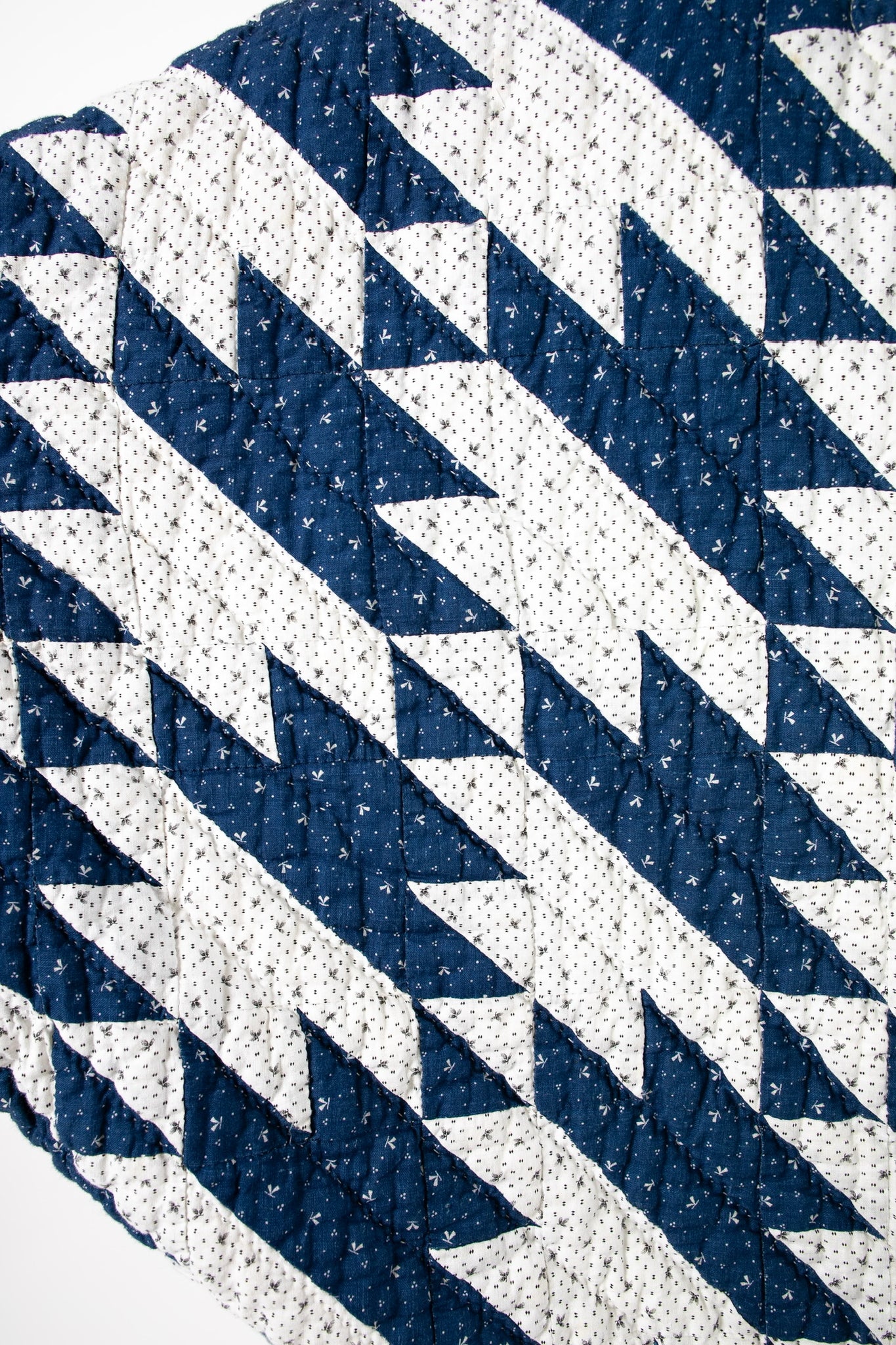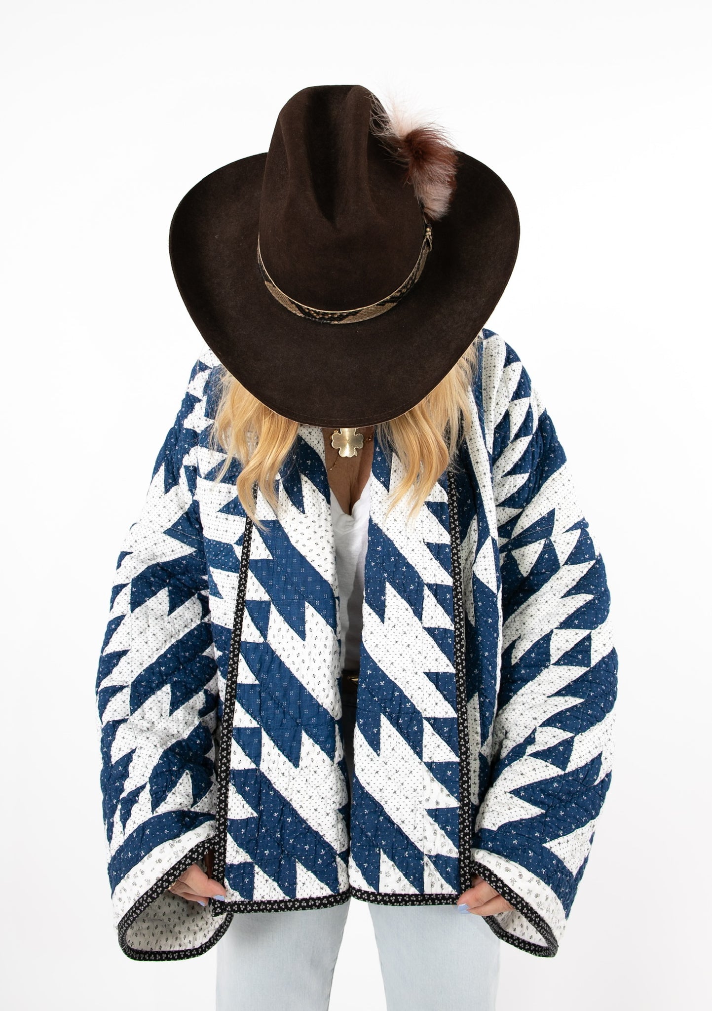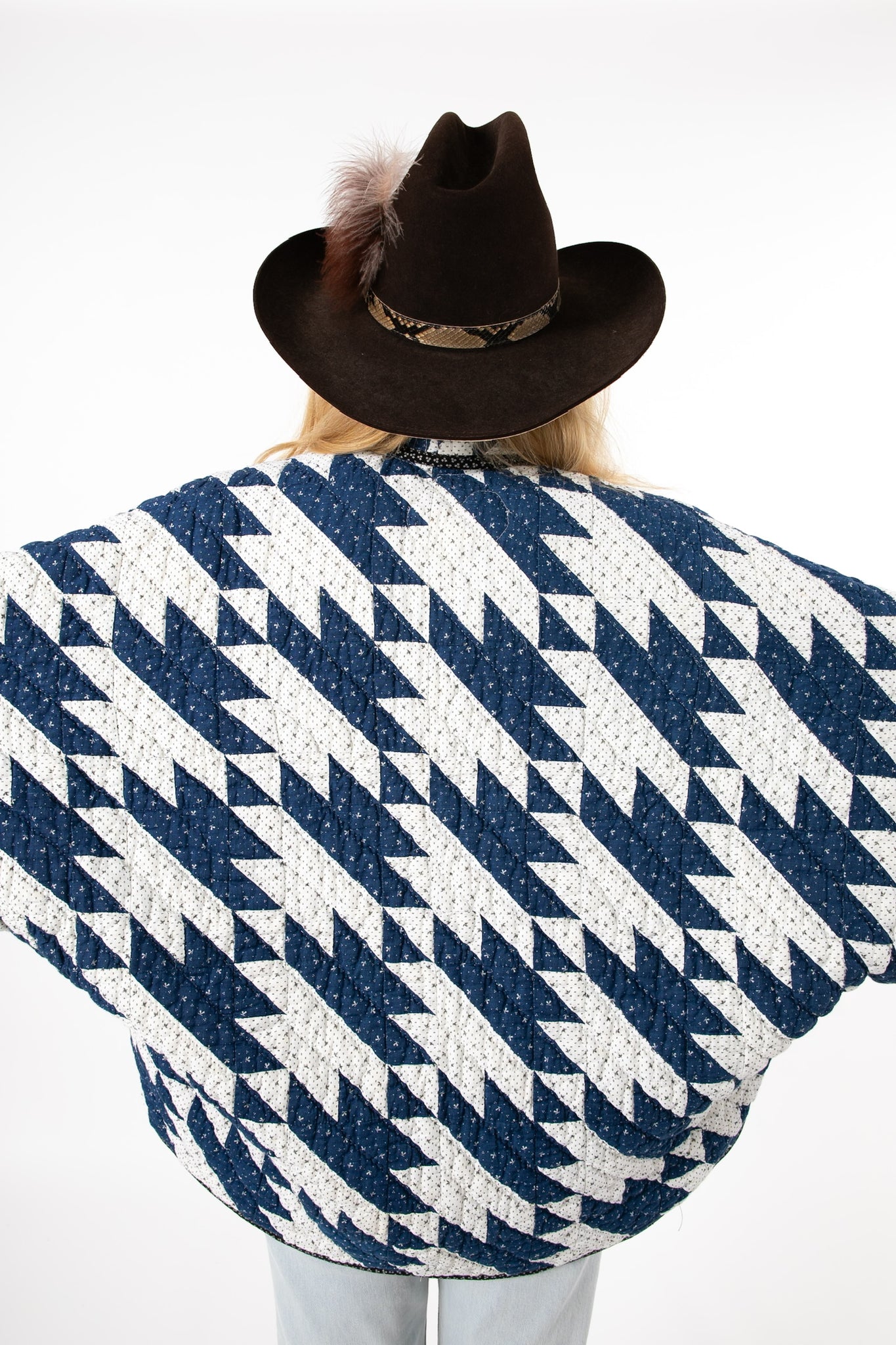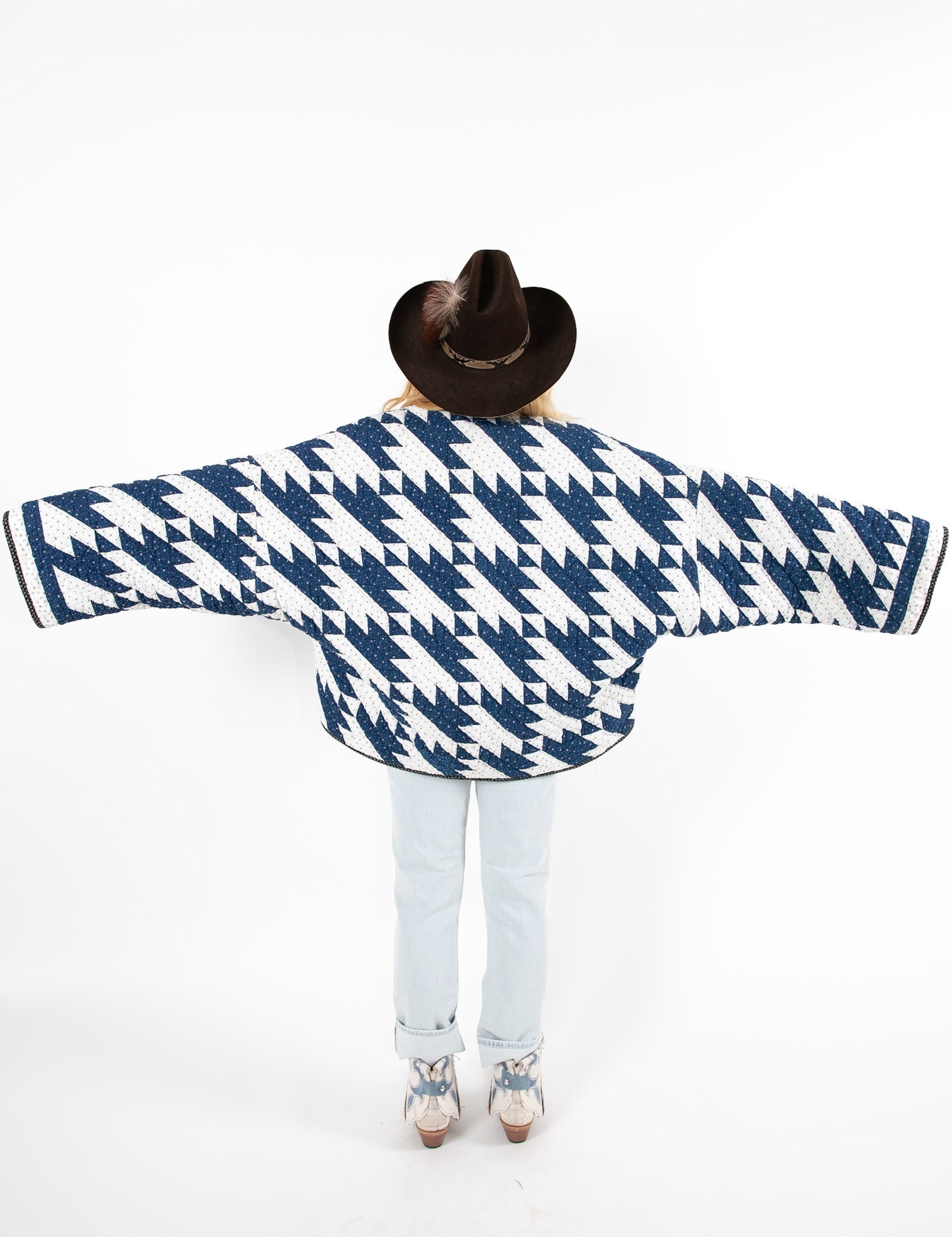 This is an antique American quilt made circa 1890s to 1920s. This is a traditional The Lost Ship quilt pattern. The quilt has been beautifully hand quilted and hand sewn, which is a labor of love and a lost art. This piece is overflowing with very rare and highly collectible indigo fabric. These indigo quilts are becoming harder and harder to find, we are very proud to offer this one in our collection. In our opinion, the jacket is lightweight with medium loft (puffiness). We do not recommend this for a warmer climate because of its medium loft, not weight but puffiness. The jacket was made with very luxe and soft cotton. This quilt did not come from a humble home, the backing fabric(inside of jacket) is a novelty fabric as well! It is in excellent condition for its age and it was made by a master. If you have further questions, please direct message us and we are happy to send you a video.
