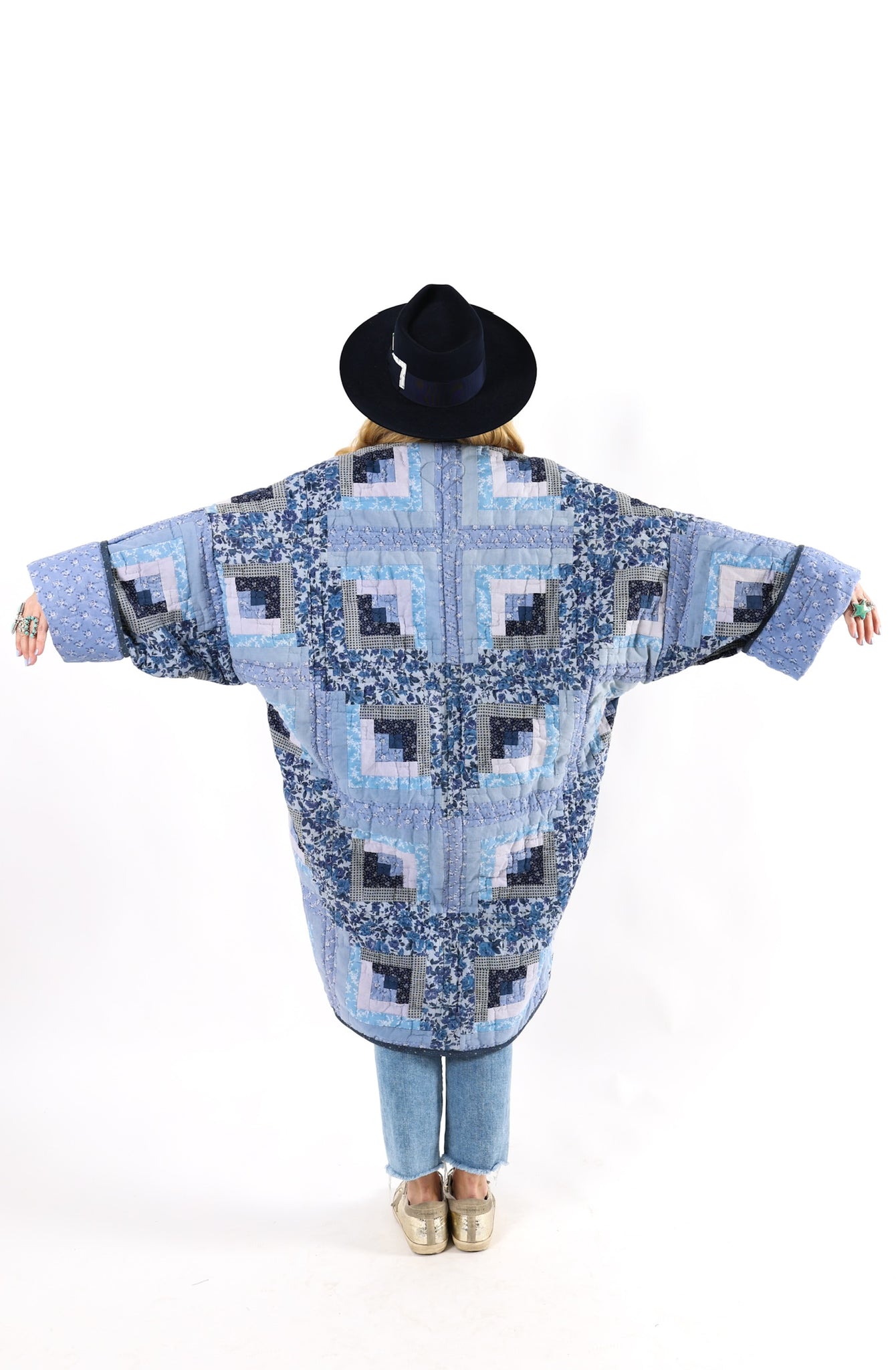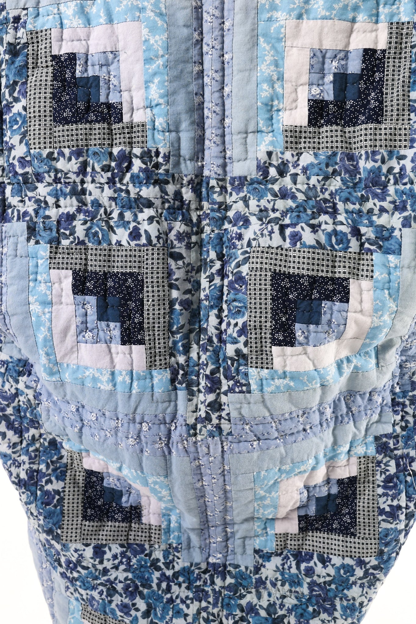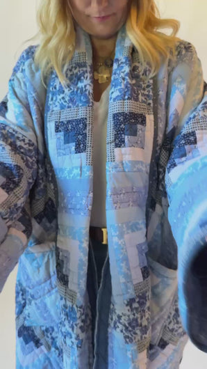 This is a vintage American quilt made circa 1980s or 1990s. This is a traditional Log Cabin quilt pattern. It is hand quilted. In our opinion, the quilt is thin, super soft, lightweight, and has medium loft (puffiness). This piece feels like a giant cloud hug and like wearing your favorite cozy blankie with arms. This is a great Blankie! We love that the maker backed the quilt(inside of the jacket) with a coordinating floral fabric. You will want to cuff the sleeves to show this off. Please note: there are a few minor zig zag mends that blend seamlessly into the quilt. If you have further questions please direct message us and we are happy to send you a video.