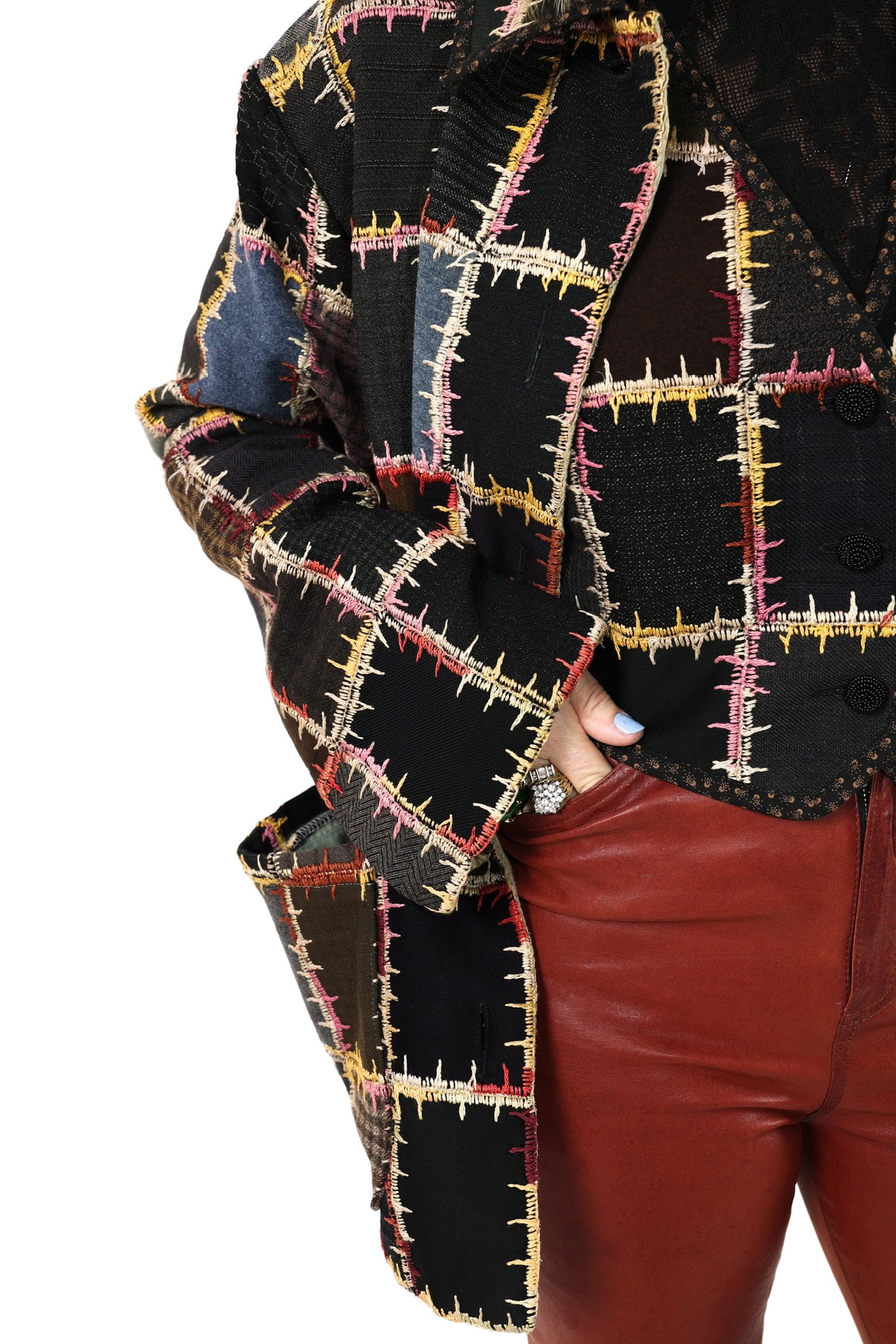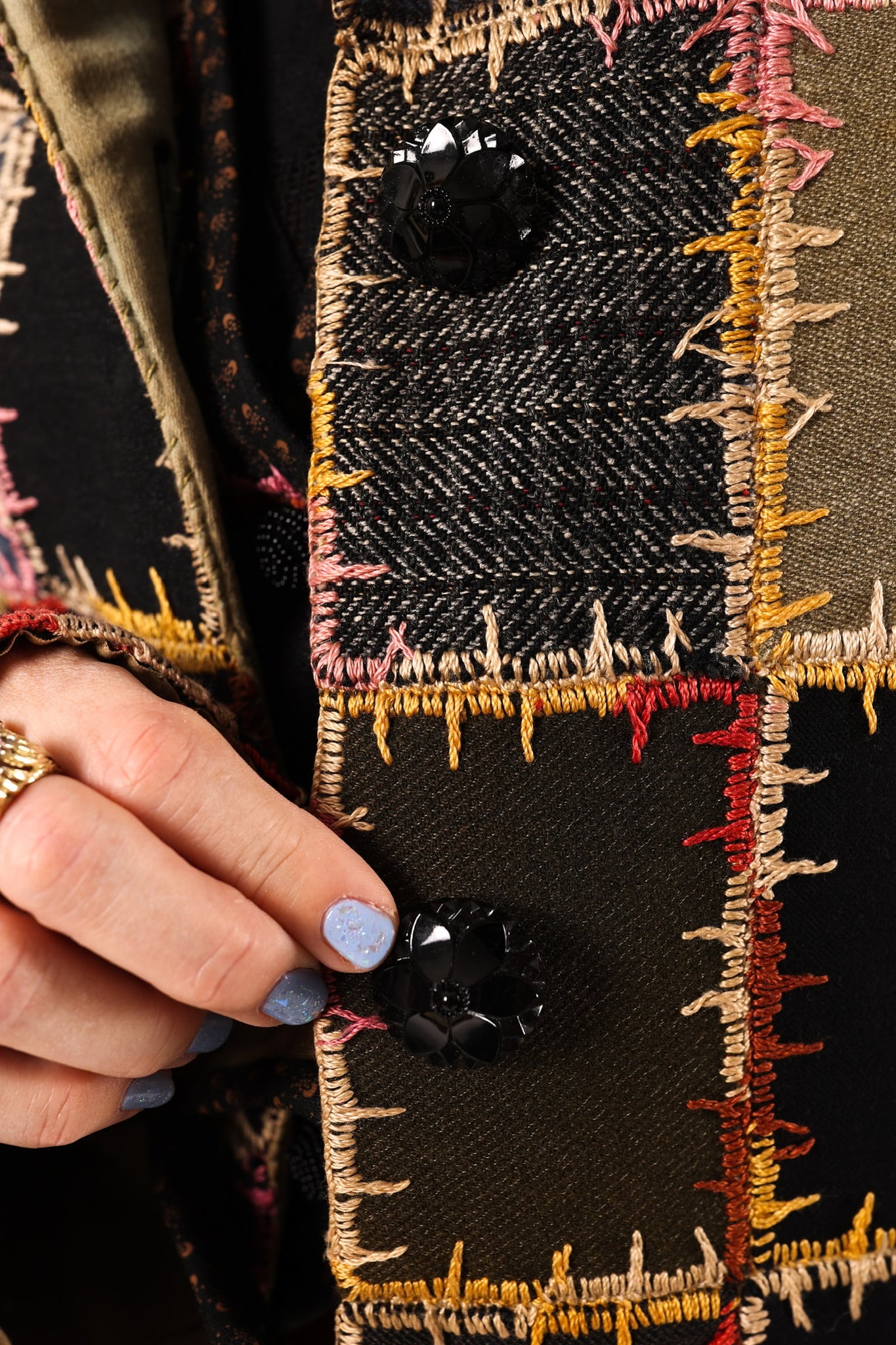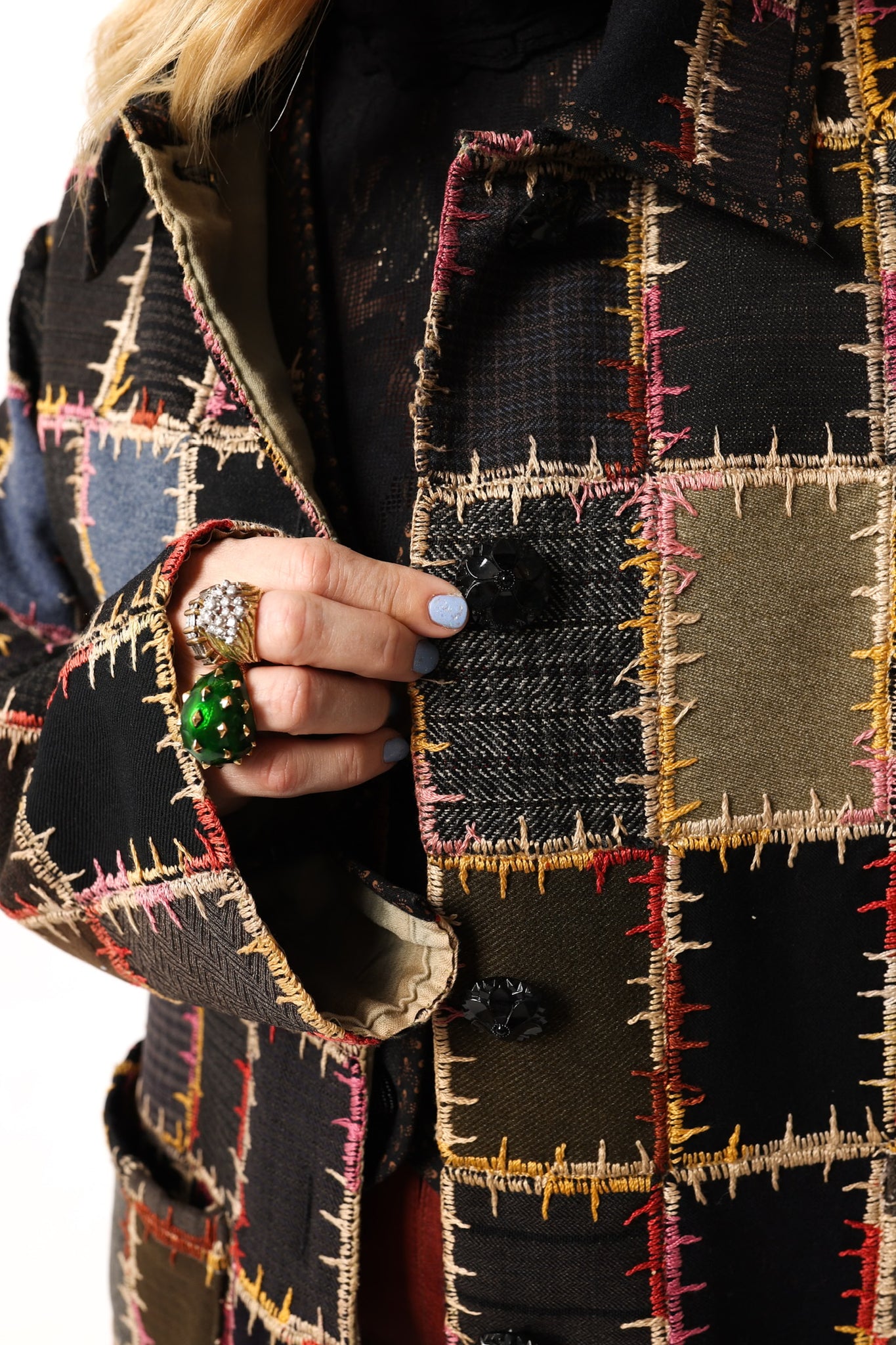 This is an American antique crazy quilt made circa 1880s to 1910. It is a traditional Hit and Miss quilt pattern. The quilt has been hand sewn and beautifully hand embroidered with a an array of colors. This piece was made by a hand skills master who had an eye for taking the ordinary to the next level. The quilt contains many men's suit scraps. Please take note of the backing fabric, inside of jacket, it is a beautiful contrasting silk sateen. In our opinion, the quilt is very thin and lightweight. We used black glass retired Chanel buttons that Lady Lancaster found at a Paris brocante. This is a Lady Lancaster 10/10. The quilt is in excellent condition for its age! If your looking to make a boom boom pow statement you can pair this Market Jacket with the coordinating vest.