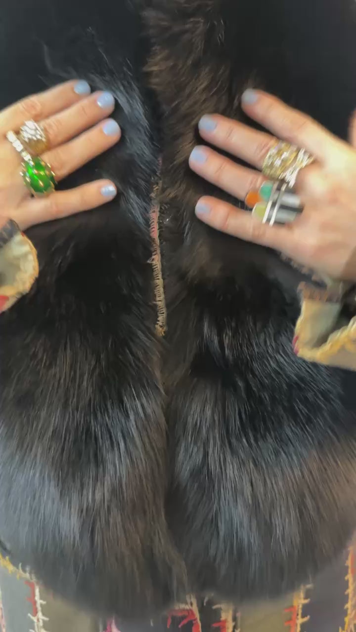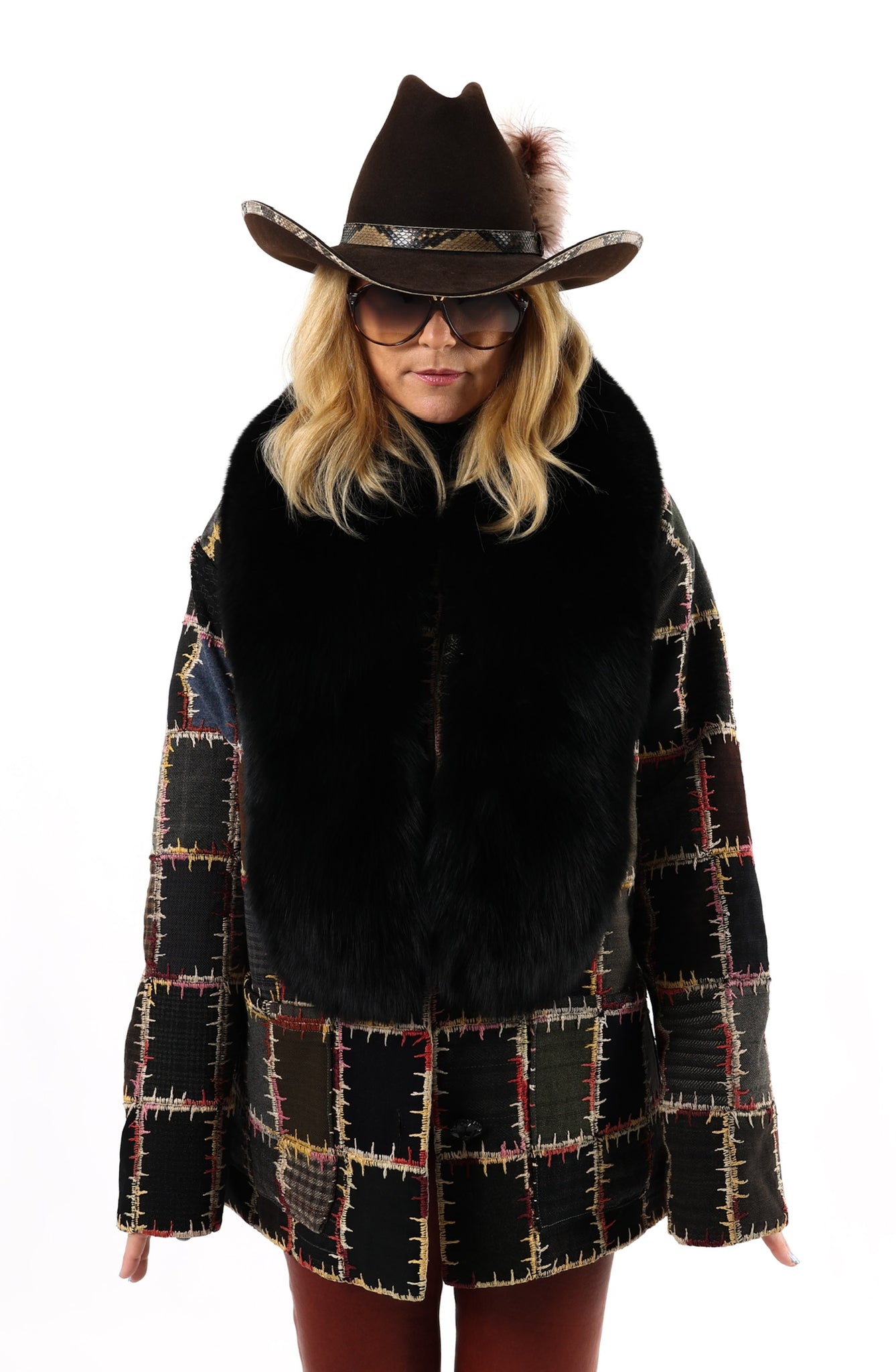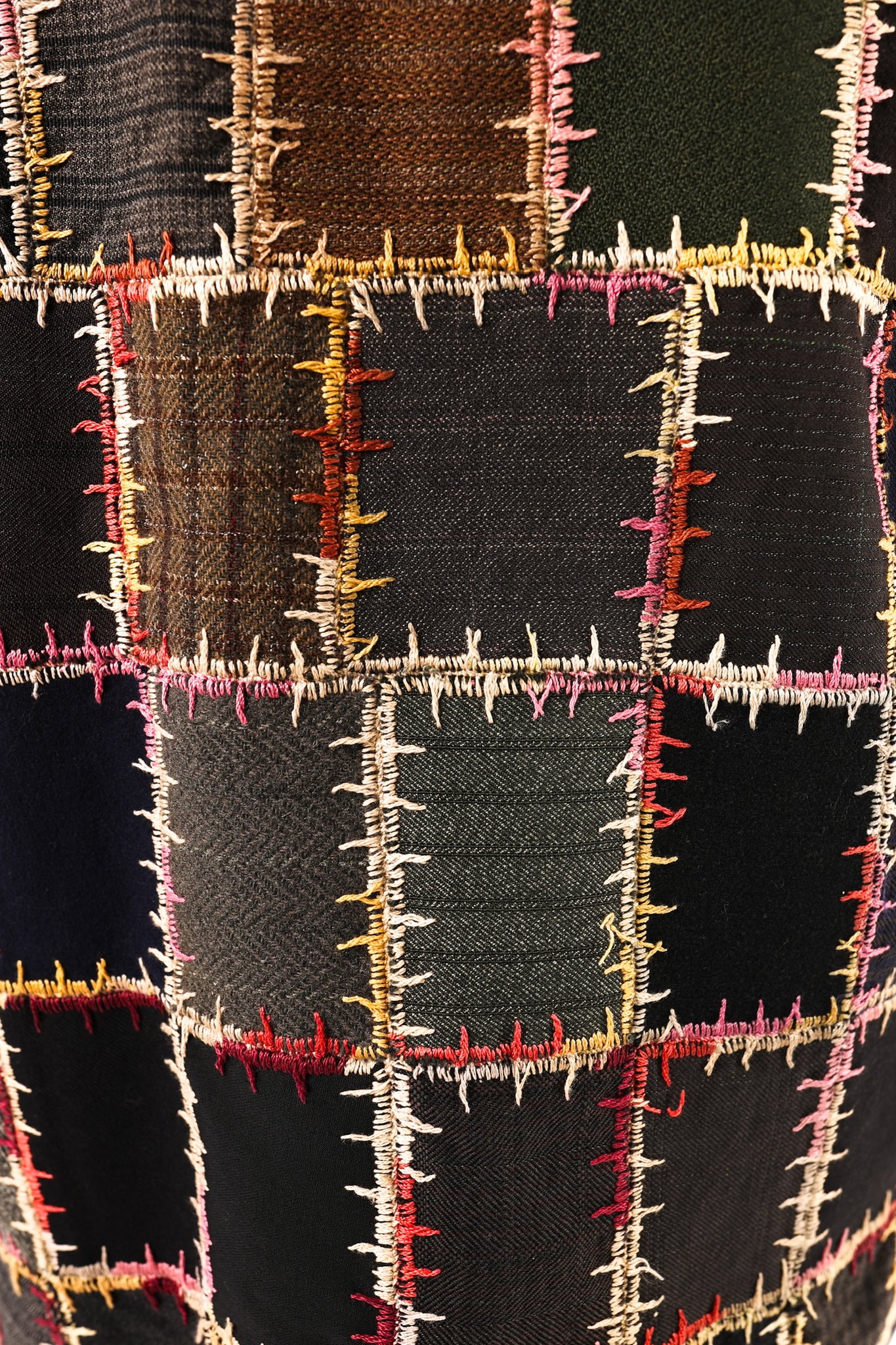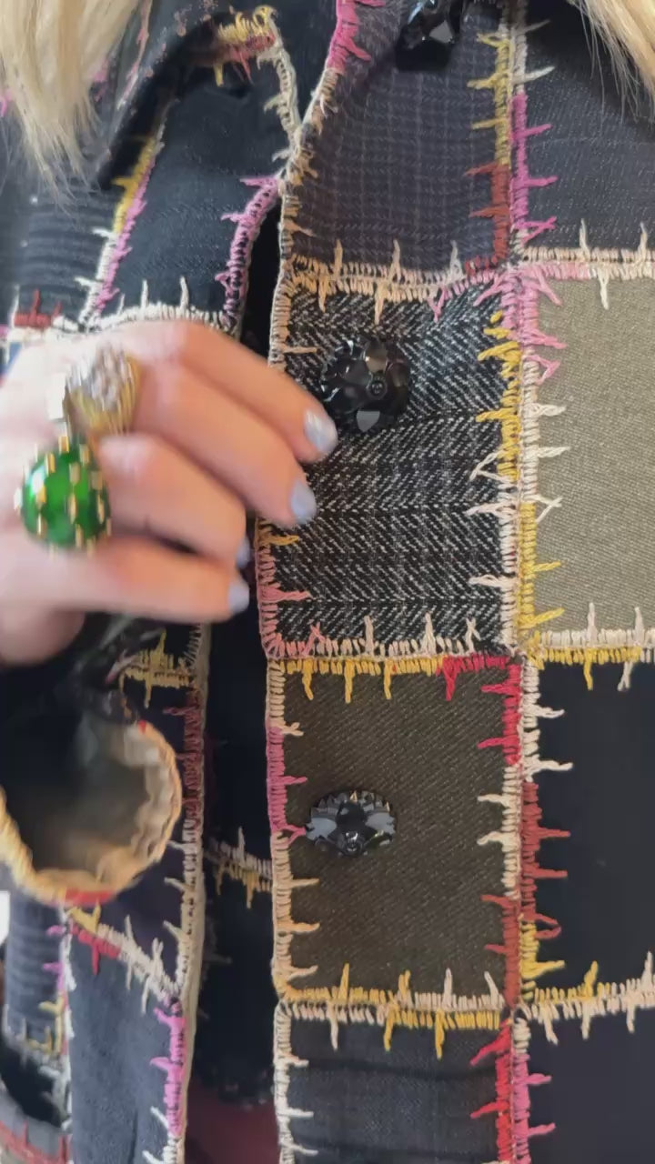 This is an American antique crazy quilt made circa 1880s to 1910. It is a traditional Hit and Miss quilt pattern. The quilt has been hand sewn and beautifully hand embroidered with a an array of colors. This piece was made by a hand skills master who had an eye for taking the ordinary to the next level. The quilt contains many men's suit scraps. Please take note of the backing fabric, inside of jacket, it is a beautiful contrasting silk sateen. In our opinion, the quilt is very thin and lightweight. We used black glass retired Chanel buttons that Lady Lancaster found at a Paris brocante. This is a Lady Lancaster 10/10. The quilt is in excellent condition for its age! If your looking to make a boom boom pow statement you can pair this Market Jacket with the coordinating vest.