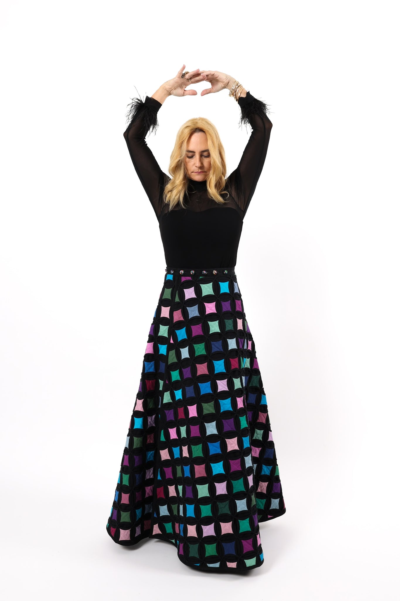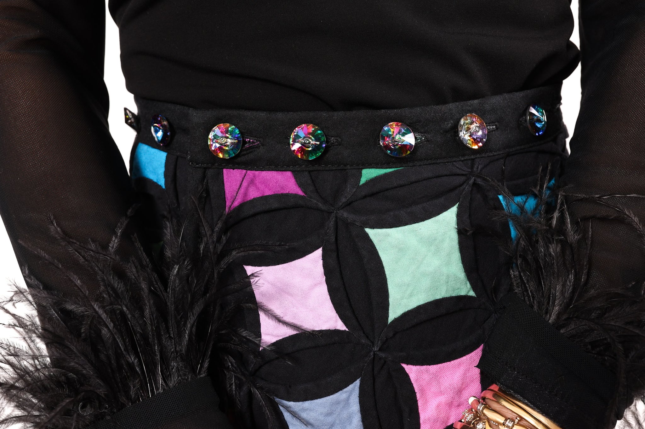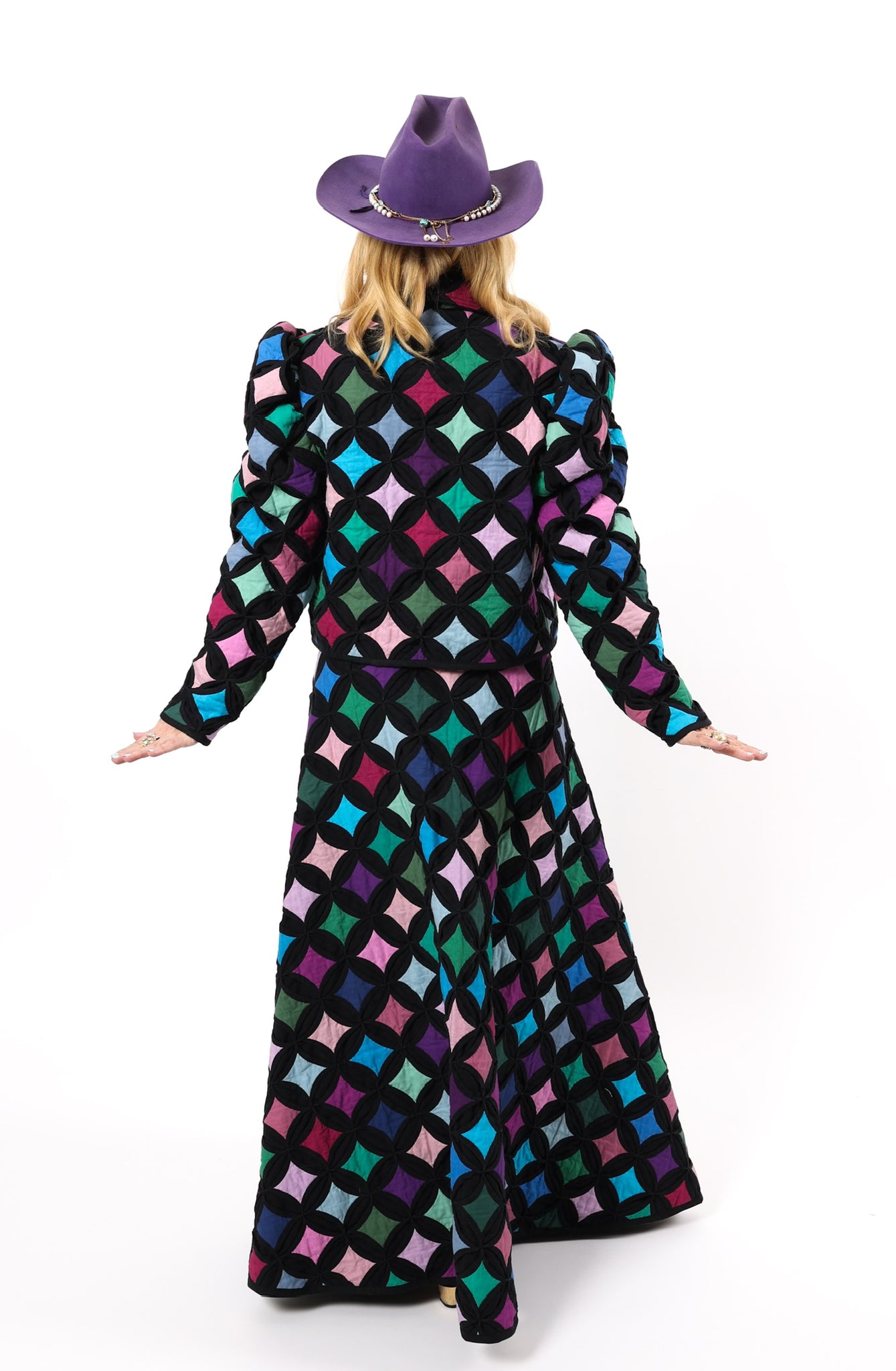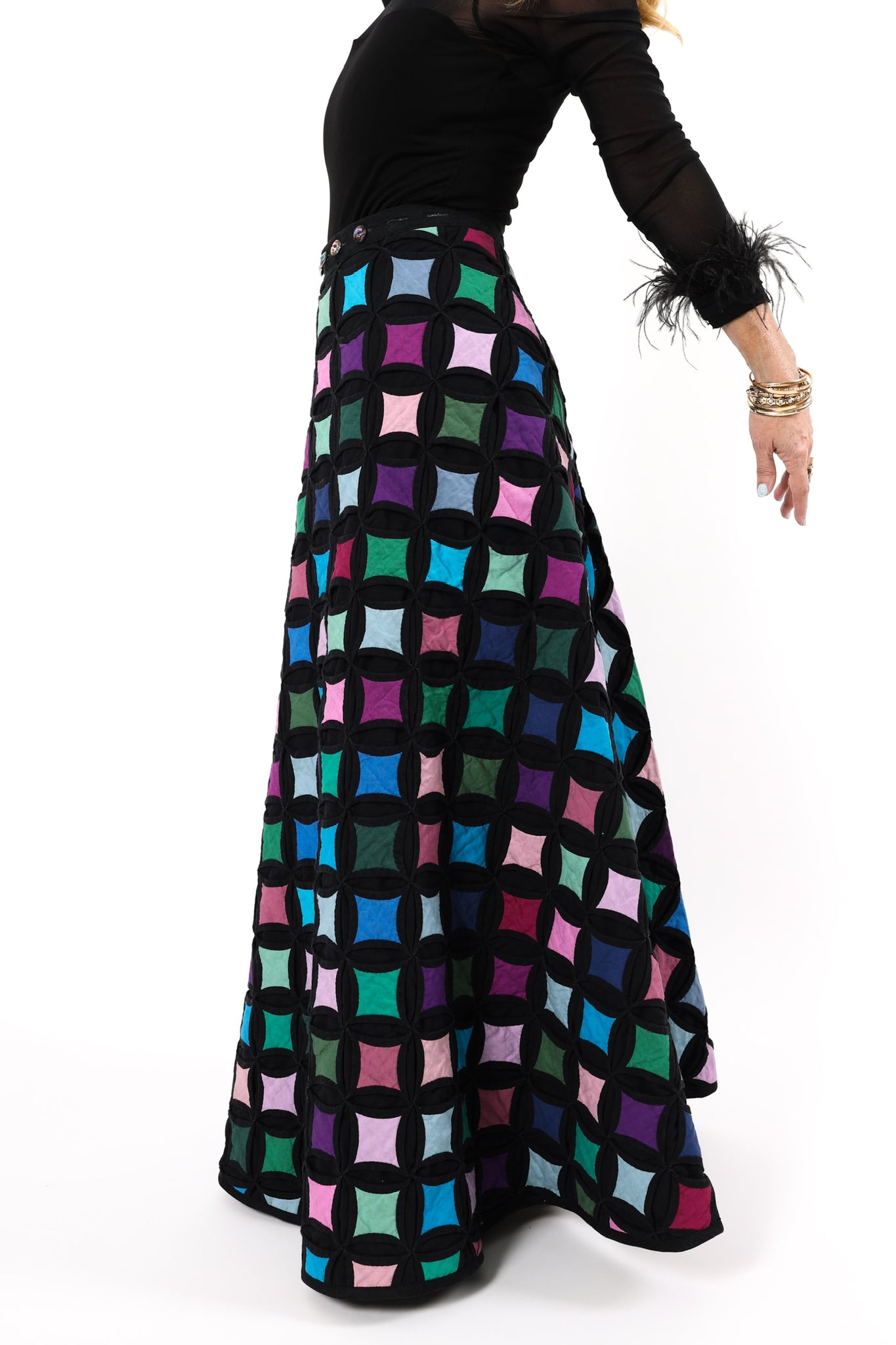 This is an Amish made quilt from a Lancaster County Mud Sale that was held at the Robert Fulton Fire Company. It is a traditional Cathedral Window quilt pattern. The window panes have been hand appliqued which is a labor of love and a lost art! To match the jewel tones of the quilt we used iridescent glass buttons! In our opinion, the quilt is thin and lightweight! The quilt does have a little stiffness to it which is standard for this style of quilt. If you're looking for a full on quilt ensemble this vest can be paired with the coordinating Queen Bee and Wolfe Vest. You will be the talk of the party! This skirt best fits a US size 2-10. It is 42 inches in overall length and if you want this skirt hemmed shorter, we will be happy to do so. It is a wrap skirt style and we made it adjustable at the waistband with buttons. For better understanding, please see the video at the end of this listing to understand fit. Also, don't hesitate to dm us with further questions.