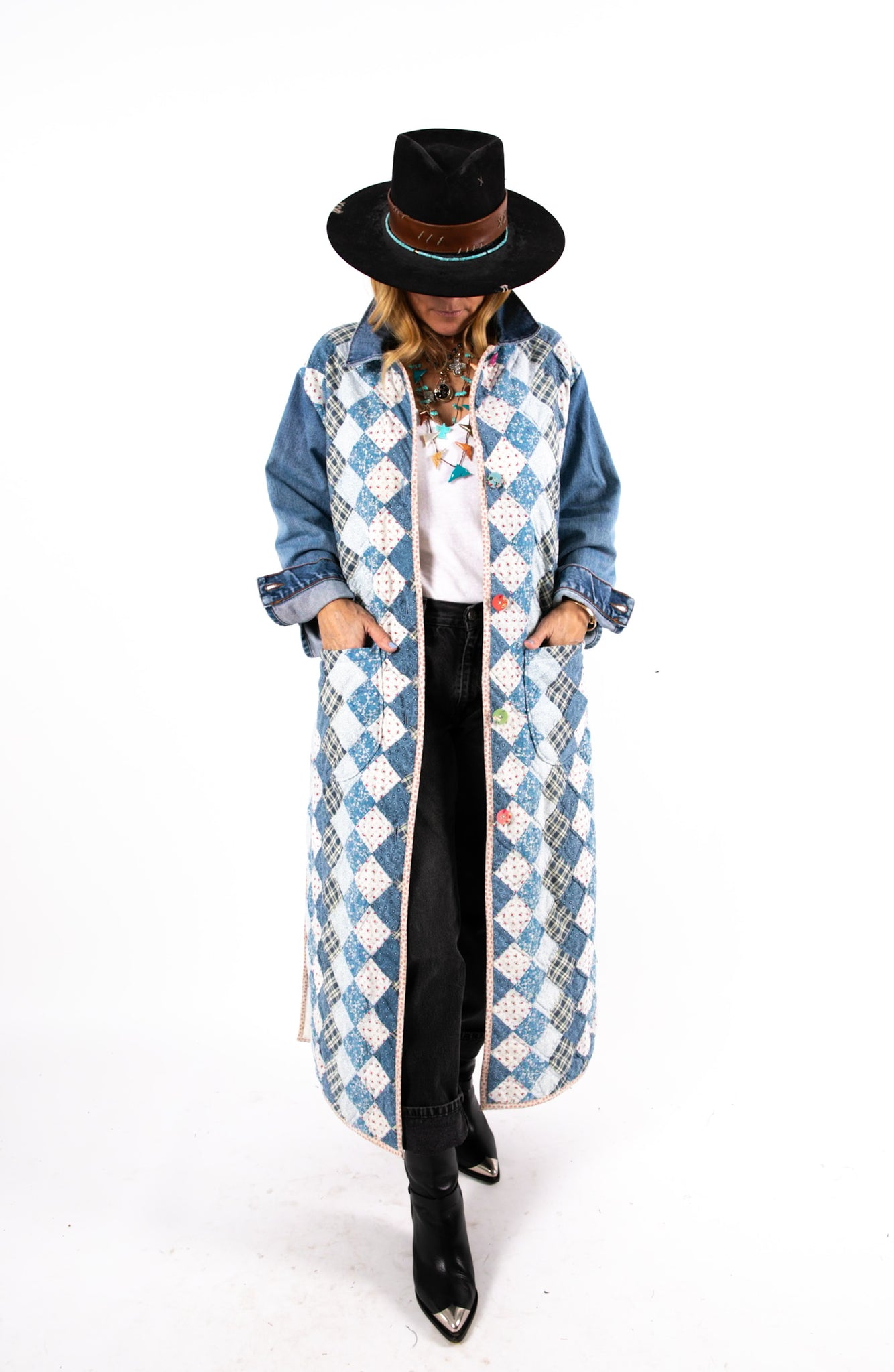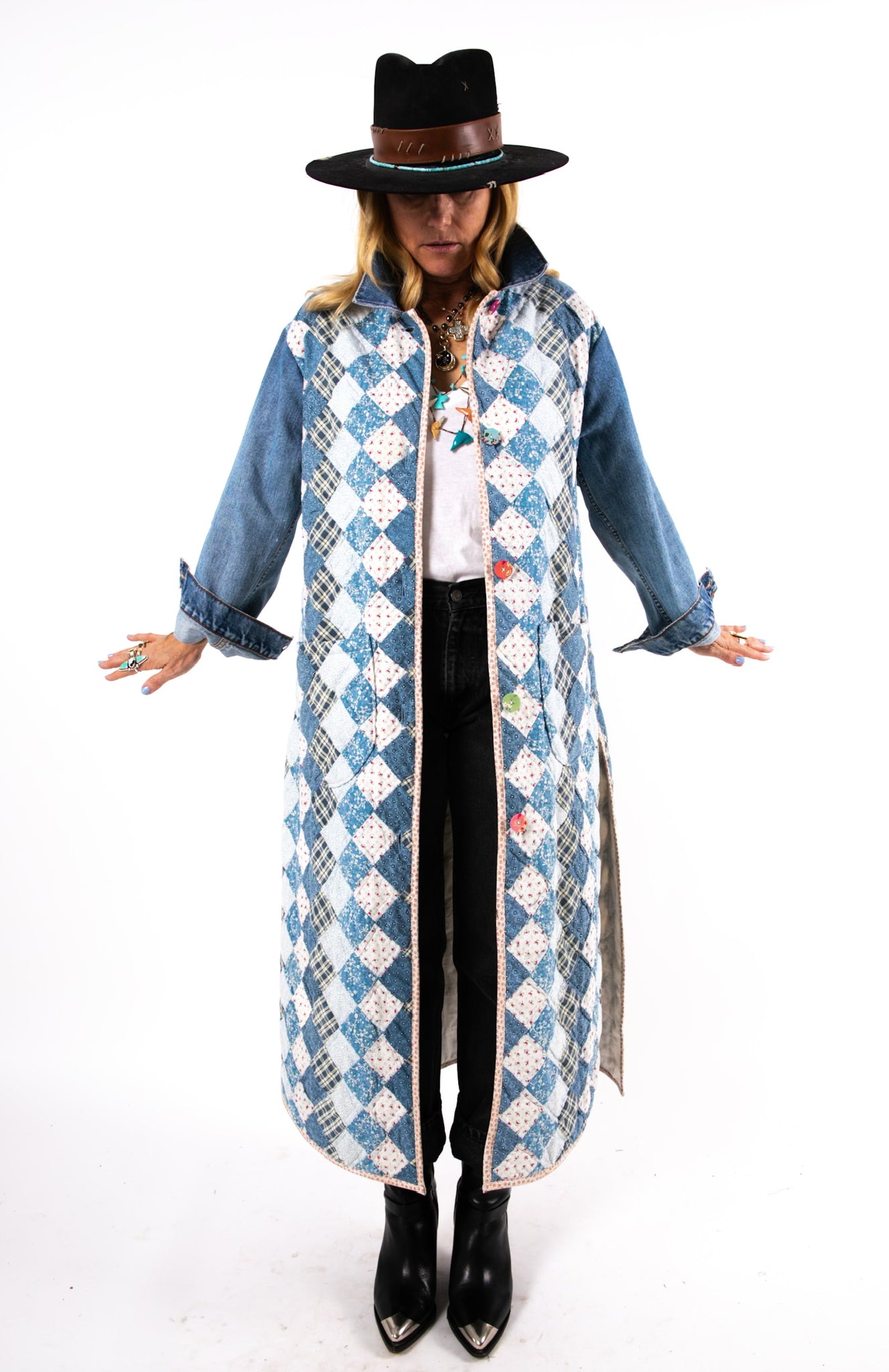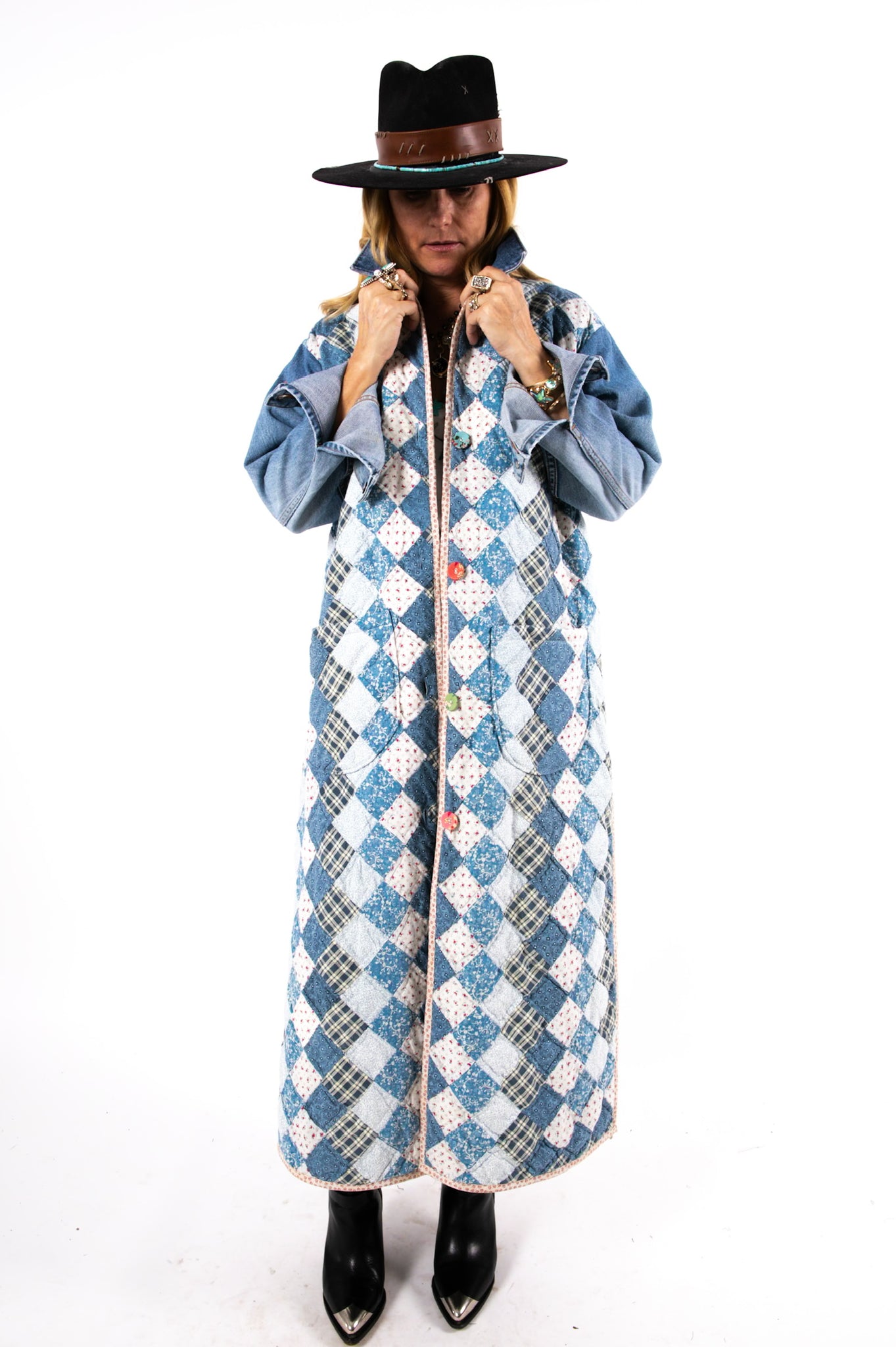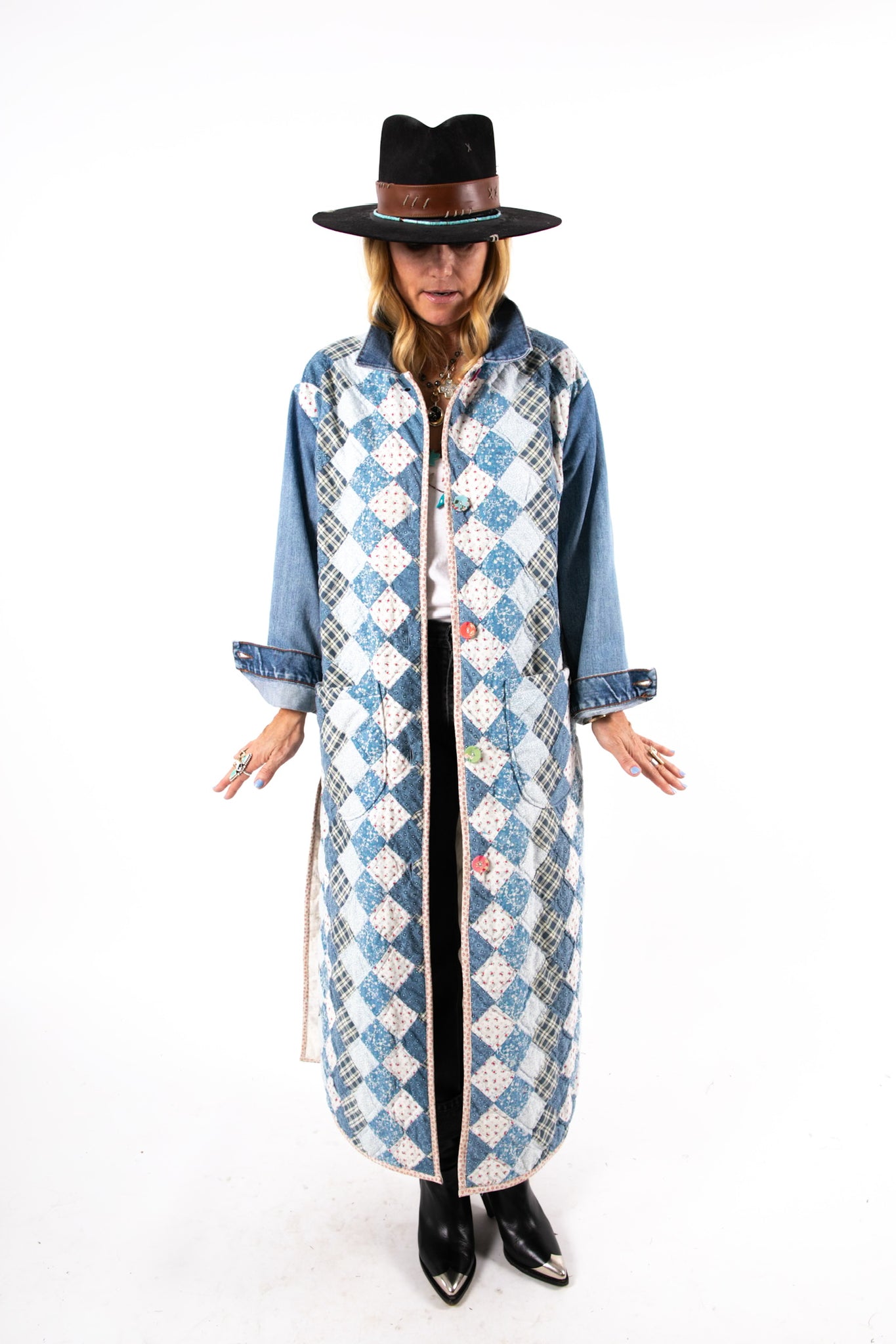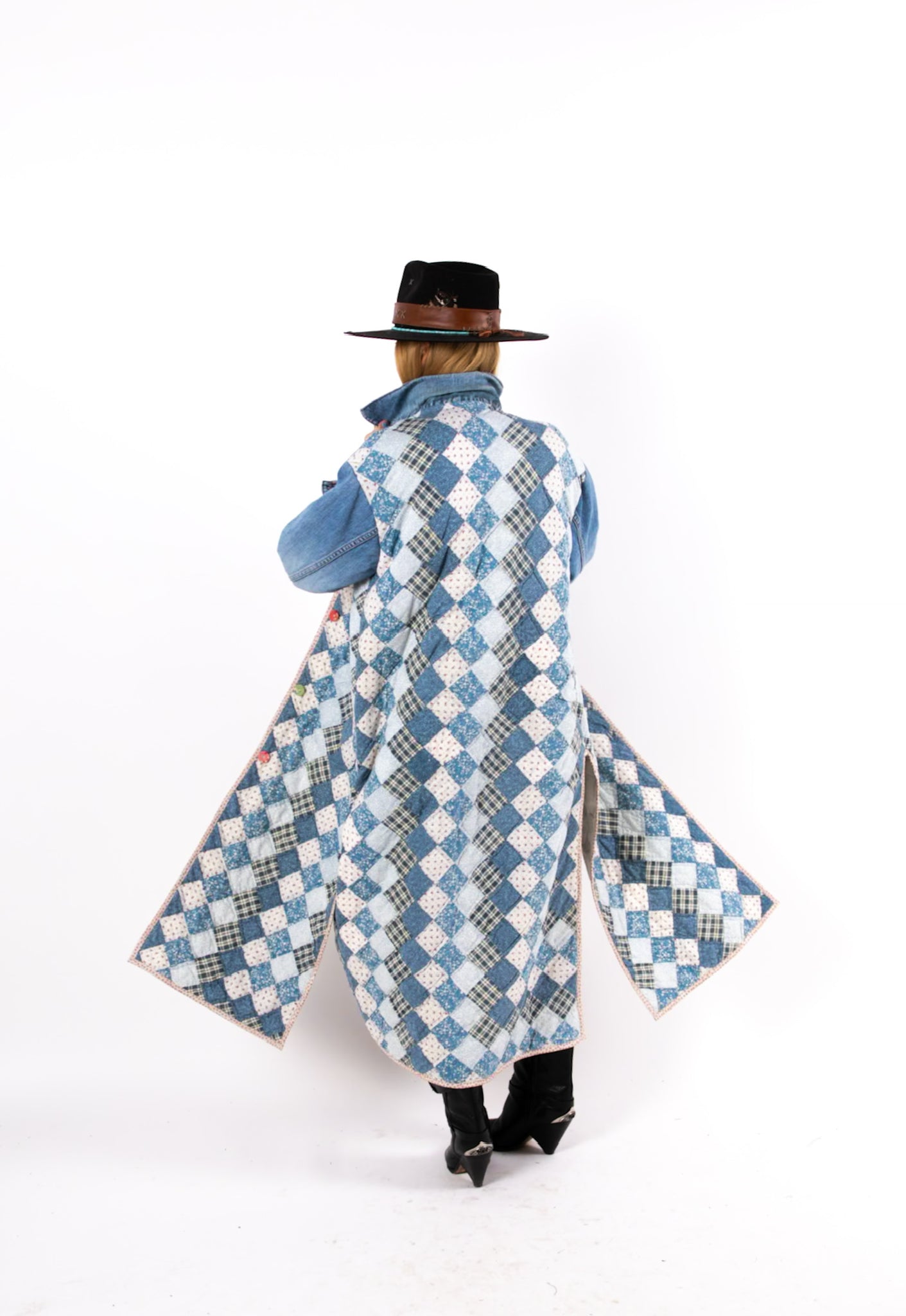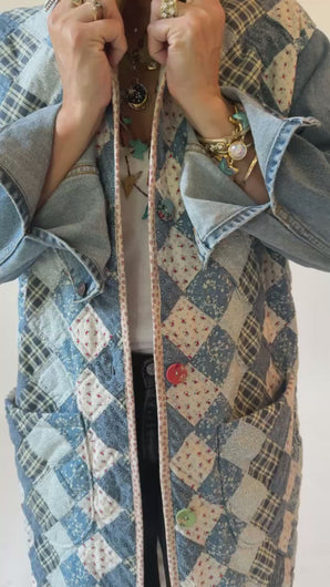 This is a vintage American quilt made circa 1980s. It is a traditional Trip Around the World quilt pattern. The quilt has been hand sewn and hand quilted which is a labor of love and a lost art. In our opinion, the jacket is very thin, very lightweight, is extremely soft, and has an excellent drape. We love the neutral blue vibes. To complete the jacket with used sleeves and a collar from a vintage Levi jacket. We used floral fabric covered buttons as closures. If you have further questions please direct message us and we are happy to send you a video.