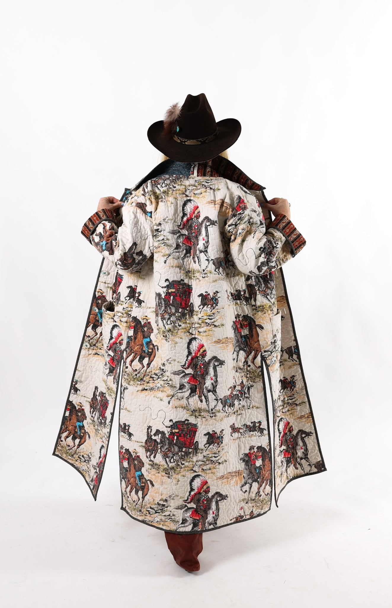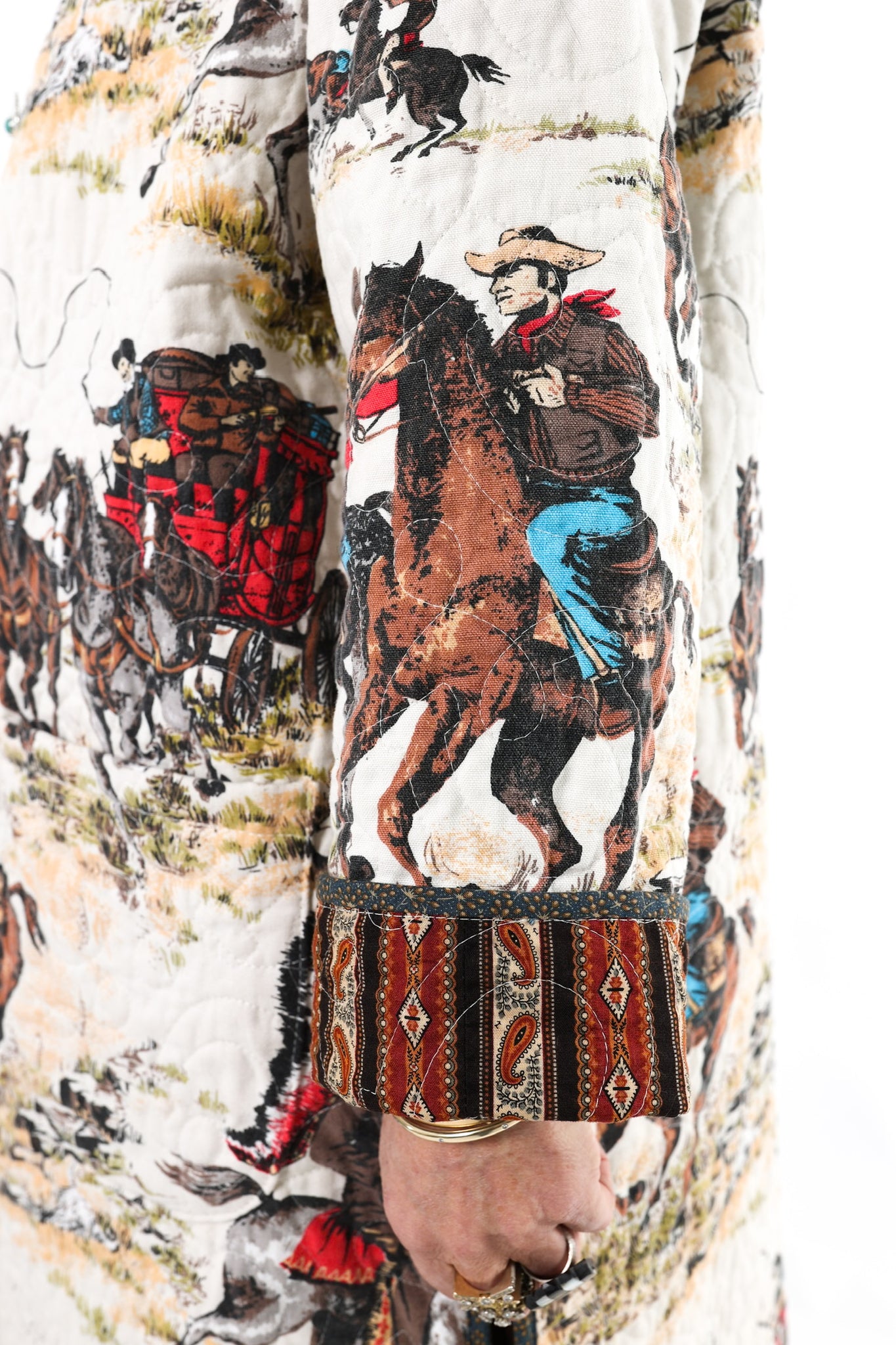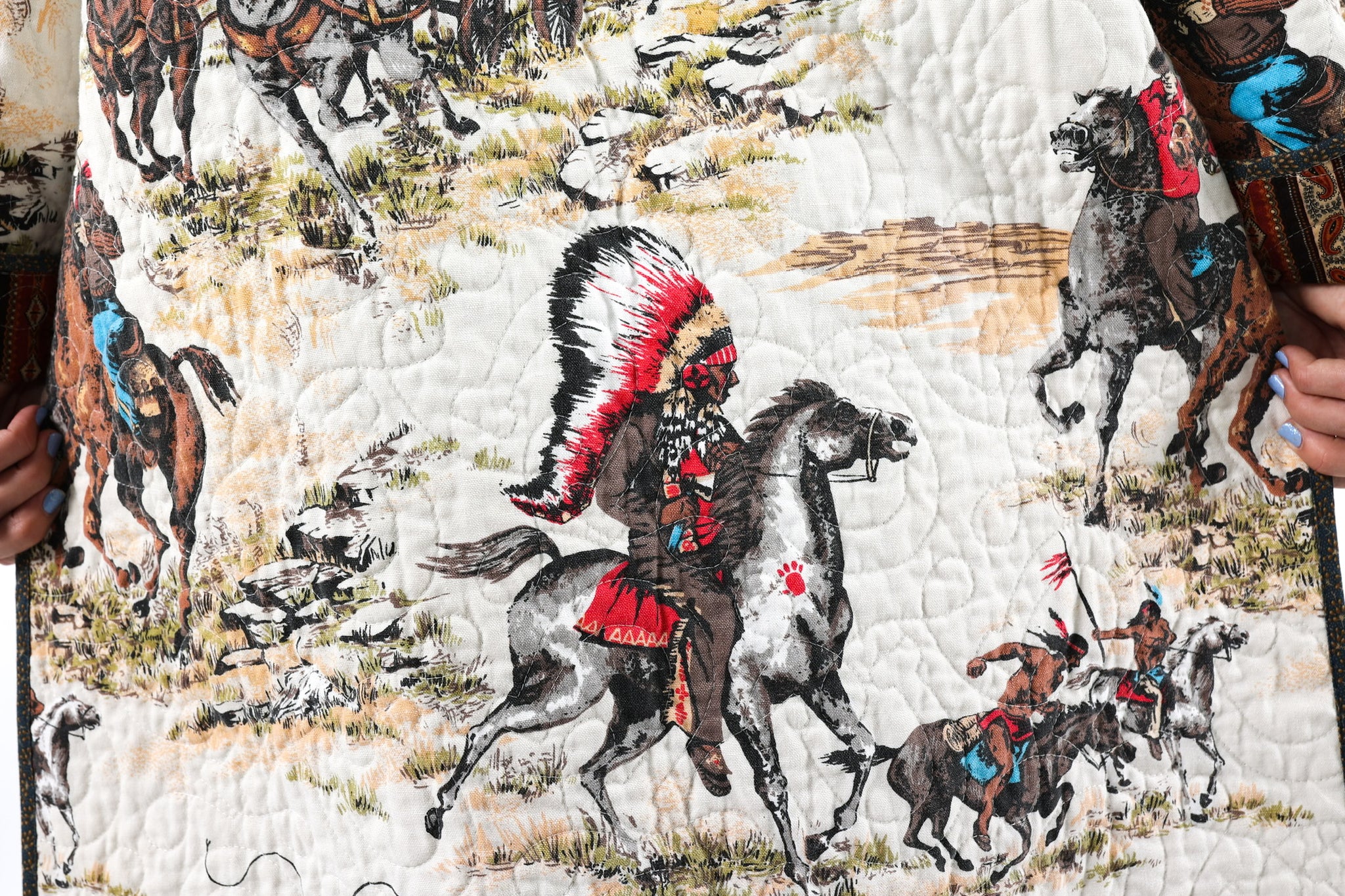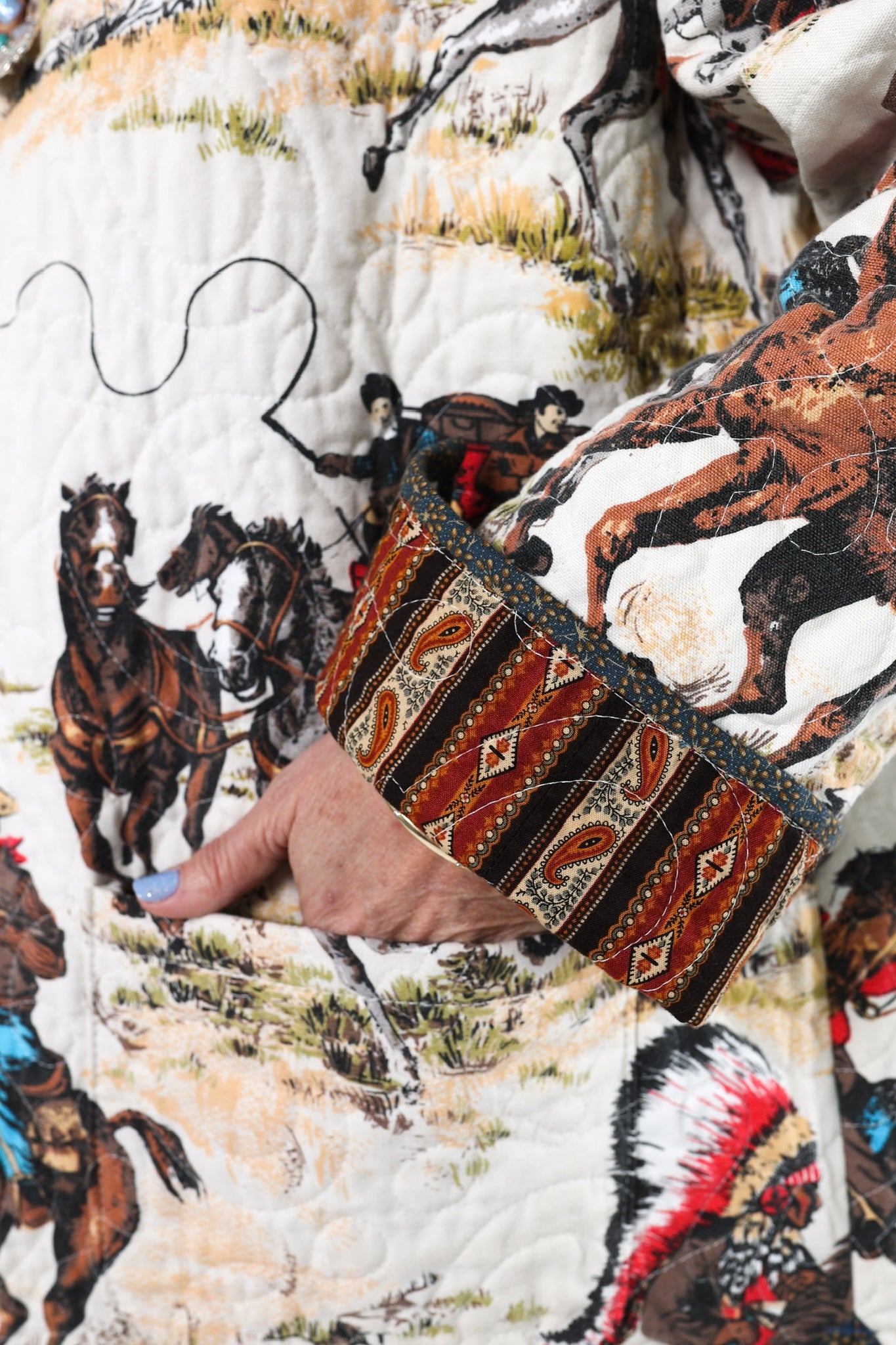 This quilt is a combination of vintage western upholstery fabric and contrasting turn of the century reproduction fabric. We love the depth of the cowboy & Indian stagecoach scene, creating pictorial wearable art. For closures we used faux turquoise concho buttons. This piece is both a workhorse and a show horse, meaning you don’t need to handle it with extra care like our antique pieces. In our opinion, the jacket is thin, lightweight, and moves beautifully. This piece is a future heirloom and western stylists dream! Please note: this is a size medium! Please read sizing measurements below. If you have further questions please direct message us and we are happy to send you a video.