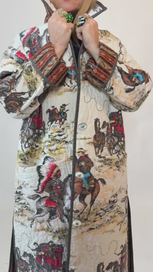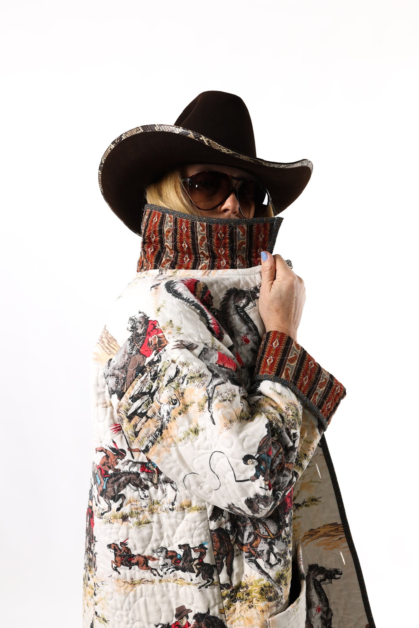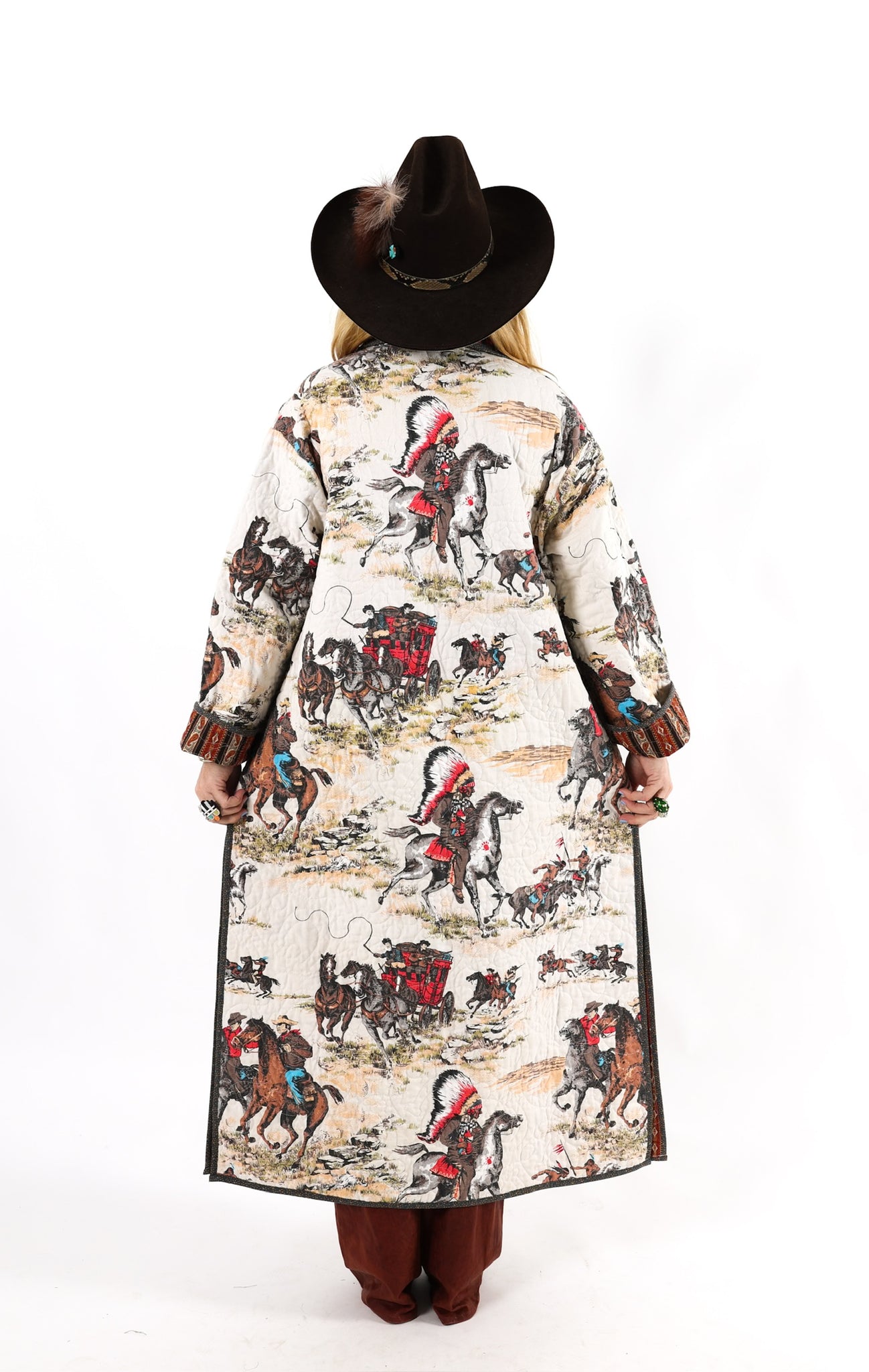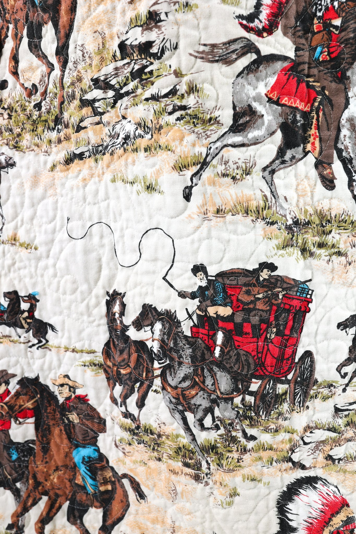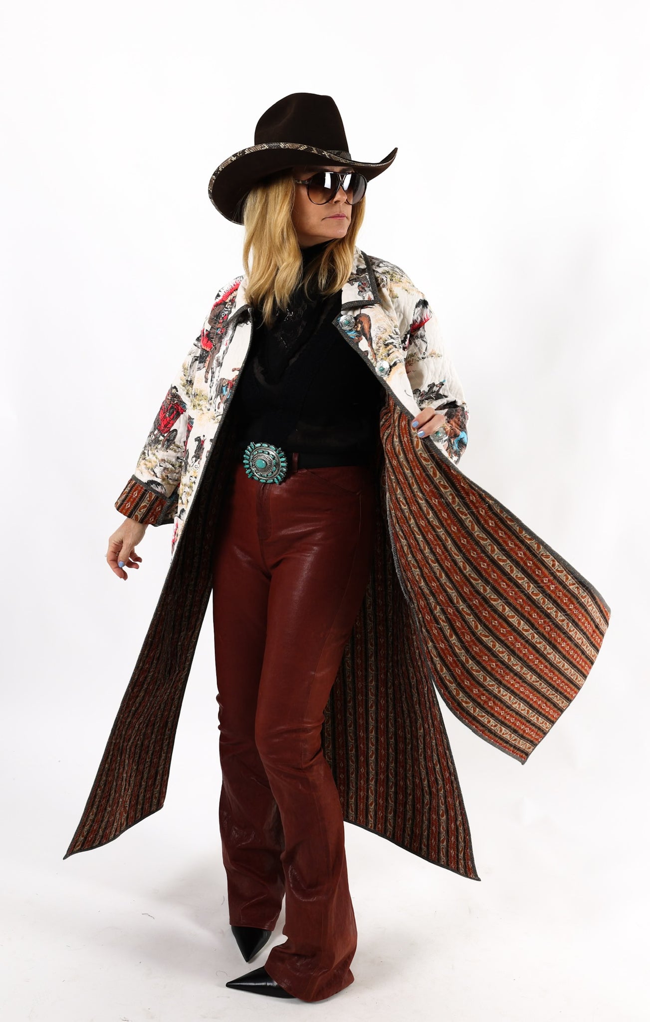 This quilt is a combination of vintage western upholstery fabric and contrasting turn of the century reproduction fabric. We love the depth of the cowboy & Indian stagecoach scene, creating pictorial wearable art. For closures we used faux turquoise concho buttons. This piece is both a workhorse and a show horse, meaning you don’t need to handle it with extra care like our antique pieces. In our opinion, the jacket is thin, lightweight, and moves beautifully. This piece is a future heirloom and western stylists dream! Please note: this is a size medium! Please read sizing measurements below. If you have further questions please direct message us and we are happy to send you a video.