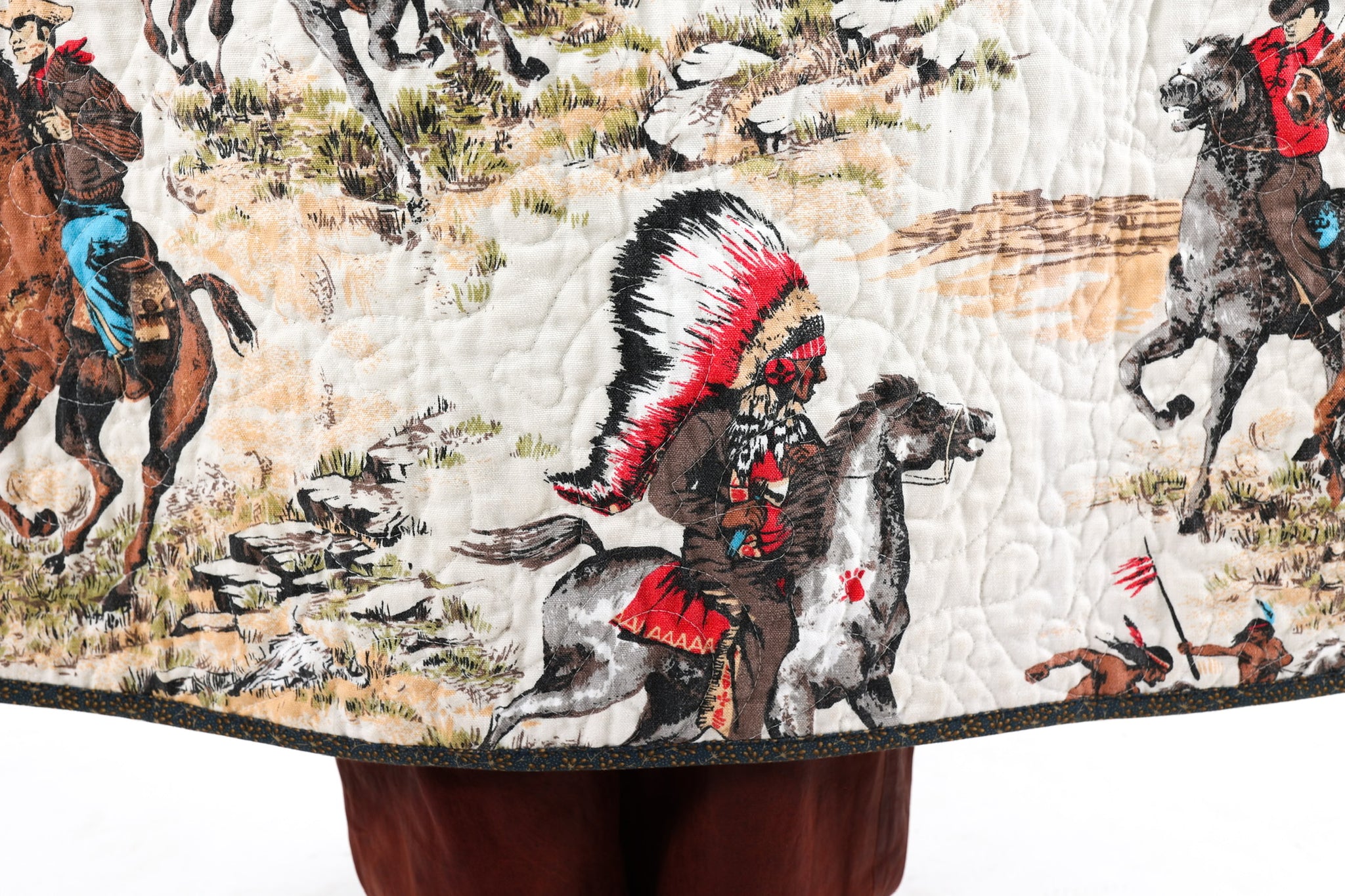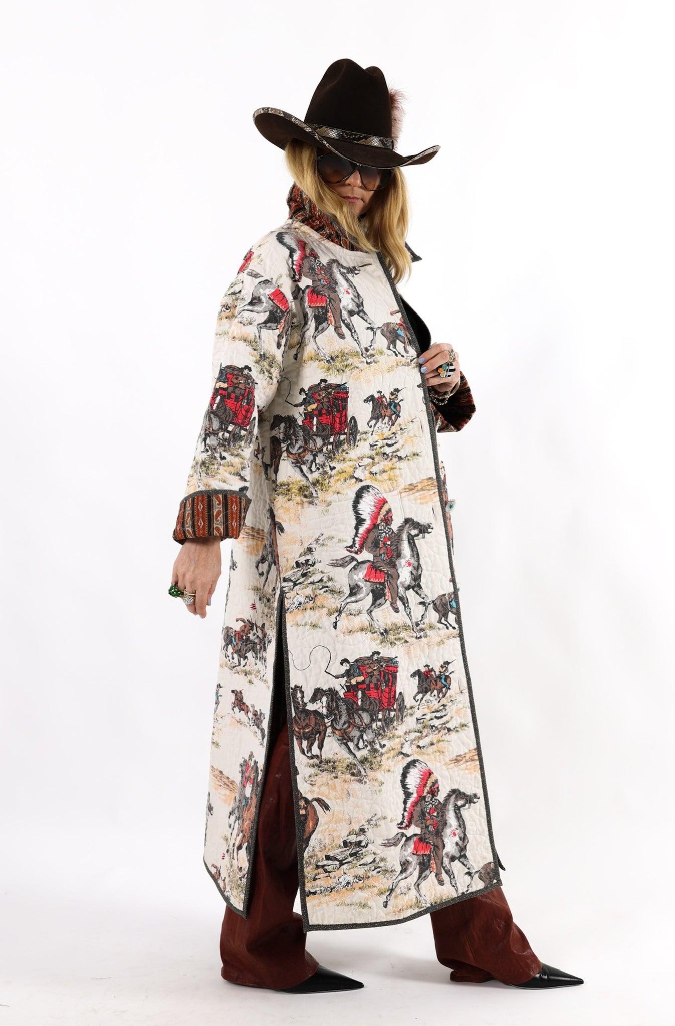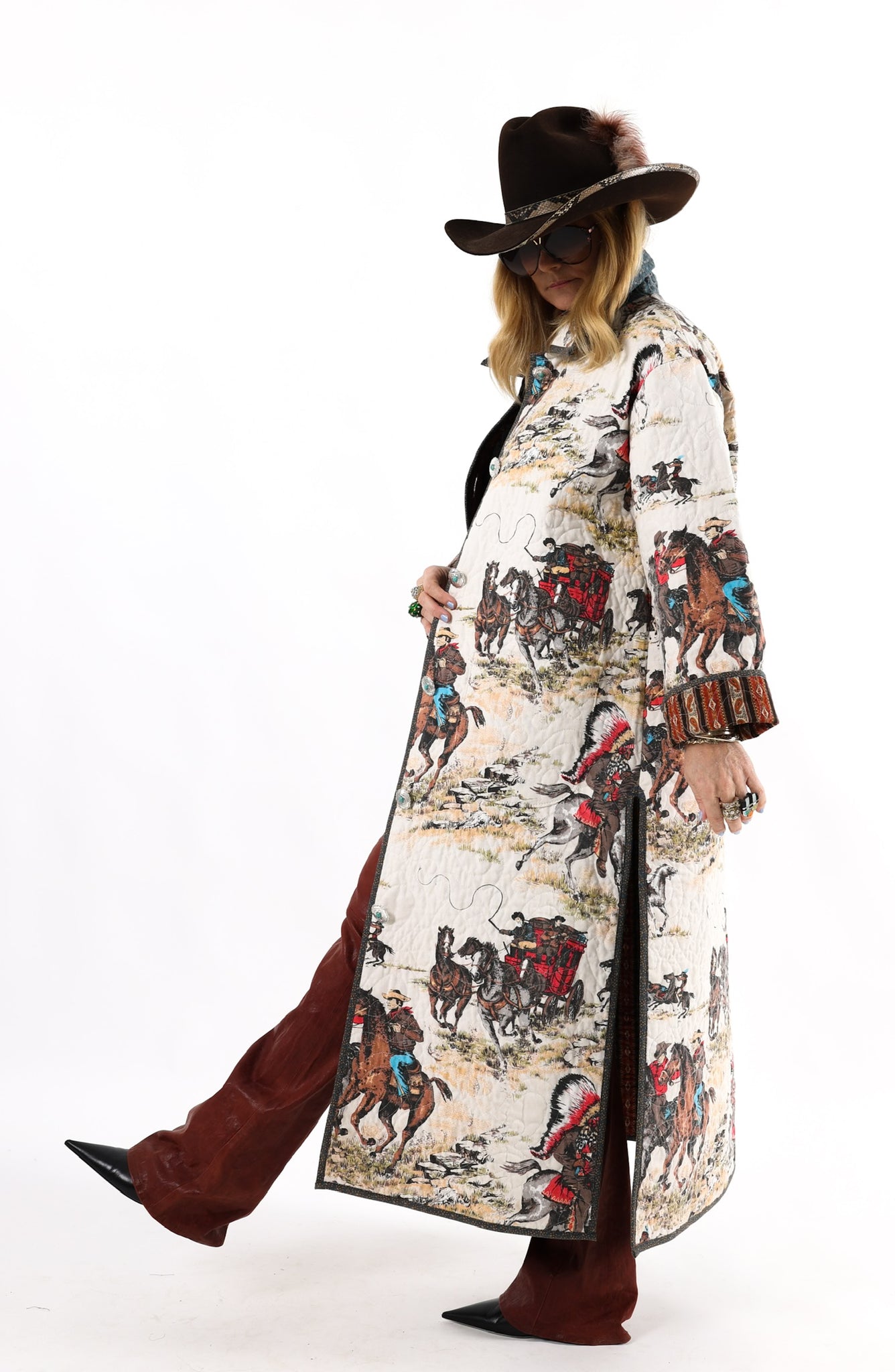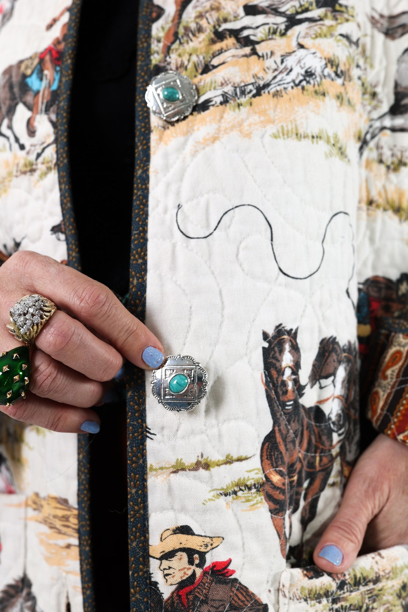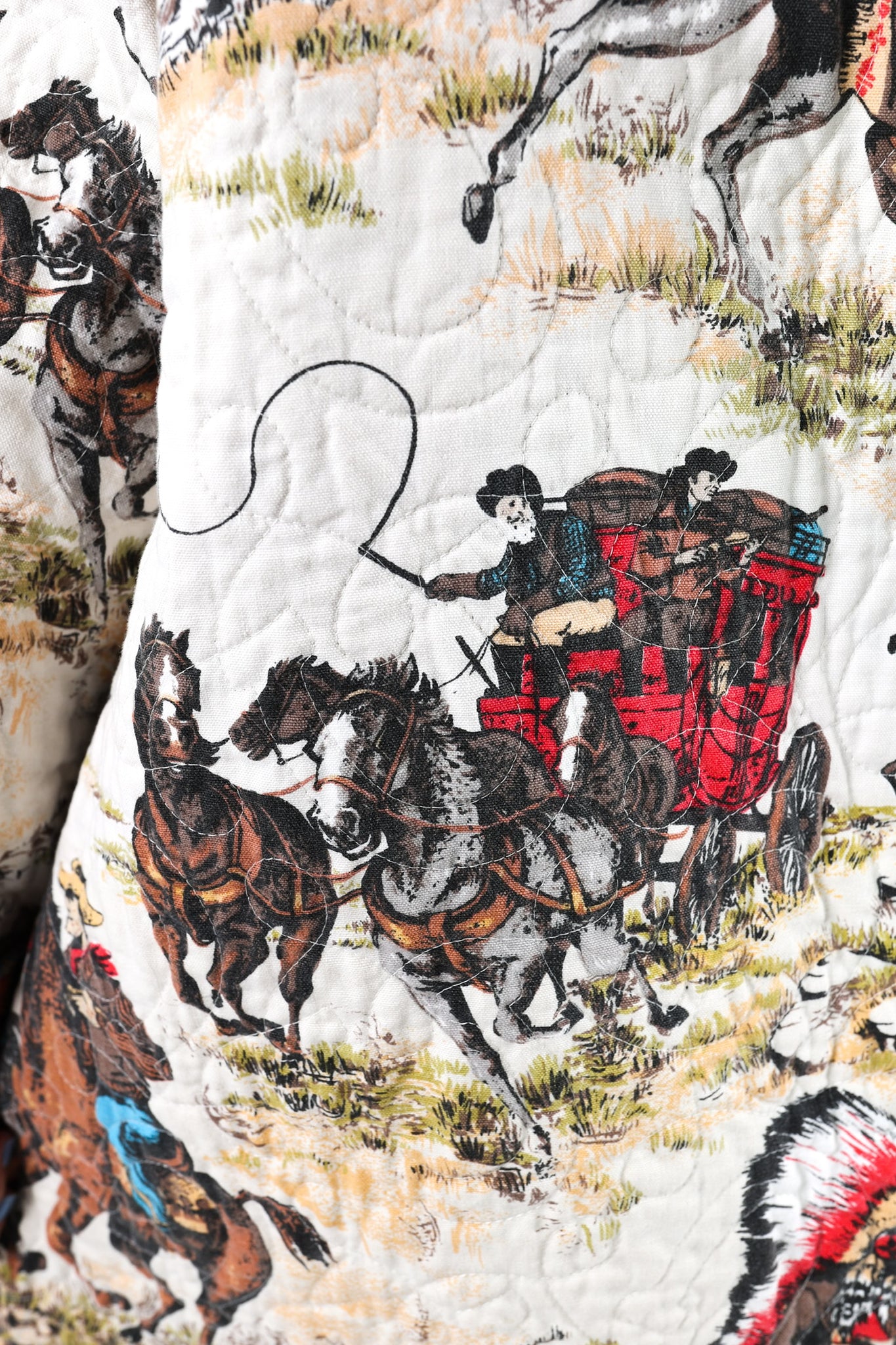 This quilt is a combination of vintage western upholstery fabric and contrasting turn of the century reproduction fabric. We love the depth of the cowboy & Indian stagecoach scene, creating pictorial wearable art. For closures we used faux turquoise concho buttons. This piece is both a workhorse and a show horse, meaning you don’t need to handle it with extra care like our antique pieces. In our opinion, the jacket is thin, lightweight, and moves beautifully. This piece is a future heirloom and western stylists dream! Please note: this is a size medium! Please read sizing measurements below. If you have further questions please direct message us and we are happy to send you a video.