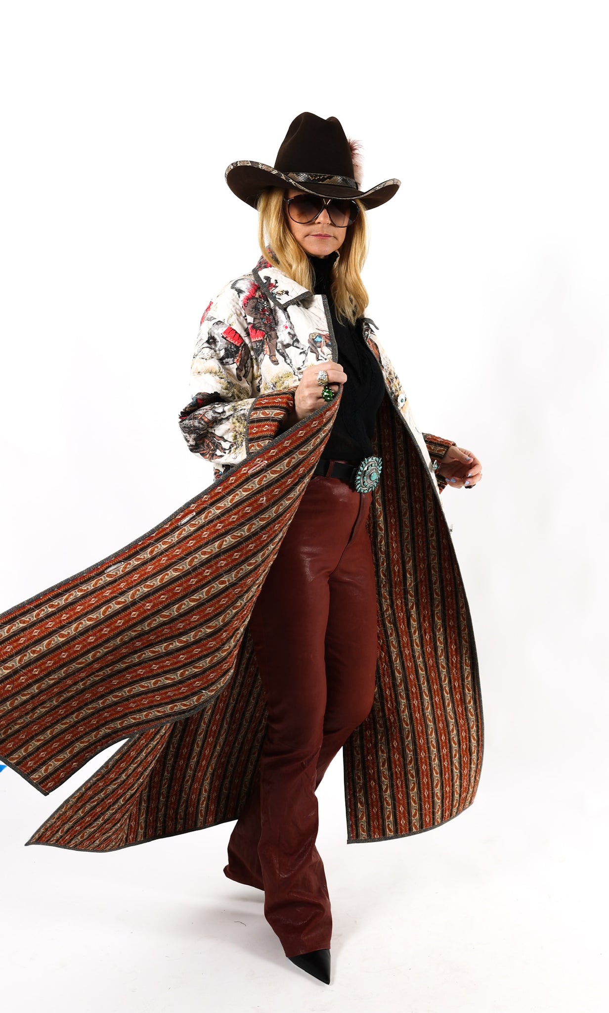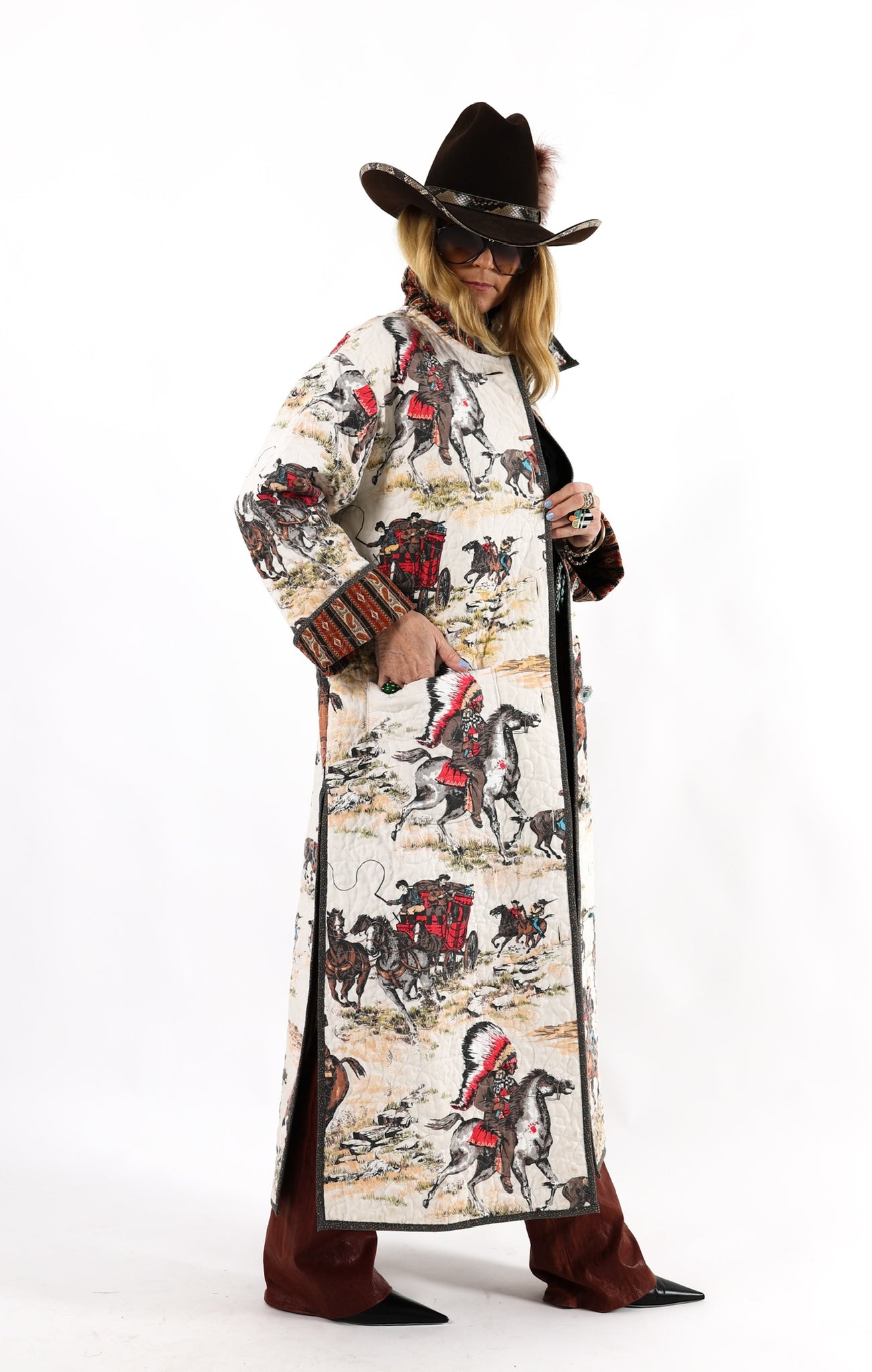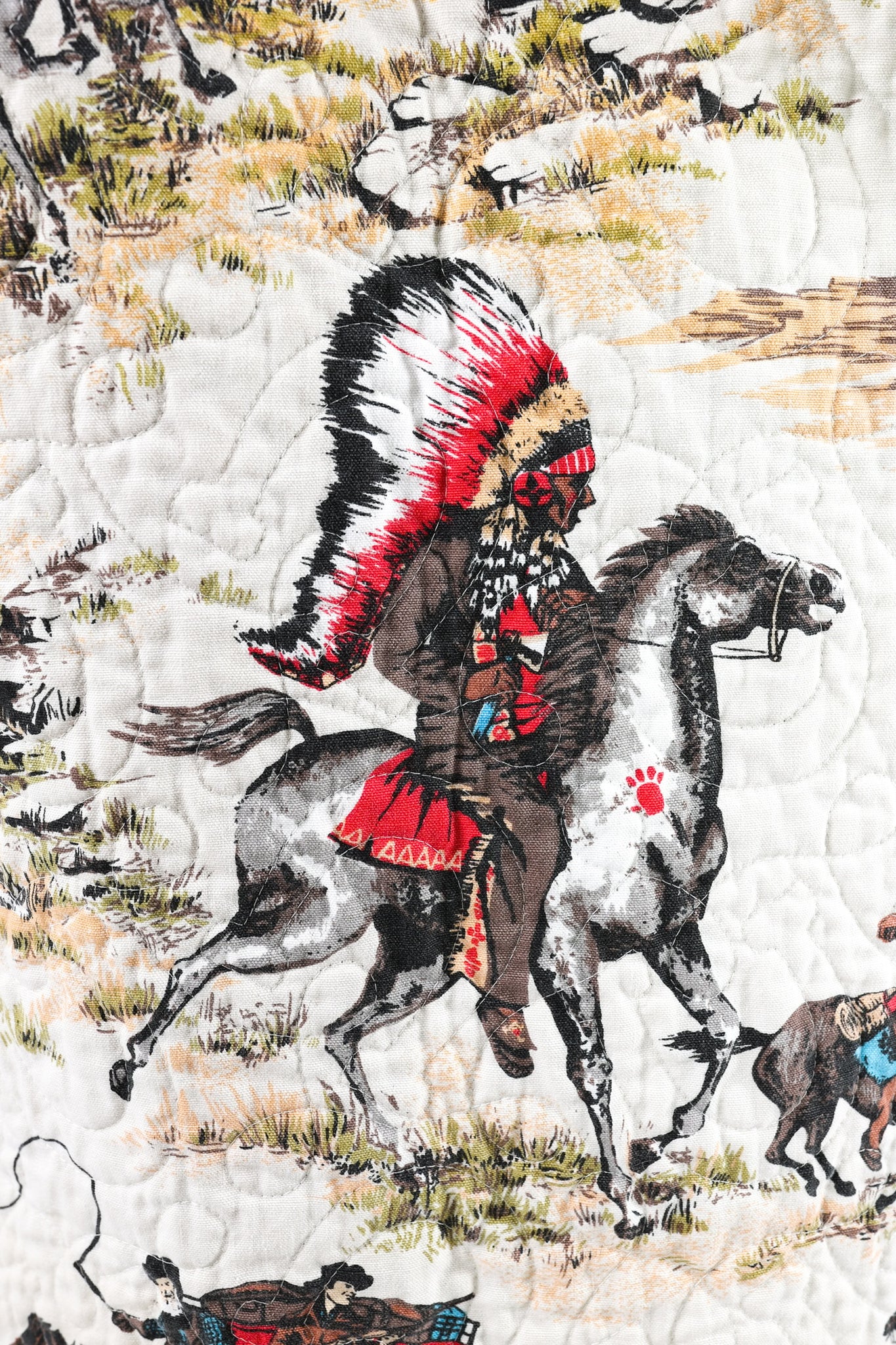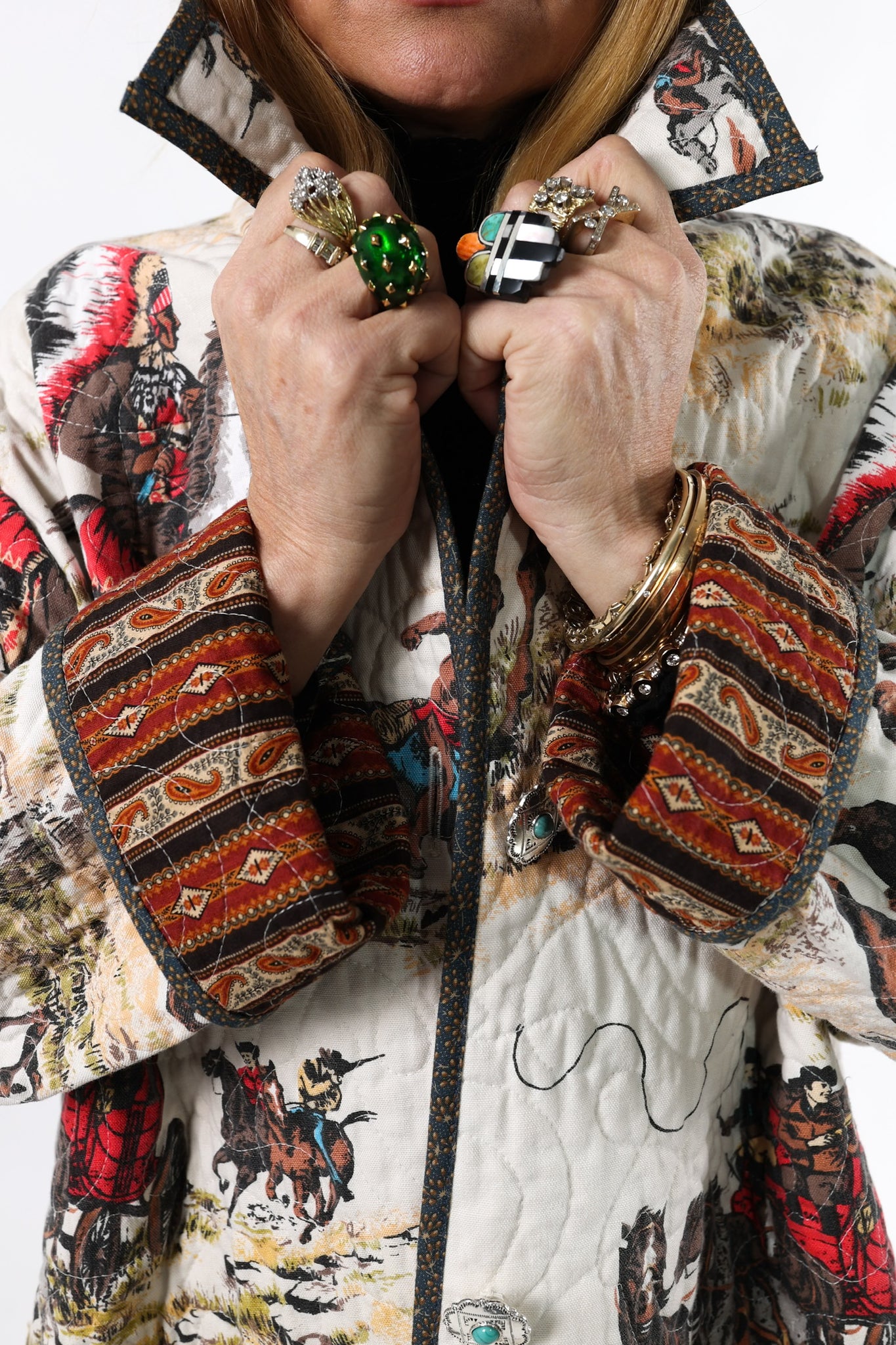 This quilt is a combination of vintage western upholstery fabric and contrasting turn of the century reproduction fabric. We love the depth of the cowboy & Indian stagecoach scene, creating pictorial wearable art. For closures we used faux turquoise concho buttons. This piece is both a workhorse and a show horse, meaning you don’t need to handle it with extra care like our antique pieces. In our opinion, the jacket is thin, lightweight, and moves beautifully. This piece is a future heirloom and western stylists dream! Please note: this is a size medium! Please read sizing measurements below. If you have further questions please direct message us and we are happy to send you a video.