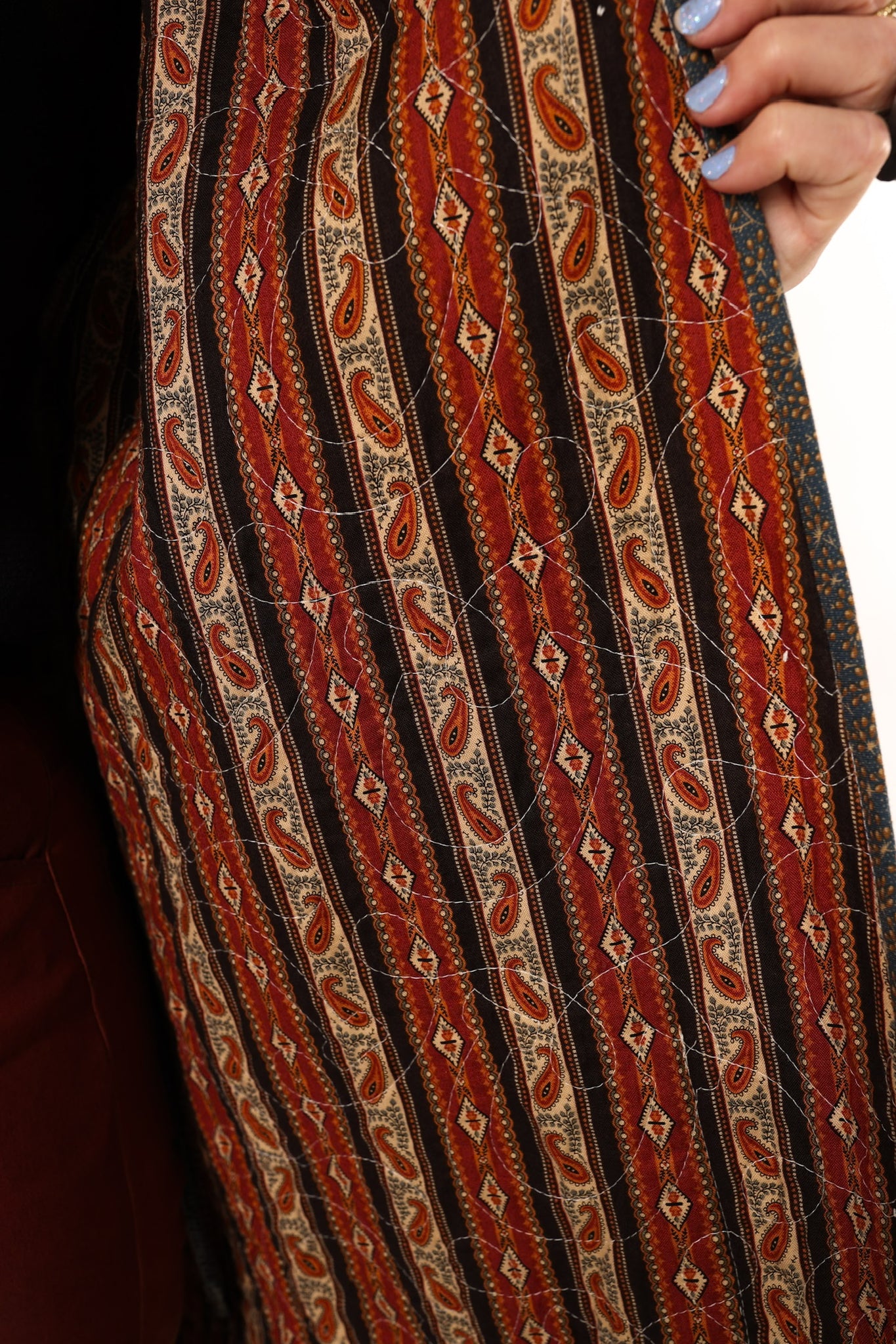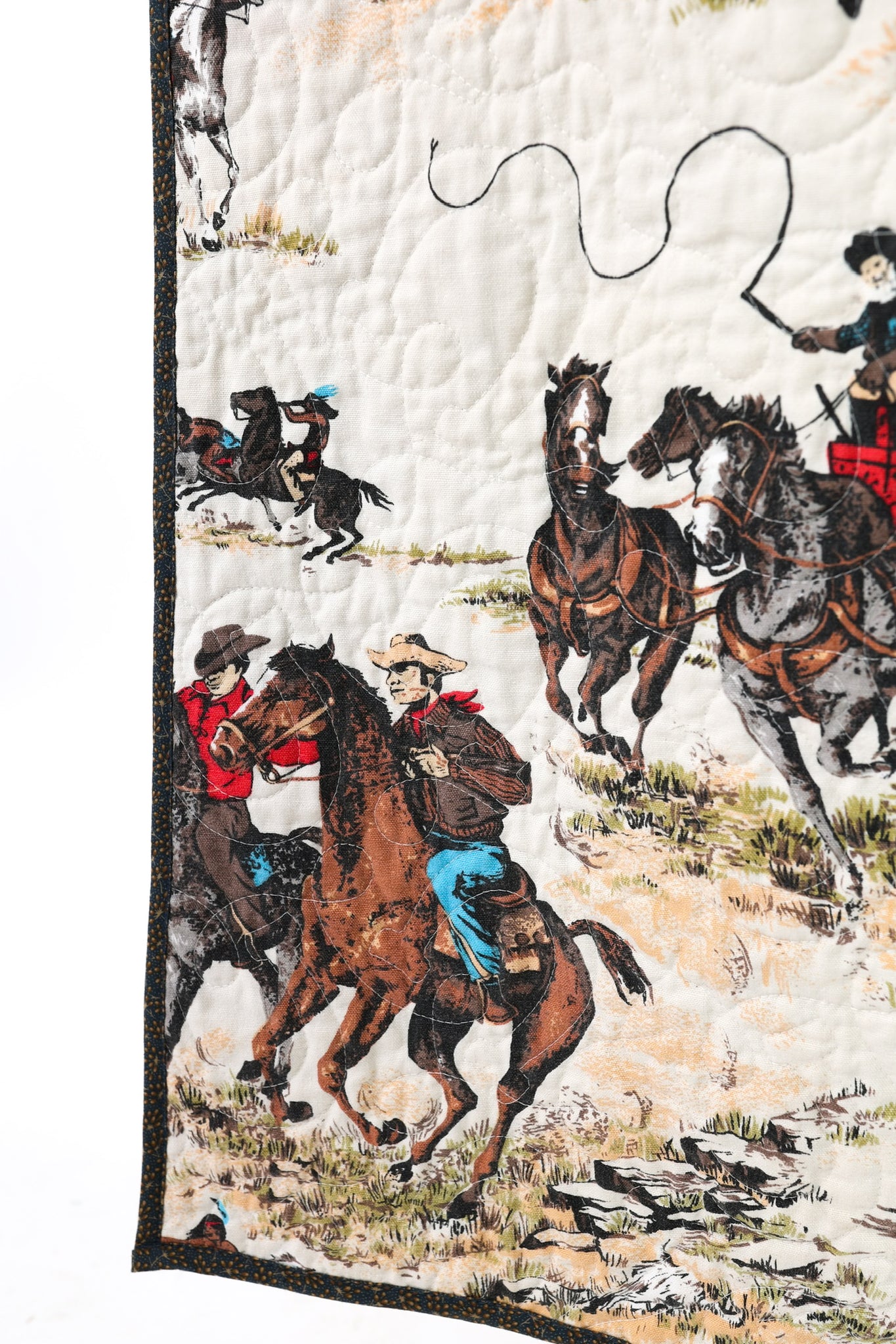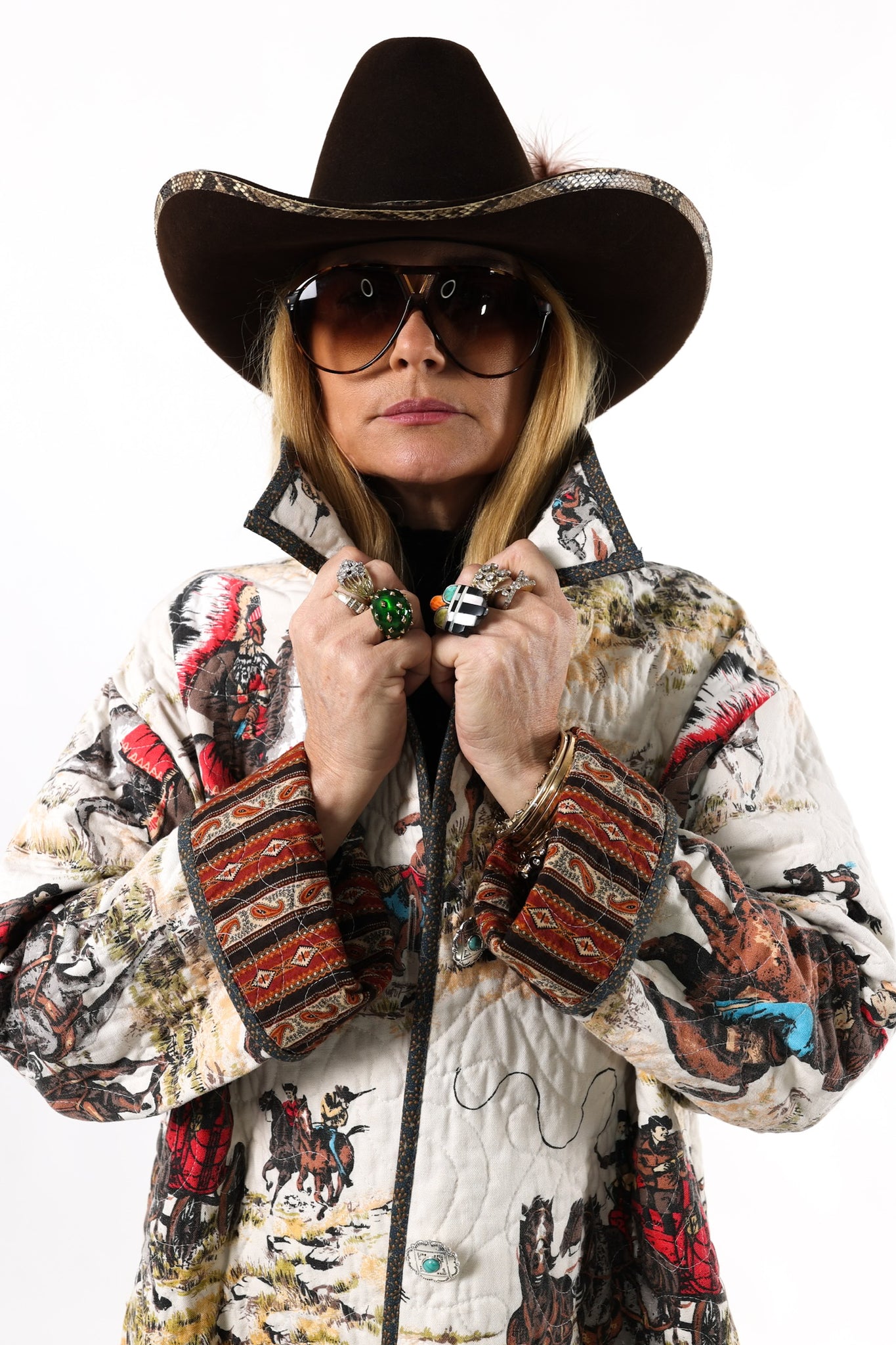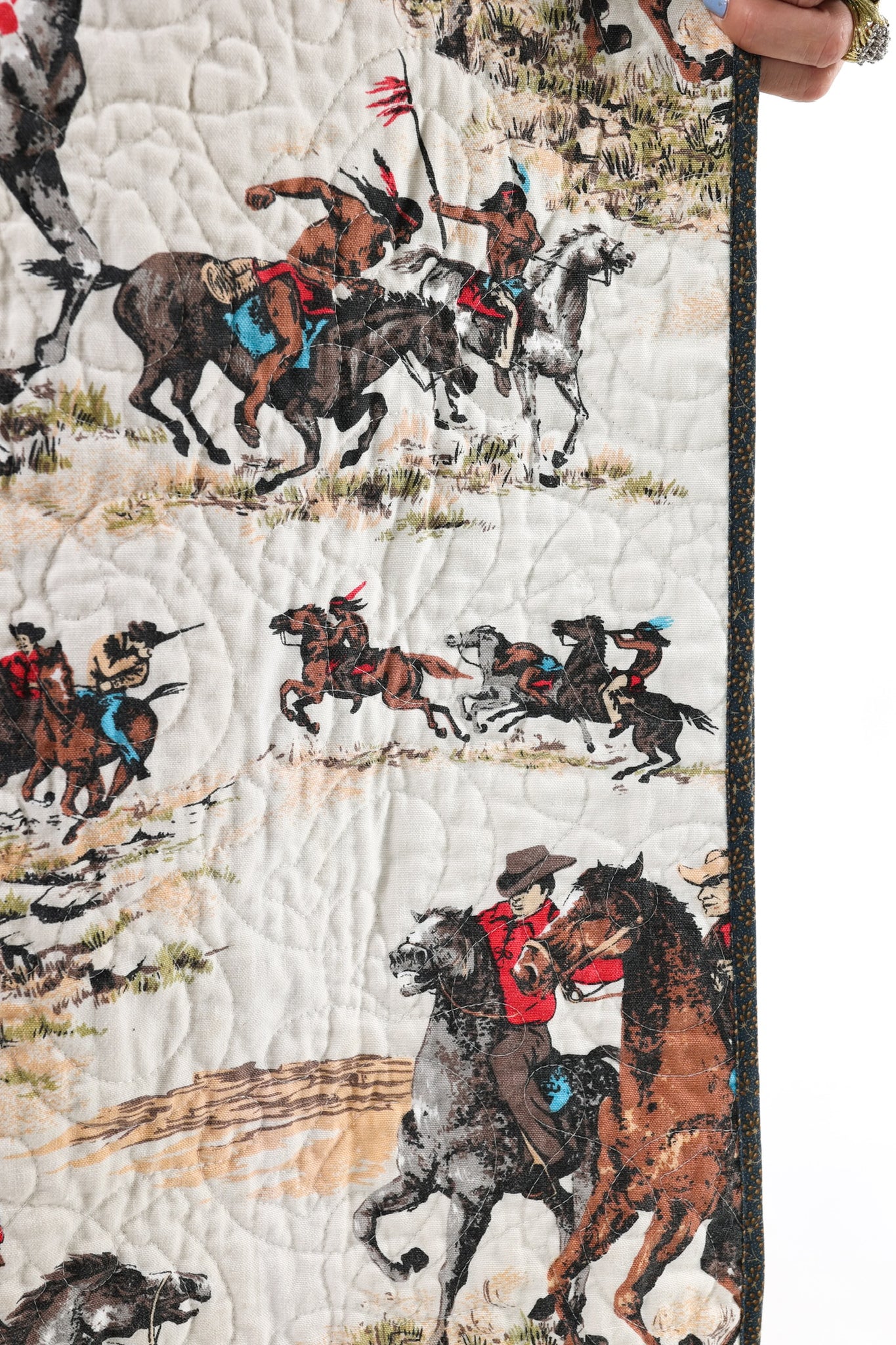 This quilt is a combination of vintage western upholstery fabric and contrasting turn of the century reproduction fabric. We love the depth of the cowboy & Indian stagecoach scene, creating pictorial wearable art. For closures we used faux turquoise concho buttons. This piece is both a workhorse and a show horse, meaning you don’t need to handle it with extra care like our antique pieces. In our opinion, the jacket is thin, lightweight, and moves beautifully. This piece is a future heirloom and western stylists dream! Please note: this is a size medium! Please read sizing measurements below. If you have further questions please direct message us and we are happy to send you a video.