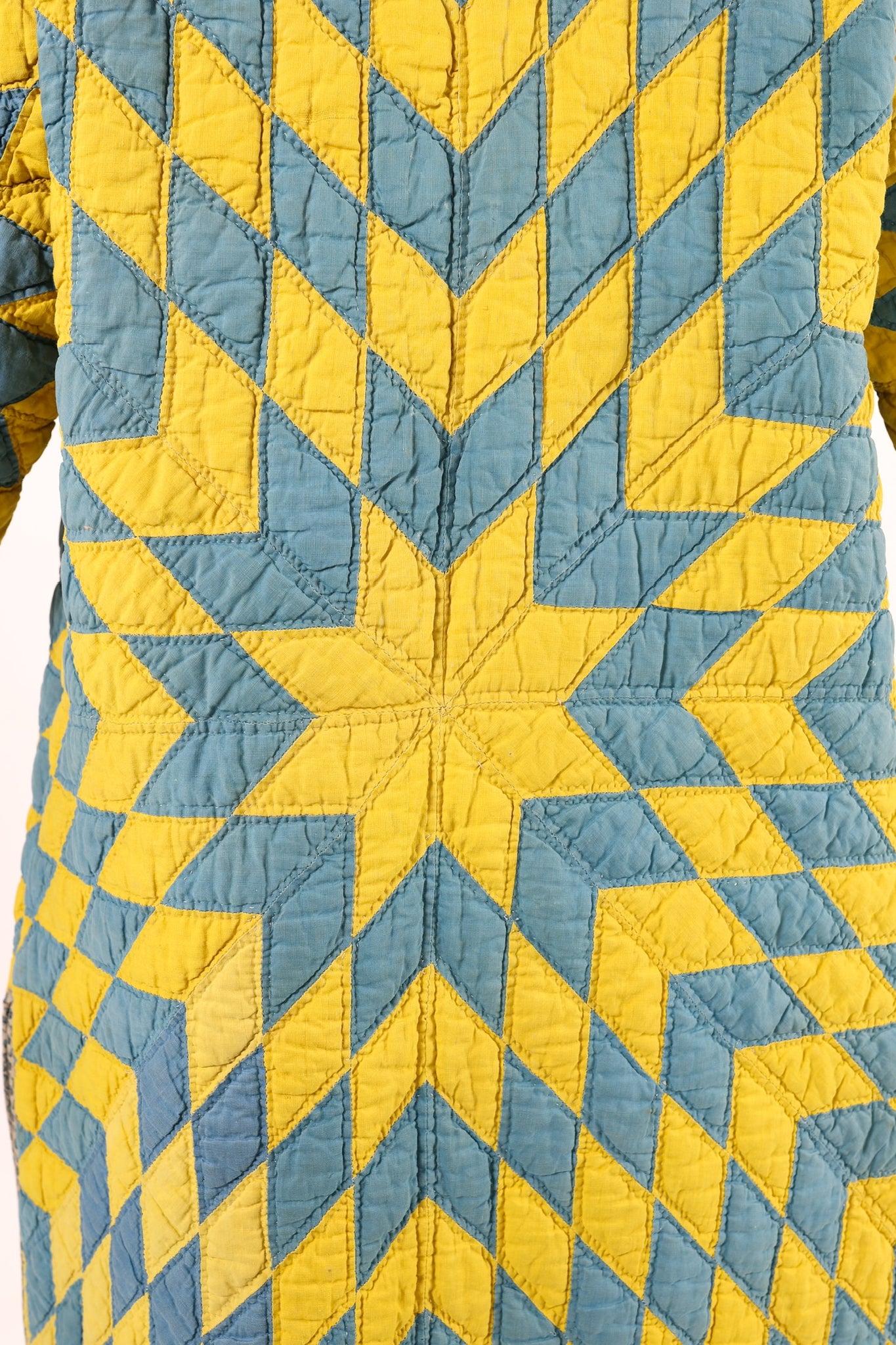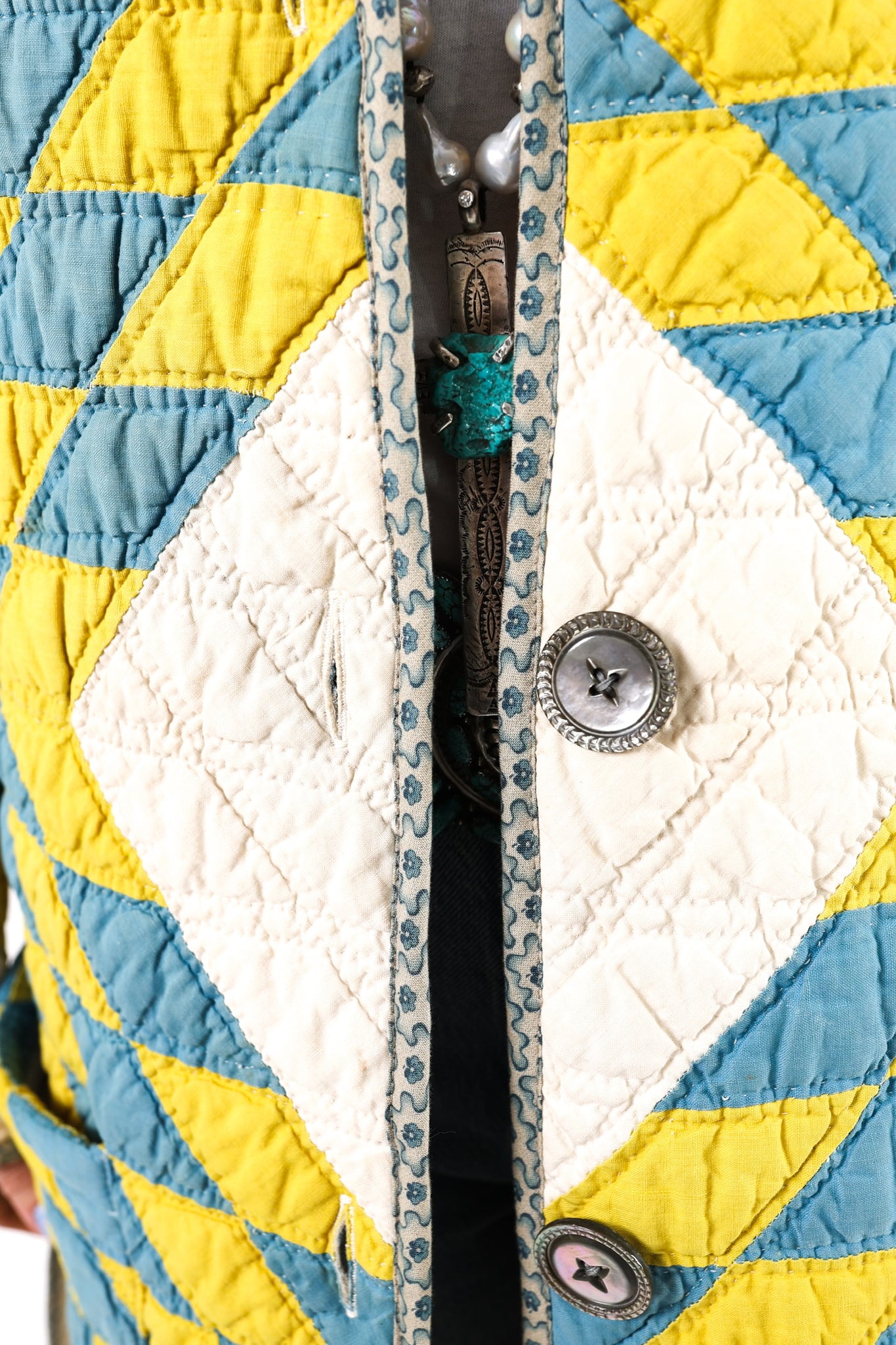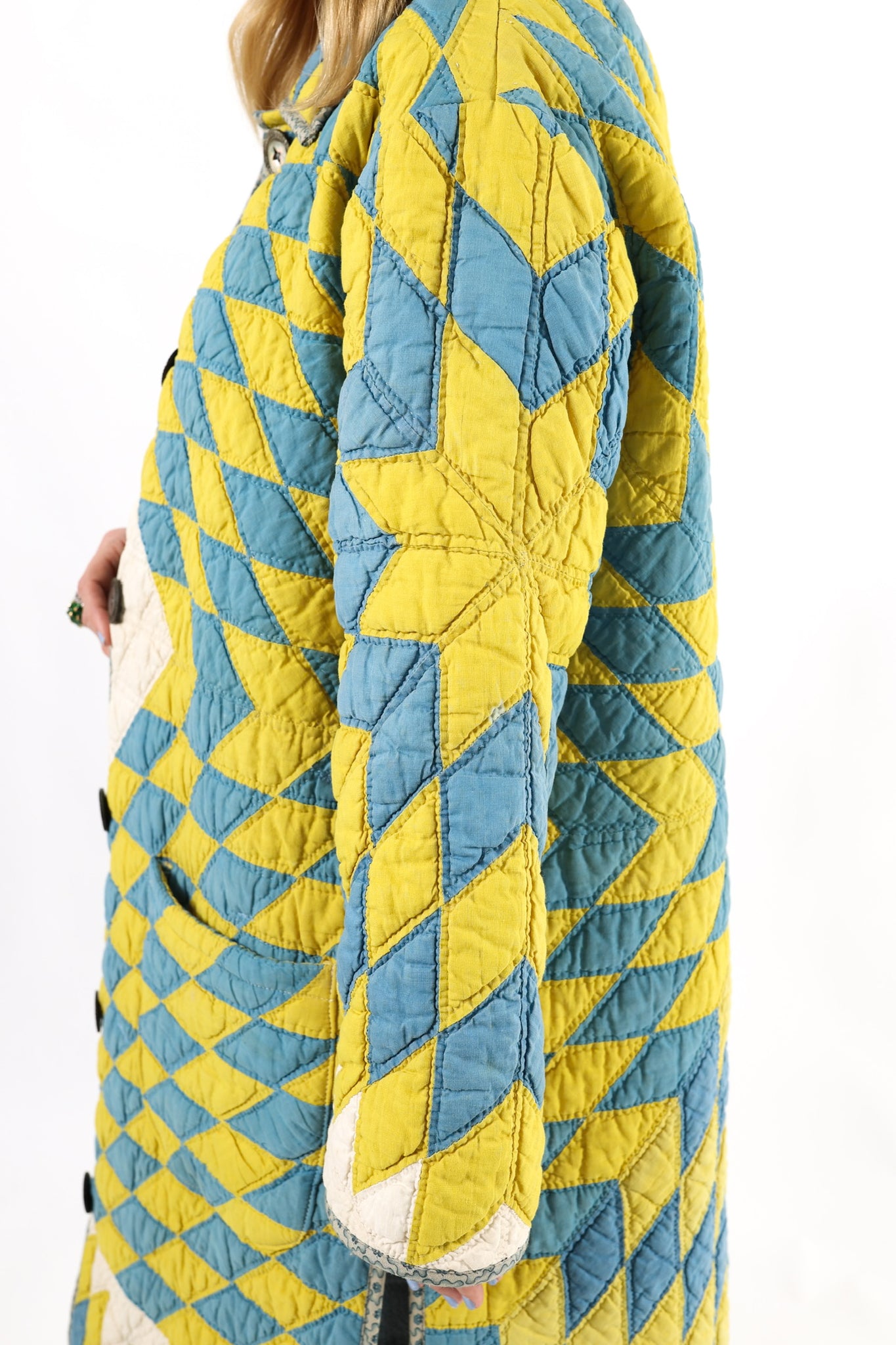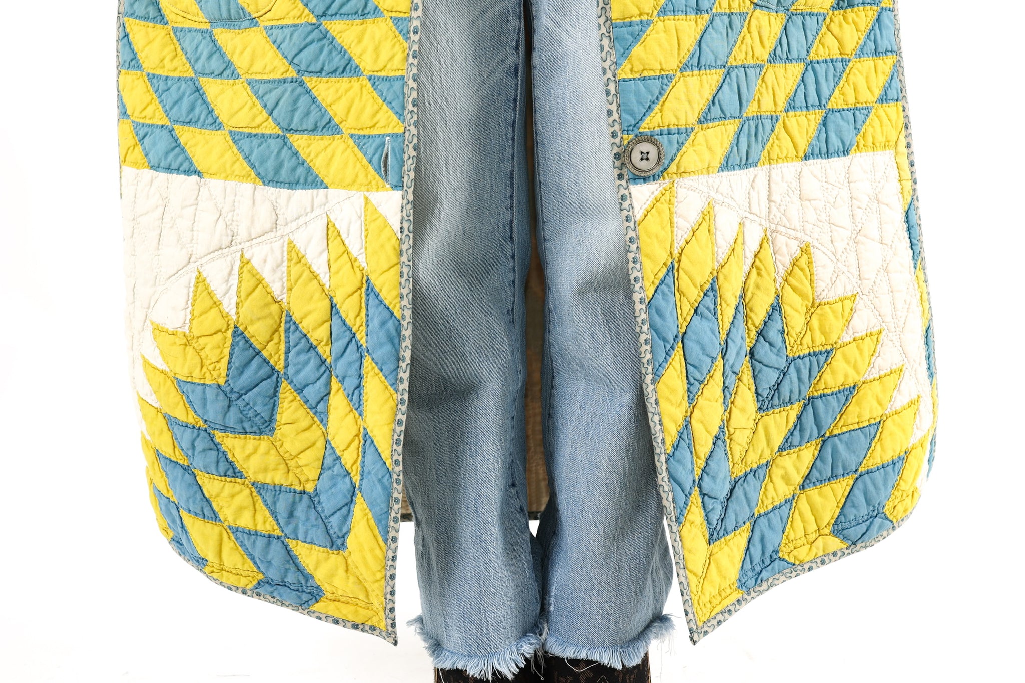 Please note that most of our jackets are made from antique quilts and the fabrics reflect this. Our fabrics are sometimes older than 100 years old and are perfectly worn. We believe this is what makes them special and is part of their charm. All of our garments are pre-washed in special restoration quilt wash. We recommend only spot cleaning if necessary.