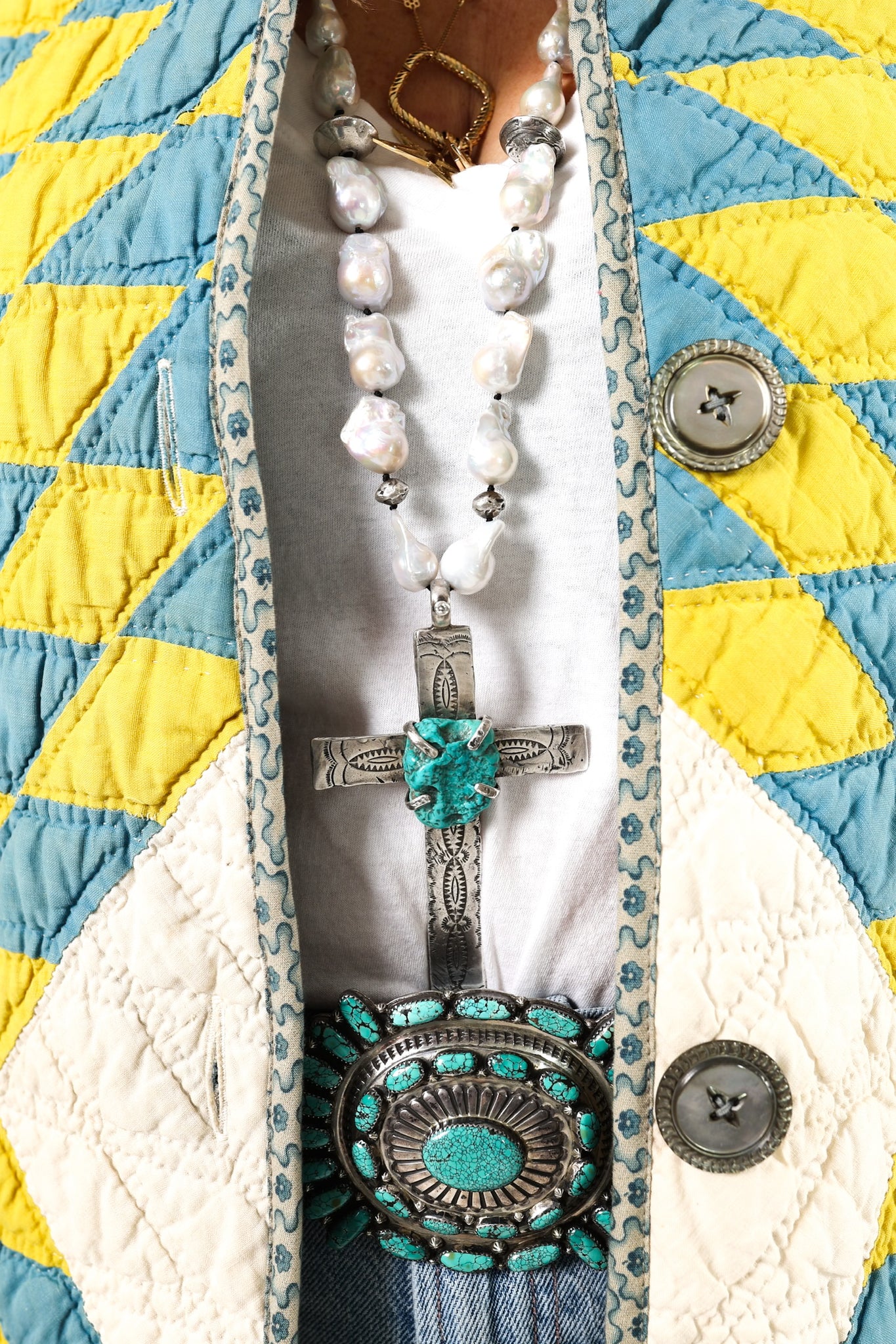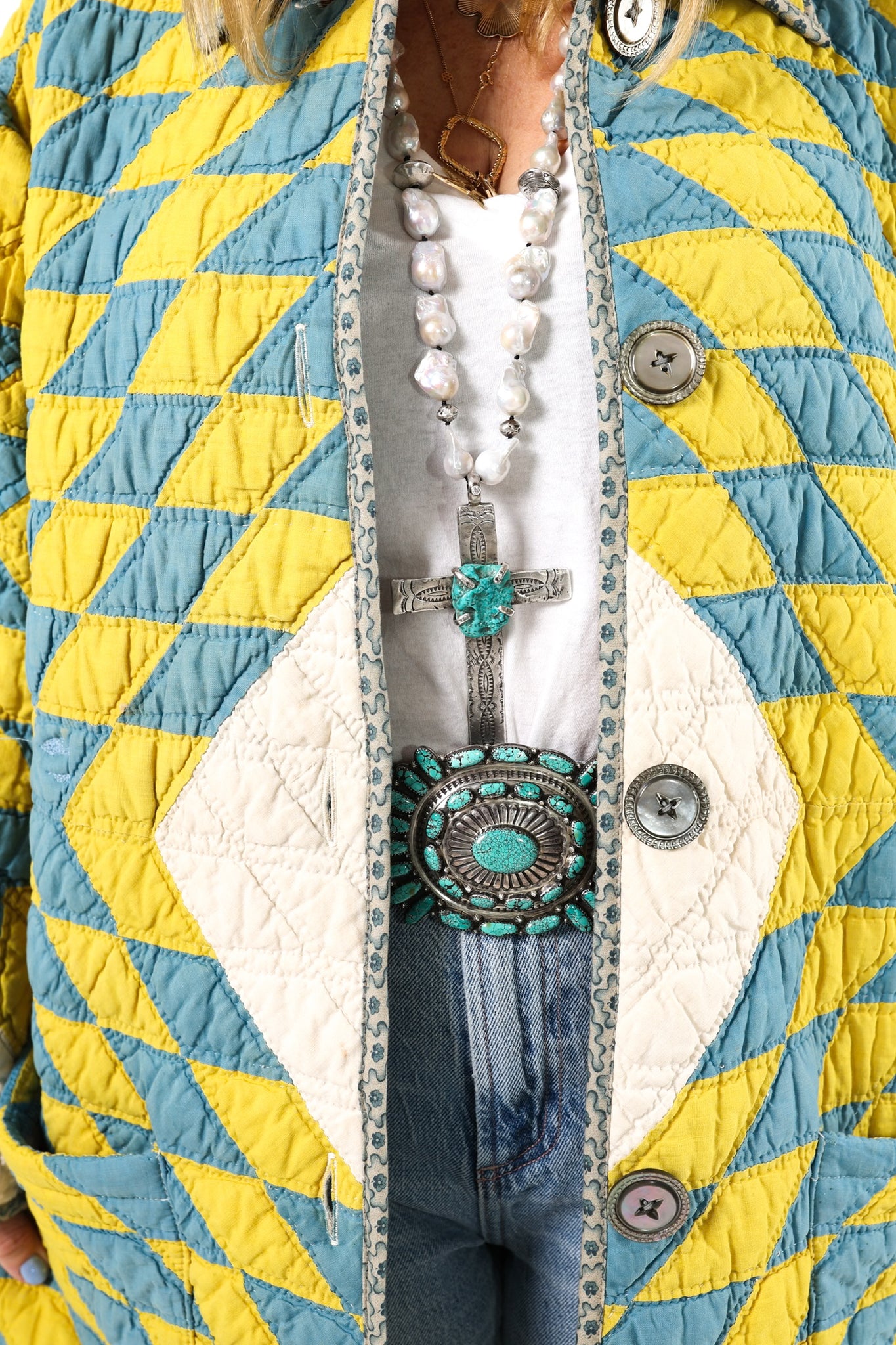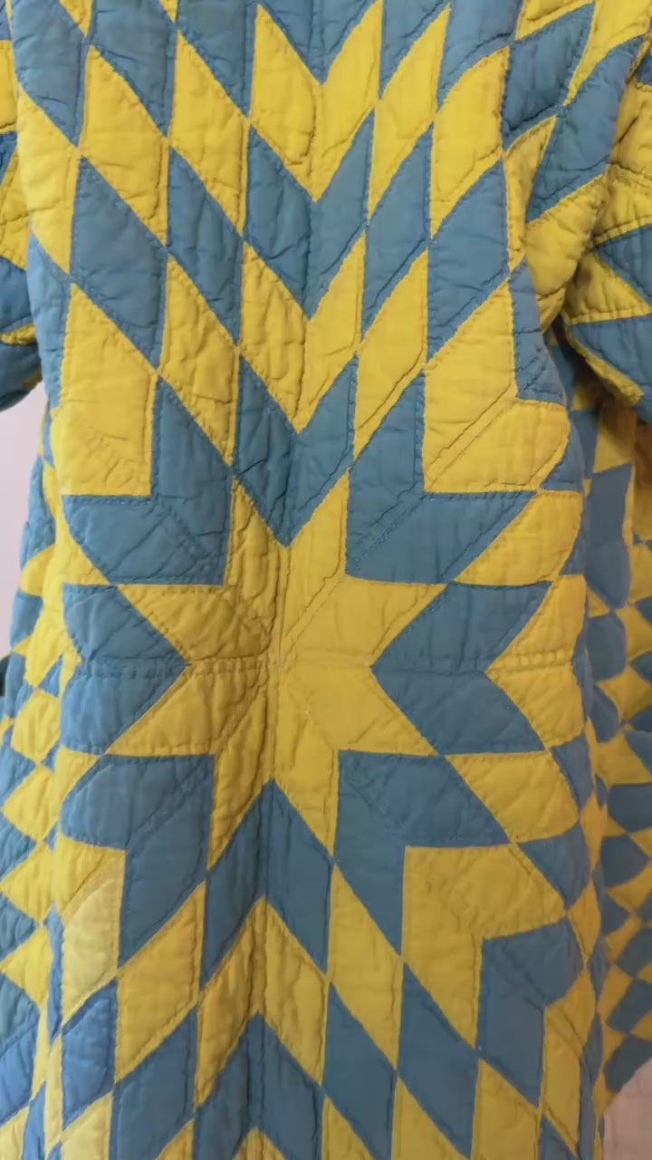 This is an American antique quilt made circa 1890s to 1920s. It is an Elevated Lone Star quilt pattern with extra satellites. The quilt has been beautifully hand quilted and hand sewn, which is a labor of love and a lost art. We love the colorway of this piece. In our opinion, the jacket is lightweight, very soft, and has medium loft (puffiness). We used antique Mother of Pearl buttons as the closures. Please note: there age marks throughout. They are very subtle, we tried to capture them in the photographs. There are also a few very minor zig zag mends that blend seamlessly into the quilt. Please note: this is a size medium, however, due to the loft it will still fit similar to our standard sizing. Please read the sizing below. If you have further questions please direct message us and we are happy to send you a video.