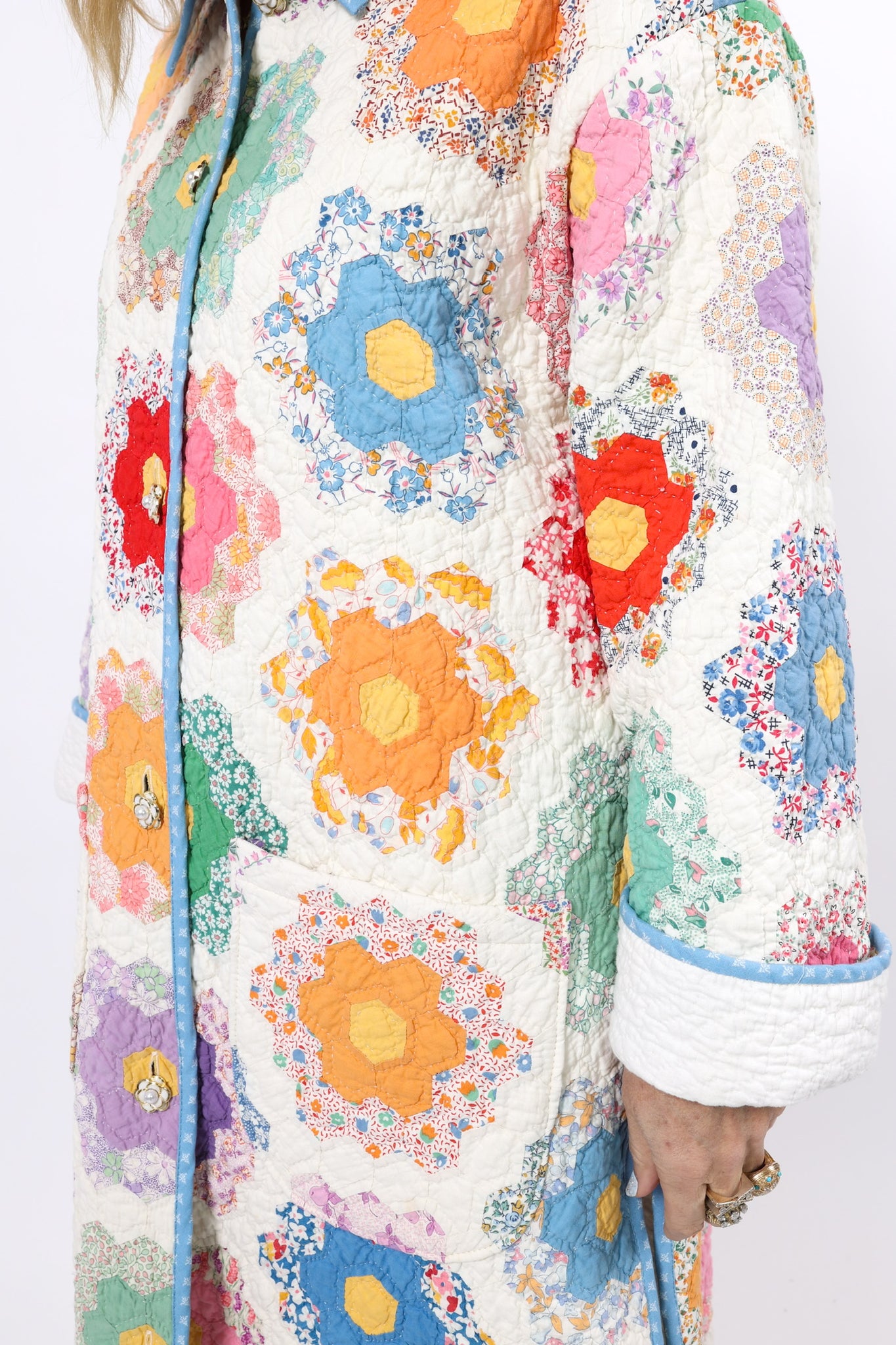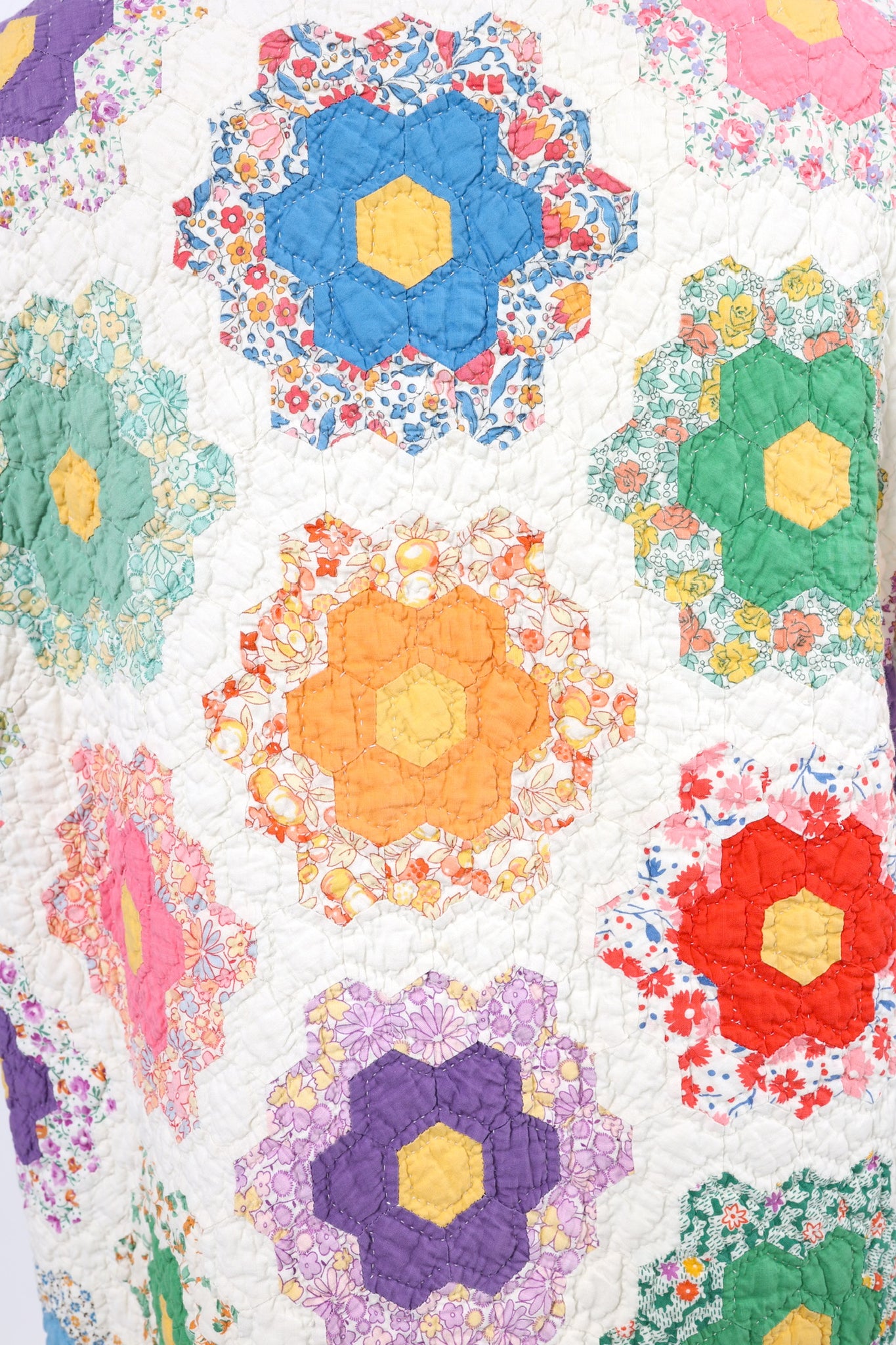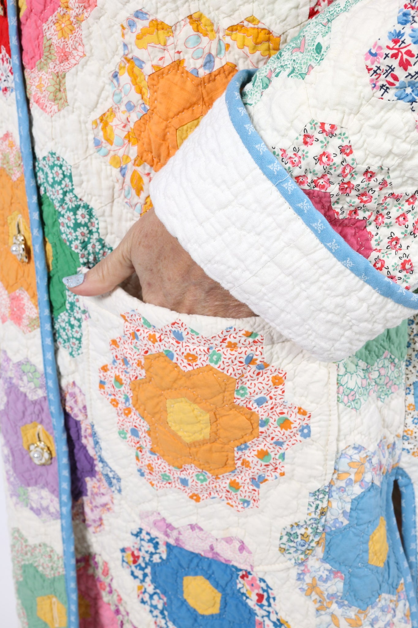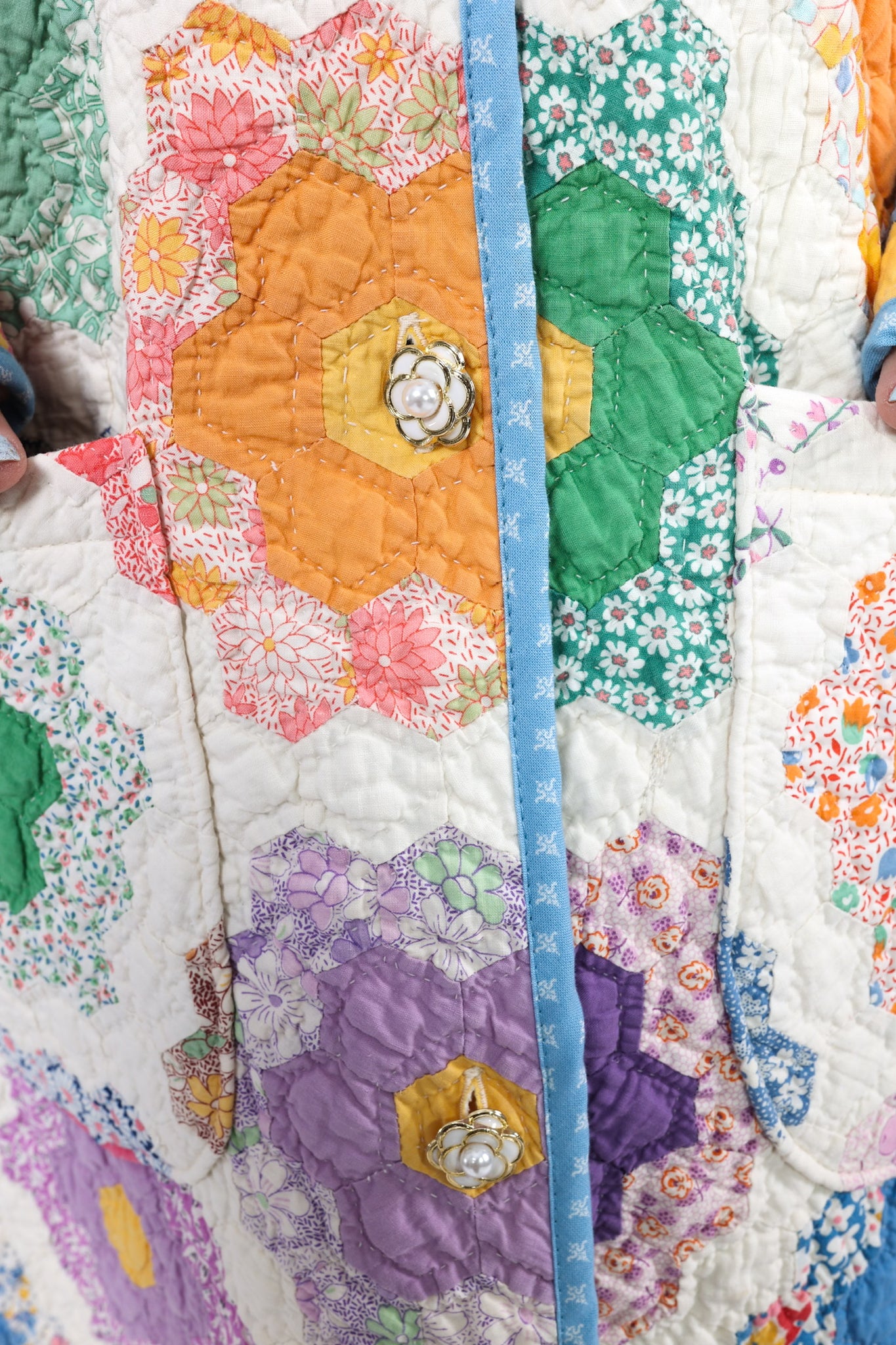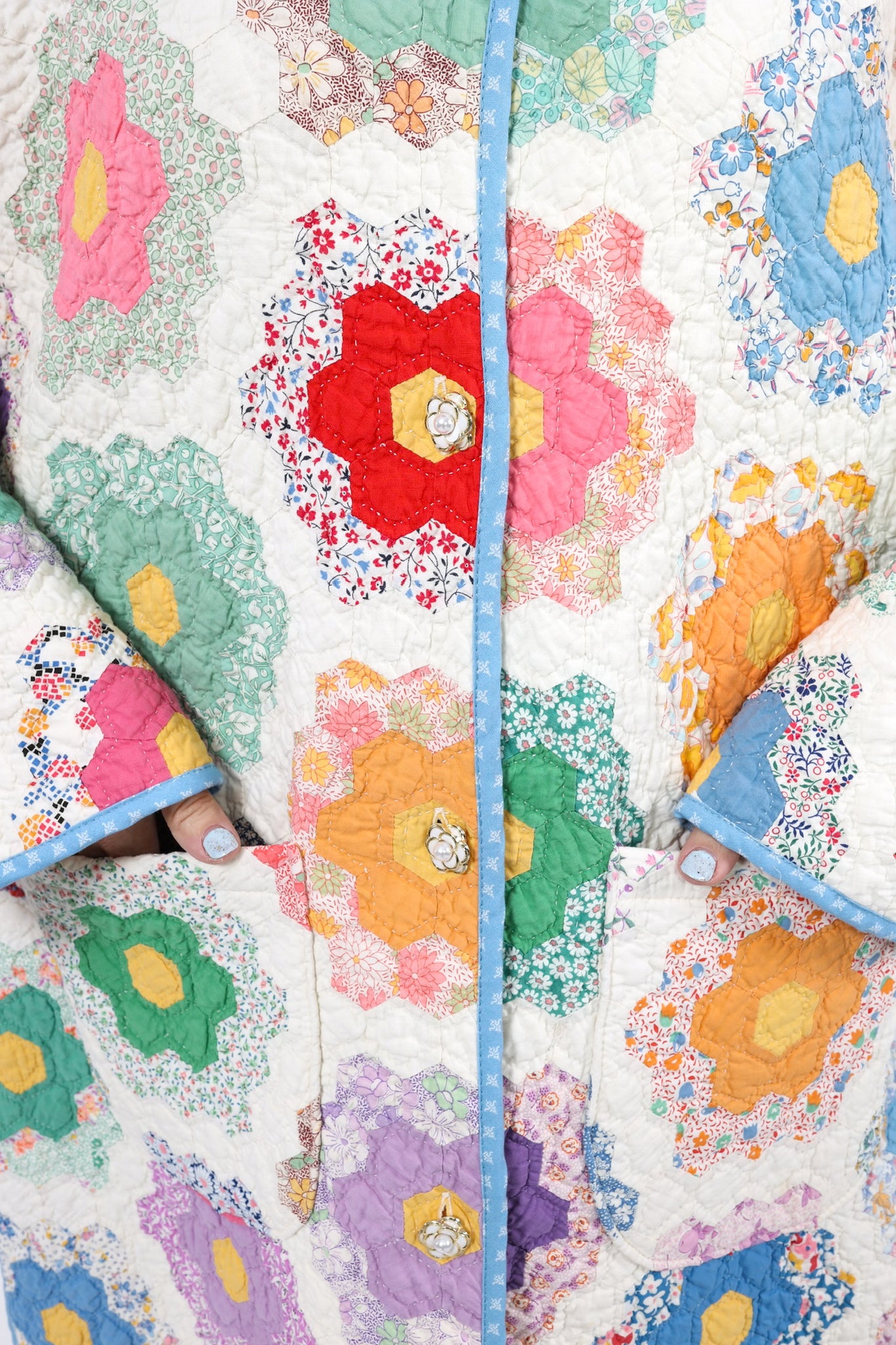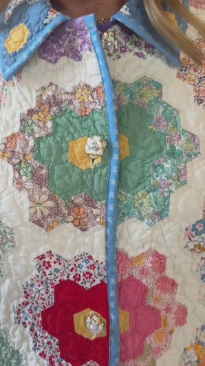 This is an antique American quilt made circa 1930s to1940s. It is a traditional Grandmother's Garden quilt pattern. The quilt has been meticulously hand sewn and beautifully hand quilted. In our opinion, the jacket is thin, lightweight, very soft, very comfortable to wear, and has a beautiful and flattering drape. For closures we used gold and white enamel buttons. There is a faint age spot on the inside of the jacket, it does not show through to the outside. Overall, this piece is in great condition. If you have further questions please direct message us and we are happy to send you a video.