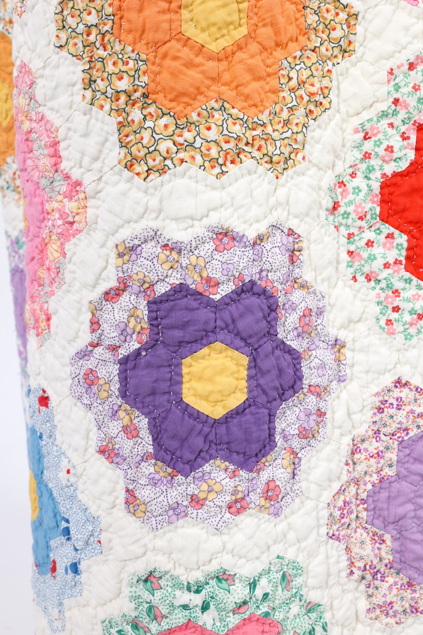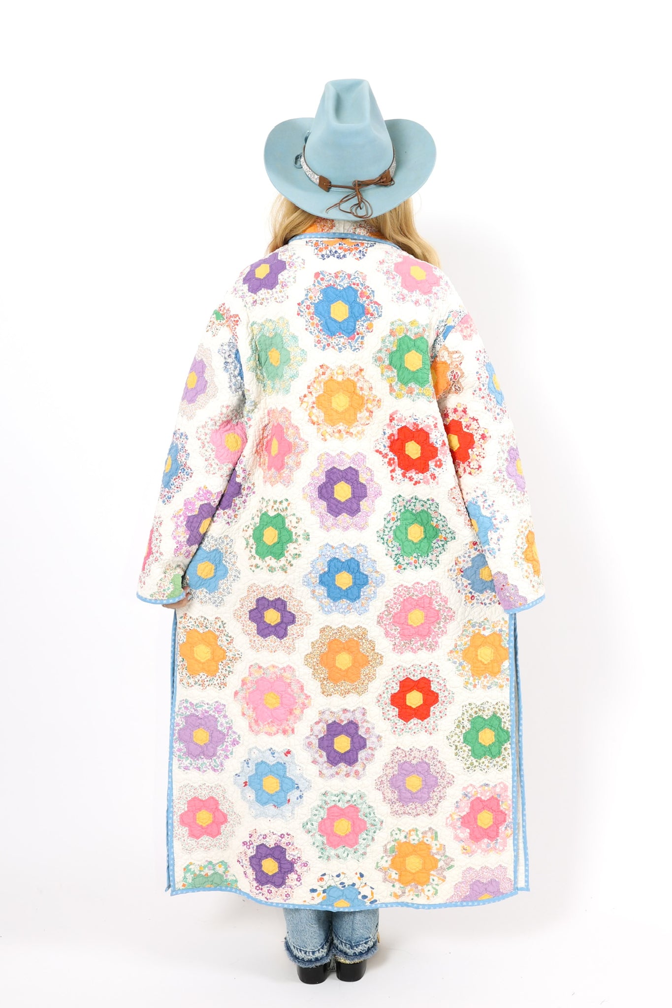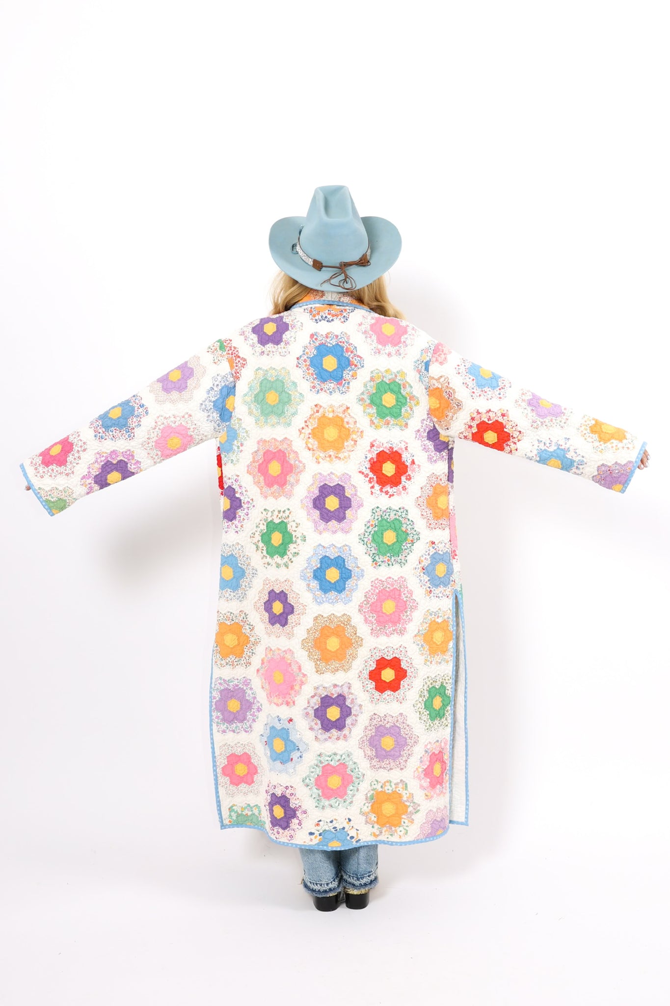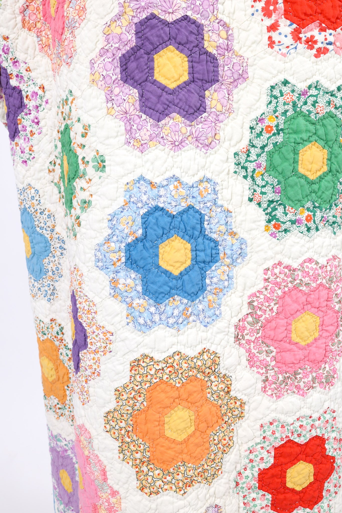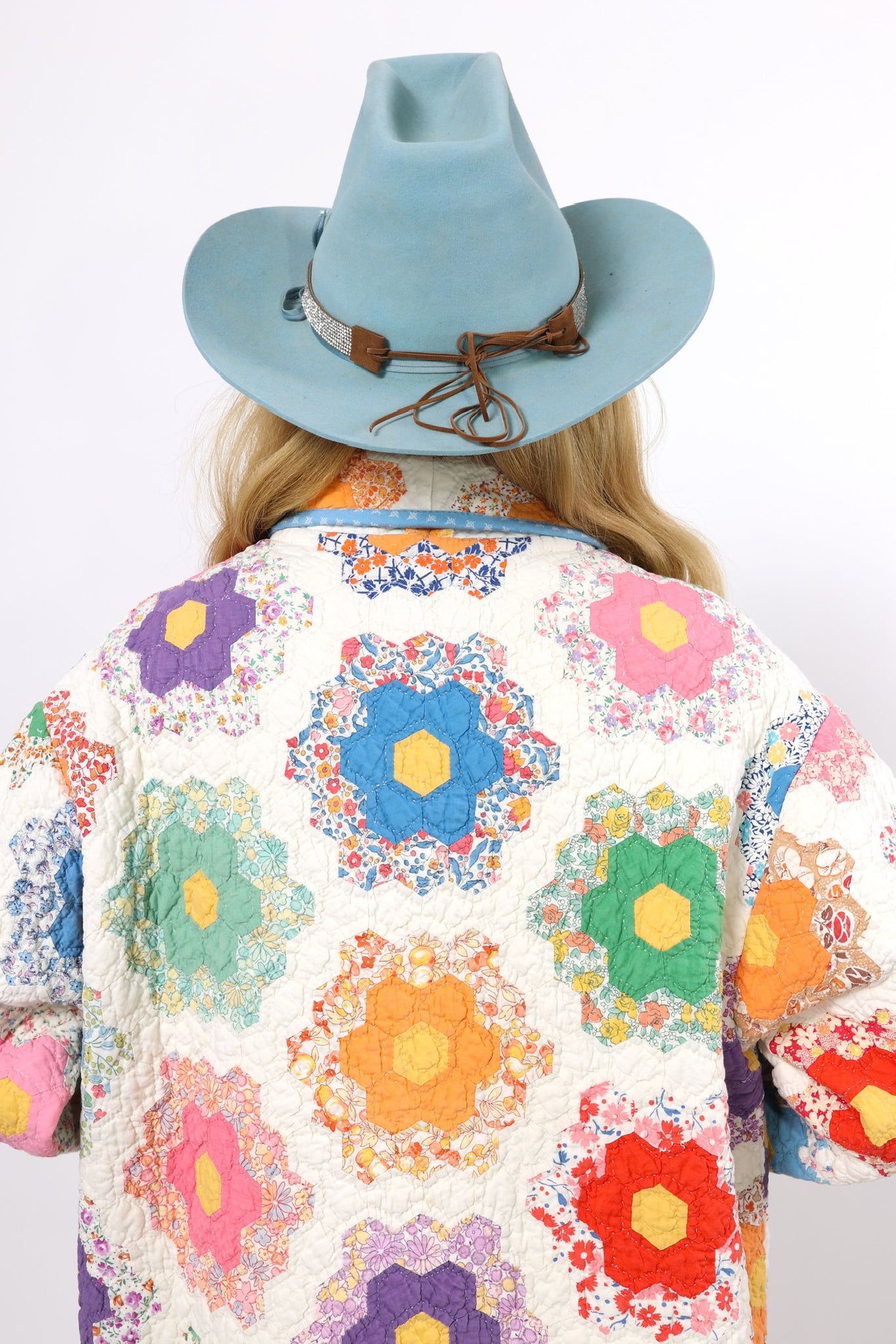 This is an antique American quilt made circa 1930s to1940s. It is a traditional Grandmother's Garden quilt pattern. The quilt has been meticulously hand sewn and beautifully hand quilted. In our opinion, the jacket is thin, lightweight, very soft, very comfortable to wear, and has a beautiful and flattering drape. For closures we used gold and white enamel buttons. There is a faint age spot on the inside of the jacket, it does not show through to the outside. Overall, this piece is in great condition. If you have further questions please direct message us and we are happy to send you a video.