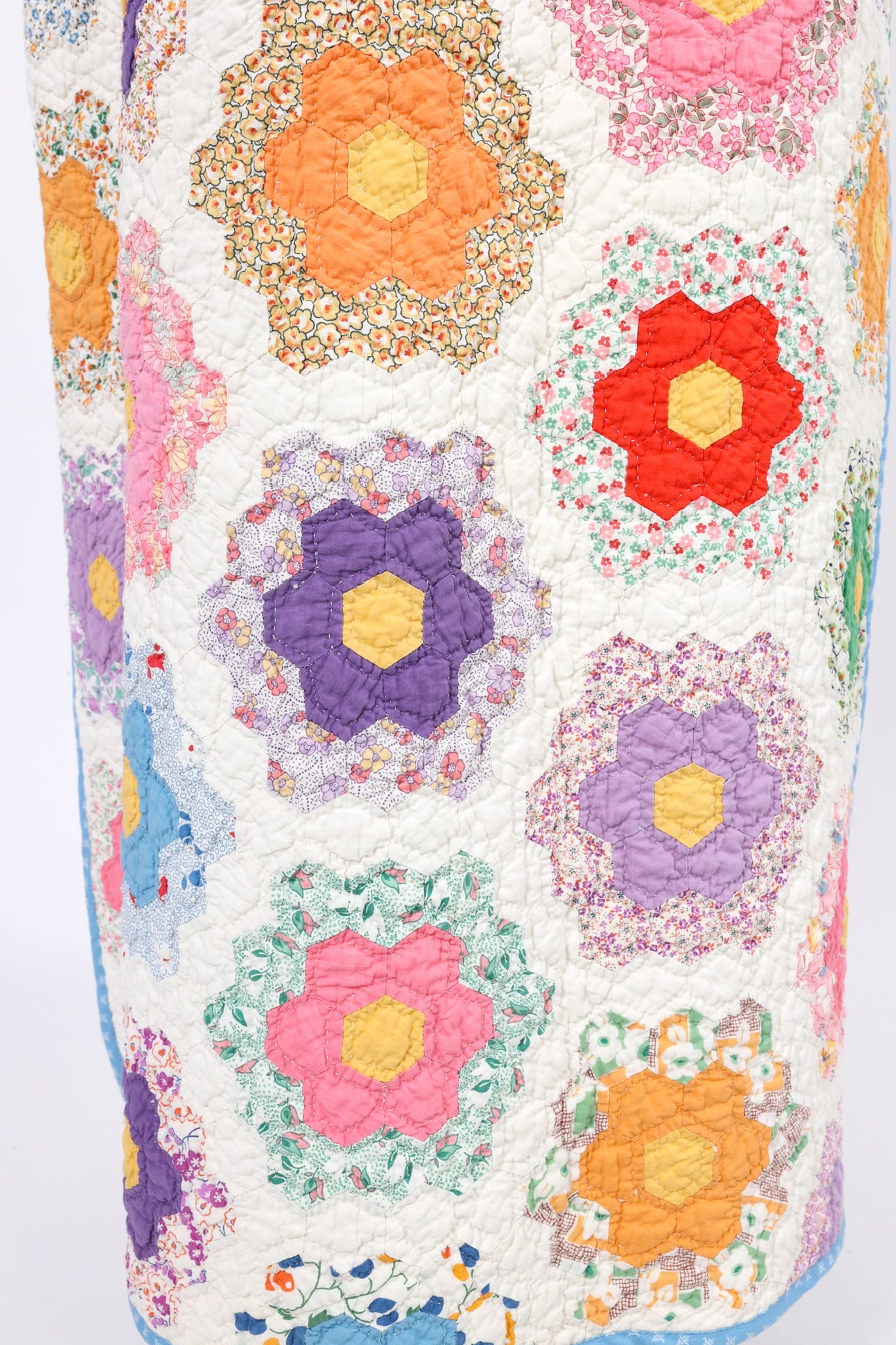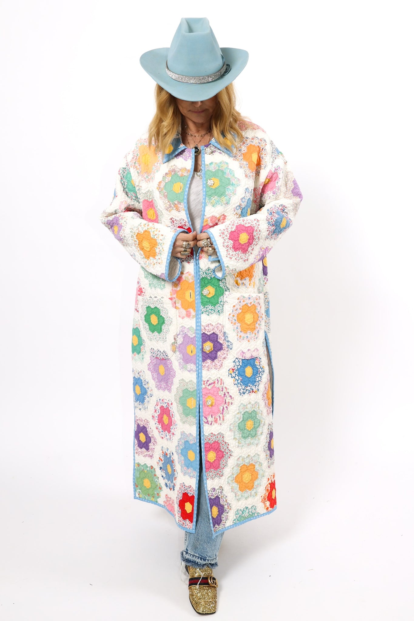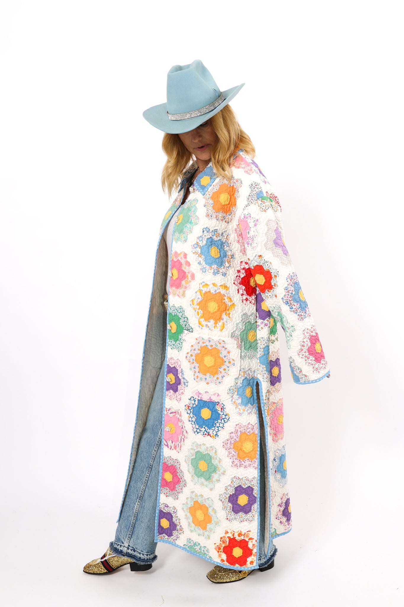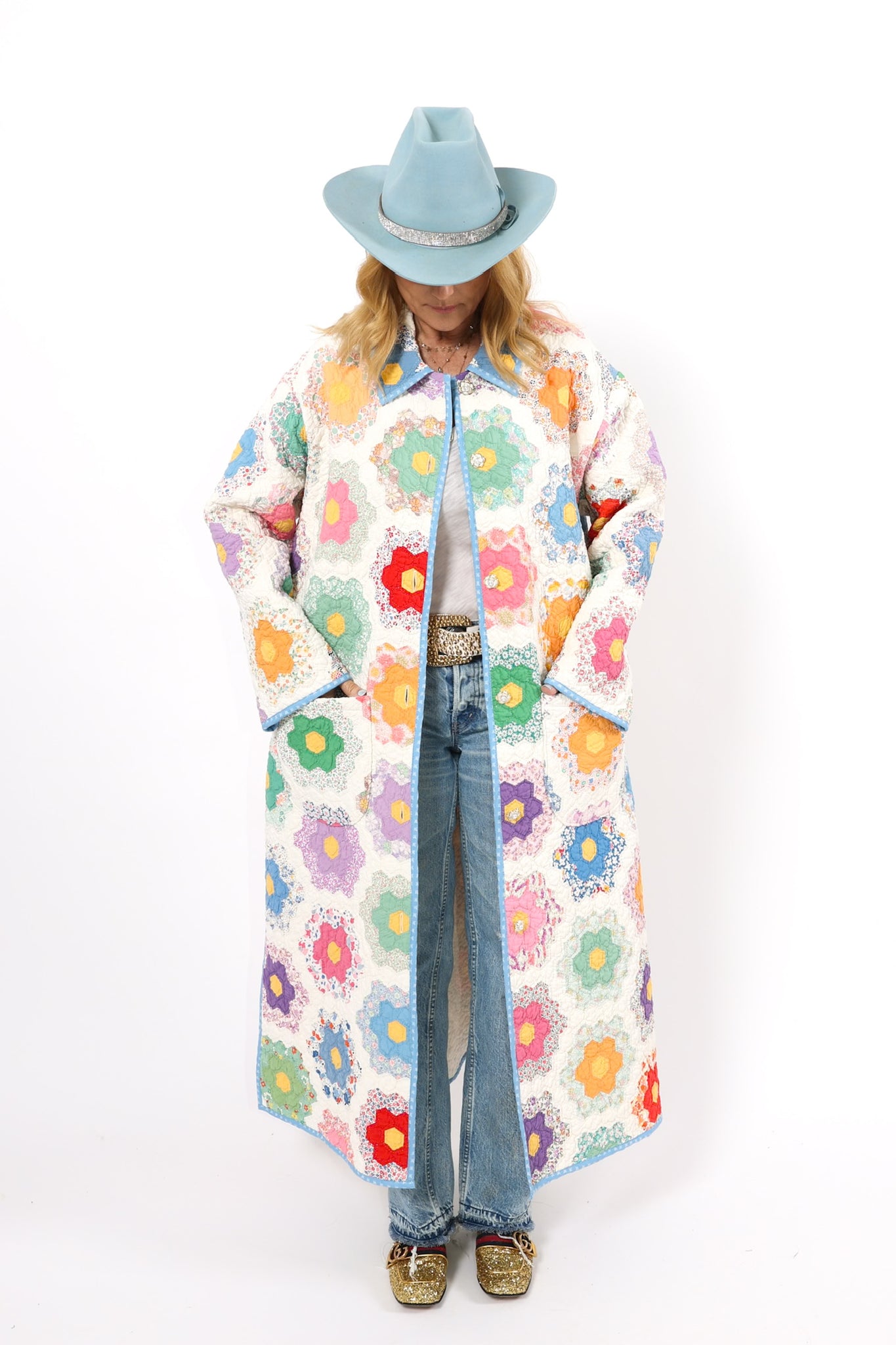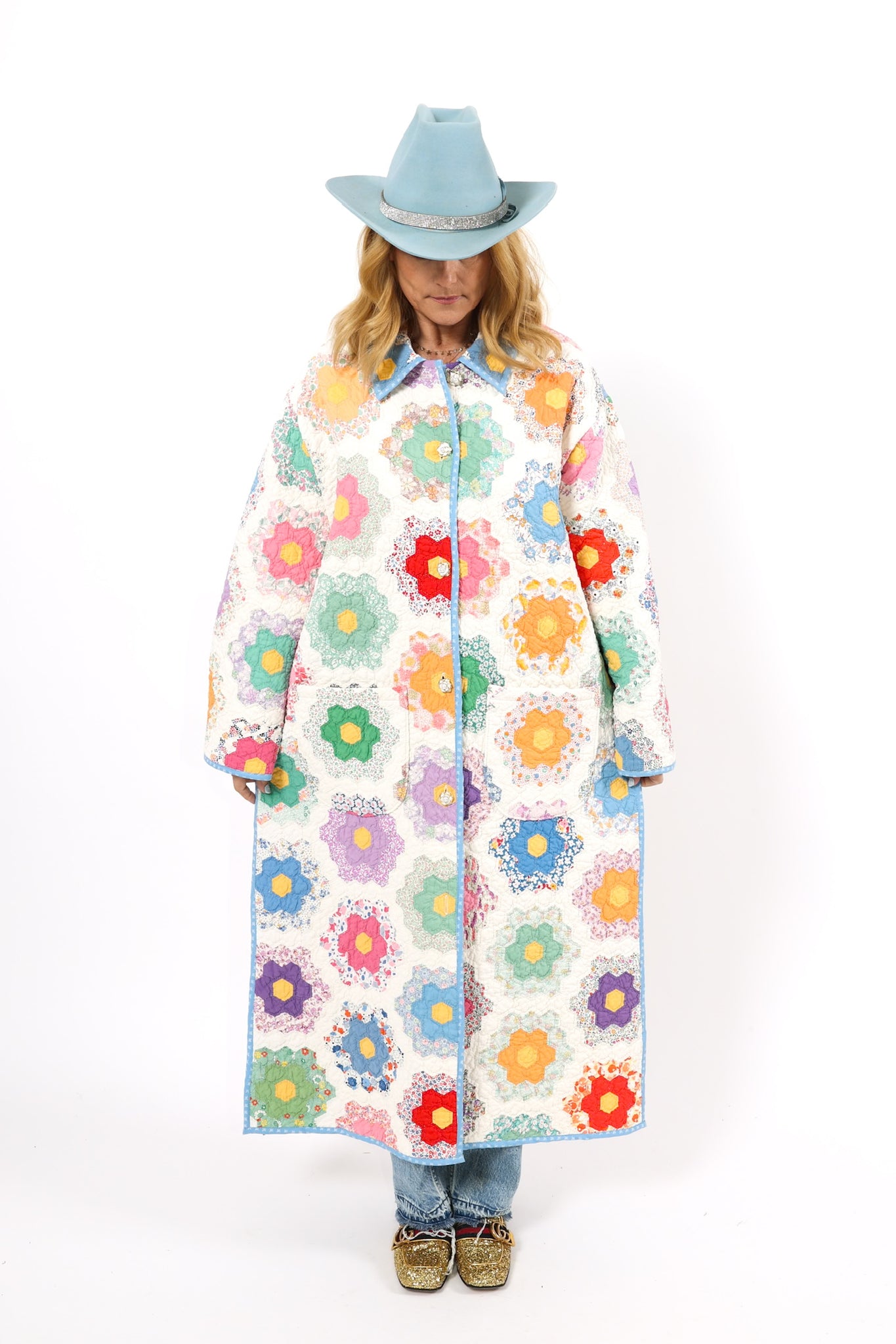 This is an antique American quilt made circa 1930s to1940s. It is a traditional Grandmother's Garden quilt pattern. The quilt has been meticulously hand sewn and beautifully hand quilted. In our opinion, the jacket is thin, lightweight, very soft, very comfortable to wear, and has a beautiful and flattering drape. For closures we used gold and white enamel buttons. There is a faint age spot on the inside of the jacket, it does not show through to the outside. Overall, this piece is in great condition. If you have further questions please direct message us and we are happy to send you a video.