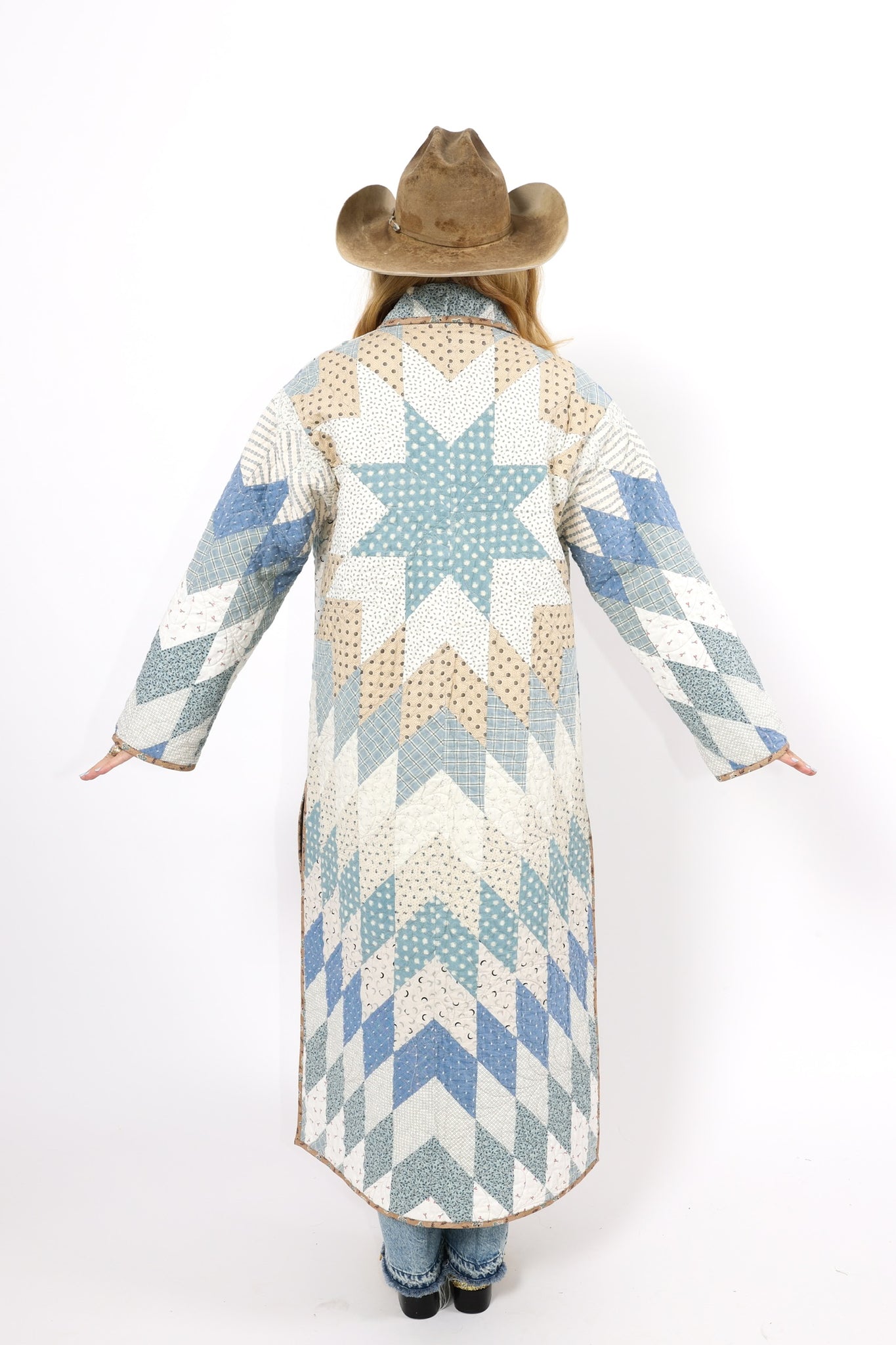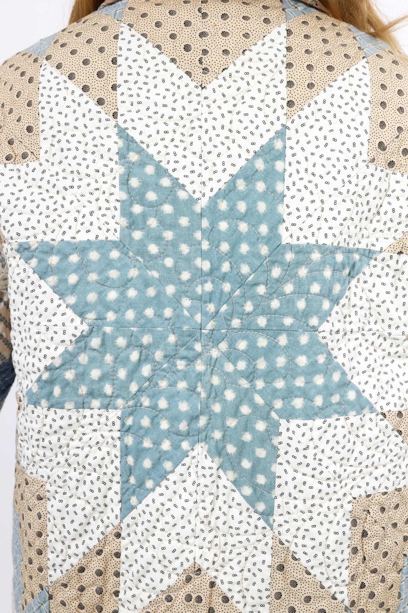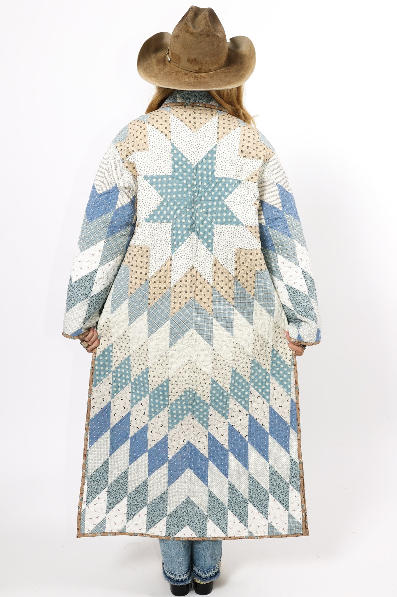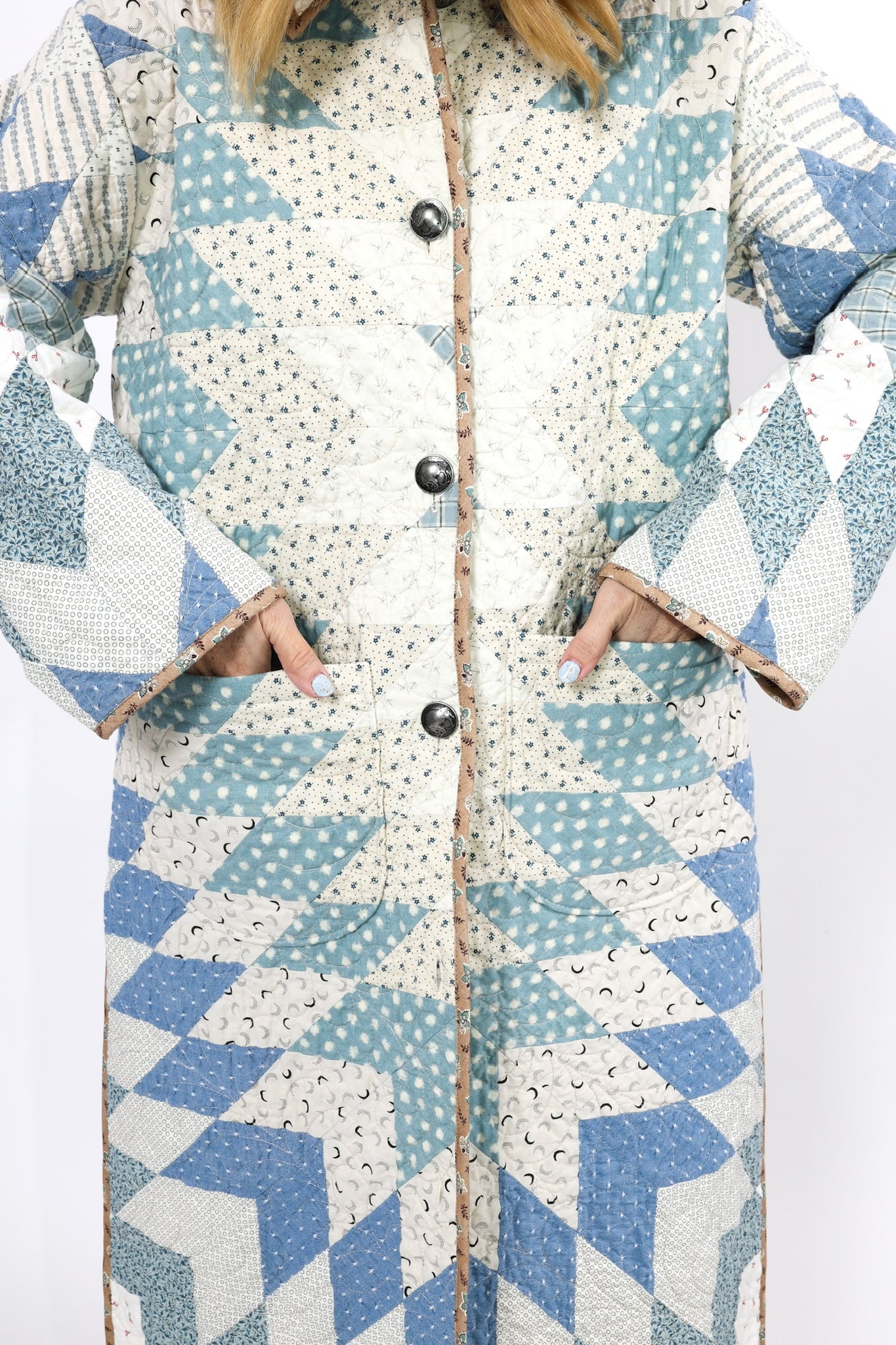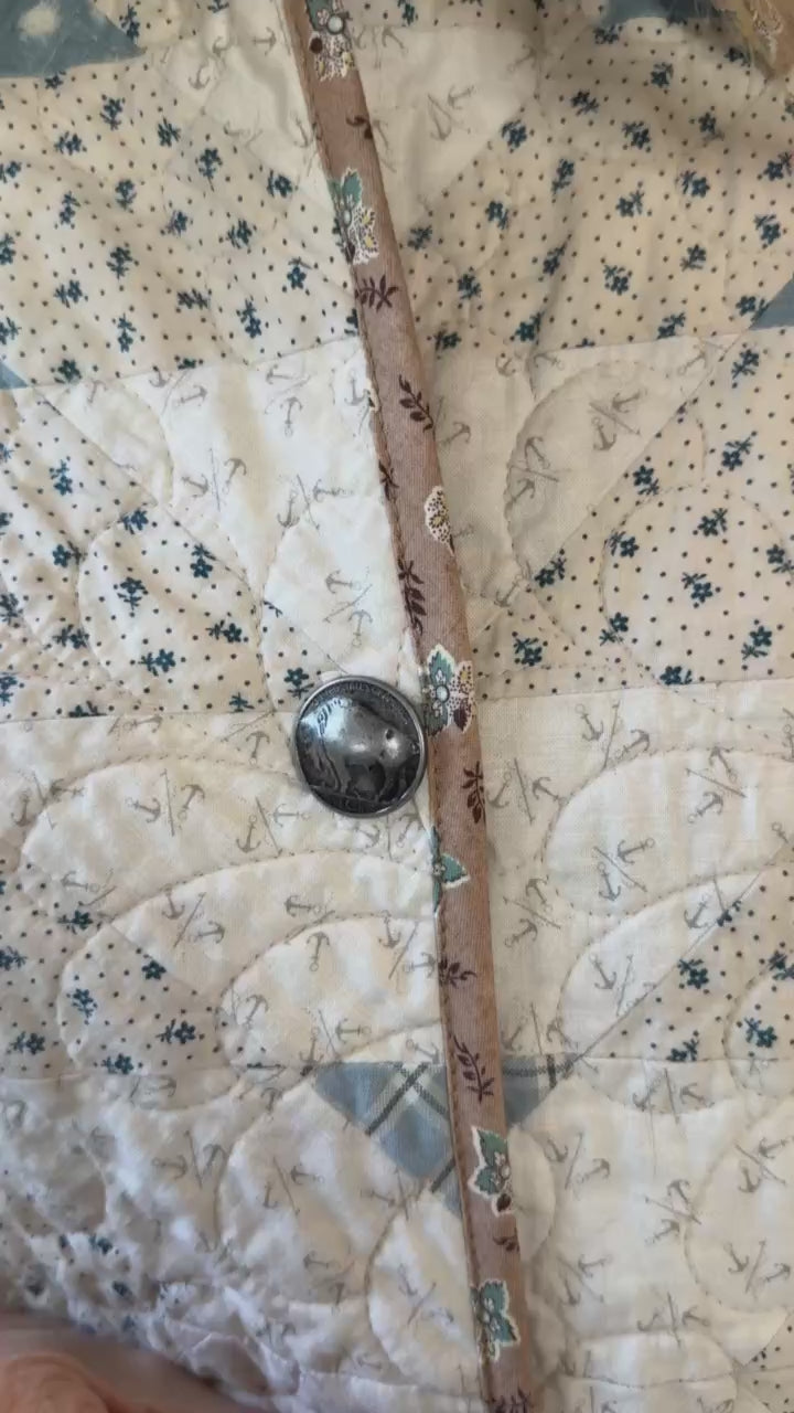 This is a Future heirloom and Lady Lancaster original design. It is part of her experiment of layering neutrals. It is loaded with novelty turn-of-the-century reproduction fabrics. It is a traditional Lone Star quilt pattern. This piece is both a workhorse and a show horse, meaning you don’t have to be careful with the fabrics or treat it like one of our antique jackets. In our opinion, the jacket is soft, thin, lightweight, and a dream to wear. For closures, we used faux silver buffalo nickel buttons. This is a Lady Lancaster 10/10! This piece would look great with a fur. We have added a few options with this listing. If you would like to add a fur, please reach out after purchasing. If you have further questions please direct message us and we are happy to send you a video.