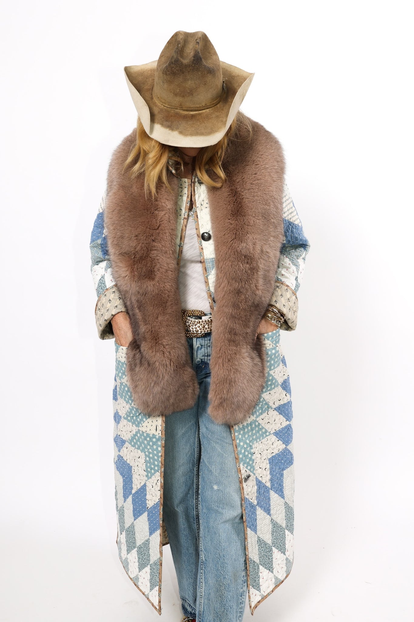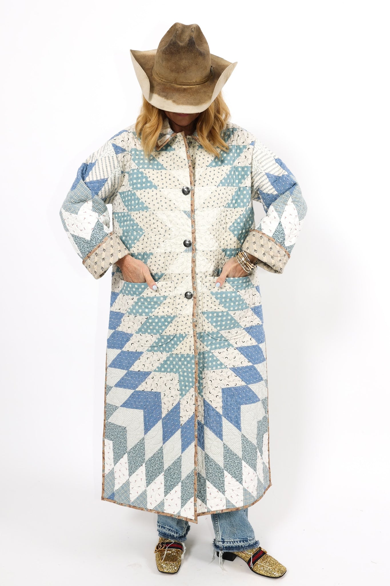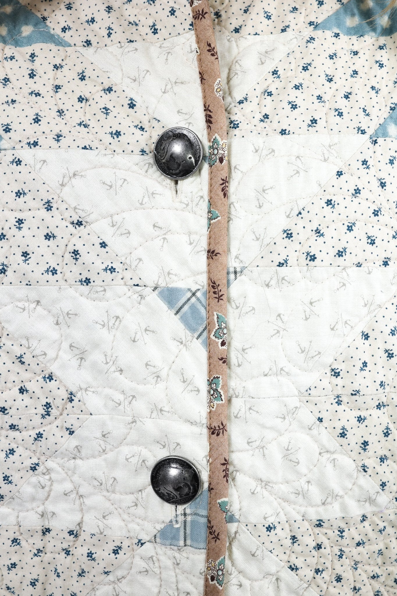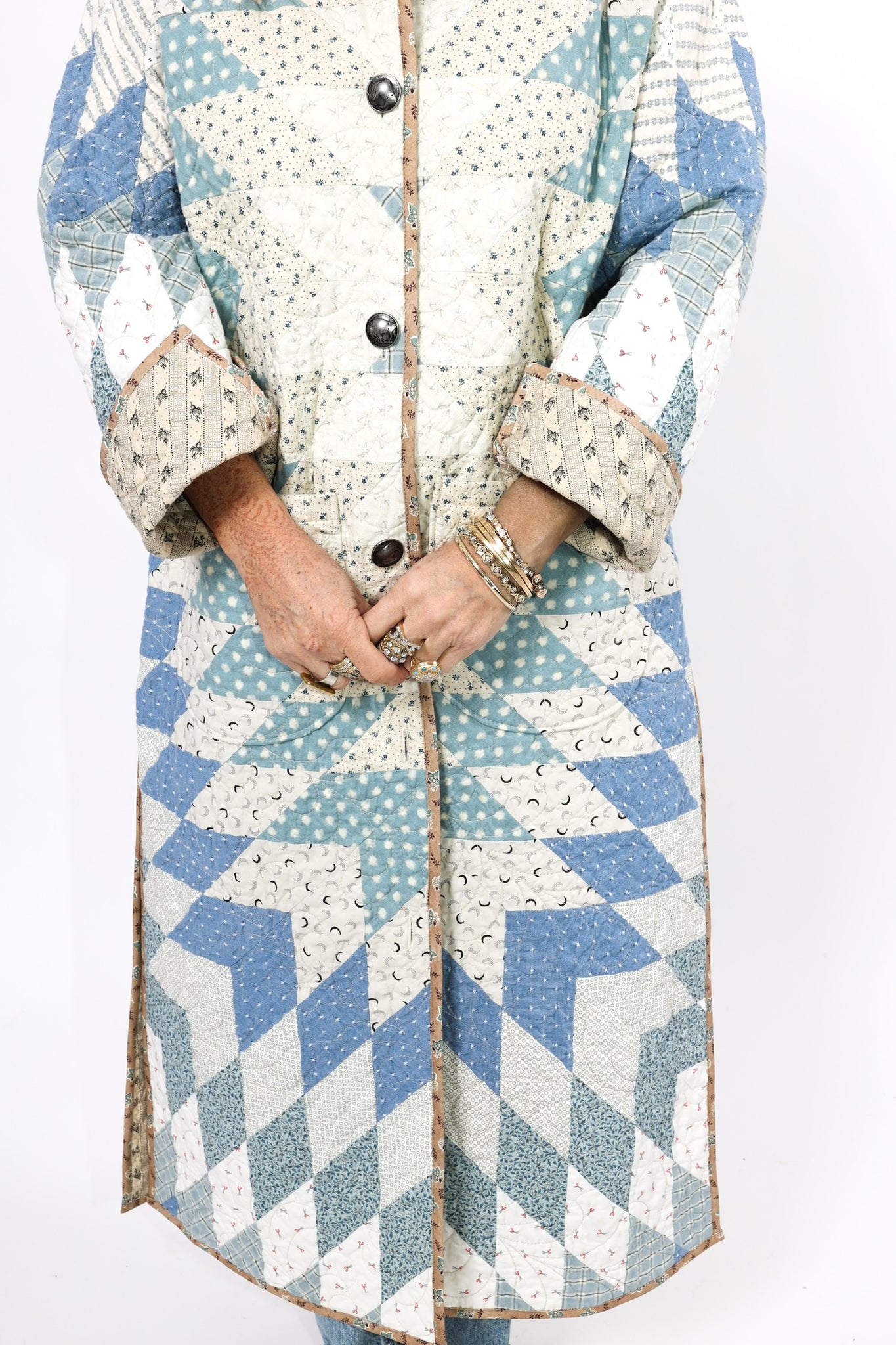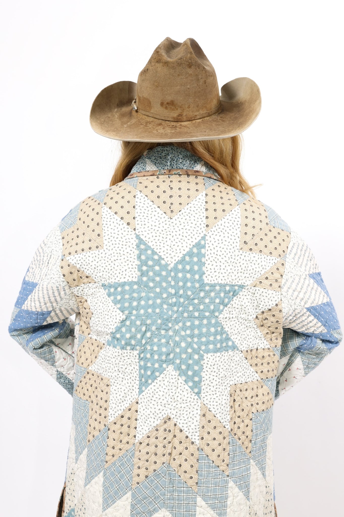 This is a Future heirloom and Lady Lancaster original design. It is part of her experiment of layering neutrals. It is loaded with novelty turn-of-the-century reproduction fabrics. It is a traditional Lone Star quilt pattern. This piece is both a workhorse and a show horse, meaning you don’t have to be careful with the fabrics or treat it like one of our antique jackets. In our opinion, the jacket is soft, thin, lightweight, and a dream to wear. For closures, we used faux silver buffalo nickel buttons. This is a Lady Lancaster 10/10! This piece would look great with a fur. We have added a few options with this listing. If you would like to add a fur, please reach out after purchasing. If you have further questions please direct message us and we are happy to send you a video.