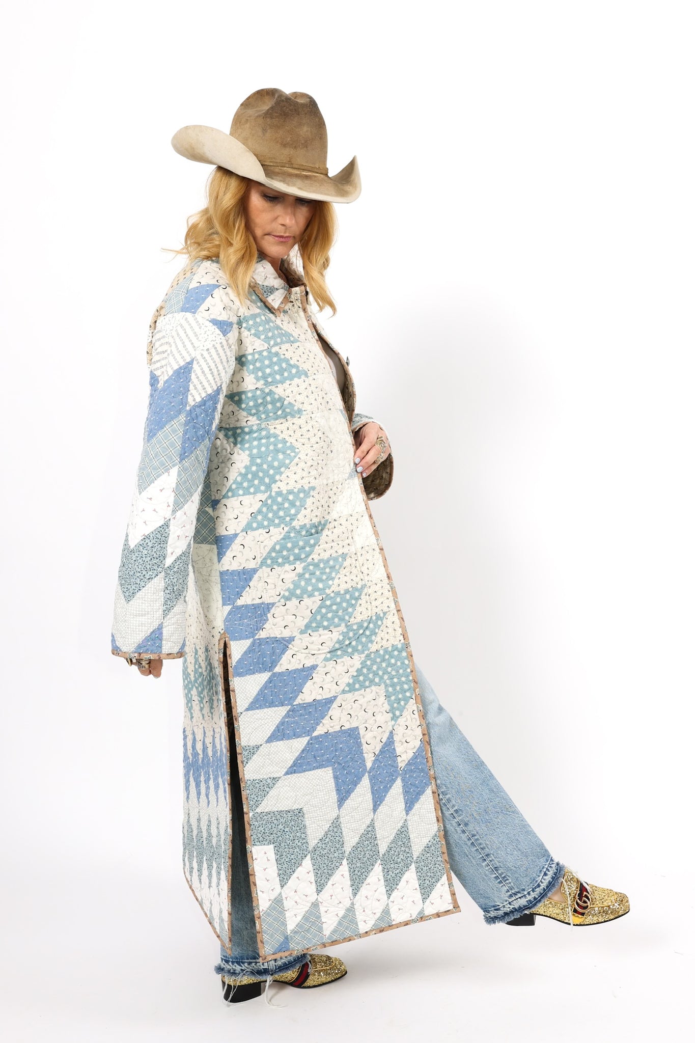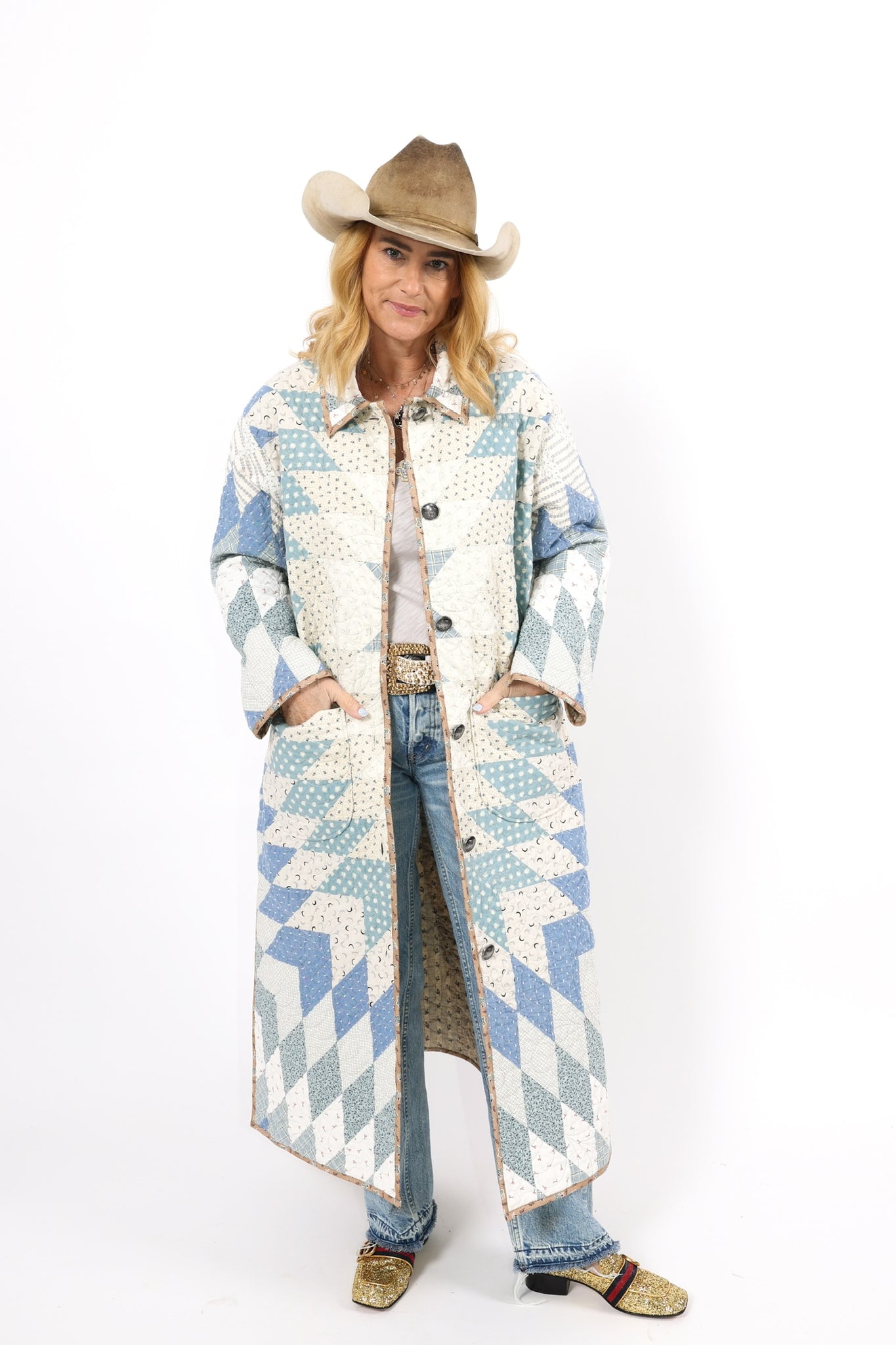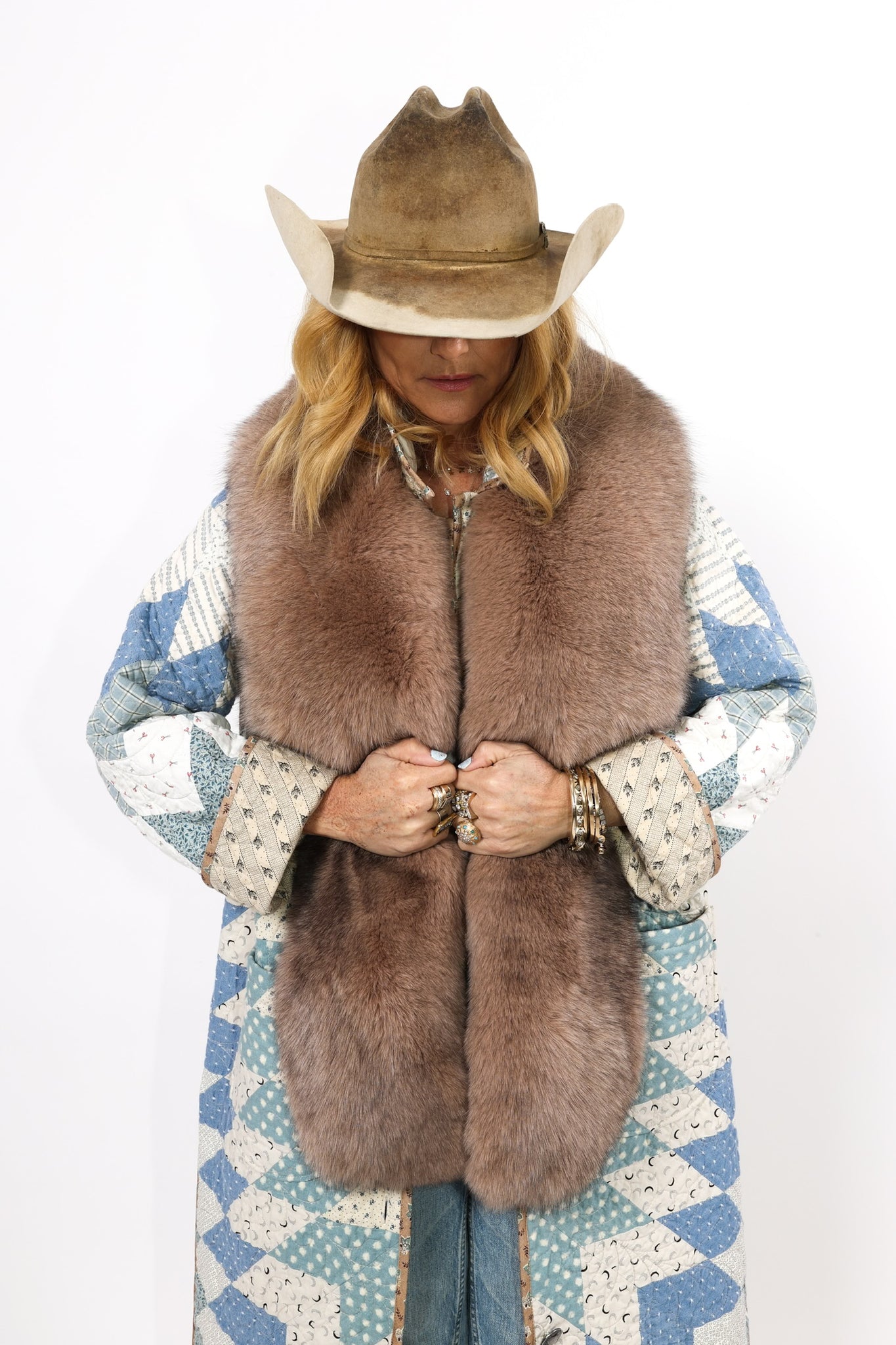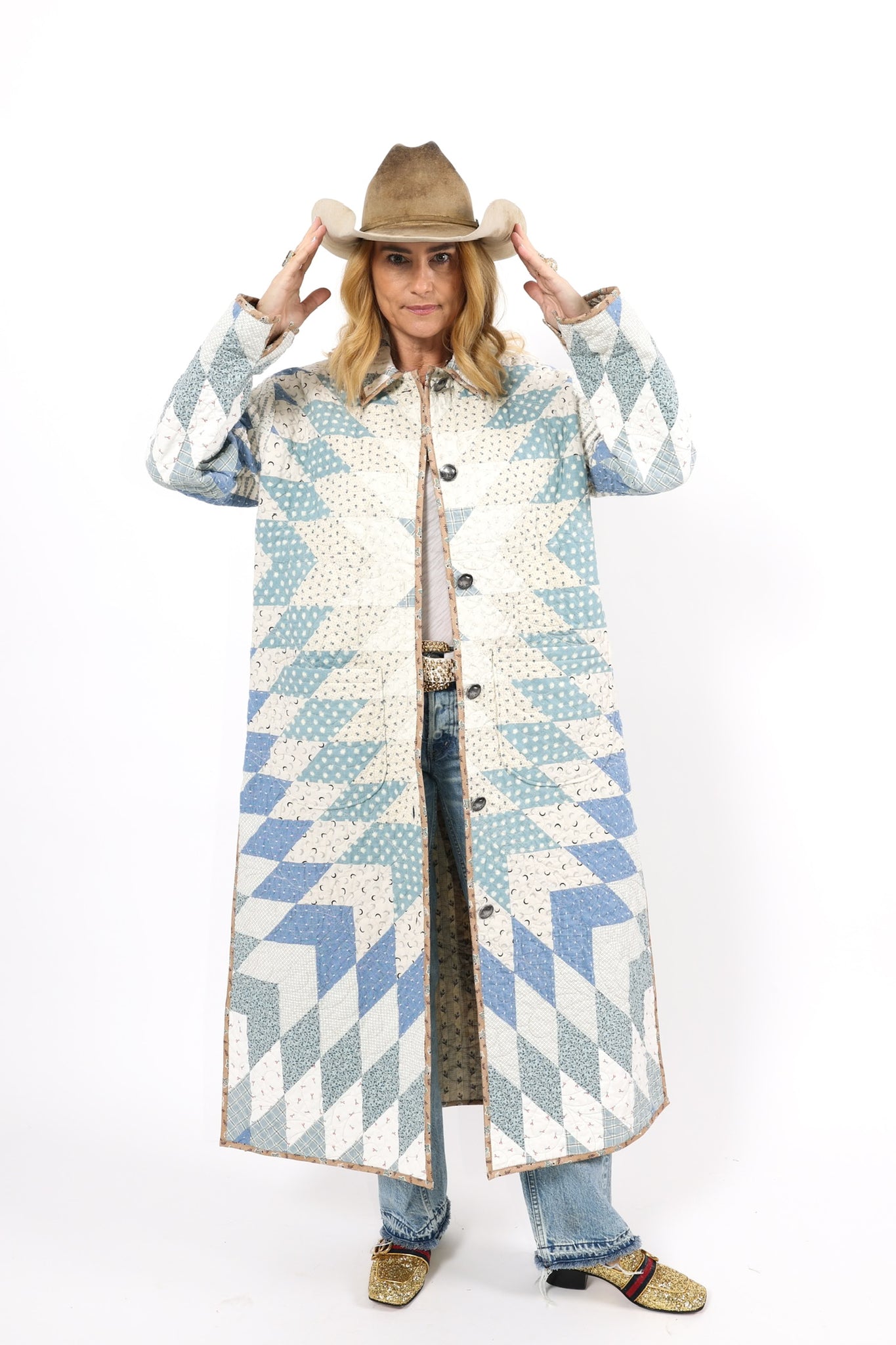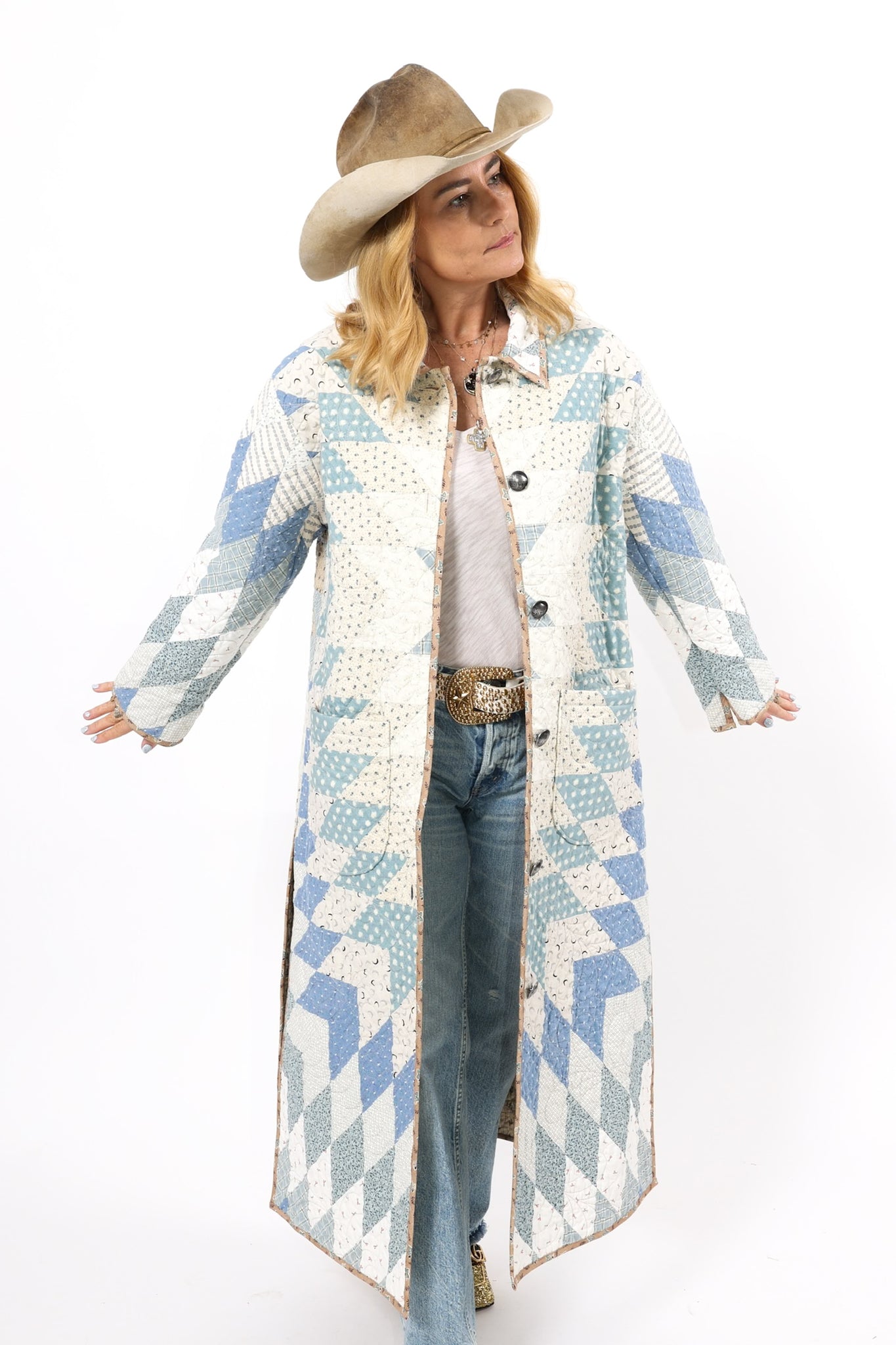 This is a Future heirloom and Lady Lancaster original design. It is part of her experiment of layering neutrals. It is loaded with novelty turn-of-the-century reproduction fabrics. It is a traditional Lone Star quilt pattern. This piece is both a workhorse and a show horse, meaning you don’t have to be careful with the fabrics or treat it like one of our antique jackets. In our opinion, the jacket is soft, thin, lightweight, and a dream to wear. For closures, we used faux silver buffalo nickel buttons. This is a Lady Lancaster 10/10! This piece would look great with a fur. We have added a few options with this listing. If you would like to add a fur, please reach out after purchasing. If you have further questions please direct message us and we are happy to send you a video.