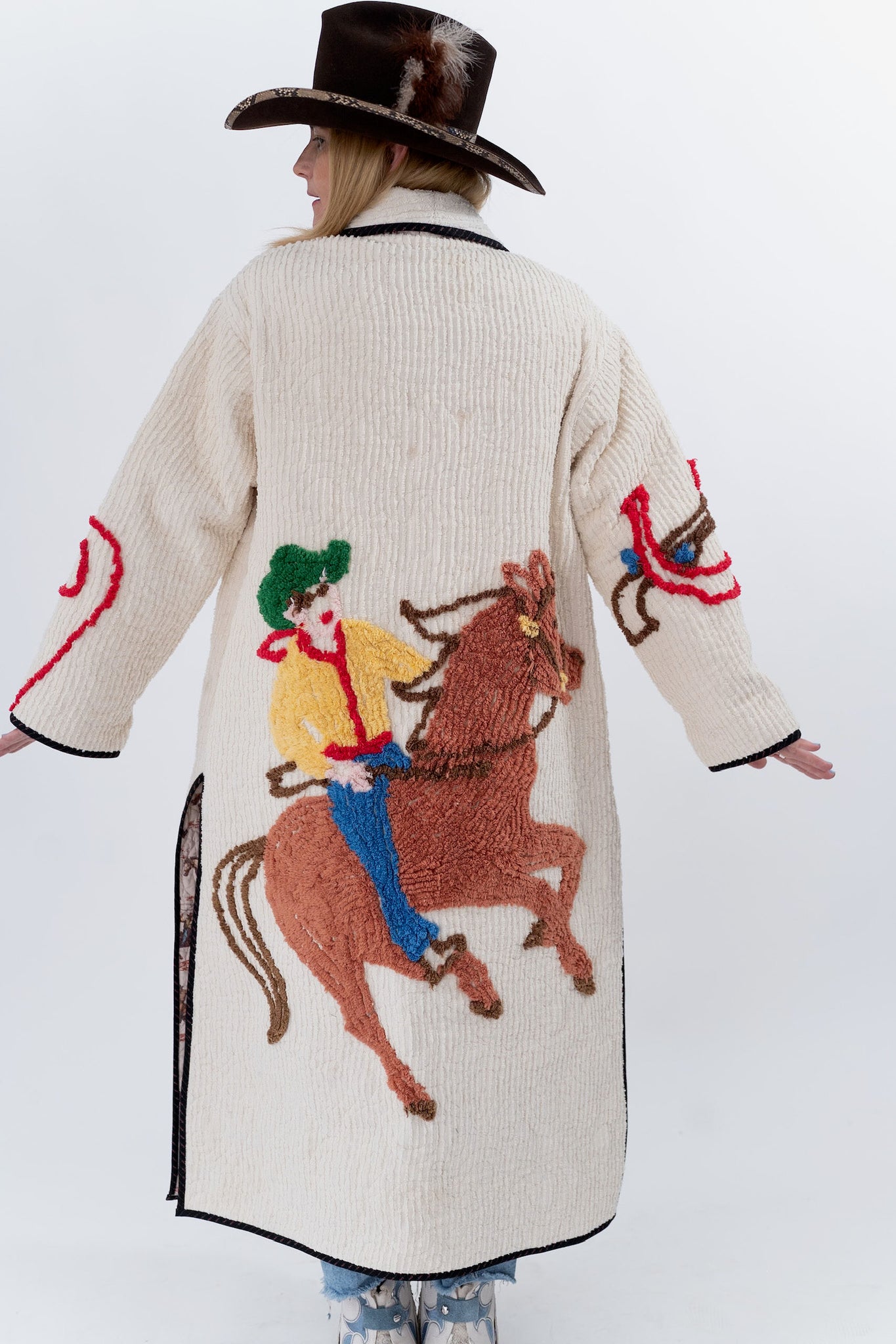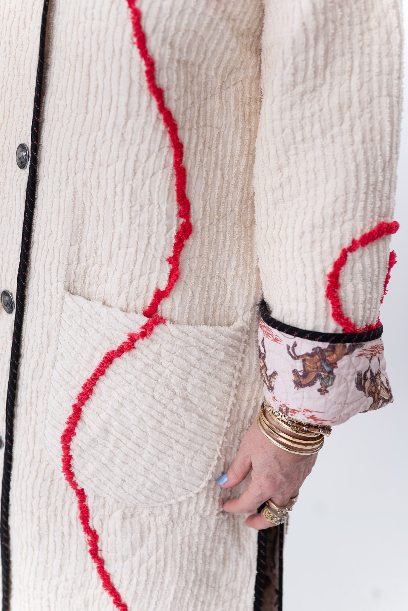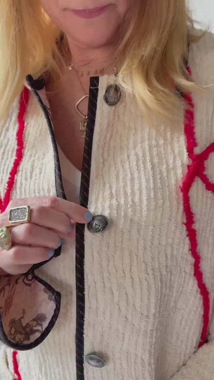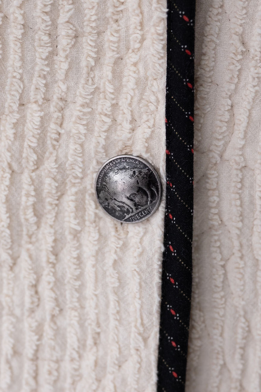 This quilt is a combination of a western chenille bedspread from the midcentury and cowboy fabric. The chenille was most likely beloved by a little boy and we love giving this textile a second life! For closures we used faux silver buffalo nickel buttons. In our opinion, the jacket is really soft, thin, lightweight, has very little to no loft (puffiness), and has a beautiful and great drape. Please note there are a few zig zag mends on the back that we have tried to capture in photographs. If you have further questions please direct message us and we are happy to send you a video.