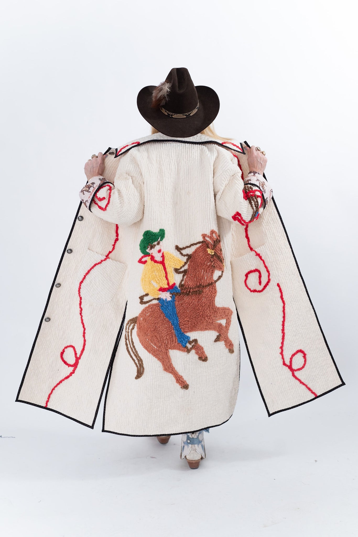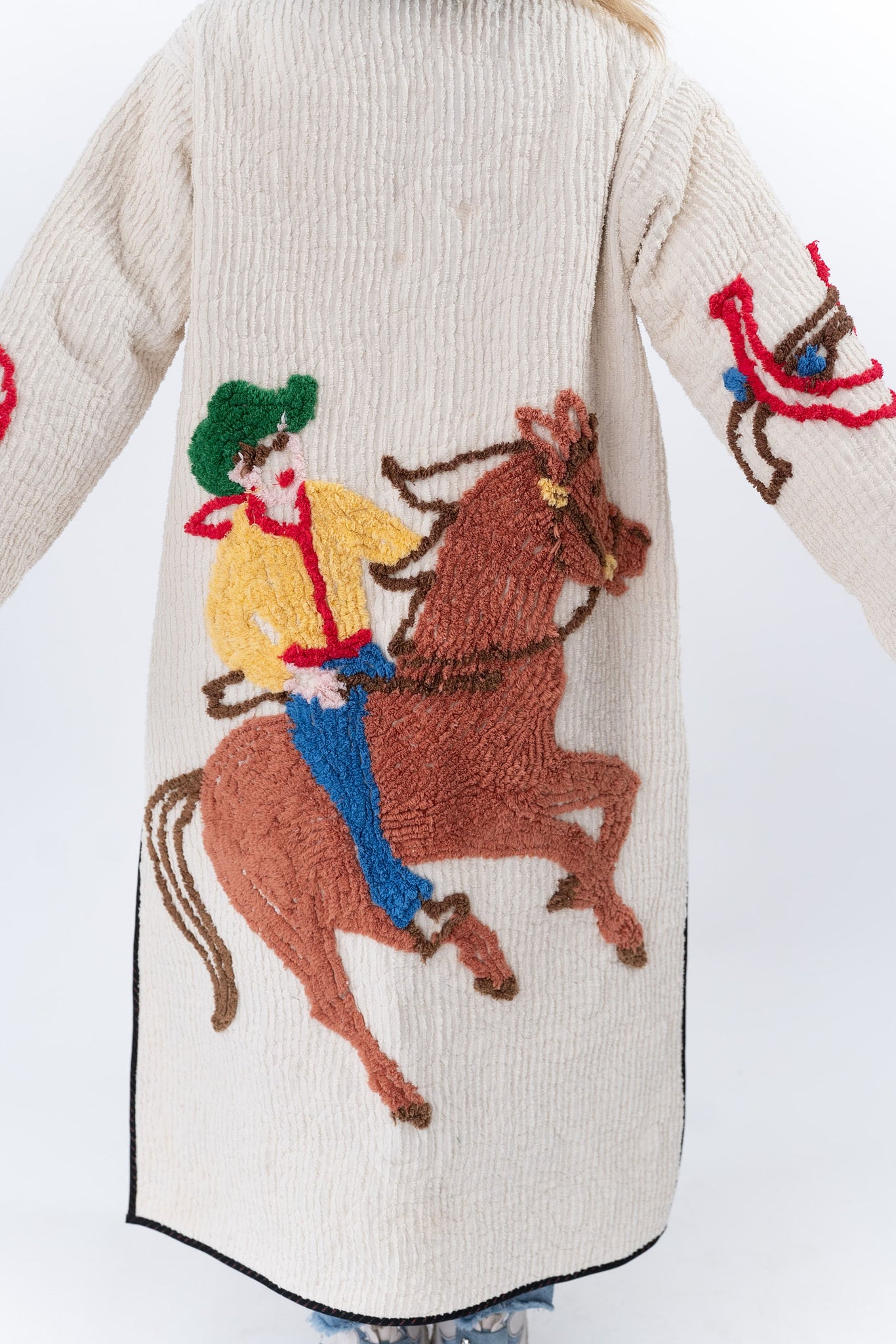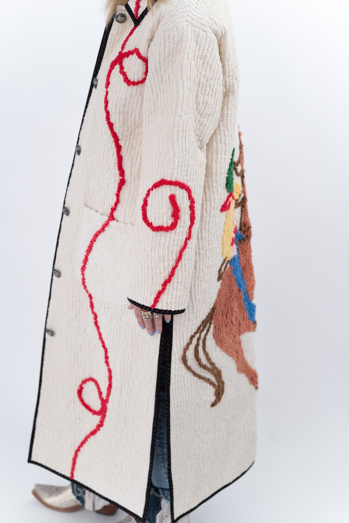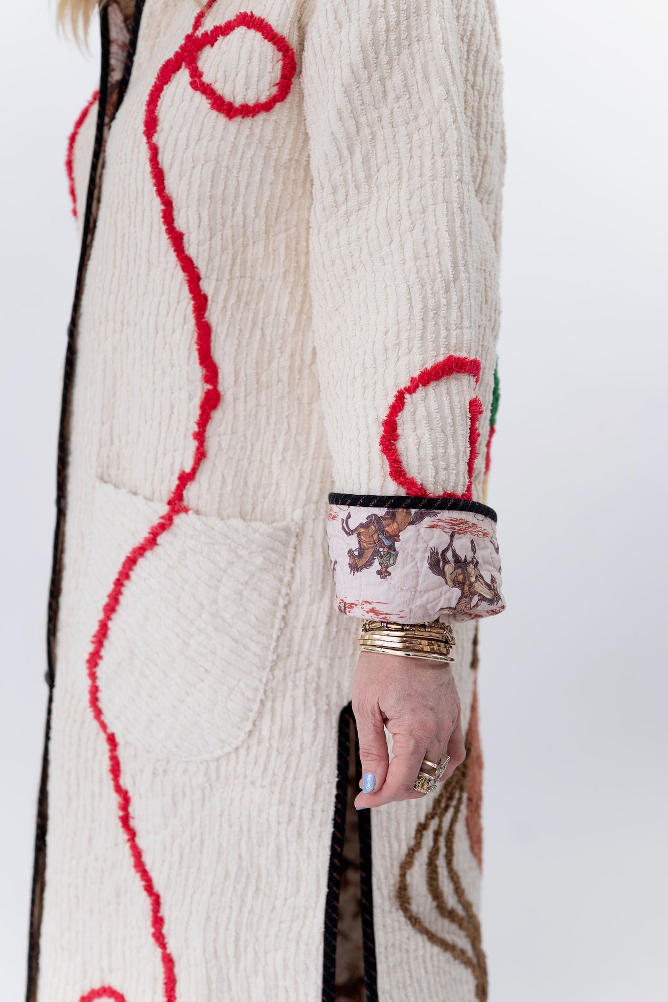 This quilt is a combination of a western chenille bedspread from the midcentury and cowboy fabric. The chenille was most likely beloved by a little boy and we love giving this textile a second life! For closures we used faux silver buffalo nickel buttons. In our opinion, the jacket is really soft, thin, lightweight, has very little to no loft (puffiness), and has a beautiful and great drape. Please note there are a few zig zag mends on the back that we have tried to capture in photographs. If you have further questions please direct message us and we are happy to send you a video.