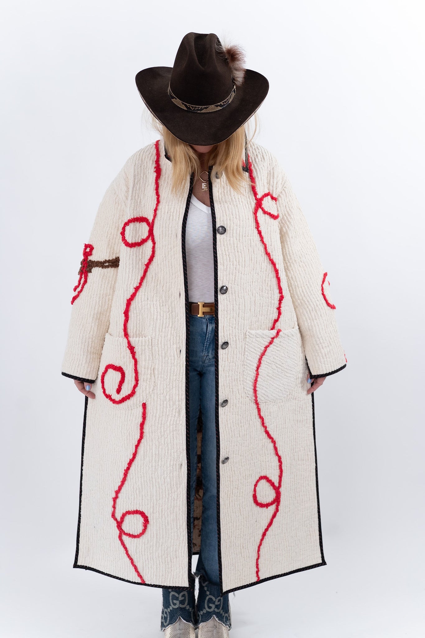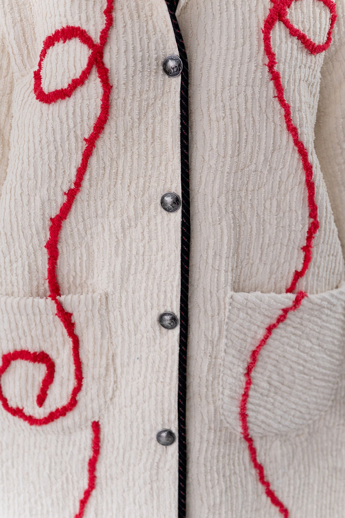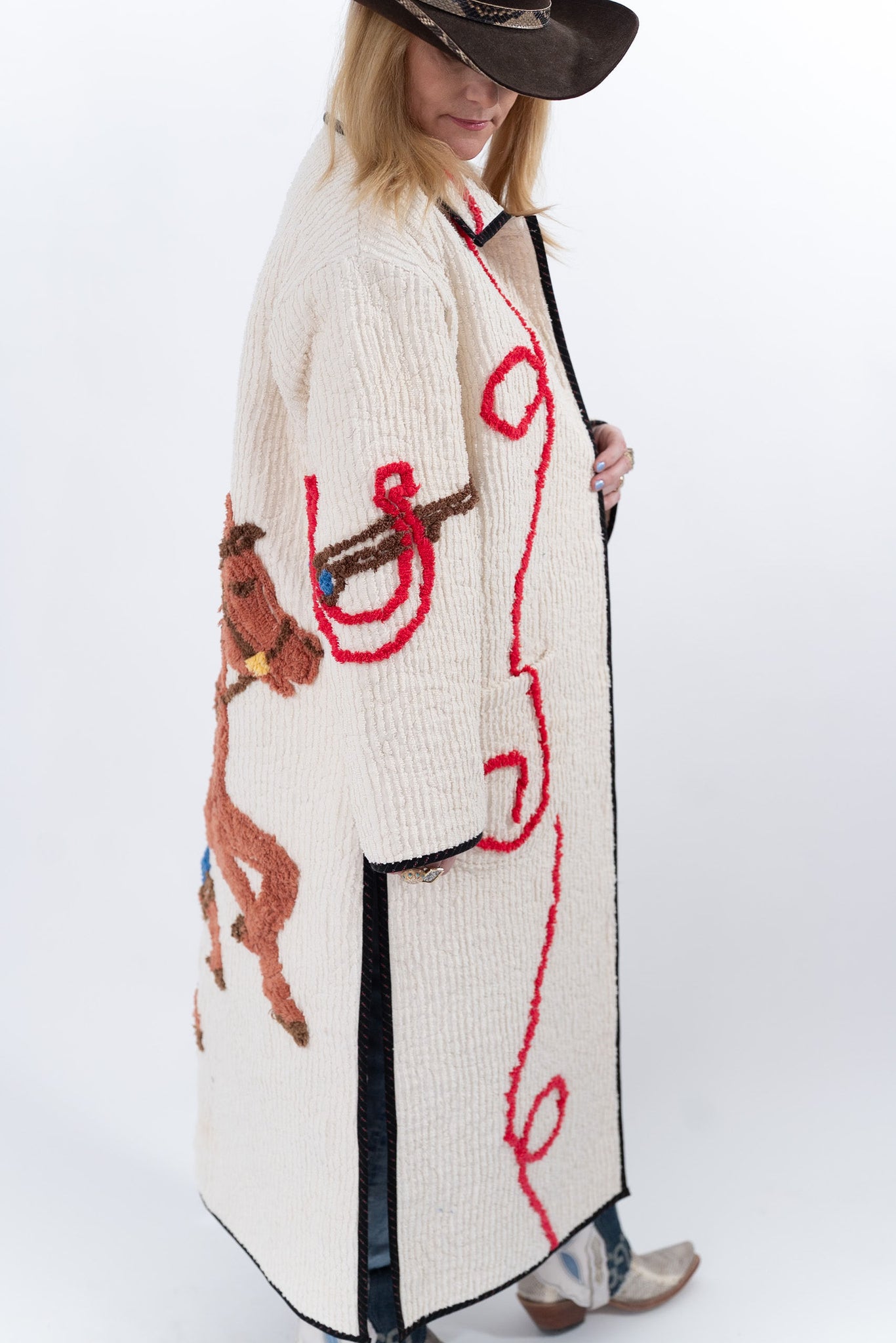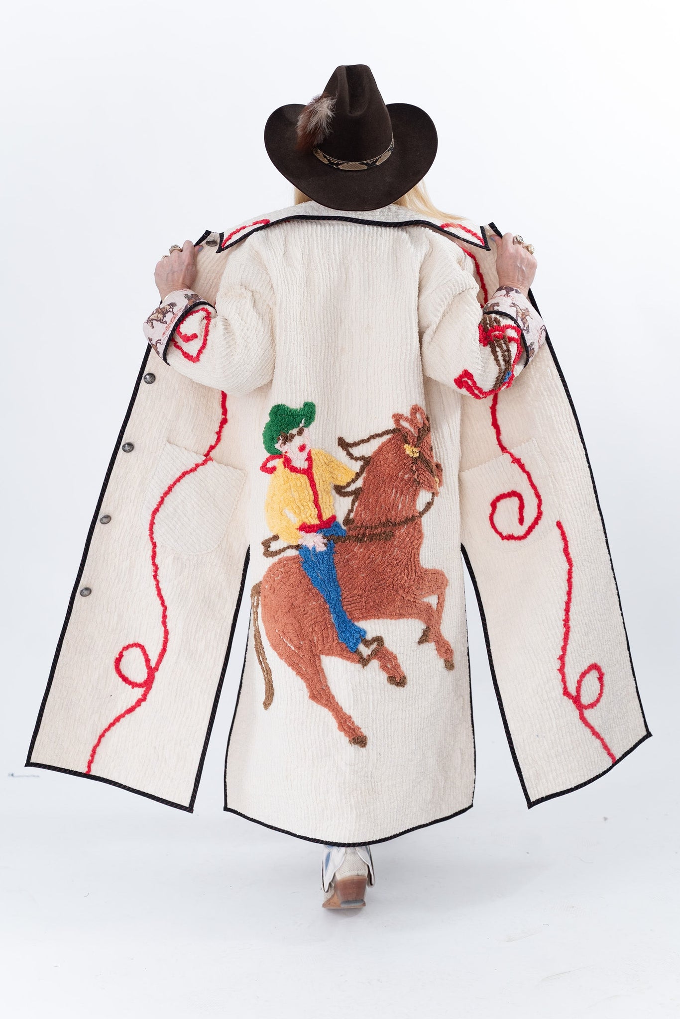 This quilt is a combination of a western chenille bedspread from the midcentury and cowboy fabric. The chenille was most likely beloved by a little boy and we love giving this textile a second life! For closures we used faux silver buffalo nickel buttons. In our opinion, the jacket is really soft, thin, lightweight, has very little to no loft (puffiness), and has a beautiful and great drape. Please note there are a few zig zag mends on the back that we have tried to capture in photographs. If you have further questions please direct message us and we are happy to send you a video.
