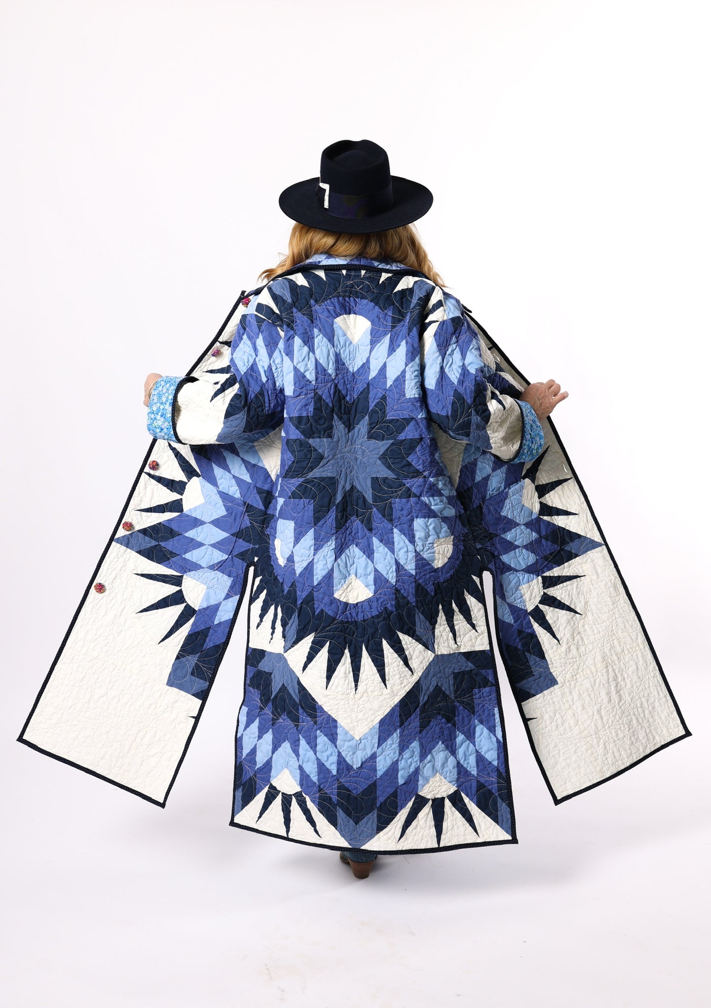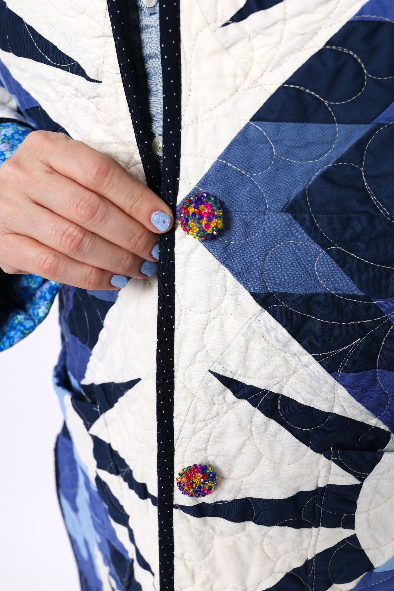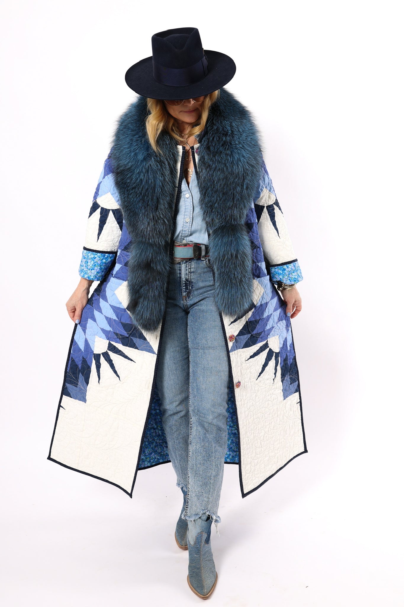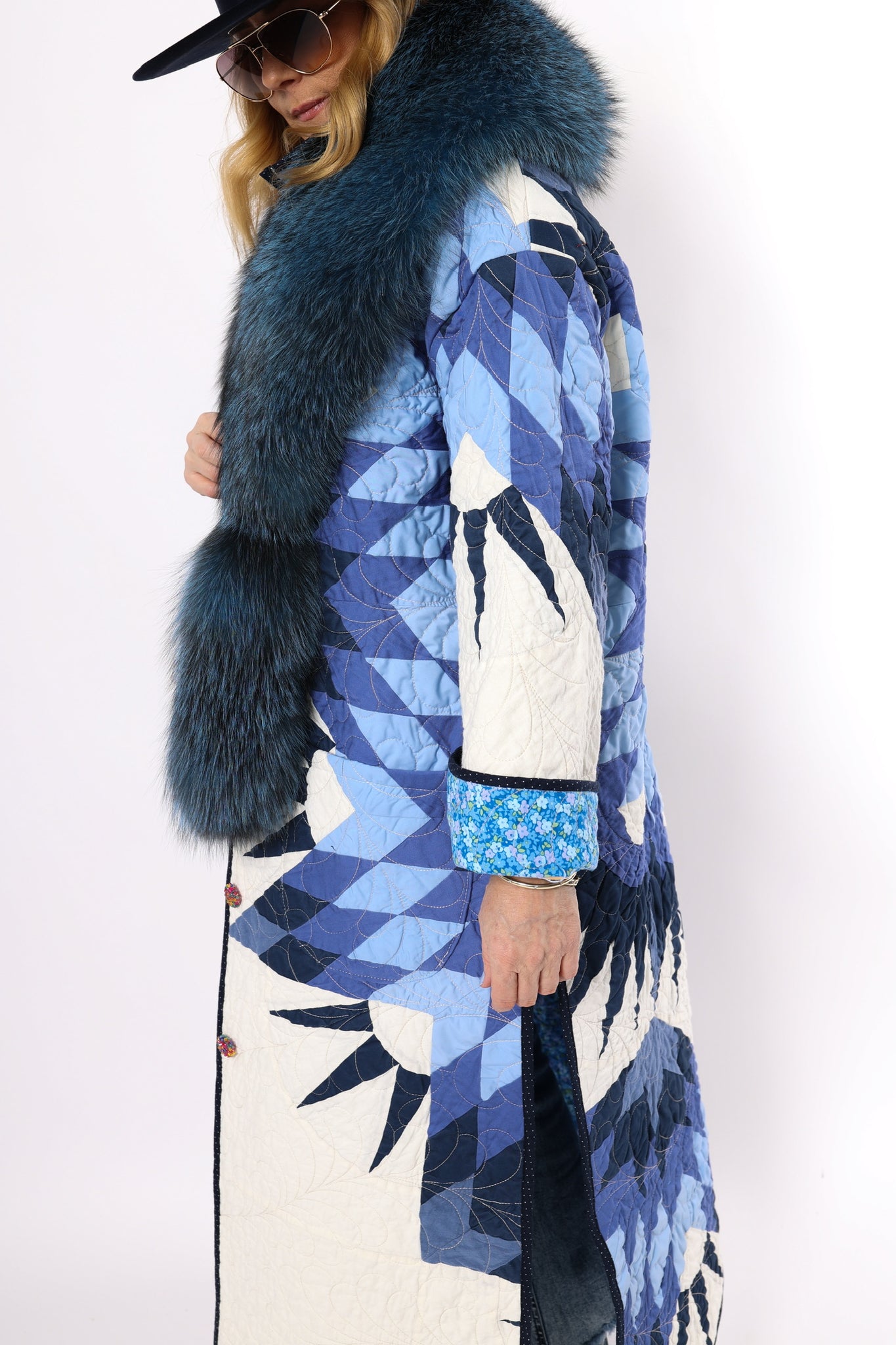 This is a contemporary American quilt top. It is an Elevated Broken Star quilt pattern. To complete the quilt, we backed the top with blue and lavender calico fabric. This adds great depth and character to the design. You will want to cuff the sleeves to show this off. For closures, we used beaded buttons from India. In our opinion, the jacket is thin, lightweight, and has a great drape. The jacket is very flattering to wear. We think this piece looks great with a fur, and have photographed one of our favorite options. Please reach out after purchasing if you would like to add a fur. This piece is a work horse and a show pony! If you have further questions please direct message us and we are happy to send you a video.