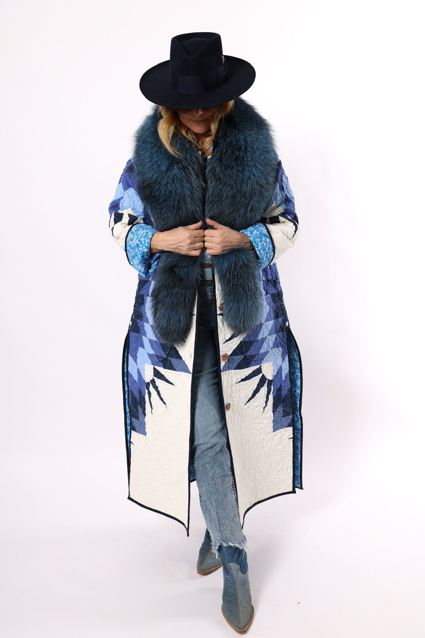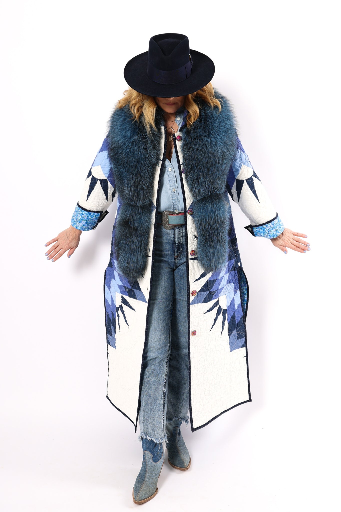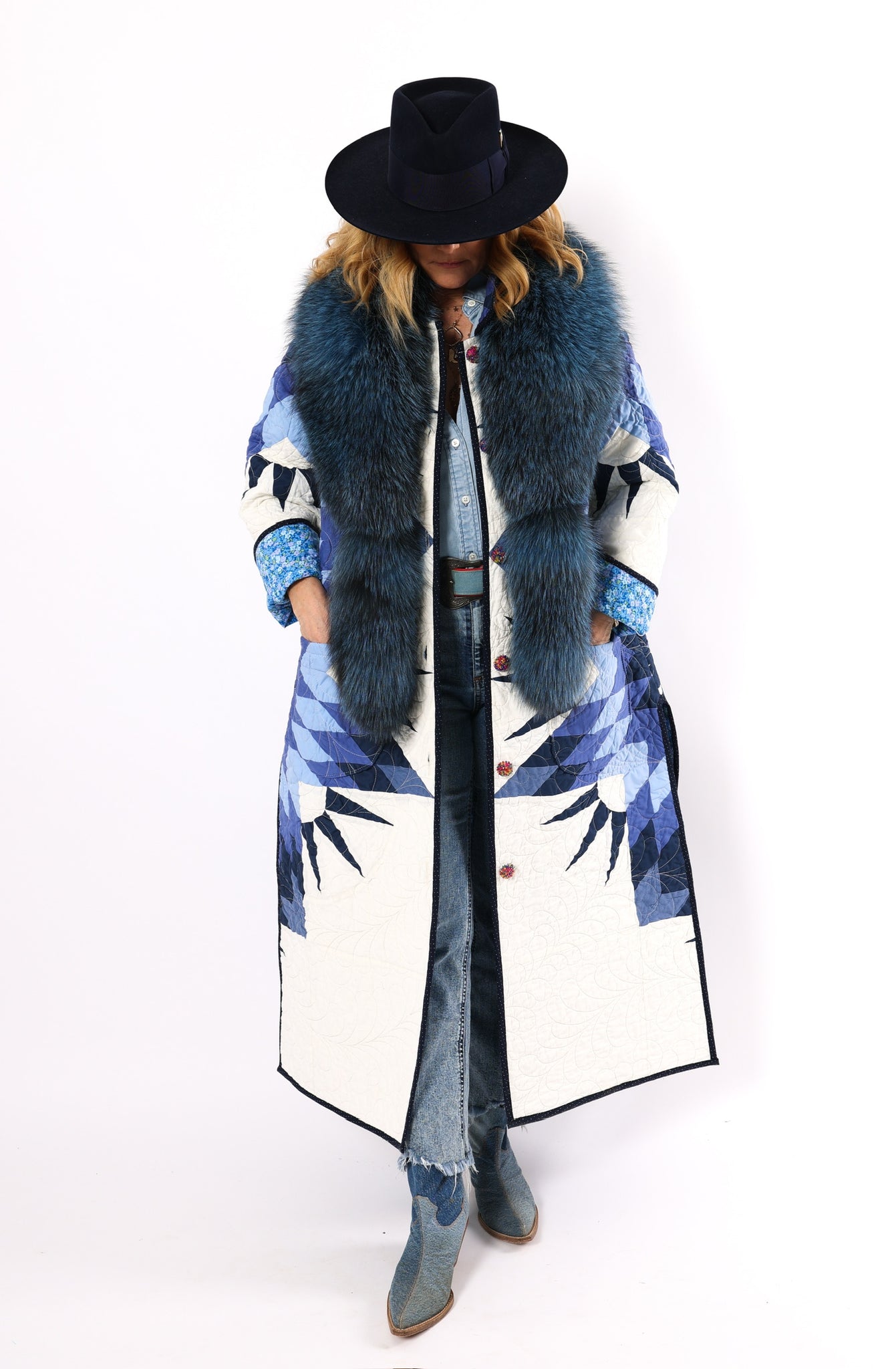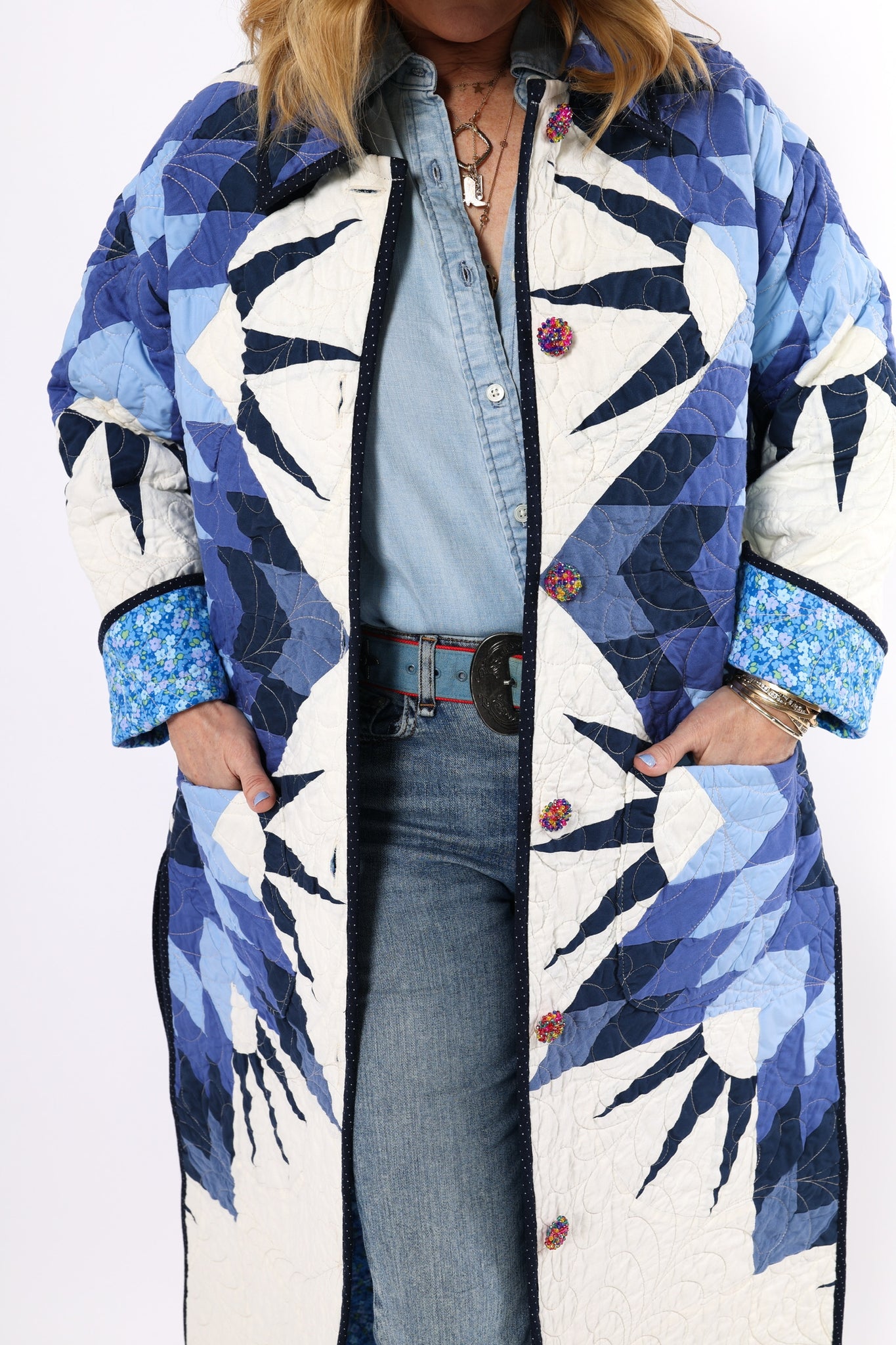 This is a contemporary American quilt top. It is an Elevated Broken Star quilt pattern. To complete the quilt, we backed the top with blue and lavender calico fabric. This adds great depth and character to the design. You will want to cuff the sleeves to show this off. For closures, we used beaded buttons from India. In our opinion, the jacket is thin, lightweight, and has a great drape. The jacket is very flattering to wear. We think this piece looks great with a fur, and have photographed one of our favorite options. Please reach out after purchasing if you would like to add a fur. This piece is a work horse and a show pony! If you have further questions please direct message us and we are happy to send you a video.