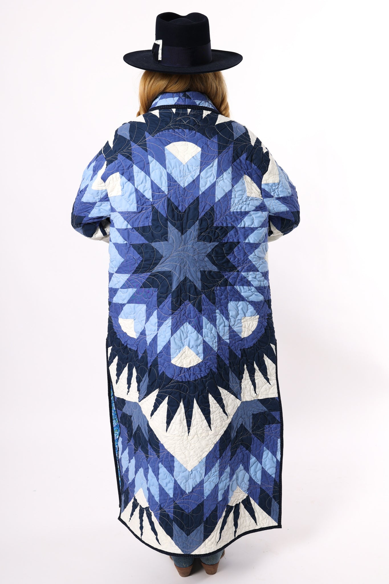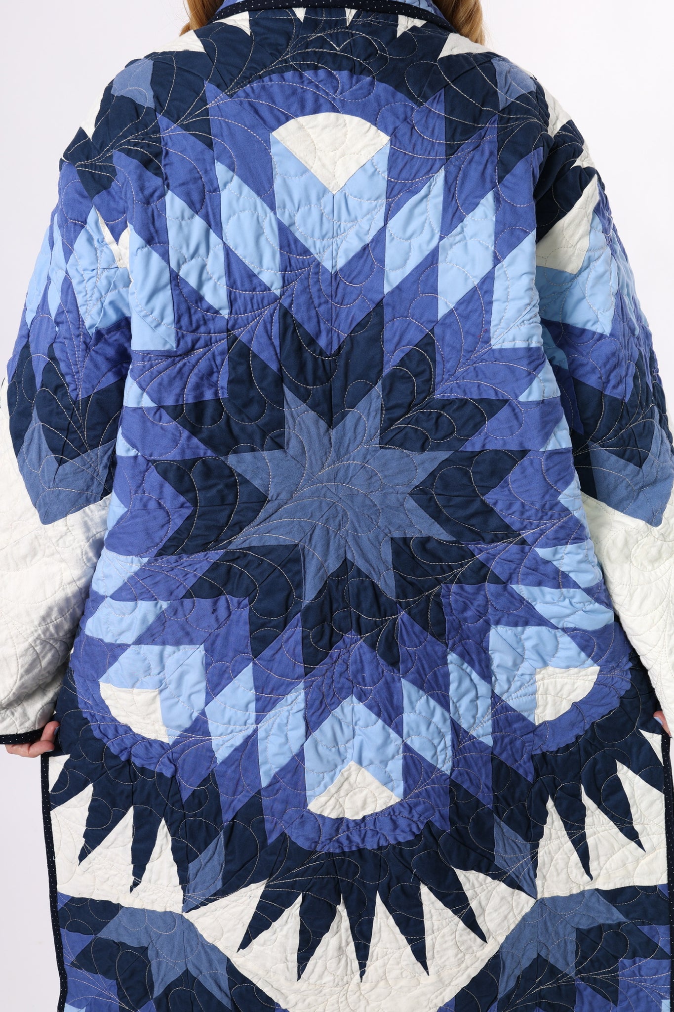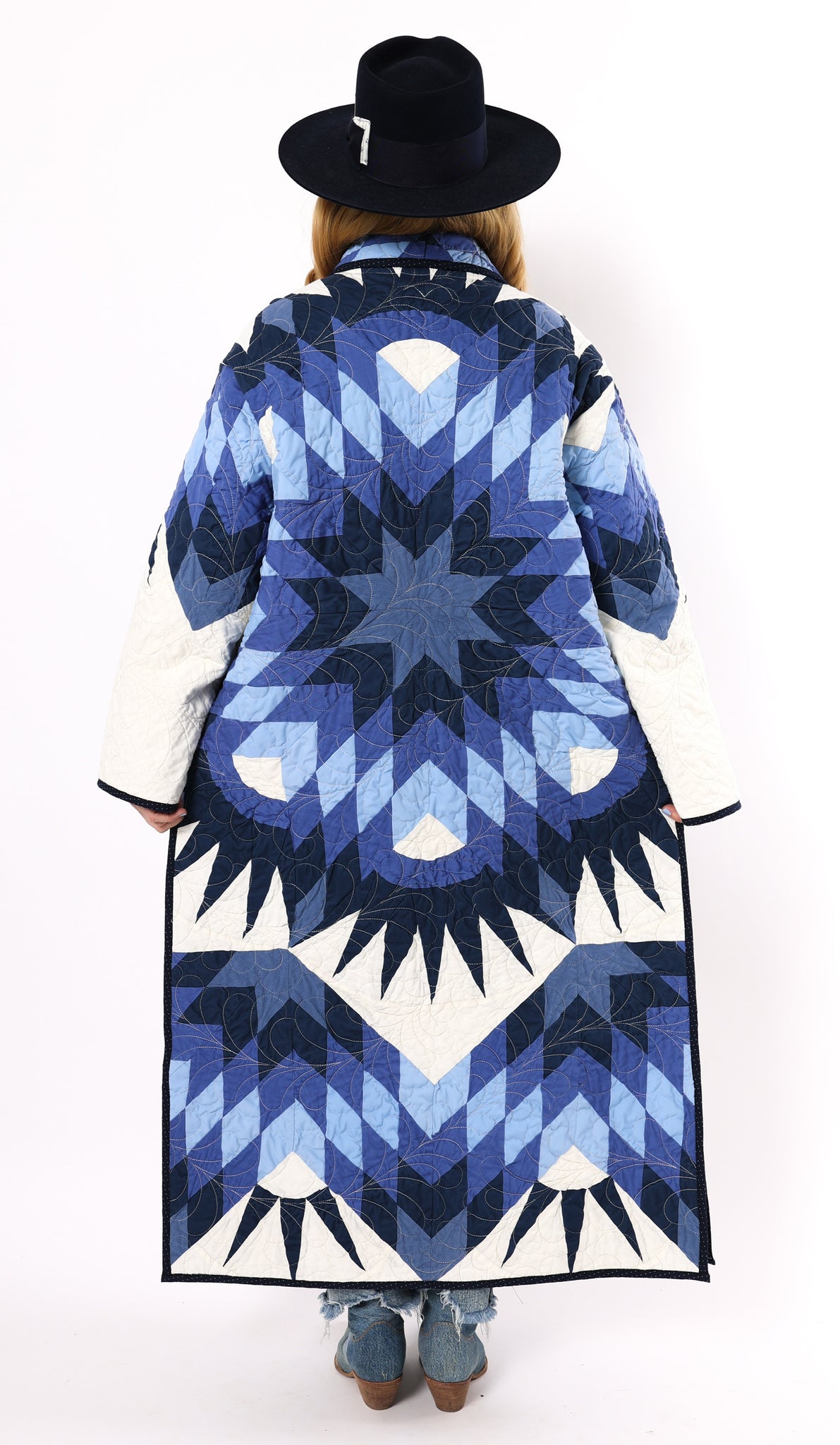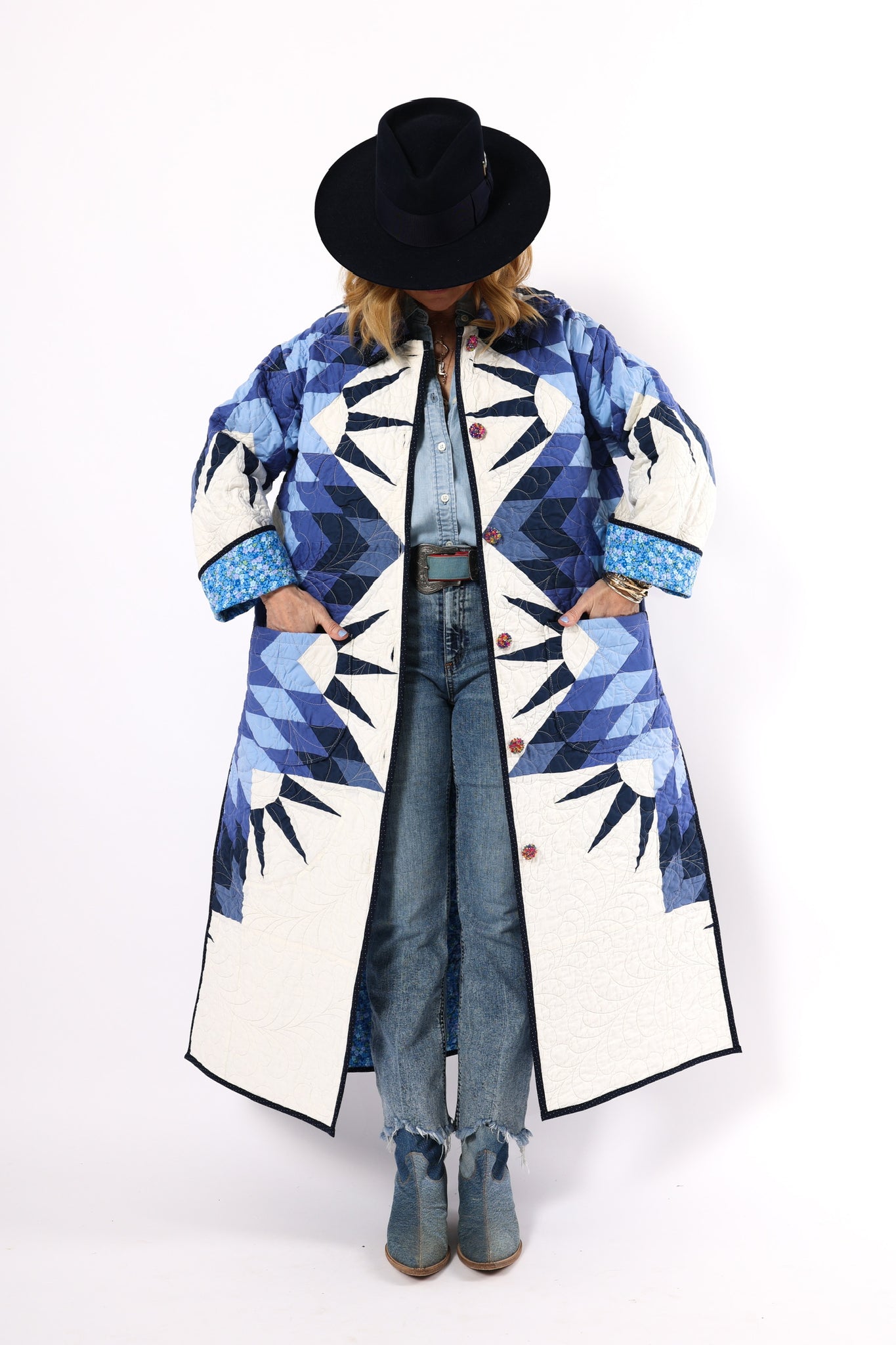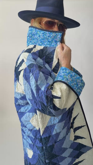 This is a contemporary American quilt top. It is an Elevated Broken Star quilt pattern. To complete the quilt, we backed the top with blue and lavender calico fabric. This adds great depth and character to the design. You will want to cuff the sleeves to show this off. For closures, we used beaded buttons from India. In our opinion, the jacket is thin, lightweight, and has a great drape. The jacket is very flattering to wear. We think this piece looks great with a fur, and have photographed one of our favorite options. Please reach out after purchasing if you would like to add a fur. This piece is a work horse and a show pony! If you have further questions please direct message us and we are happy to send you a video.