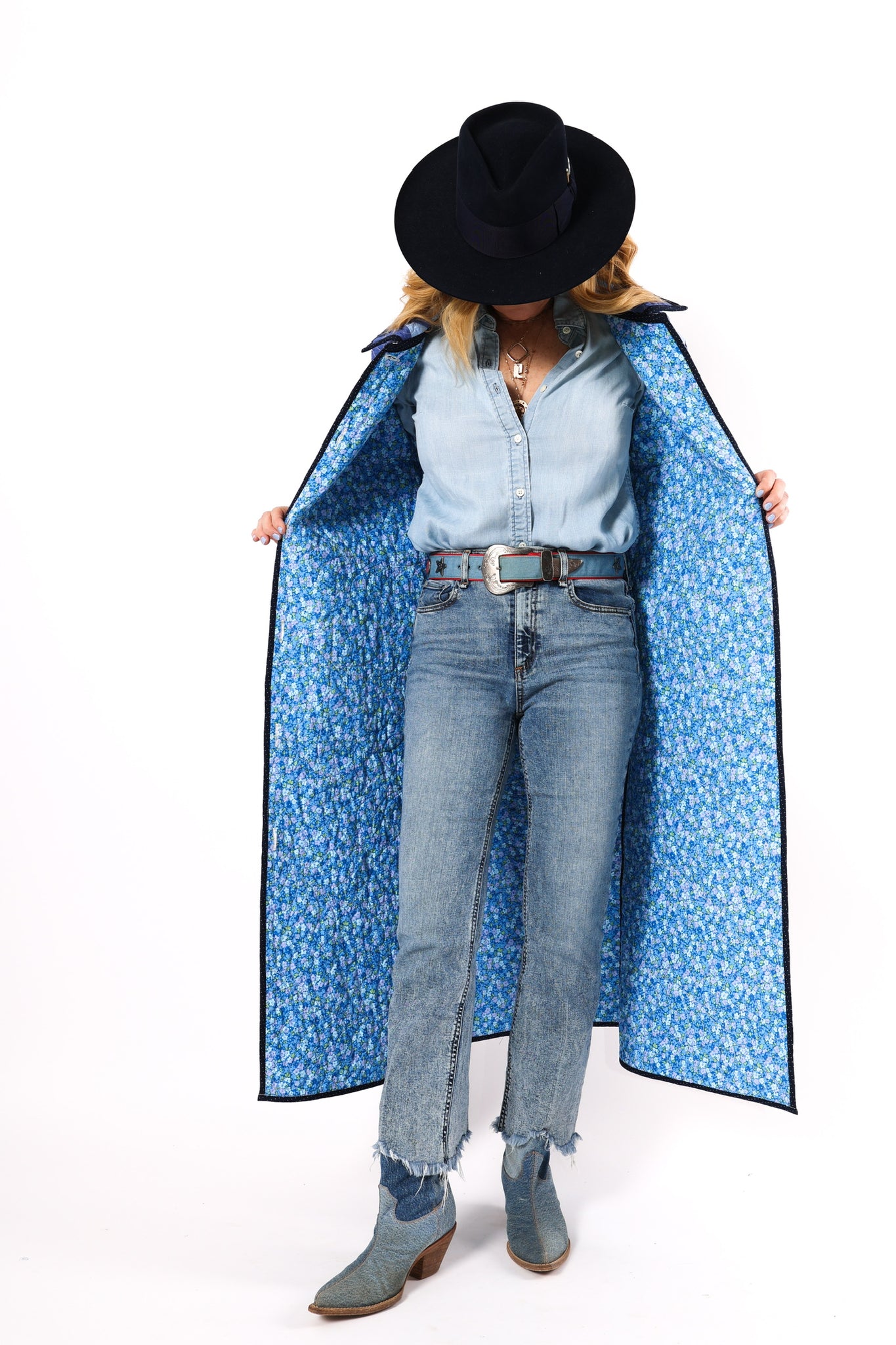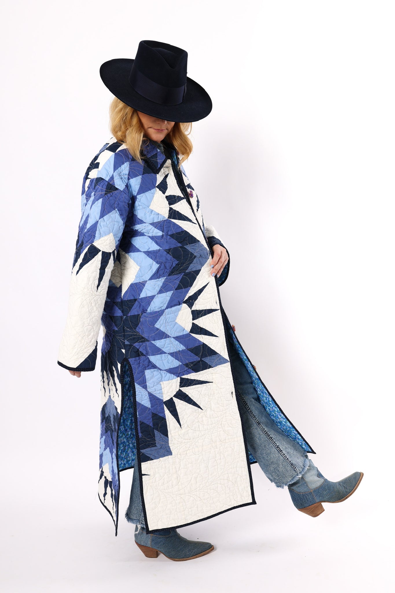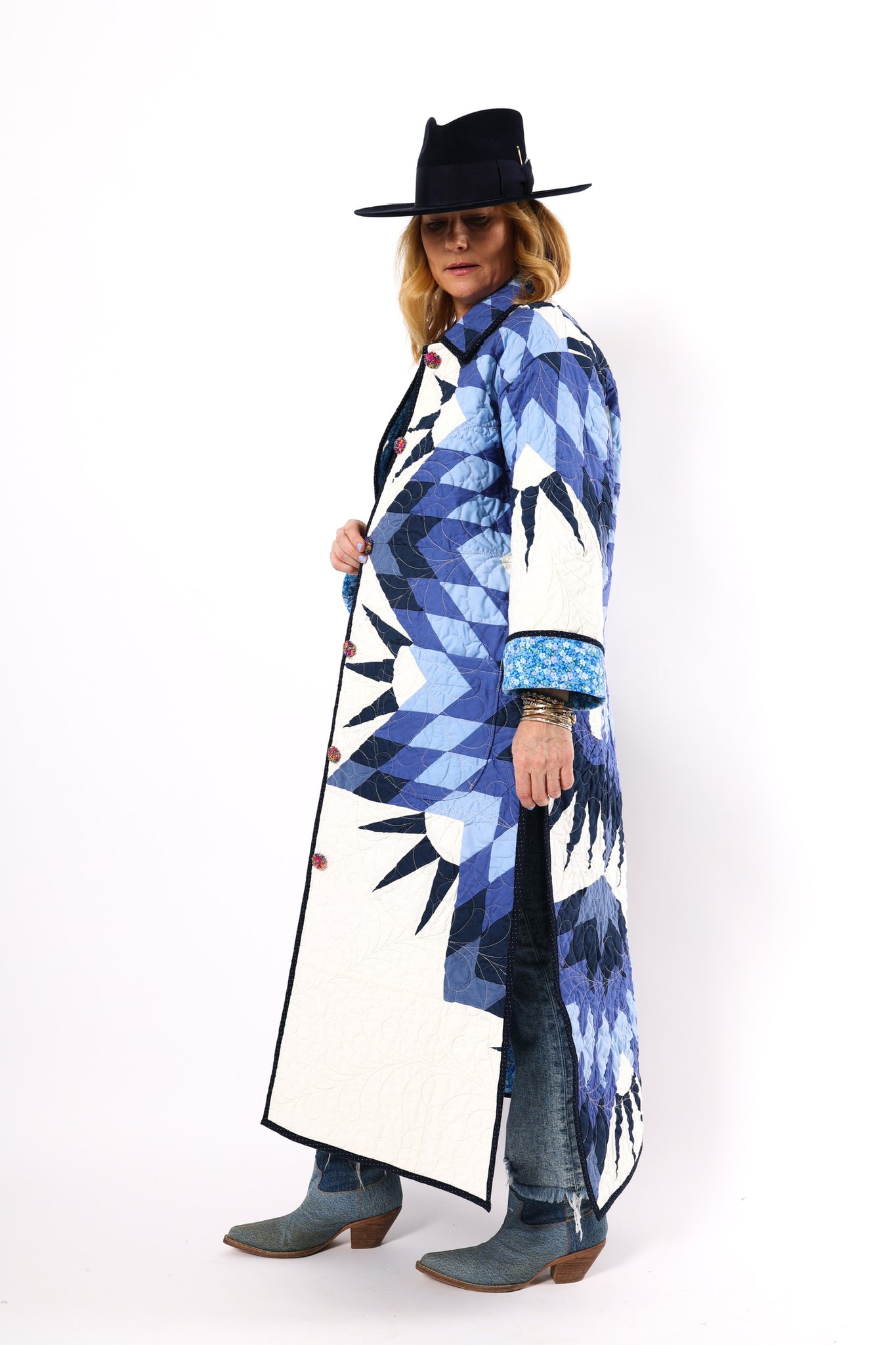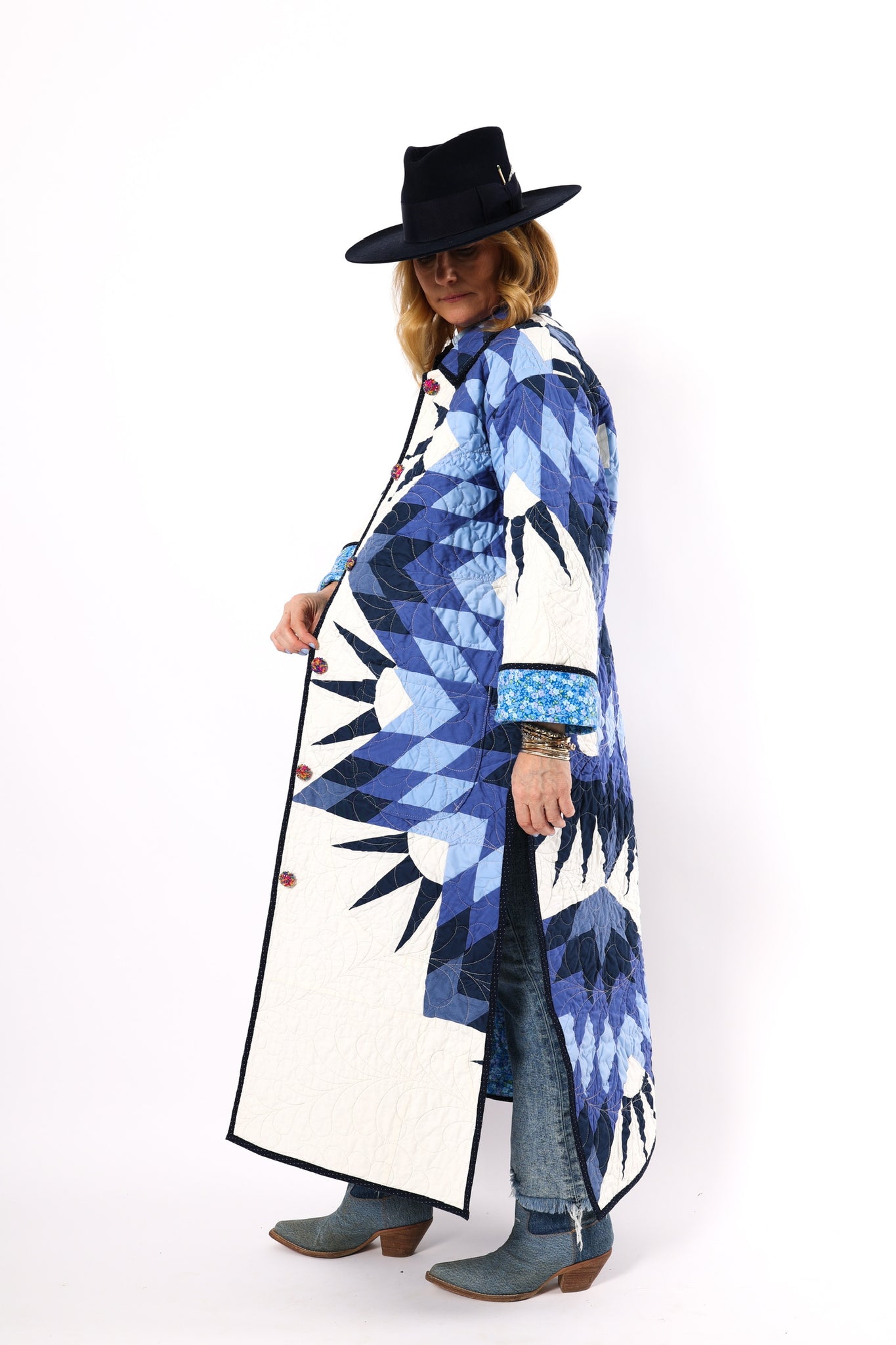 This is a contemporary American quilt top. It is an Elevated Broken Star quilt pattern. To complete the quilt, we backed the top with blue and lavender calico fabric. This adds great depth and character to the design. You will want to cuff the sleeves to show this off. For closures, we used beaded buttons from India. In our opinion, the jacket is thin, lightweight, and has a great drape. The jacket is very flattering to wear. We think this piece looks great with a fur, and have photographed one of our favorite options. Please reach out after purchasing if you would like to add a fur. This piece is a work horse and a show pony! If you have further questions please direct message us and we are happy to send you a video.