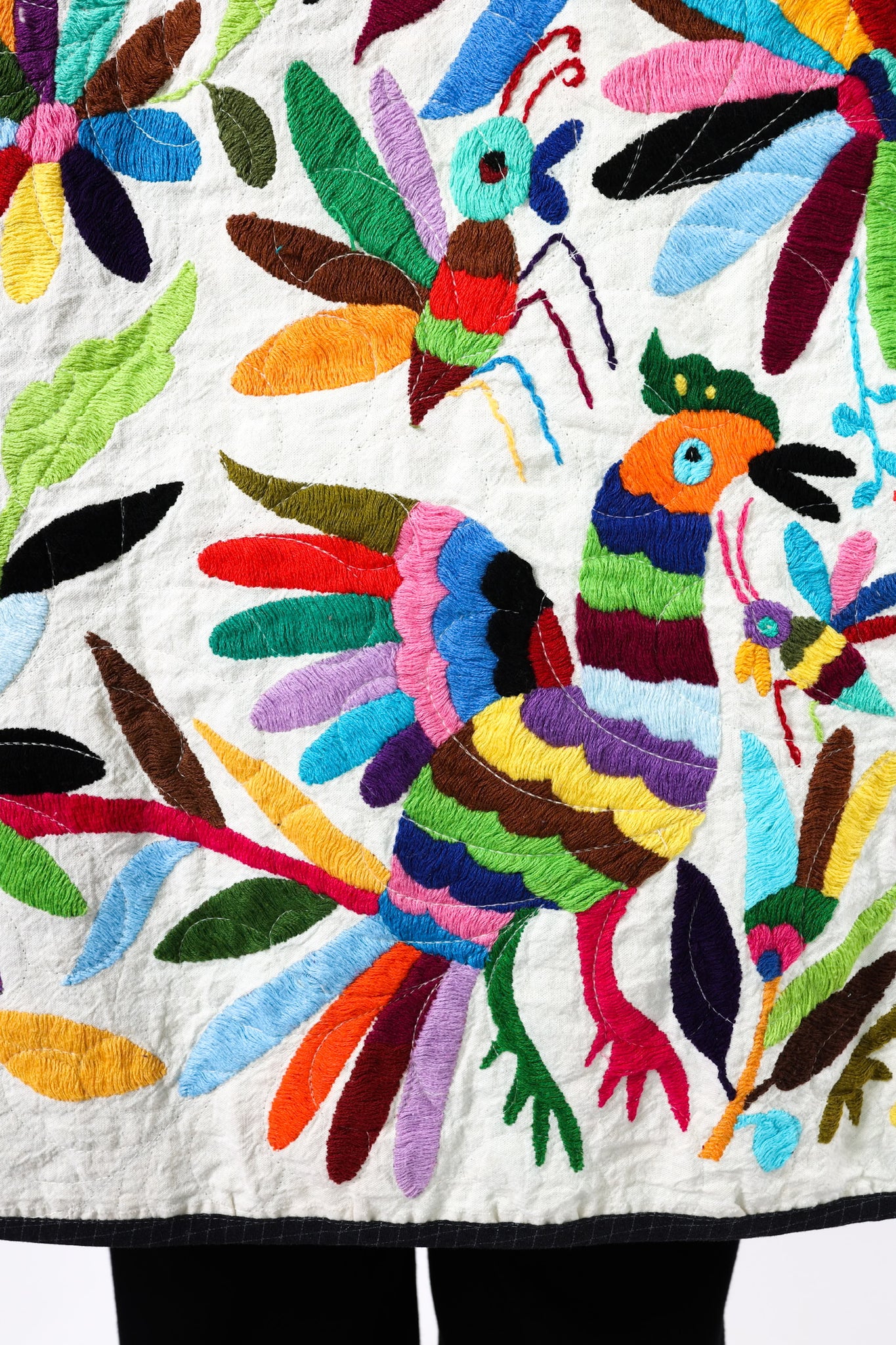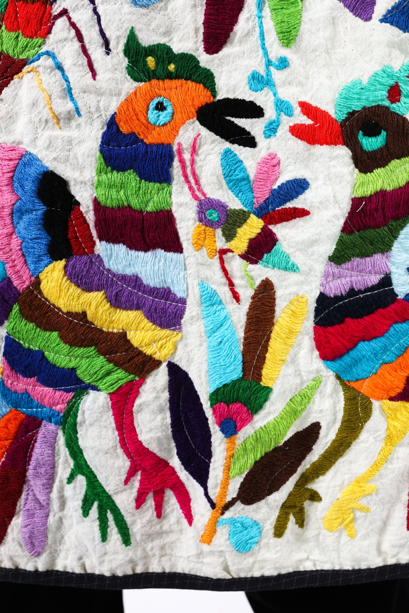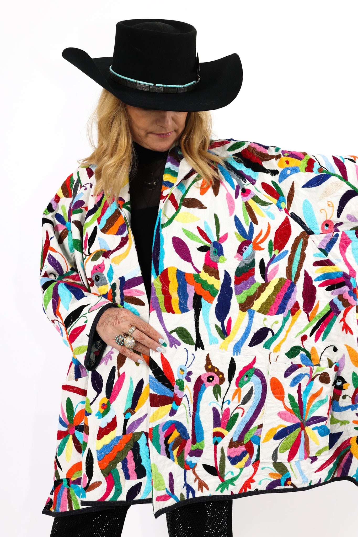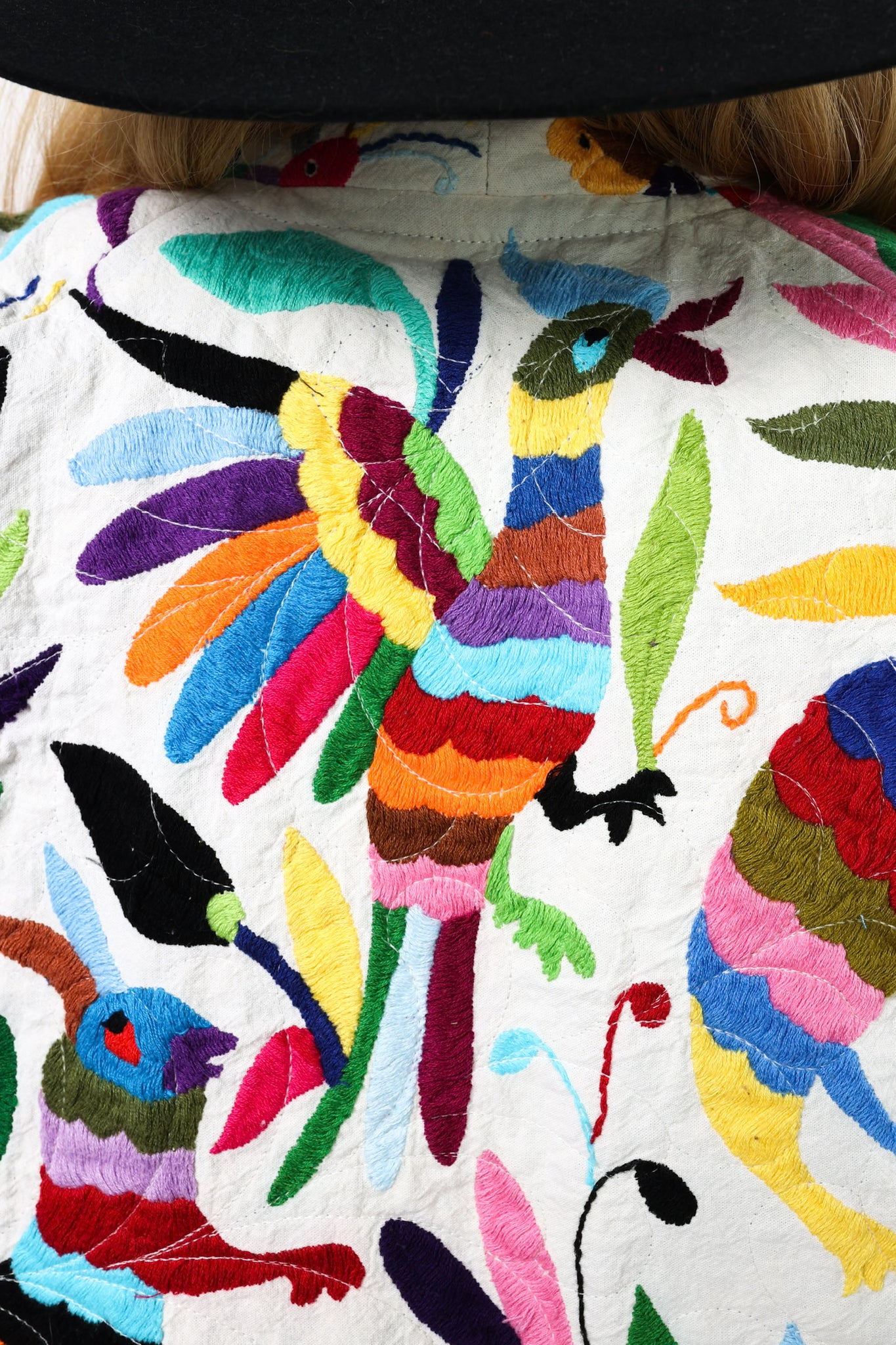 This is a hand embroidered Otomi from San Miguel, Mexico. These handmade Otomis are becoming harder and harder to find because younger generations are not continuing the traditions of their ancestors. Otomi embroidery is a Mexican style of hand embroidery. The Otomi textiles, also known as tenangos, take weeks or even years for the women to embroider. They are said to be based off of cliff paintings in the Tepehua-Otomi mountains in the area. Some say that they may be also inspired by cave paintings in the Mexican Plateau area. The embroidery is done on ivory cotton. To make this Otomi into a quilt we added blue and black novelty fabric for the backing(inside of jacket). We recommend cuffing the sleeves to show off this fun fabric. In our opinion, the jacket is very very thin and lightweight with no loft or batting. This is absolutely a Lady Lancaster 10/10. Please note: The sleeves are 3-4” longer than our standard Helen pattern. It is very flattering and comfortable to wear with a great drape. Please Note: due to the hand embroidered art these textiles can snag more easily than quilts and should be worn more carefully. We consider this a show horse and not a work horse so we highly recommend the new owner of this piece handle with care. If you have further questions, please direct message us and we are happy to send you a video.