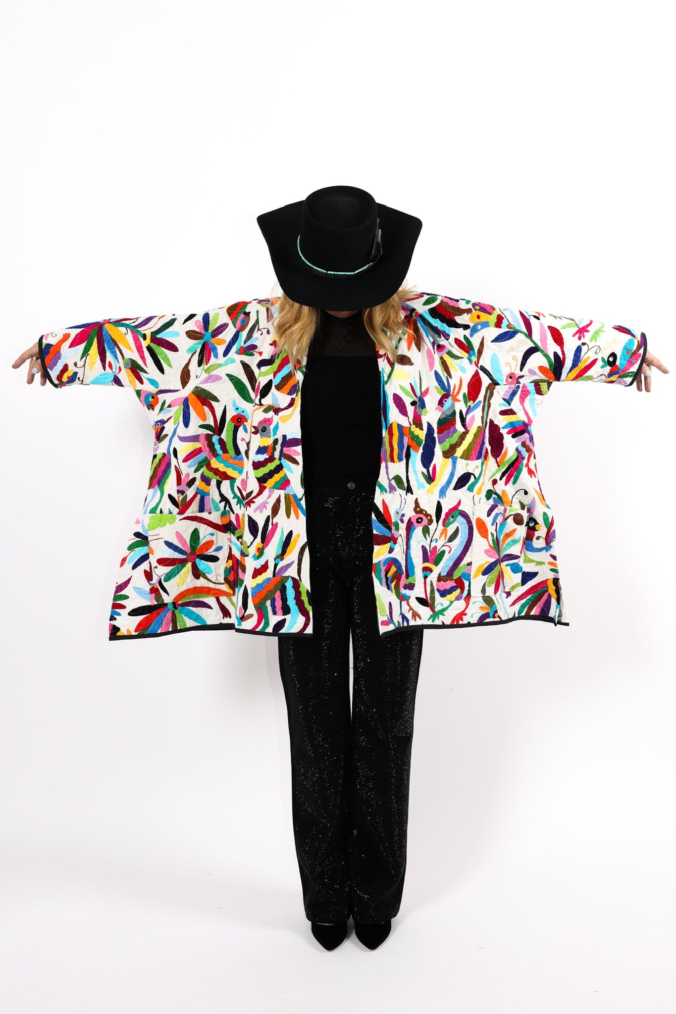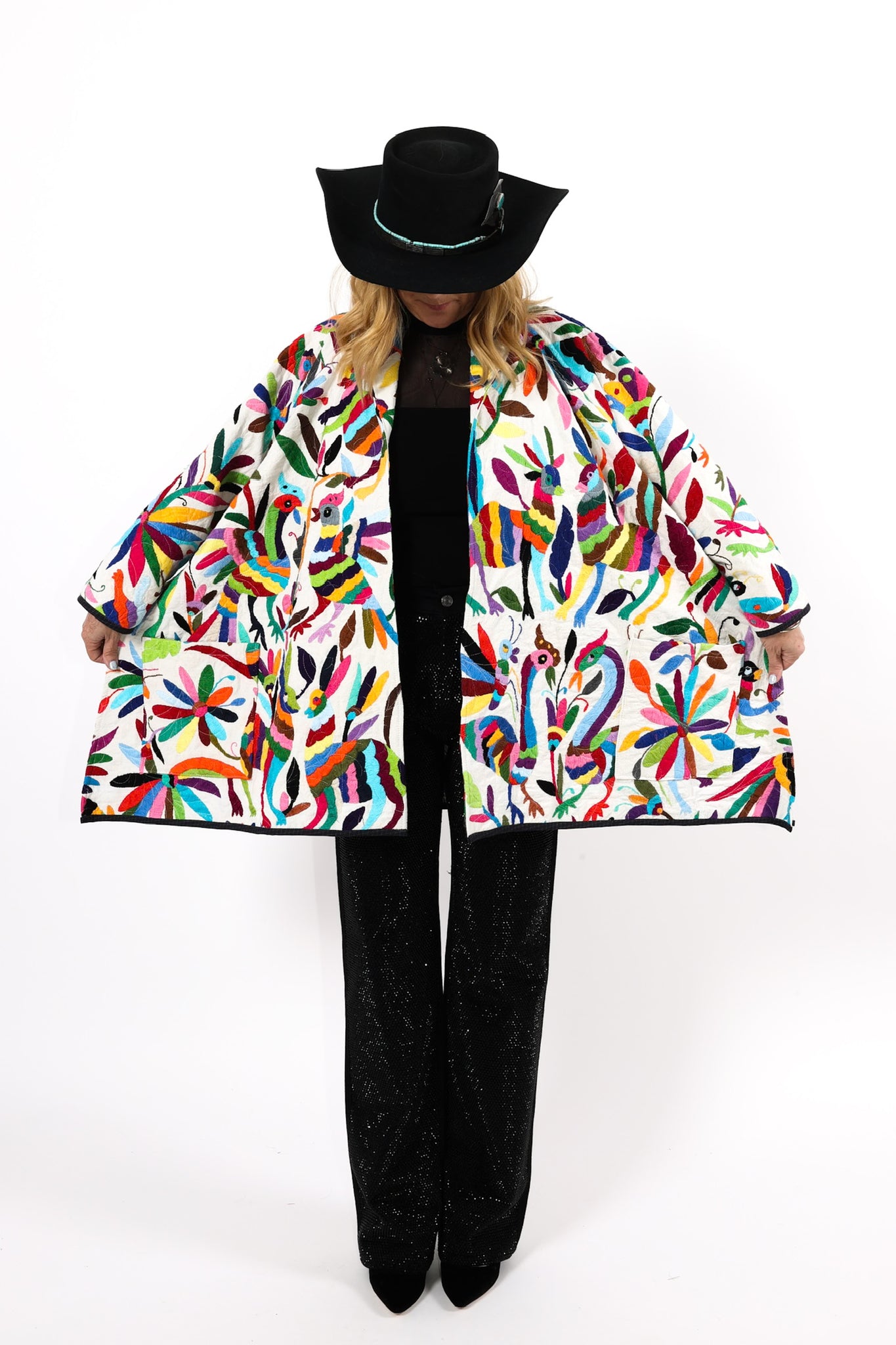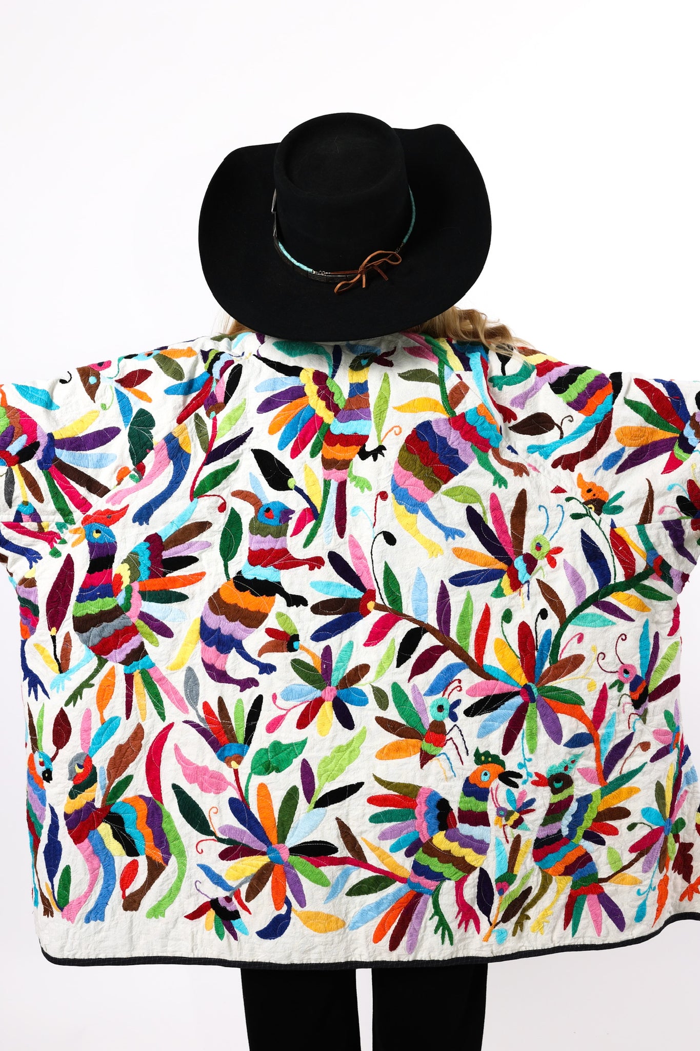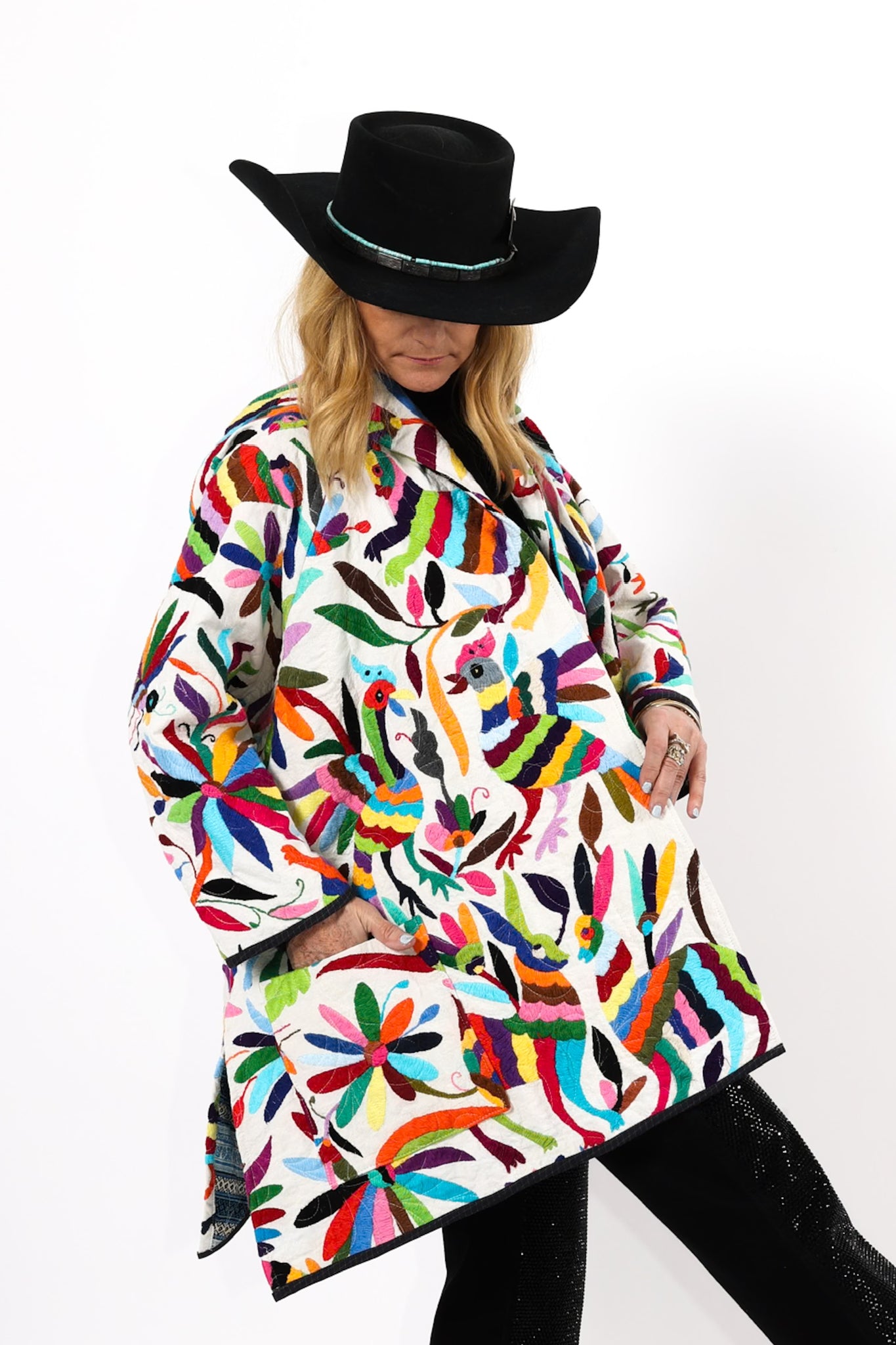 This is a hand embroidered Otomi from San Miguel, Mexico. These handmade Otomis are becoming harder and harder to find because younger generations are not continuing the traditions of their ancestors. Otomi embroidery is a Mexican style of hand embroidery. The Otomi textiles, also known as tenangos, take weeks or even years for the women to embroider. They are said to be based off of cliff paintings in the Tepehua-Otomi mountains in the area. Some say that they may be also inspired by cave paintings in the Mexican Plateau area. The embroidery is done on ivory cotton. To make this Otomi into a quilt we added blue and black novelty fabric for the backing(inside of jacket). We recommend cuffing the sleeves to show off this fun fabric. In our opinion, the jacket is very very thin and lightweight with no loft or batting. This is absolutely a Lady Lancaster 10/10. Please note: The sleeves are 3-4” longer than our standard Helen pattern. It is very flattering and comfortable to wear with a great drape. Please Note: due to the hand embroidered art these textiles can snag more easily than quilts and should be worn more carefully. We consider this a show horse and not a work horse so we highly recommend the new owner of this piece handle with care. If you have further questions, please direct message us and we are happy to send you a video.