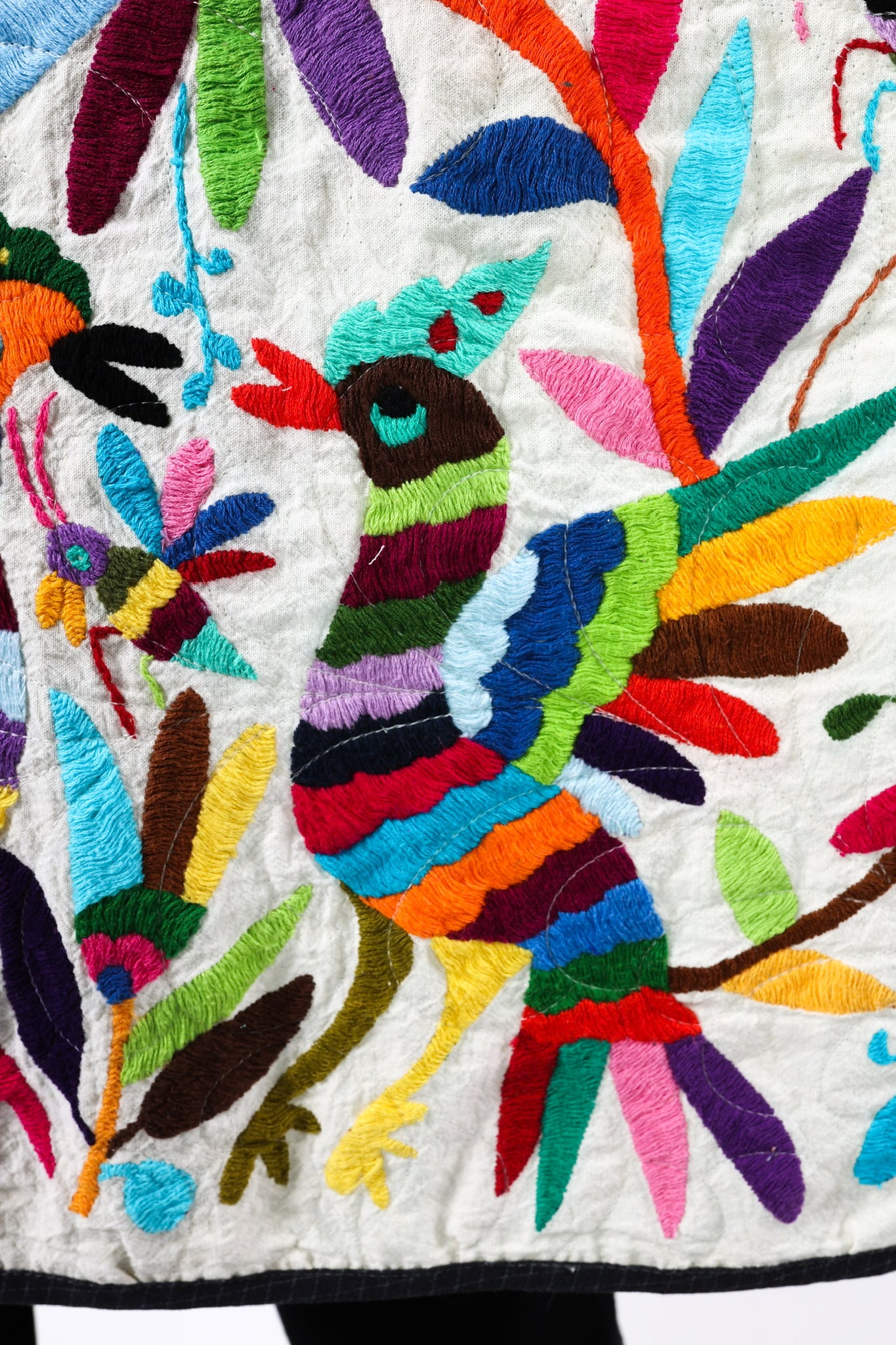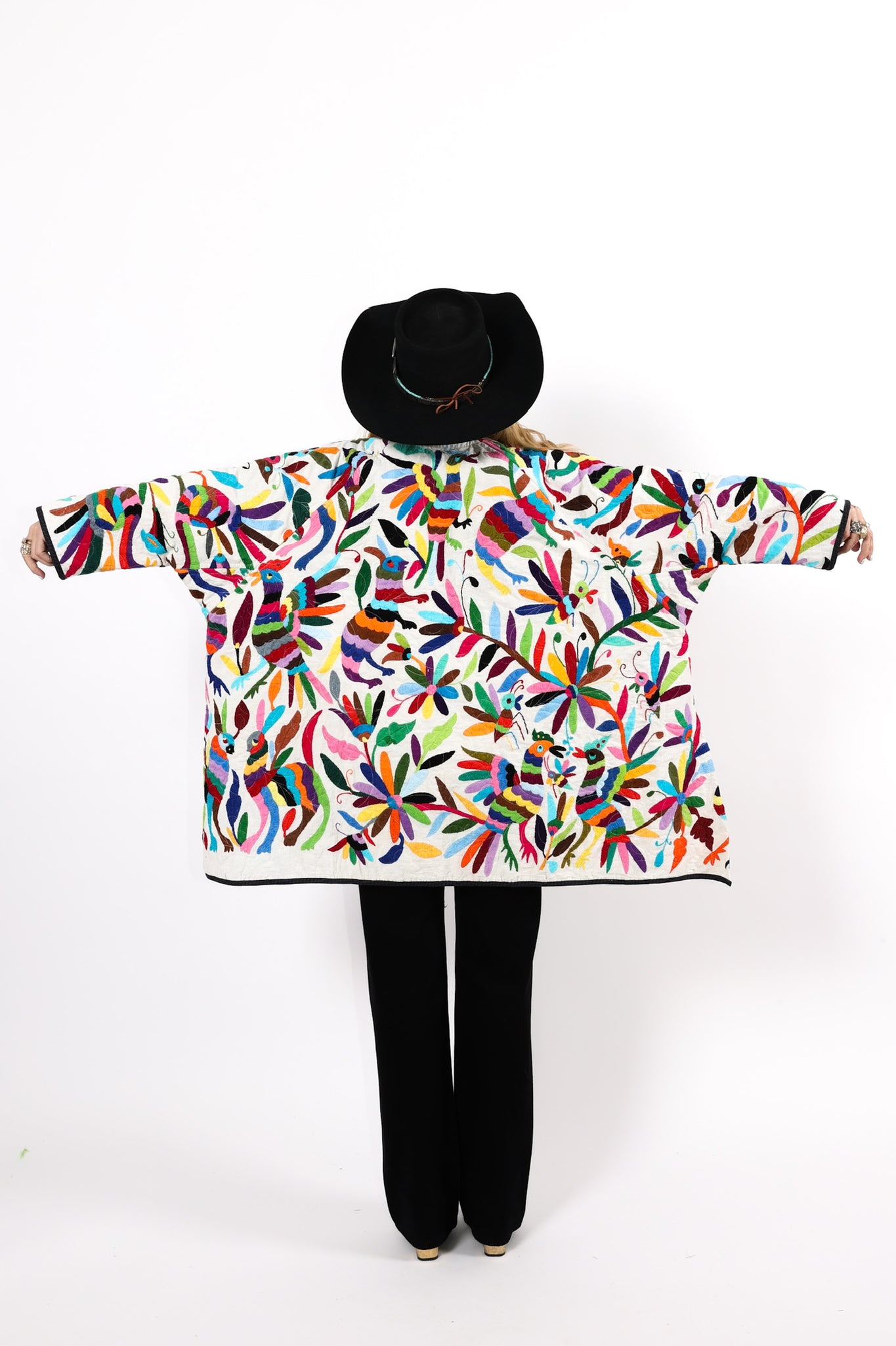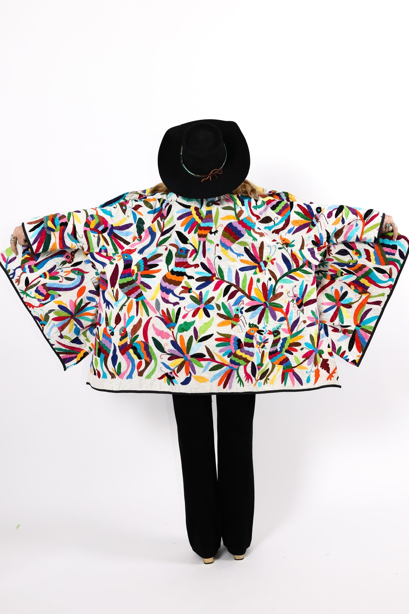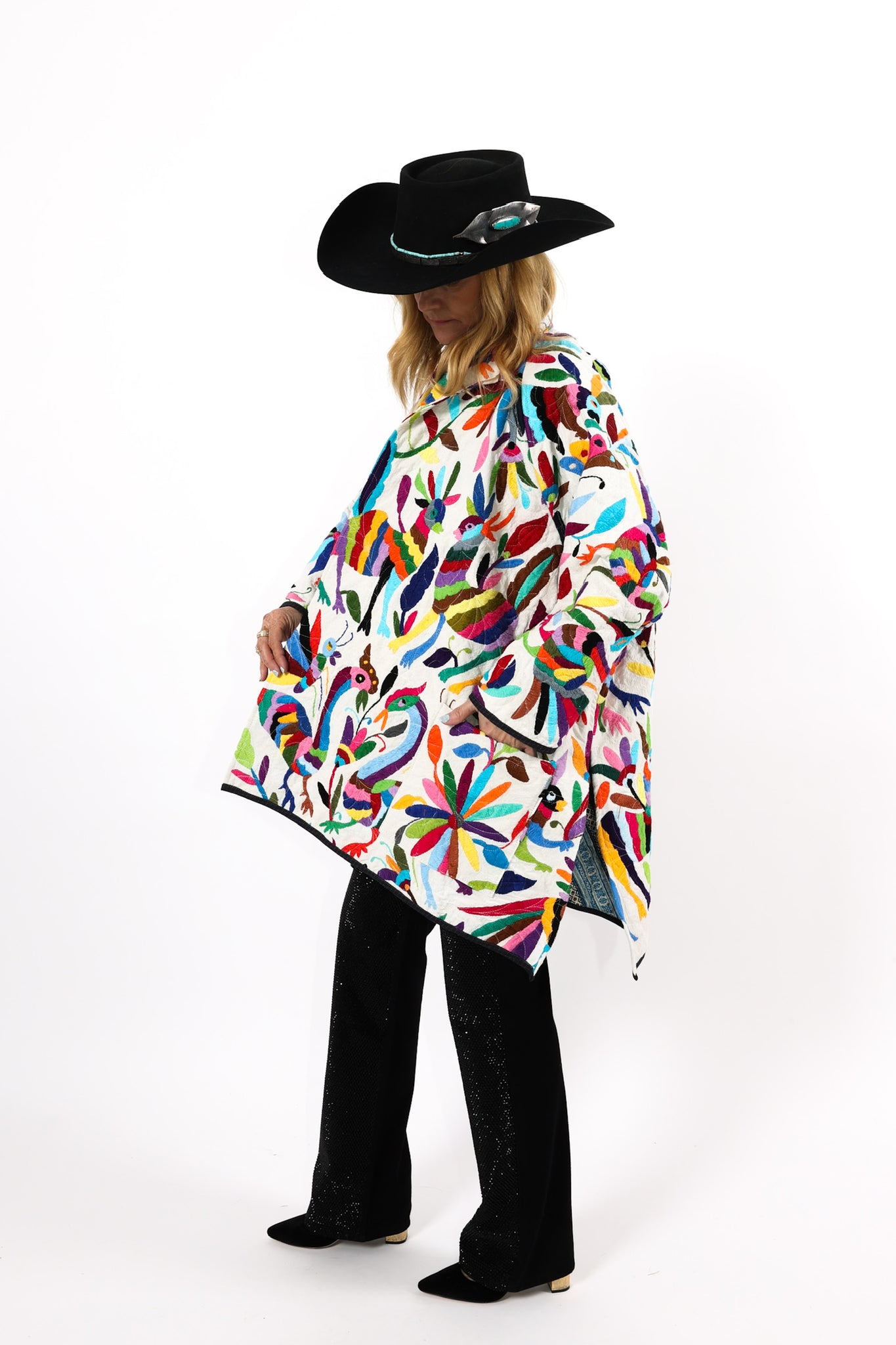 This is a hand embroidered Otomi from San Miguel, Mexico. These handmade Otomis are becoming harder and harder to find because younger generations are not continuing the traditions of their ancestors. Otomi embroidery is a Mexican style of hand embroidery. The Otomi textiles, also known as tenangos, take weeks or even years for the women to embroider. They are said to be based off of cliff paintings in the Tepehua-Otomi mountains in the area. Some say that they may be also inspired by cave paintings in the Mexican Plateau area. The embroidery is done on ivory cotton. To make this Otomi into a quilt we added blue and black novelty fabric for the backing(inside of jacket). We recommend cuffing the sleeves to show off this fun fabric. In our opinion, the jacket is very very thin and lightweight with no loft or batting. This is absolutely a Lady Lancaster 10/10. Please note: The sleeves are 3-4” longer than our standard Helen pattern. It is very flattering and comfortable to wear with a great drape. Please Note: due to the hand embroidered art these textiles can snag more easily than quilts and should be worn more carefully. We consider this a show horse and not a work horse so we highly recommend the new owner of this piece handle with care. If you have further questions, please direct message us and we are happy to send you a video.