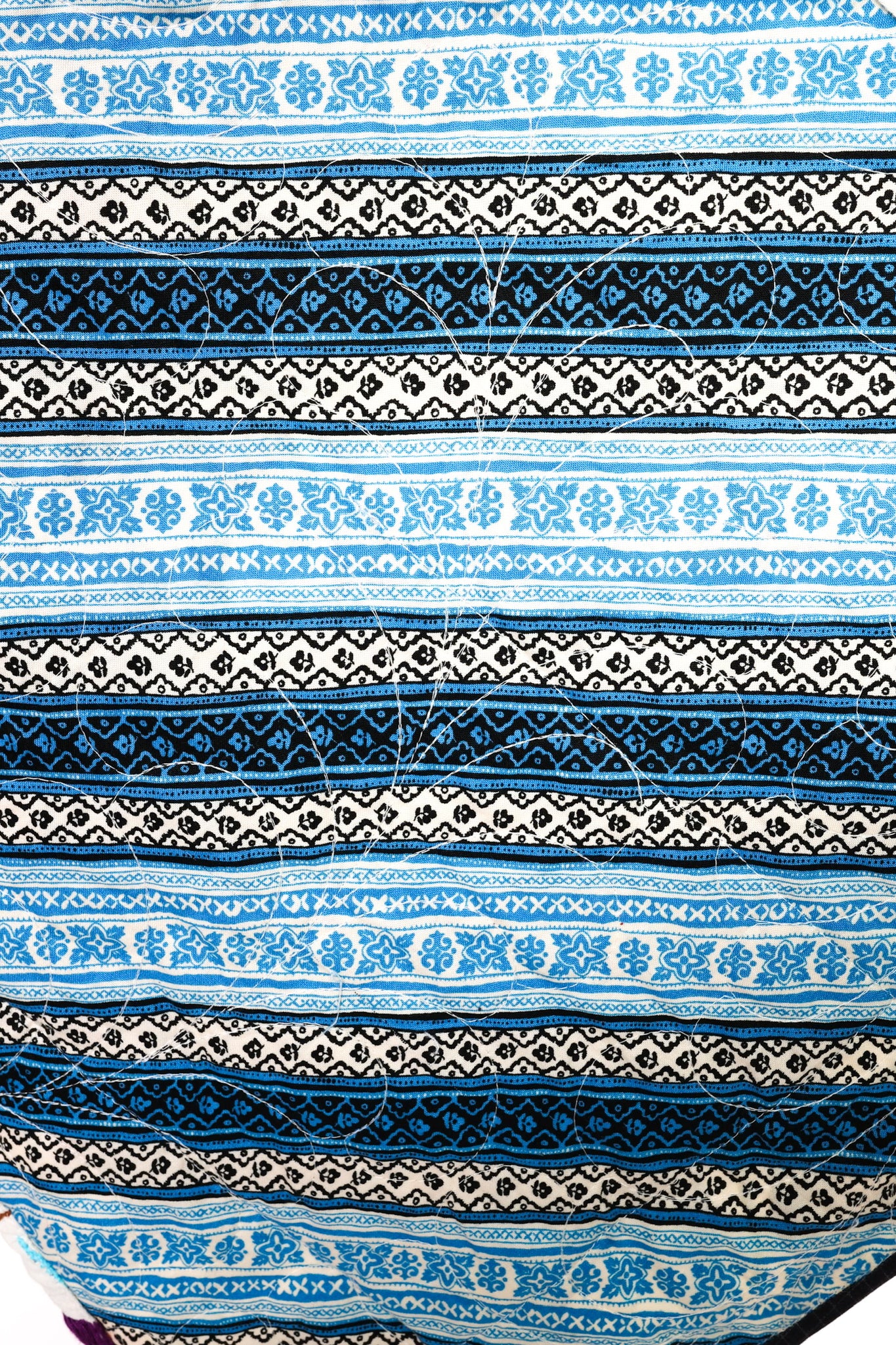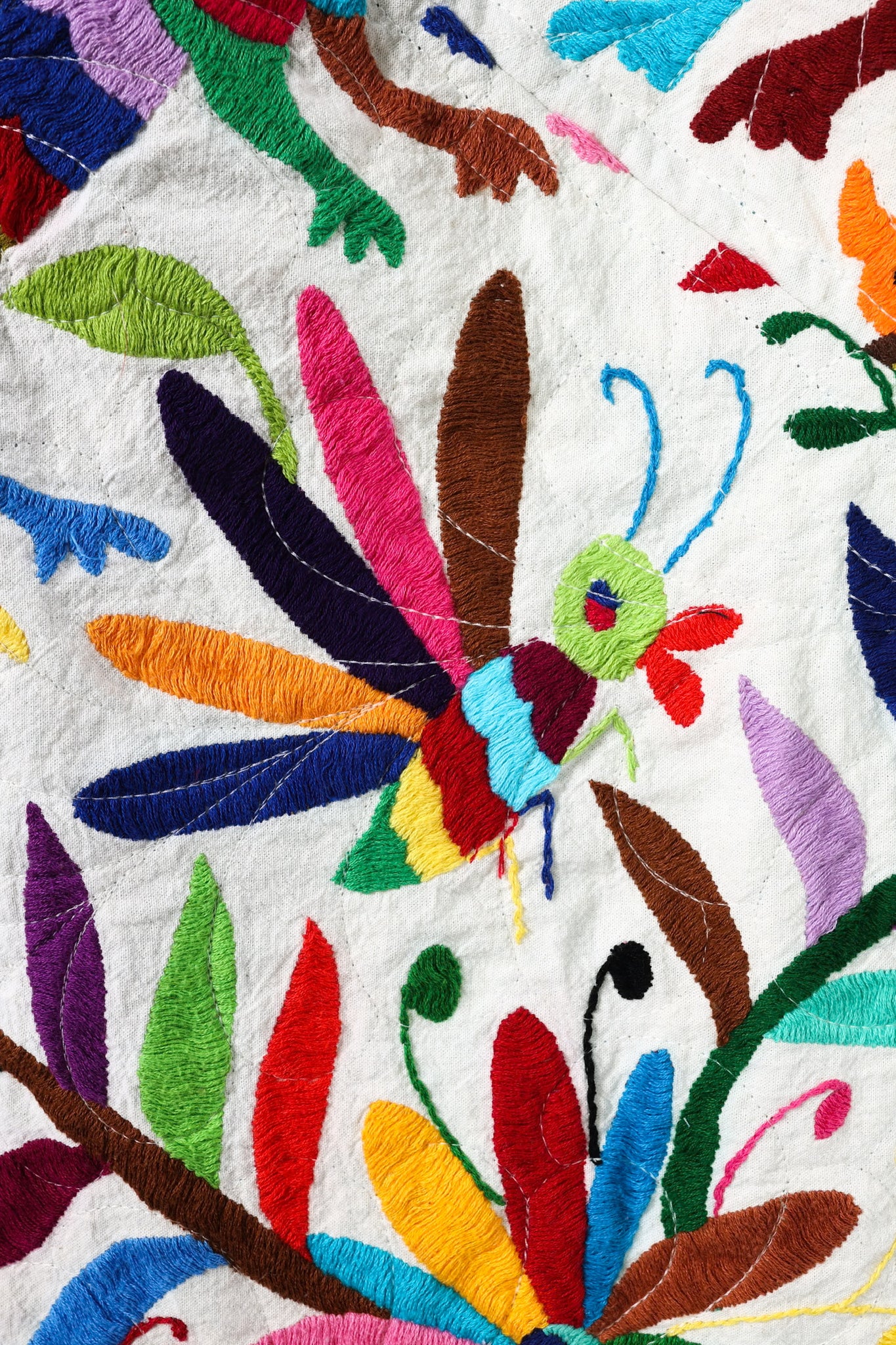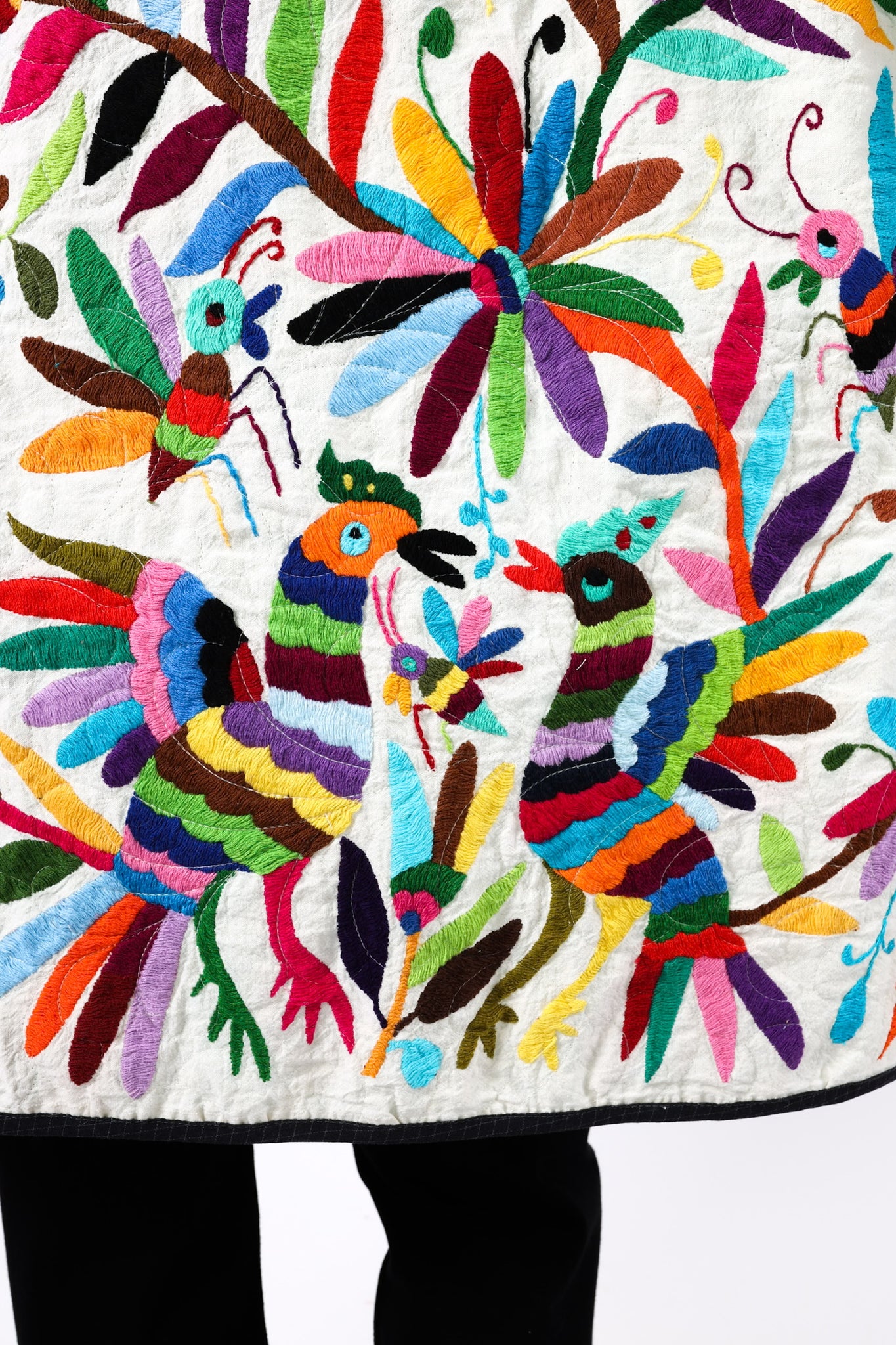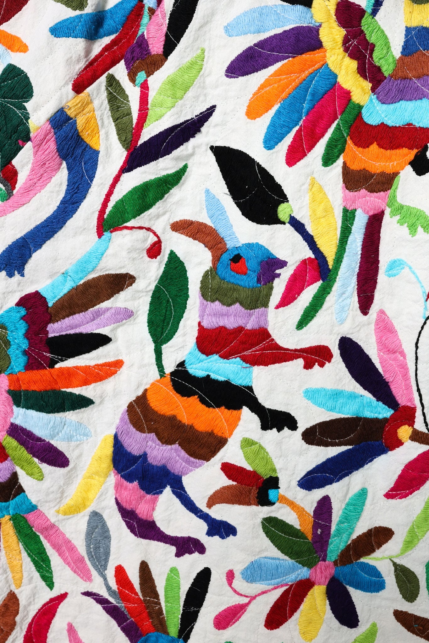 This is a hand embroidered Otomi from San Miguel, Mexico. These handmade Otomis are becoming harder and harder to find because younger generations are not continuing the traditions of their ancestors. Otomi embroidery is a Mexican style of hand embroidery. The Otomi textiles, also known as tenangos, take weeks or even years for the women to embroider. They are said to be based off of cliff paintings in the Tepehua-Otomi mountains in the area. Some say that they may be also inspired by cave paintings in the Mexican Plateau area. The embroidery is done on ivory cotton. To make this Otomi into a quilt we added blue and black novelty fabric for the backing(inside of jacket). We recommend cuffing the sleeves to show off this fun fabric. In our opinion, the jacket is very very thin and lightweight with no loft or batting. This is absolutely a Lady Lancaster 10/10. Please note: The sleeves are 3-4” longer than our standard Helen pattern. It is very flattering and comfortable to wear with a great drape. Please Note: due to the hand embroidered art these textiles can snag more easily than quilts and should be worn more carefully. We consider this a show horse and not a work horse so we highly recommend the new owner of this piece handle with care. If you have further questions, please direct message us and we are happy to send you a video.