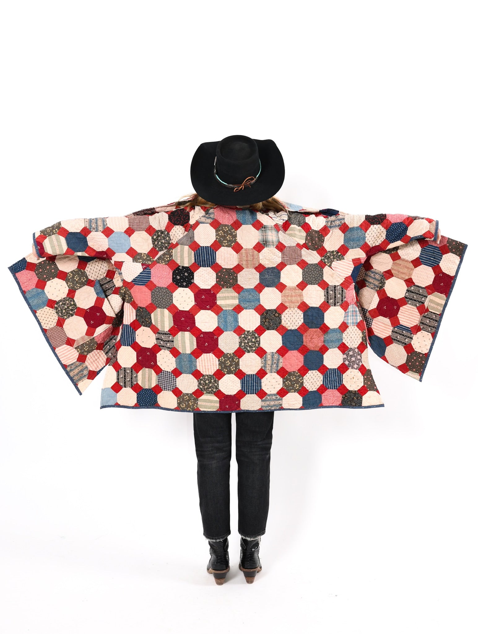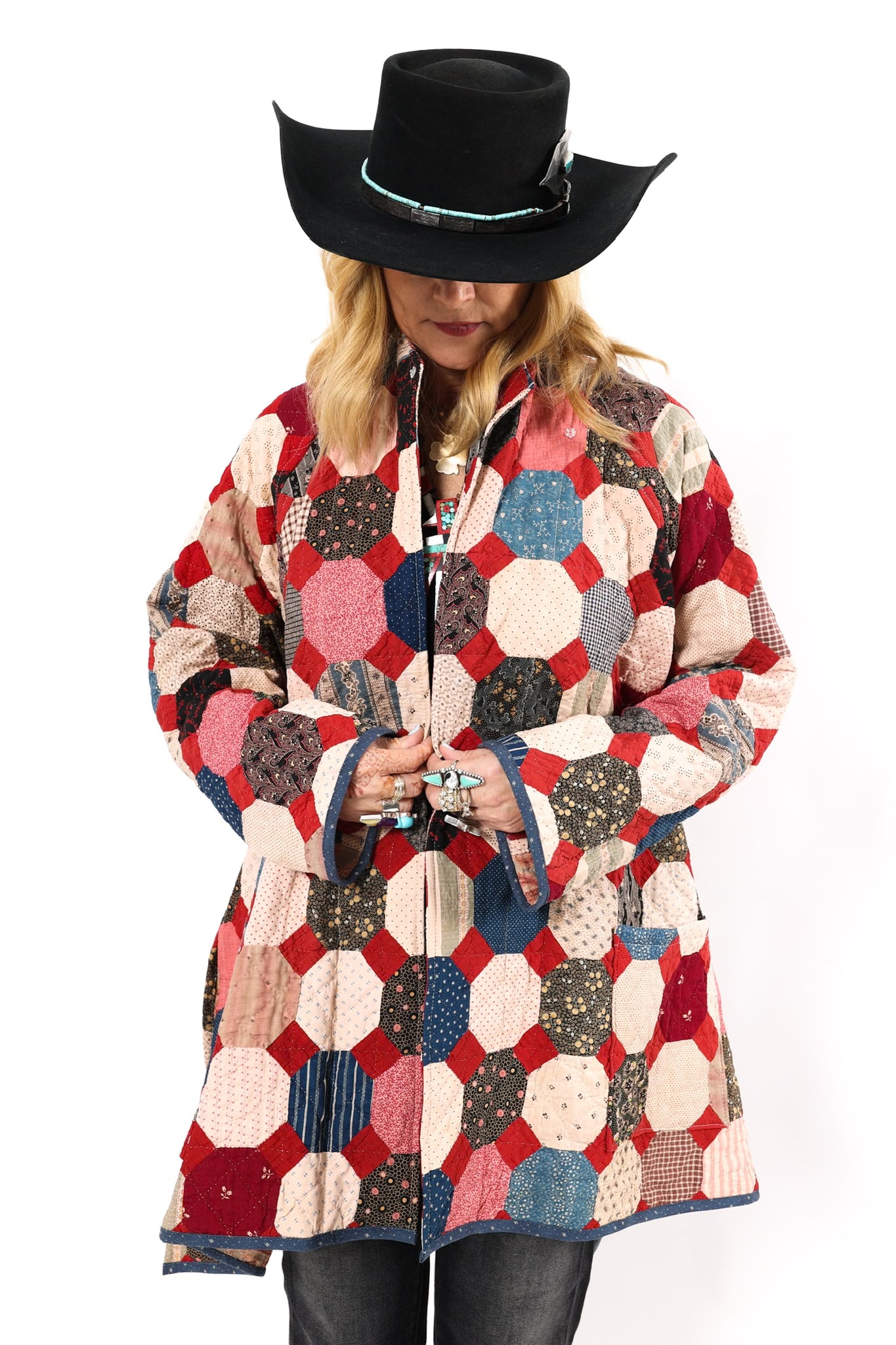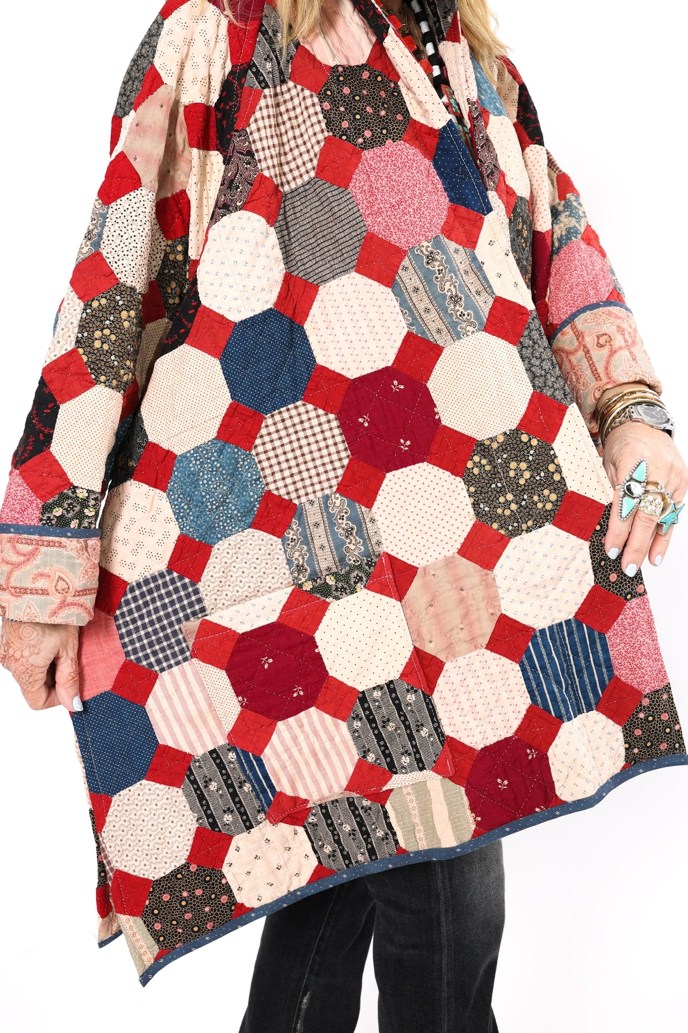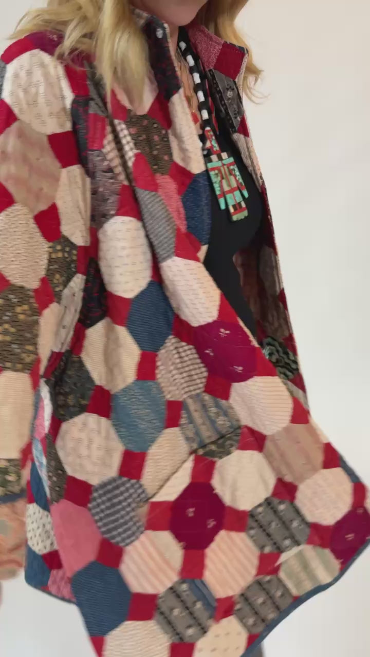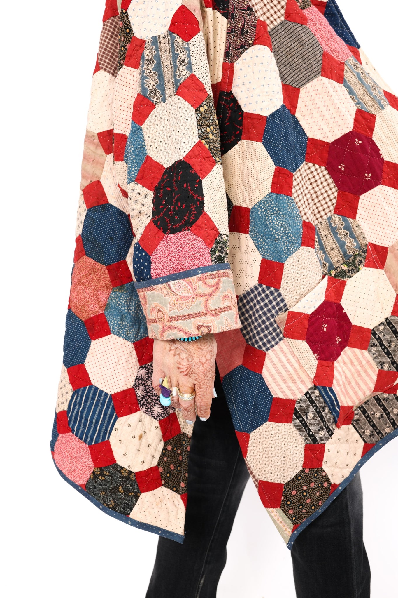 This is an antique American quilt made circa 1880s to 1910s. This quilt pattern has been called many names throughout the years. Our favorites are Job's Trouble, Mechanical Blocks, and Ozark Cobblestones. The quilt has been beautifully hand quilted and hand sewn which is a labor of love and a lost art. This is an absolute masterpiece from the turn-of-the-century. We are humbled to have worked with this quilt. This piece was not from a humble home, it is filled with rare fabrics from the 1800s. On top of that, it is backed(inside of jacket) with a beautiful paisley fabric. You will want to cuff the sleeves or wear this jacket inside out. In our opinion, the quilt is very thin, very lightweight, soft, has very little loft(puffiness), and has a beautiful and flattering drape. This is a Lady Lancaster 10/10 and a slice of American pie. Please note, the sleeves are 3” longer than our standard Helen pattern. Overall, this quilt is in excellent condition for its age! If you have further questions, please direct message us and we are happy to send you a video.