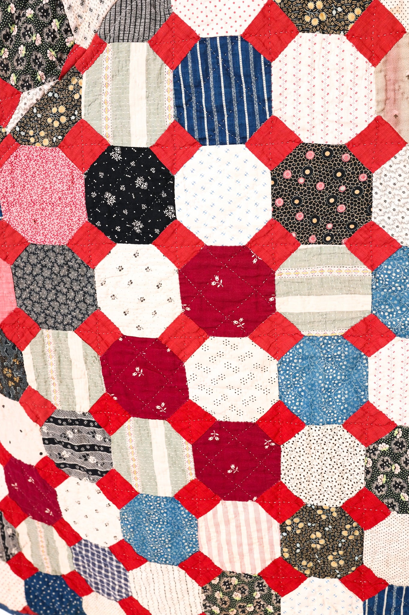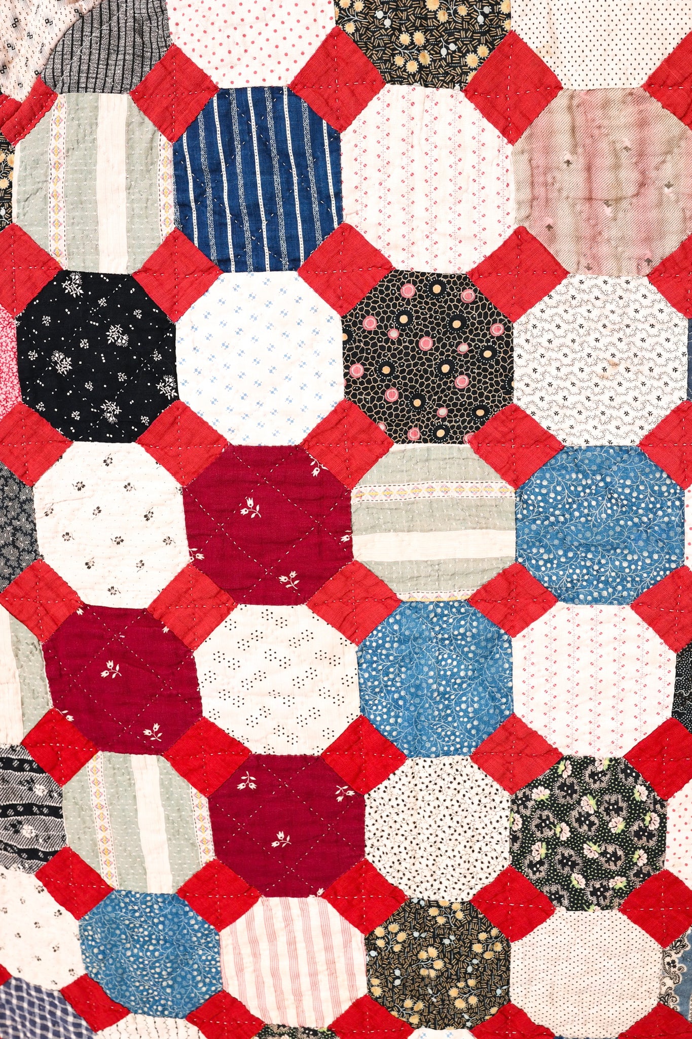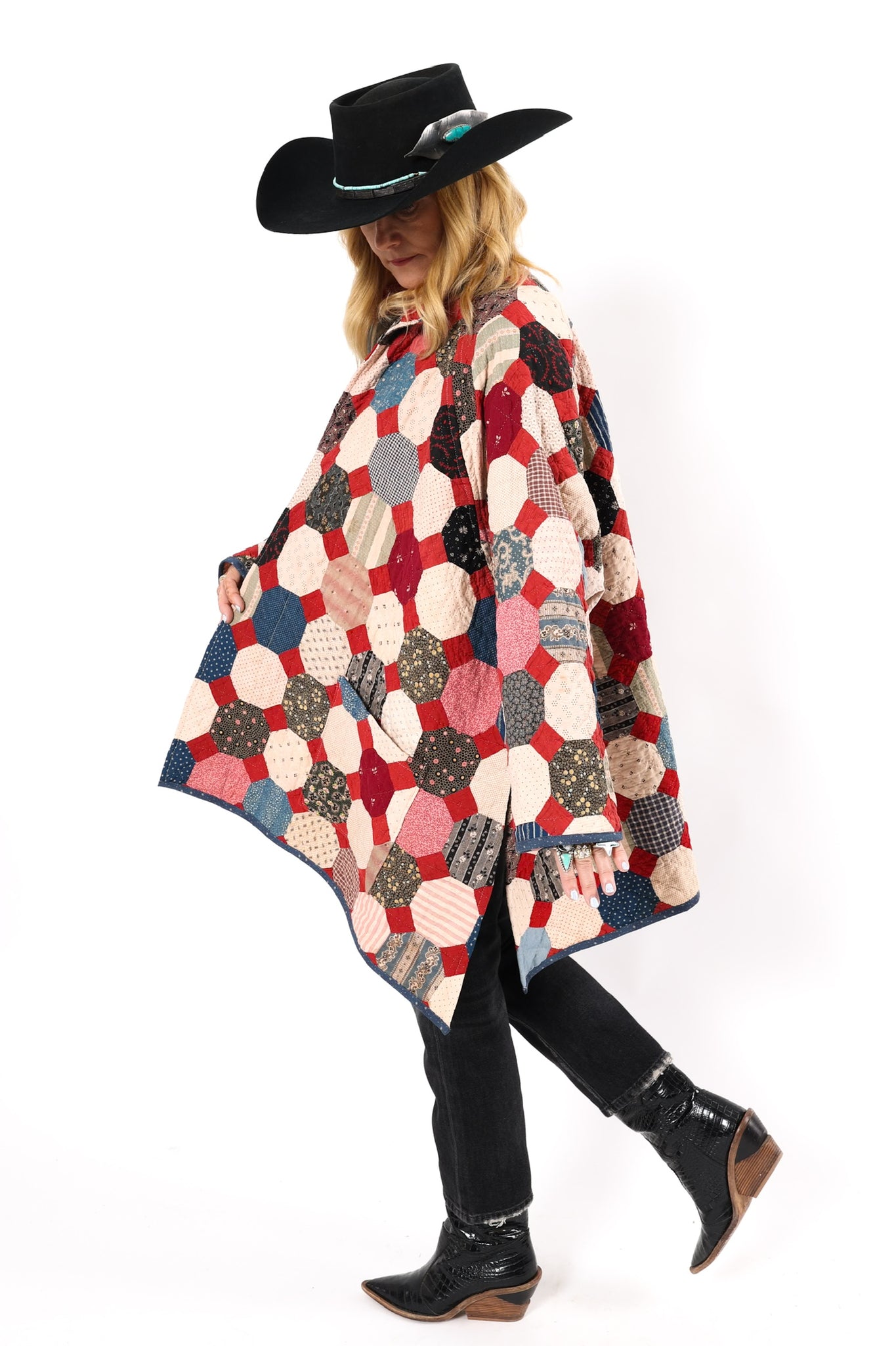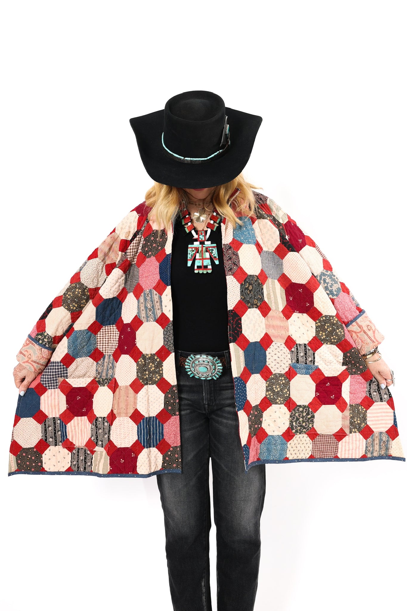 This is an antique American quilt made circa 1880s to 1910s. This quilt pattern has been called many names throughout the years. Our favorites are Job's Trouble, Mechanical Blocks, and Ozark Cobblestones. The quilt has been beautifully hand quilted and hand sewn which is a labor of love and a lost art. This is an absolute masterpiece from the turn-of-the-century. We are humbled to have worked with this quilt. This piece was not from a humble home, it is filled with rare fabrics from the 1800s. On top of that, it is backed(inside of jacket) with a beautiful paisley fabric. You will want to cuff the sleeves or wear this jacket inside out. In our opinion, the quilt is very thin, very lightweight, soft, has very little loft(puffiness), and has a beautiful and flattering drape. This is a Lady Lancaster 10/10 and a slice of American pie. Please note, the sleeves are 3” longer than our standard Helen pattern. Overall, this quilt is in excellent condition for its age! If you have further questions, please direct message us and we are happy to send you a video.