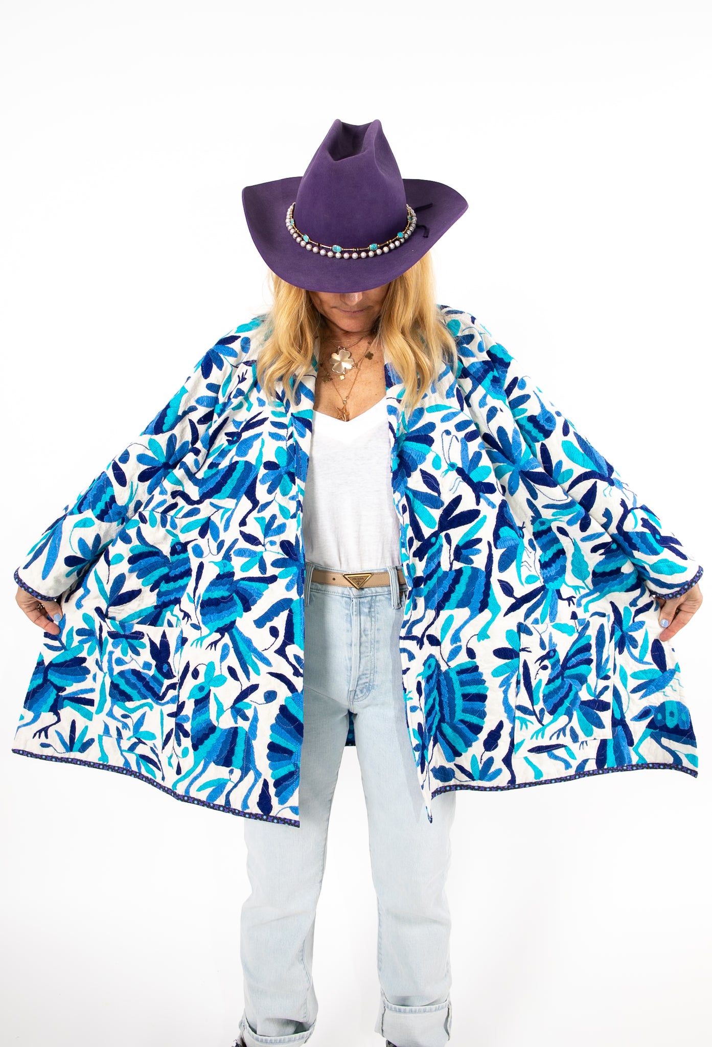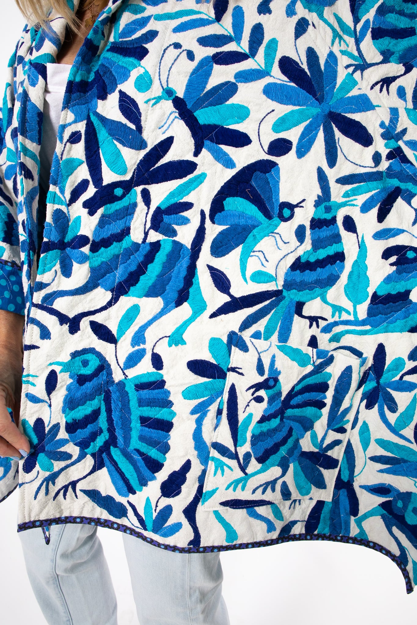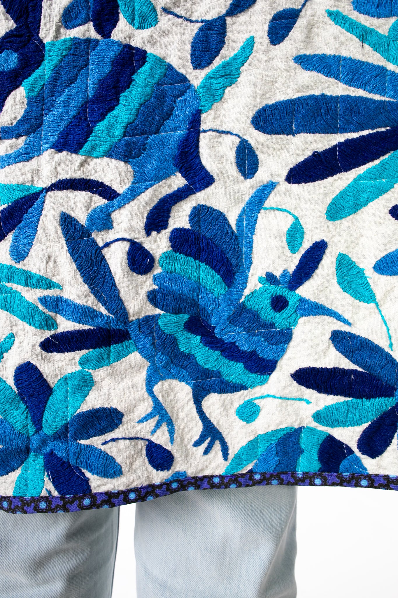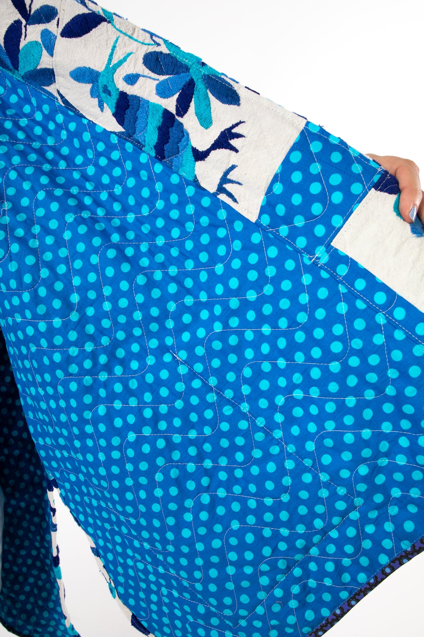 This is a hand embroidered Otomi from San Miguel, Mexico. These handmade Otomis are becoming harder and harder to find because younger generations are not continuing the traditions of their ancestors. Otomi embroidery is a Mexican style of hand embroidery. The Otomi textiles, also known as tenangos, take weeks or even years for the women to embroider. They are said to be based off of cliff paintings in the Tepehua-Otomi mountains in the area. Some say that they may be also inspired by cave paintings in the Mexican Plateau area. The embroidery is done on ivory cotton. To make this Otomi into a quilt we added blue polka dot fabric for the backing(inside of jacket). We recommend cuffing the sleeves to show off this fun fabric. In our opinion, the jacket is very very thin and lightweight with no loft or batting. This is absolutely a Lady Lancaster 10/10. It is very flattering and comfortable to wear with a great drape. Please Note: due to the hand embroidered art these textiles can snag more easily than quilts and should be worn more carefully. We consider this a show horse and not a work horse so we highly recommend the new owner of this piece handle with care. Please note: the sleeves are 2" longer than our standard Helen pattern. If you have further questions, please direct message us and we are happy to send you a video.