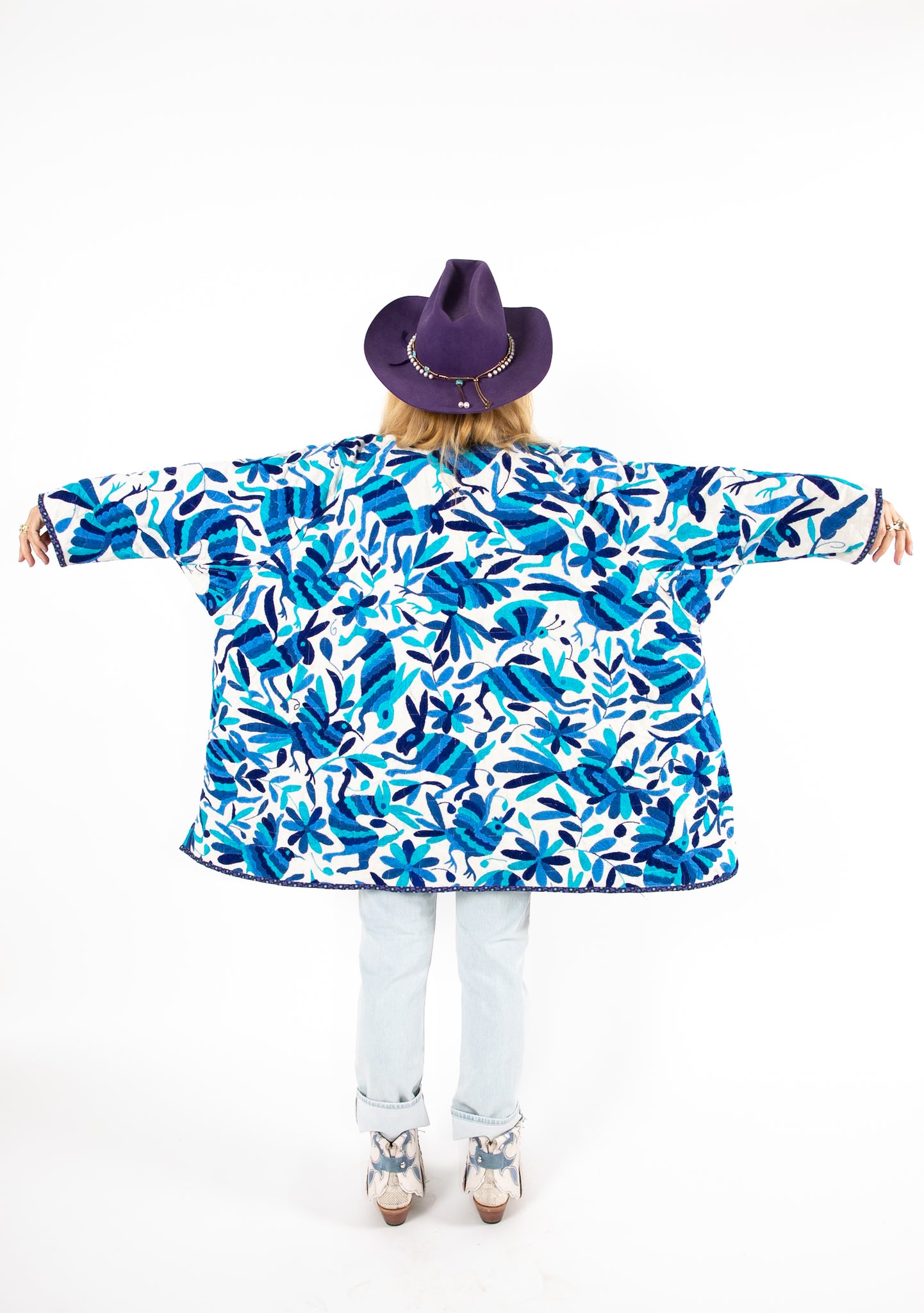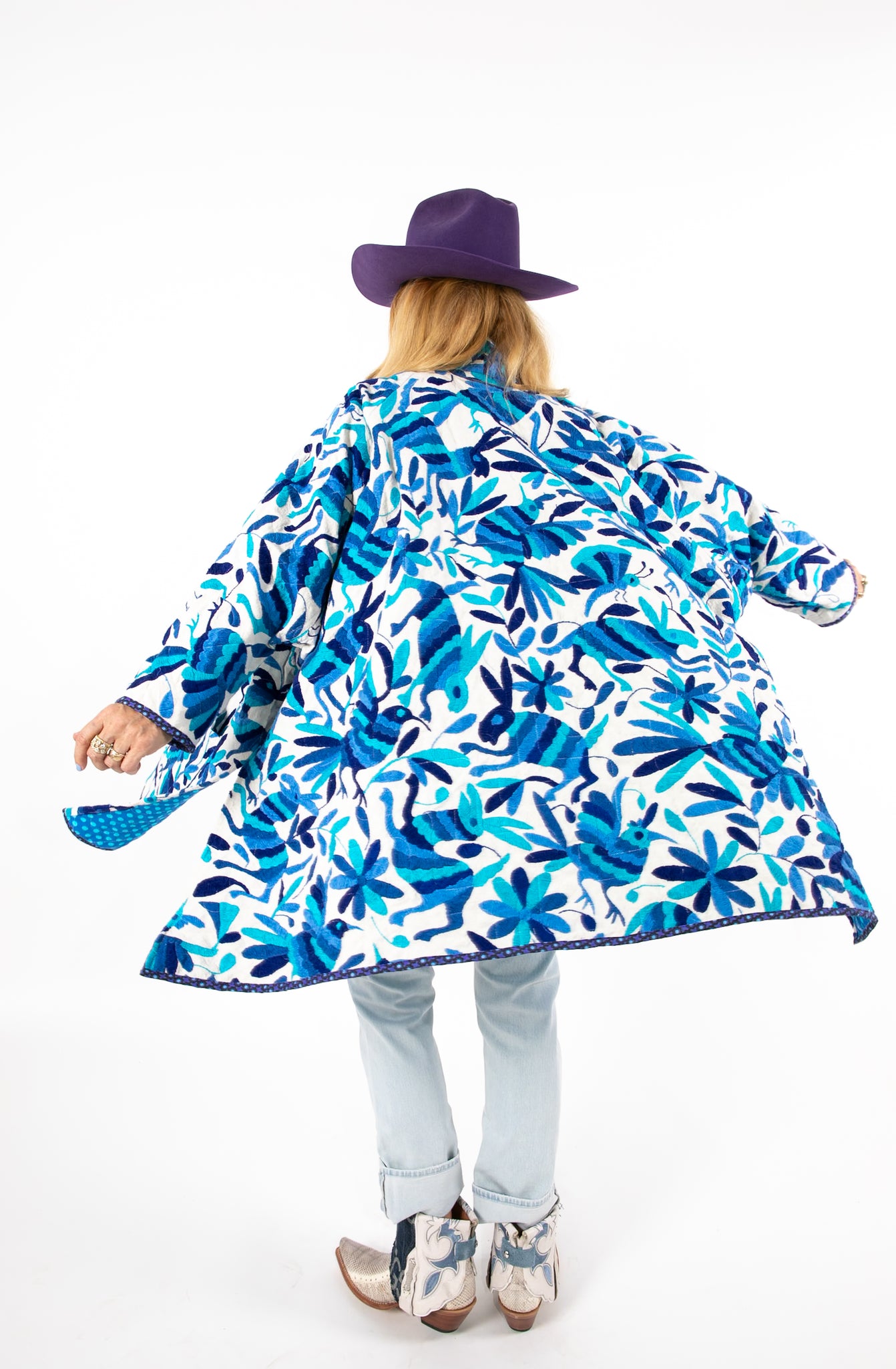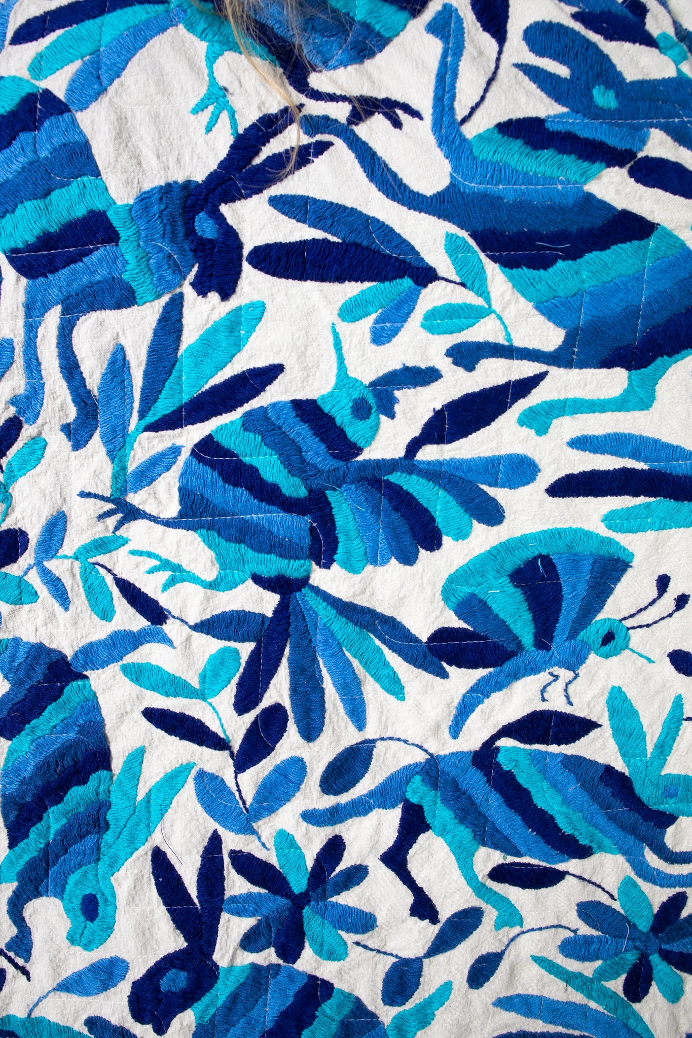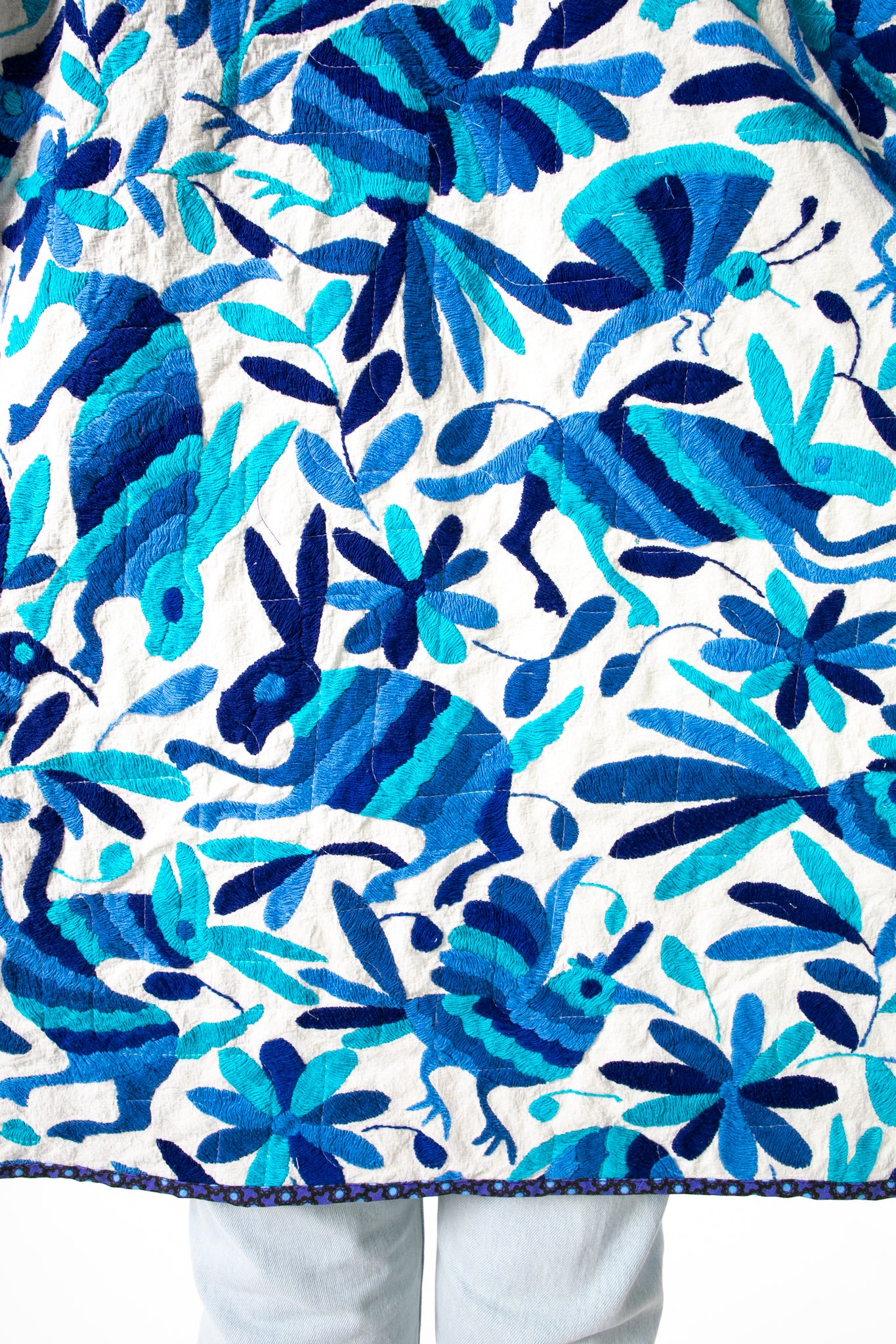 This is a hand embroidered Otomi from San Miguel, Mexico. These handmade Otomis are becoming harder and harder to find because younger generations are not continuing the traditions of their ancestors. Otomi embroidery is a Mexican style of hand embroidery. The Otomi textiles, also known as tenangos, take weeks or even years for the women to embroider. They are said to be based off of cliff paintings in the Tepehua-Otomi mountains in the area. Some say that they may be also inspired by cave paintings in the Mexican Plateau area. The embroidery is done on ivory cotton. To make this Otomi into a quilt we added blue polka dot fabric for the backing(inside of jacket). We recommend cuffing the sleeves to show off this fun fabric. In our opinion, the jacket is very very thin and lightweight with no loft or batting. This is absolutely a Lady Lancaster 10/10. It is very flattering and comfortable to wear with a great drape. Please Note: due to the hand embroidered art these textiles can snag more easily than quilts and should be worn more carefully. We consider this a show horse and not a work horse so we highly recommend the new owner of this piece handle with care. Please note: the sleeves are 2" longer than our standard Helen pattern. If you have further questions, please direct message us and we are happy to send you a video.