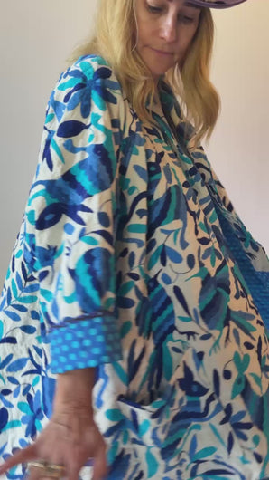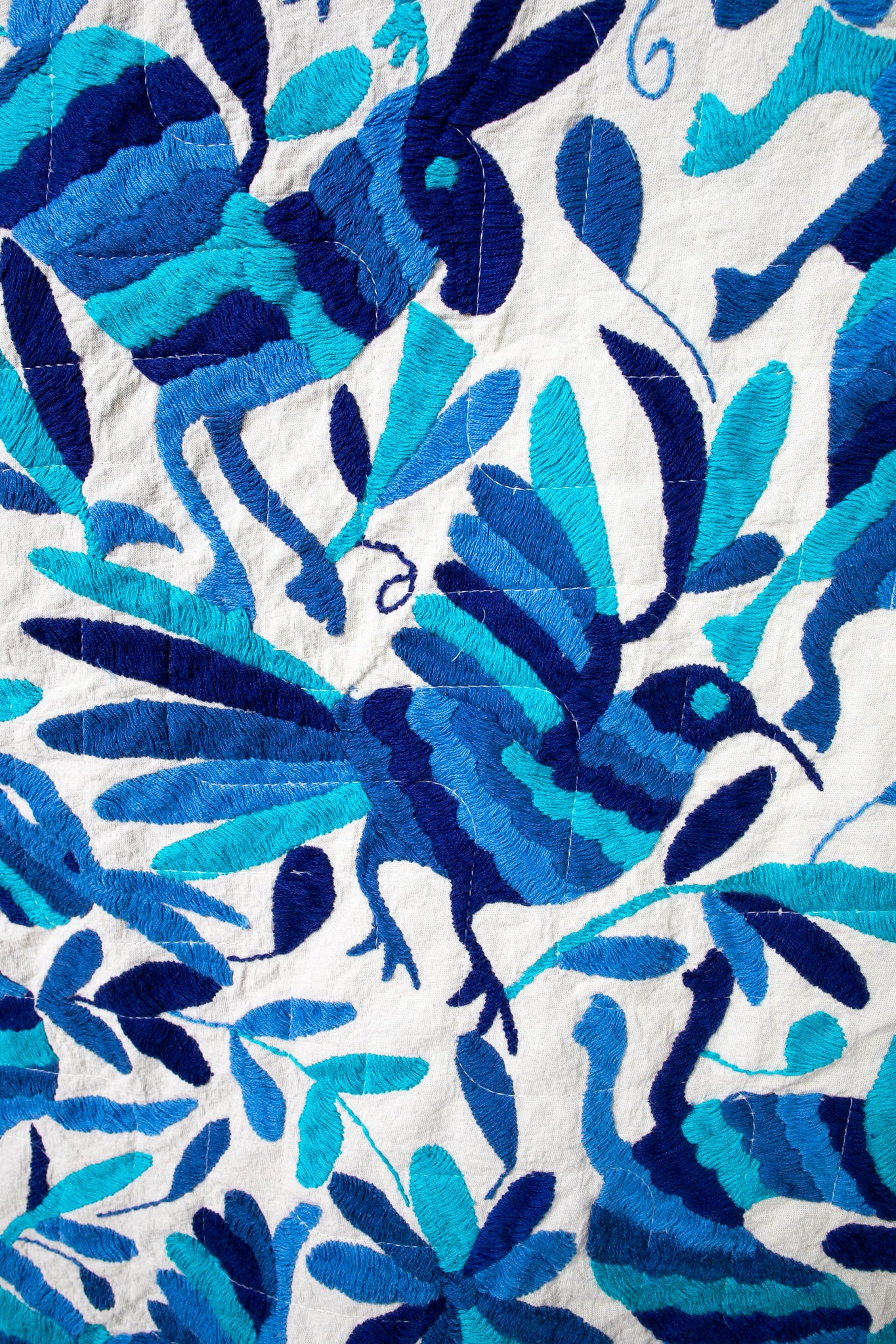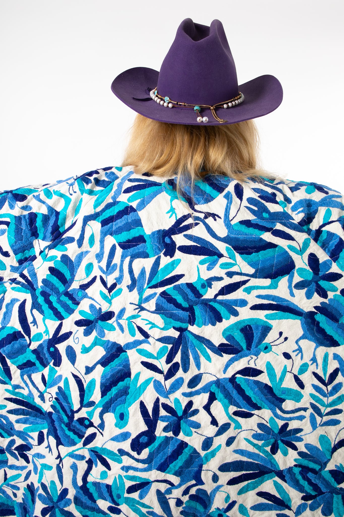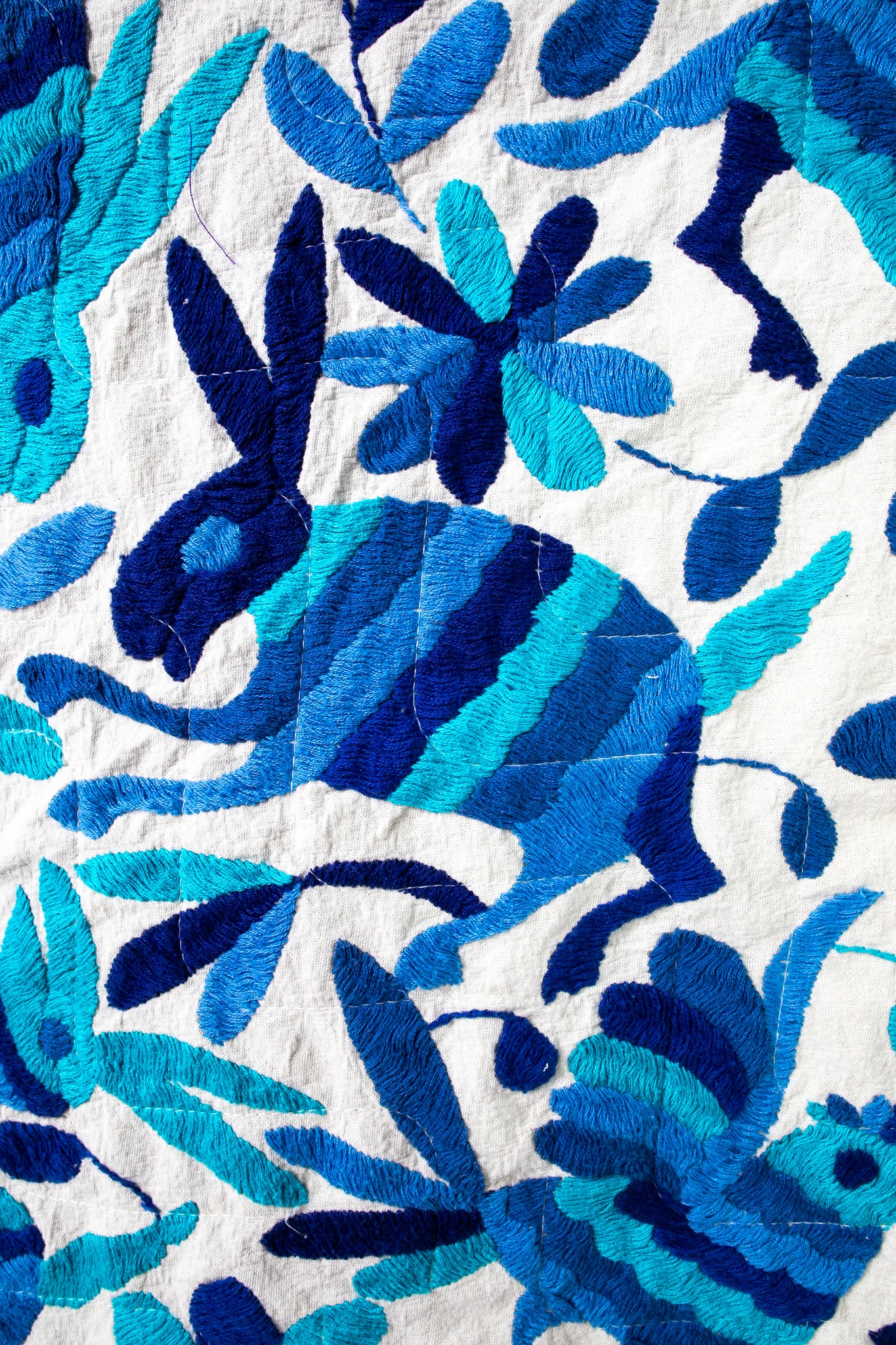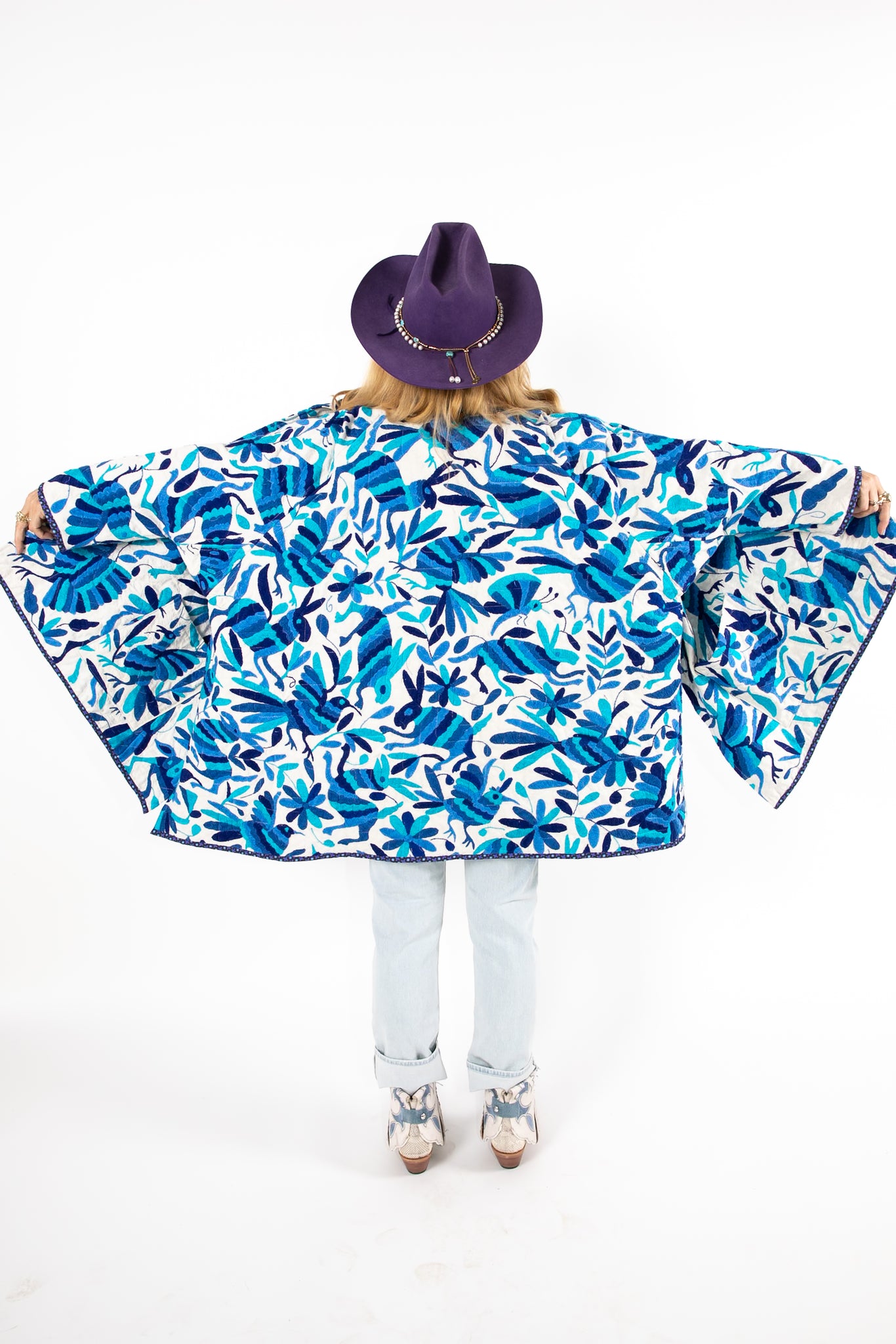 This is a hand embroidered Otomi from San Miguel, Mexico. These handmade Otomis are becoming harder and harder to find because younger generations are not continuing the traditions of their ancestors. Otomi embroidery is a Mexican style of hand embroidery. The Otomi textiles, also known as tenangos, take weeks or even years for the women to embroider. They are said to be based off of cliff paintings in the Tepehua-Otomi mountains in the area. Some say that they may be also inspired by cave paintings in the Mexican Plateau area. The embroidery is done on ivory cotton. To make this Otomi into a quilt we added blue polka dot fabric for the backing(inside of jacket). We recommend cuffing the sleeves to show off this fun fabric. In our opinion, the jacket is very very thin and lightweight with no loft or batting. This is absolutely a Lady Lancaster 10/10. It is very flattering and comfortable to wear with a great drape. Please Note: due to the hand embroidered art these textiles can snag more easily than quilts and should be worn more carefully. We consider this a show horse and not a work horse so we highly recommend the new owner of this piece handle with care. Please note: the sleeves are 2" longer than our standard Helen pattern. If you have further questions, please direct message us and we are happy to send you a video.