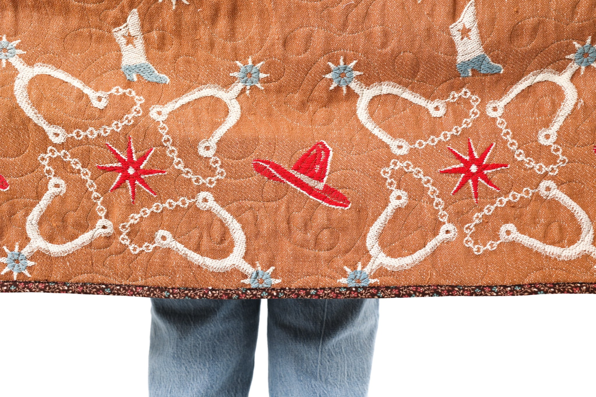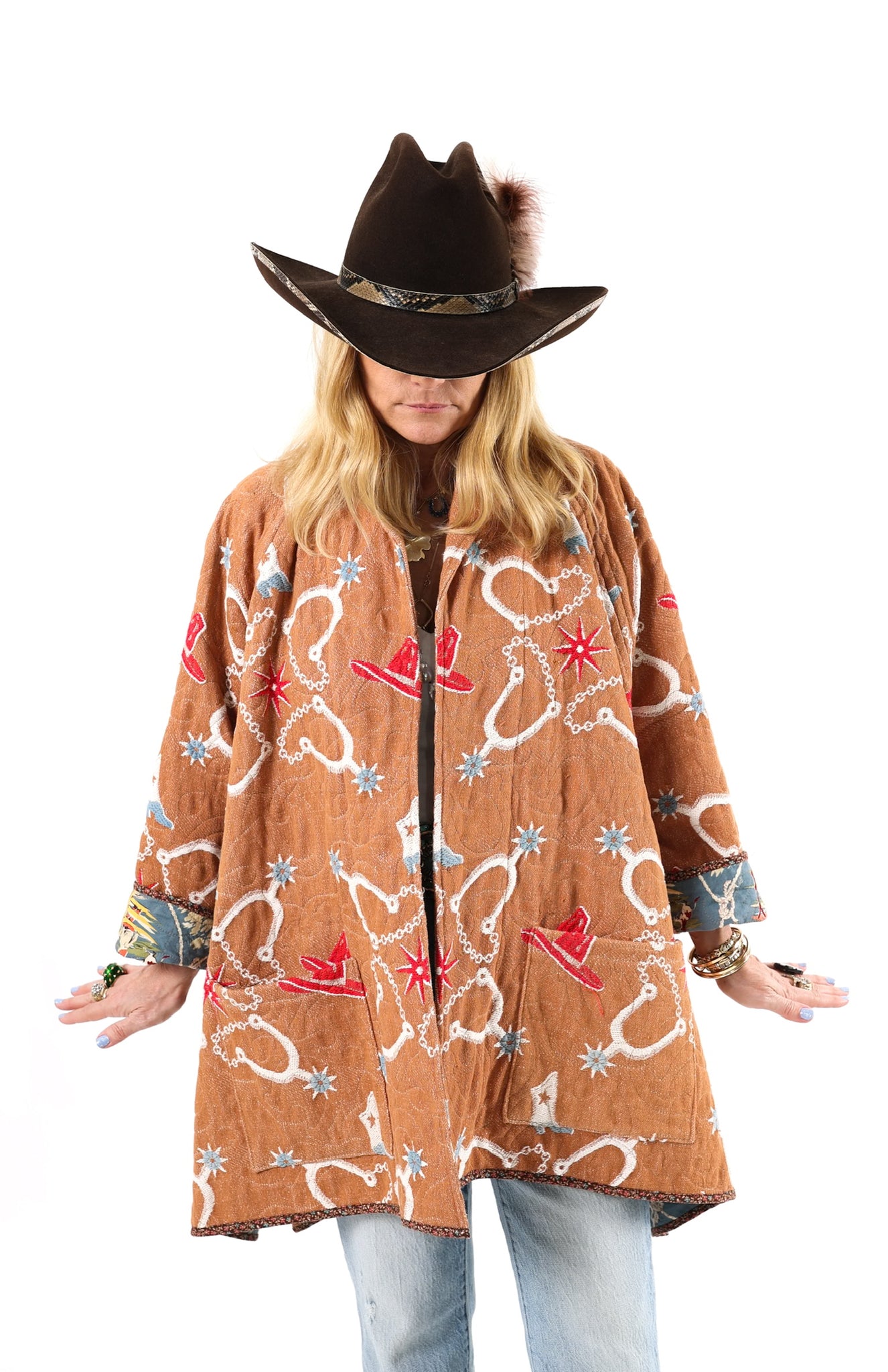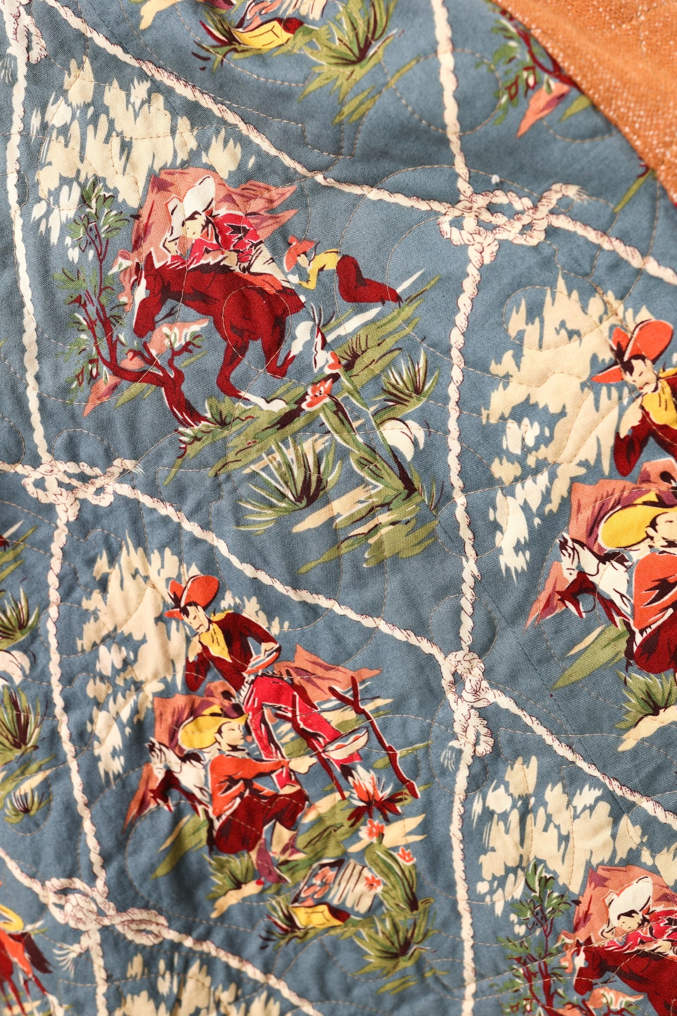 This quilt is a combination of a mid-century Bates bedspread and rare Alexander Henry western novelty fabric. You will want to show of the backing fabric(inside of jacket) by wearing the jacket inside out or cuffing the sleeves. In our opinion, the jacket is thin, soft, lightweight, and has a beautiful drape. This is a Lady Lancaster 10/10. Please note, the Bates bedspread does have a little wear in a few isolated spots. Please see the iphone photo at the end of the listing. If you have further questions, please direct message us and we are happy to send you a video.