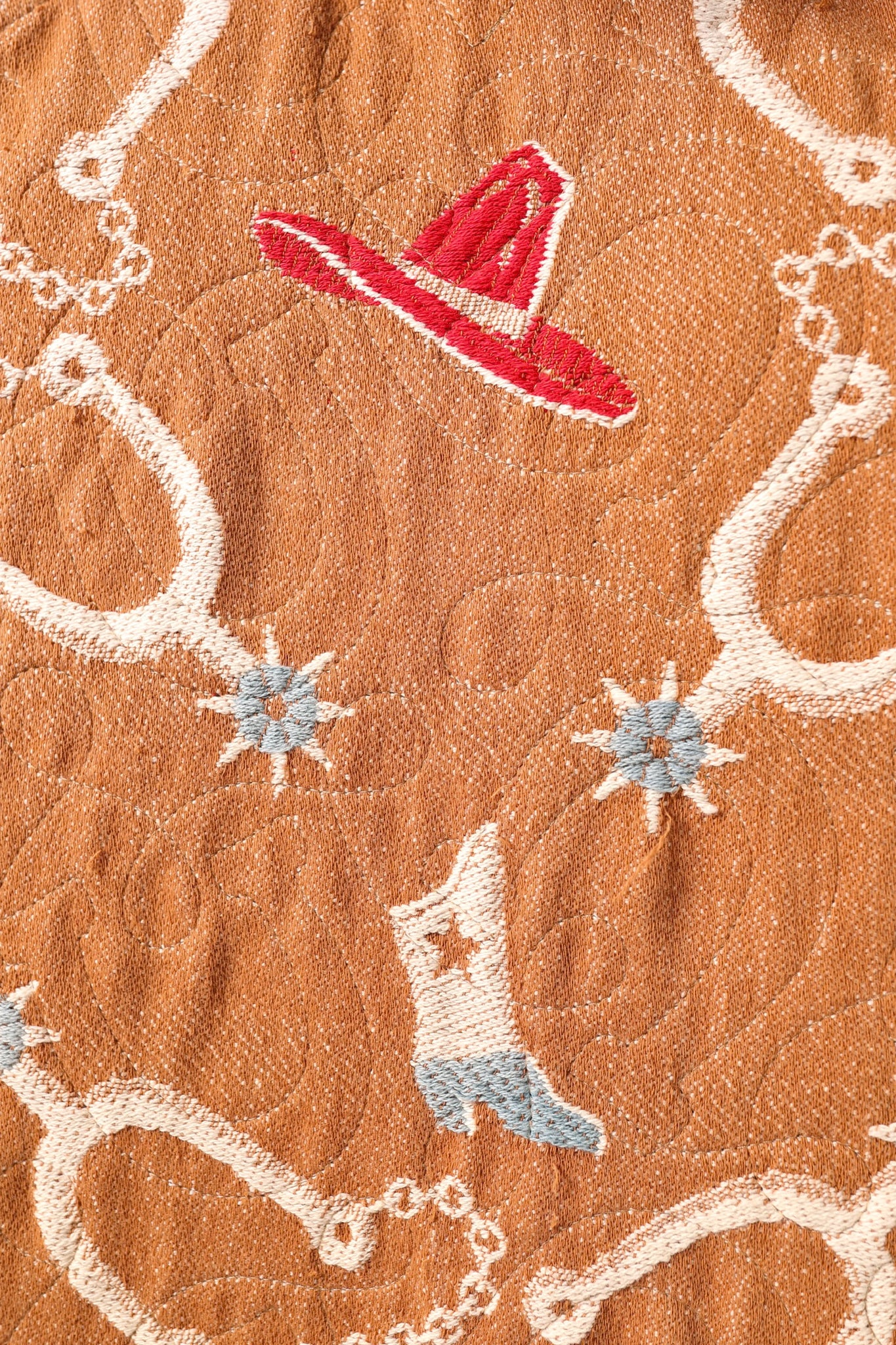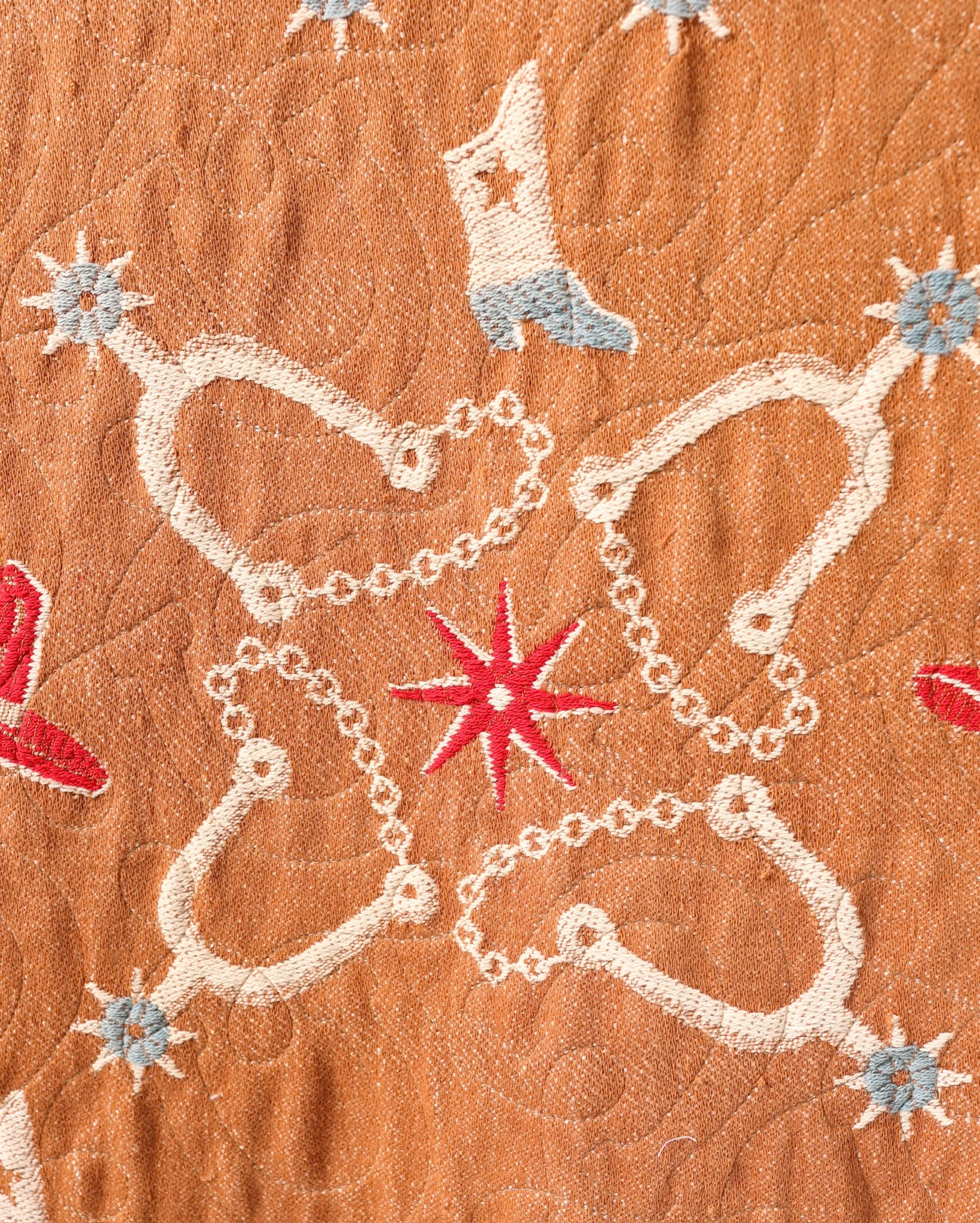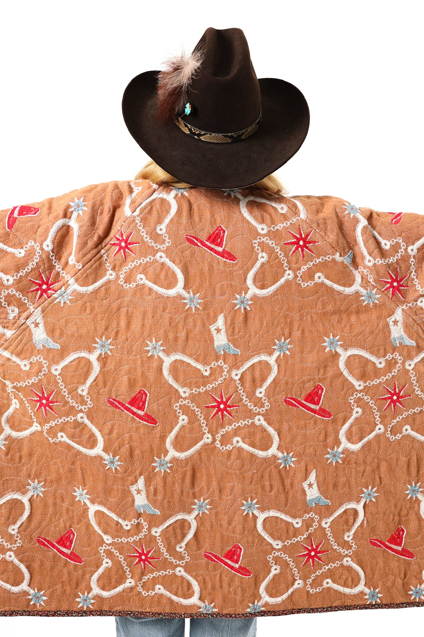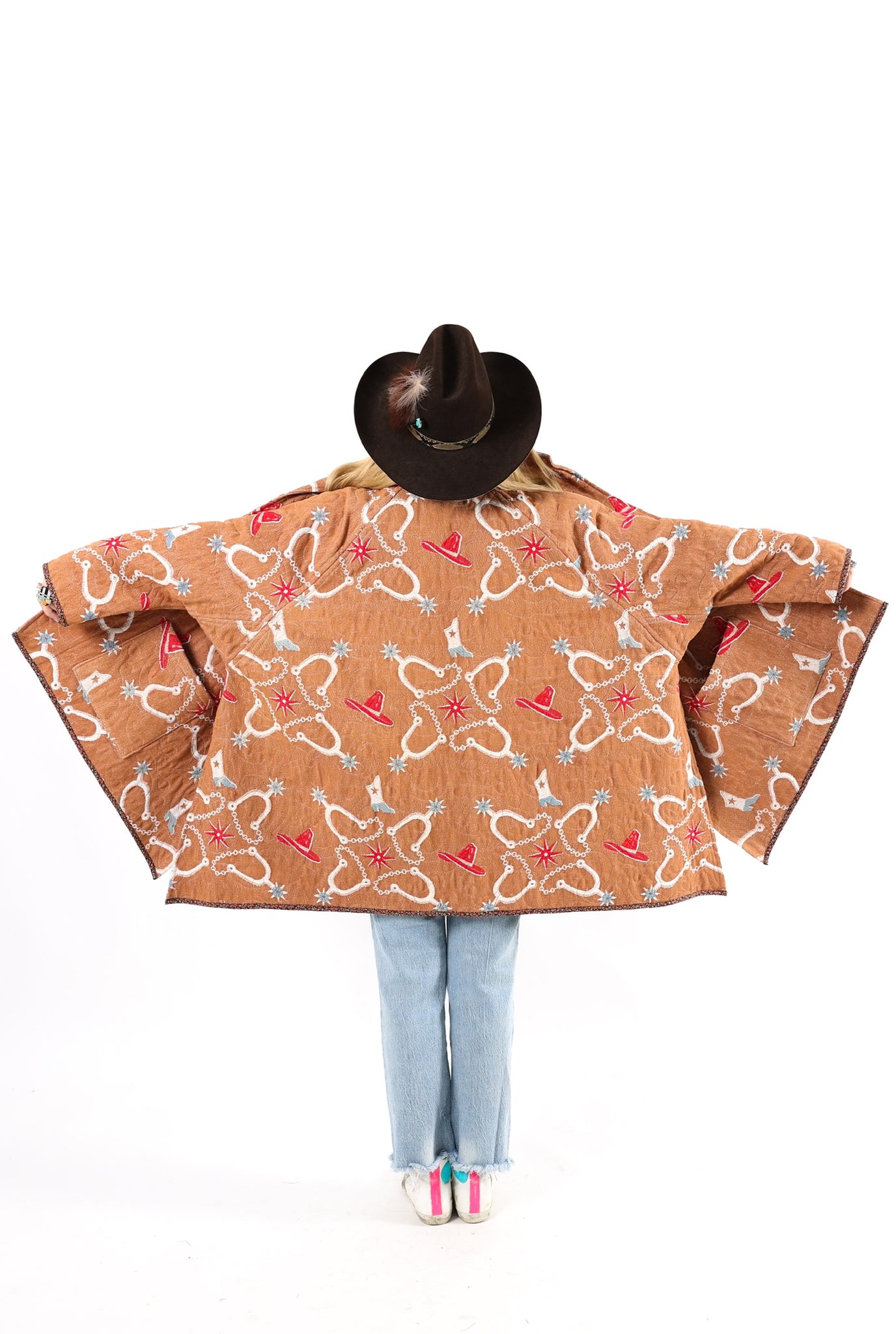 This quilt is a combination of a mid-century Bates bedspread and rare Alexander Henry western novelty fabric. You will want to show of the backing fabric(inside of jacket) by wearing the jacket inside out or cuffing the sleeves. In our opinion, the jacket is thin, soft, lightweight, and has a beautiful drape. This is a Lady Lancaster 10/10. Please note, the Bates bedspread does have a little wear in a few isolated spots. Please see the iphone photo at the end of the listing. If you have further questions, please direct message us and we are happy to send you a video.