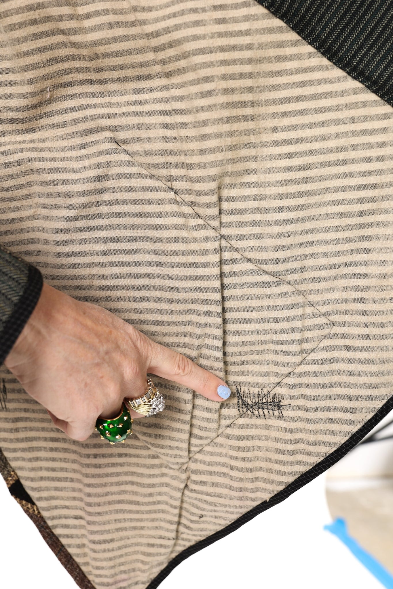 Please note that all of our jackets are made from antique quilts and the fabric reflects this. Our fabrics are sometimes older than 100 years old and are perfectly worn. We believe this is what makes them special and is part of their charm. All of our garments are pre-washed in a special restoration quilt wash. We recommend only spot cleaning if necessary.