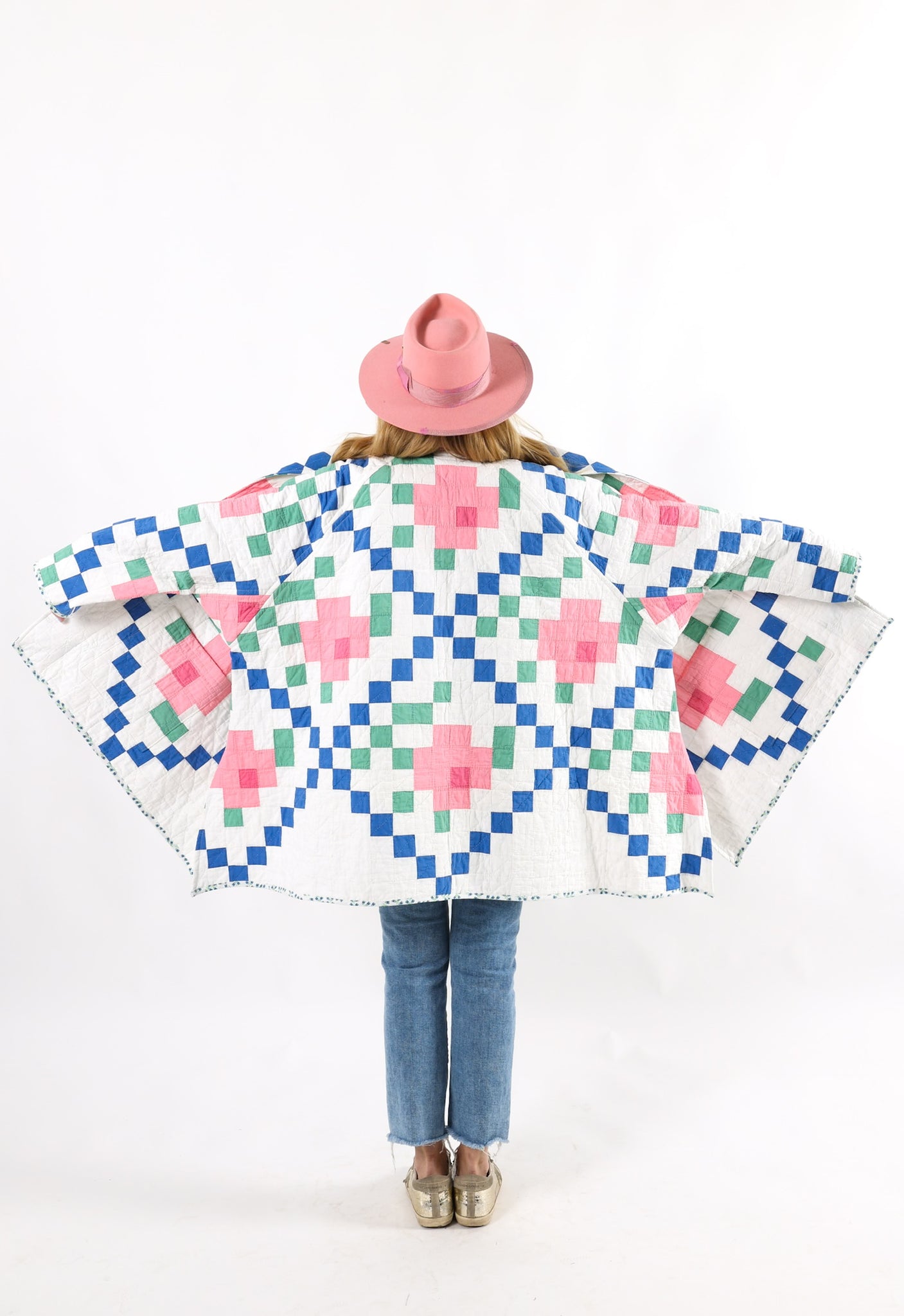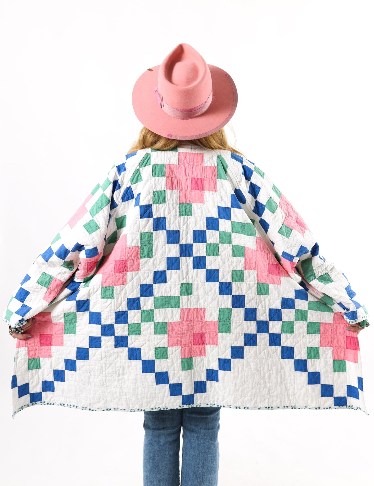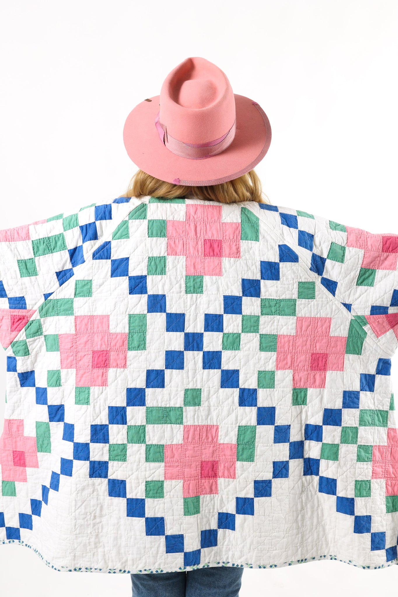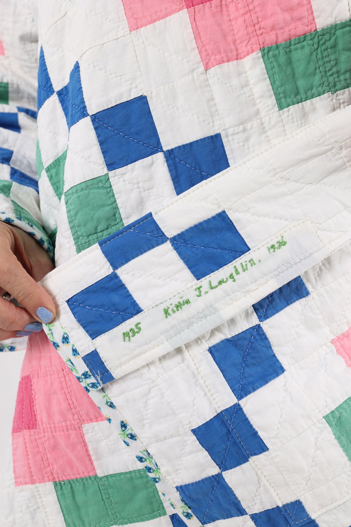 This is an American antique quilt started in 1935 and completed in 1936 by Kittie J. Loughlin. We know this because Kittie hand embroidered her name and these dates into the quilt. We have preserved and placed this provenance inside the shawl. Kittie beautifully hand quilted and hand sewed this quilt, which is a labor of love and a lost art. It is a traditional Irish Chain quilt pattern with the addition of flowers inside the Irish Chain. The quilt is absolutely gorgeous. If you live in a warmer climate, this is a great jacket for you. This is what we consider to be a summer weight quilt, meaning that it has little to no batting and was made more for aesthetics than warmth. In our opinion, the quilt is super thin, super soft, extremely lightweight, and has a super flattering drape. Please note the sleeves are longer than our standard Helen pattern. If you have further questions, please direct message us and we are happy to send you a video.