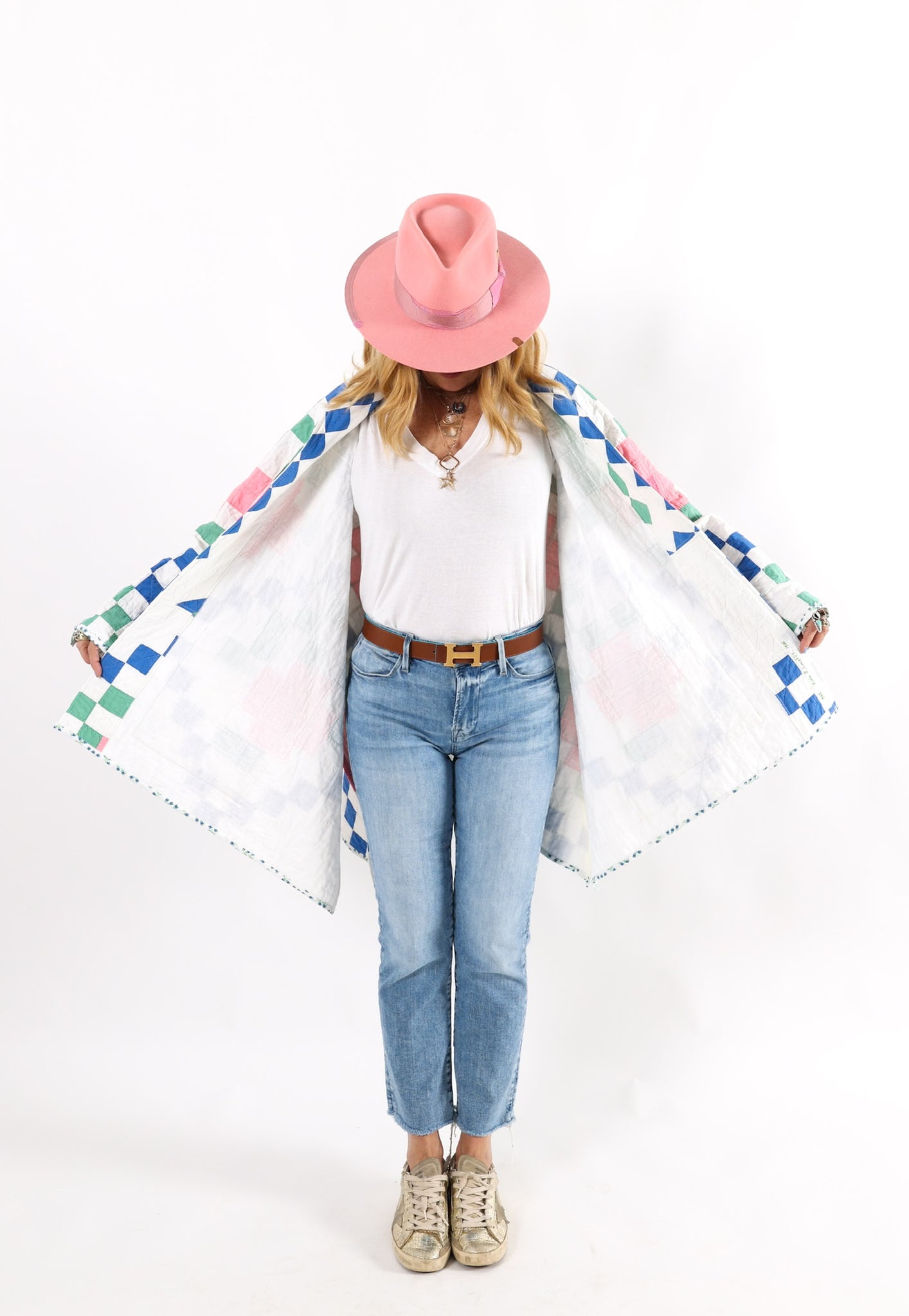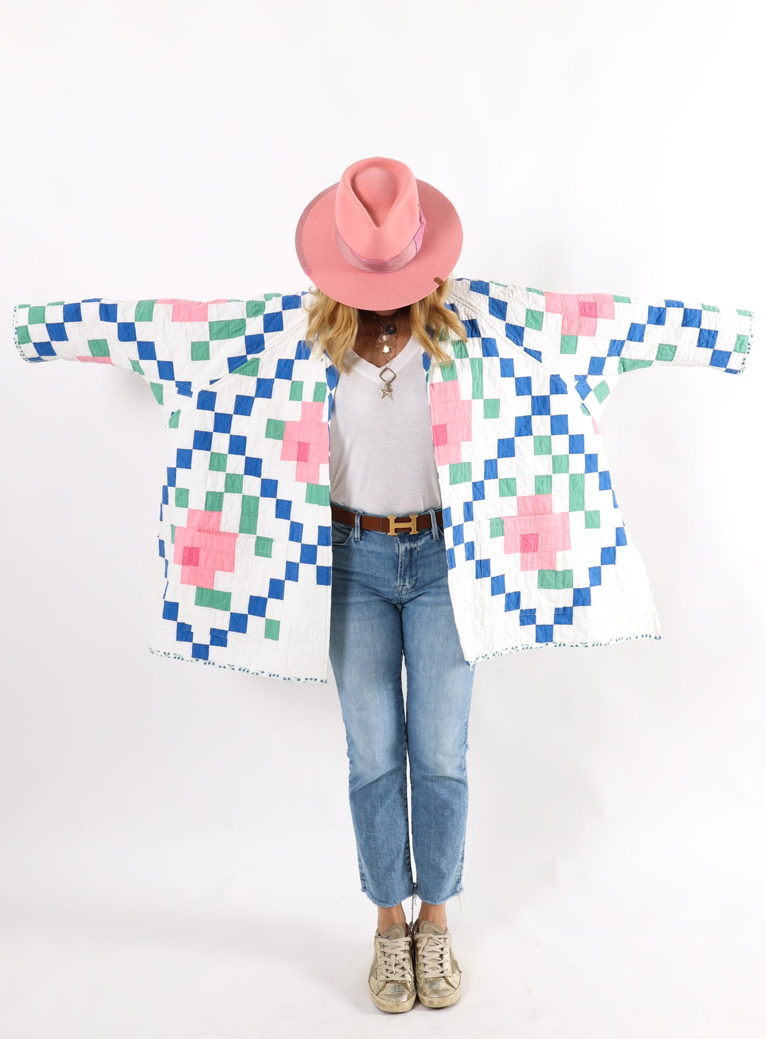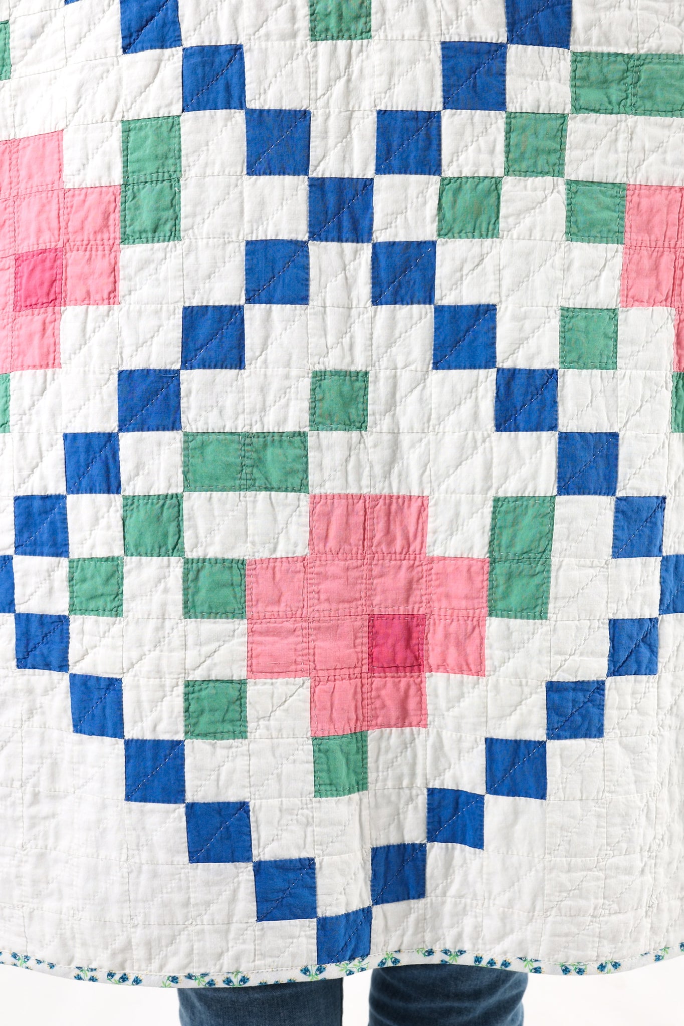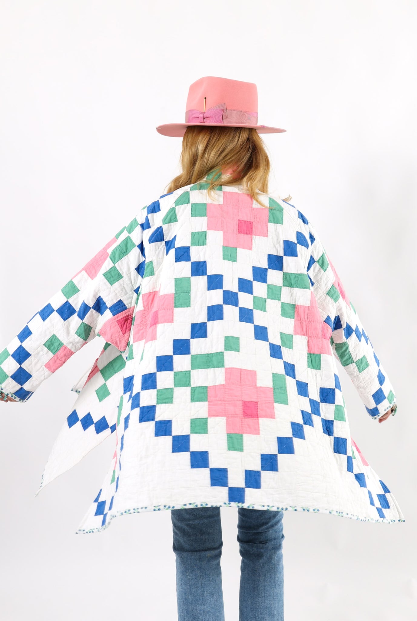 This is an American antique quilt started in 1935 and completed in 1936 by Kittie J. Loughlin. We know this because Kittie hand embroidered her name and these dates into the quilt. We have preserved and placed this provenance inside the shawl. Kittie beautifully hand quilted and hand sewed this quilt, which is a labor of love and a lost art. It is a traditional Irish Chain quilt pattern with the addition of flowers inside the Irish Chain. The quilt is absolutely gorgeous. If you live in a warmer climate, this is a great jacket for you. This is what we consider to be a summer weight quilt, meaning that it has little to no batting and was made more for aesthetics than warmth. In our opinion, the quilt is super thin, super soft, extremely lightweight, and has a super flattering drape. Please note the sleeves are longer than our standard Helen pattern. If you have further questions, please direct message us and we are happy to send you a video.