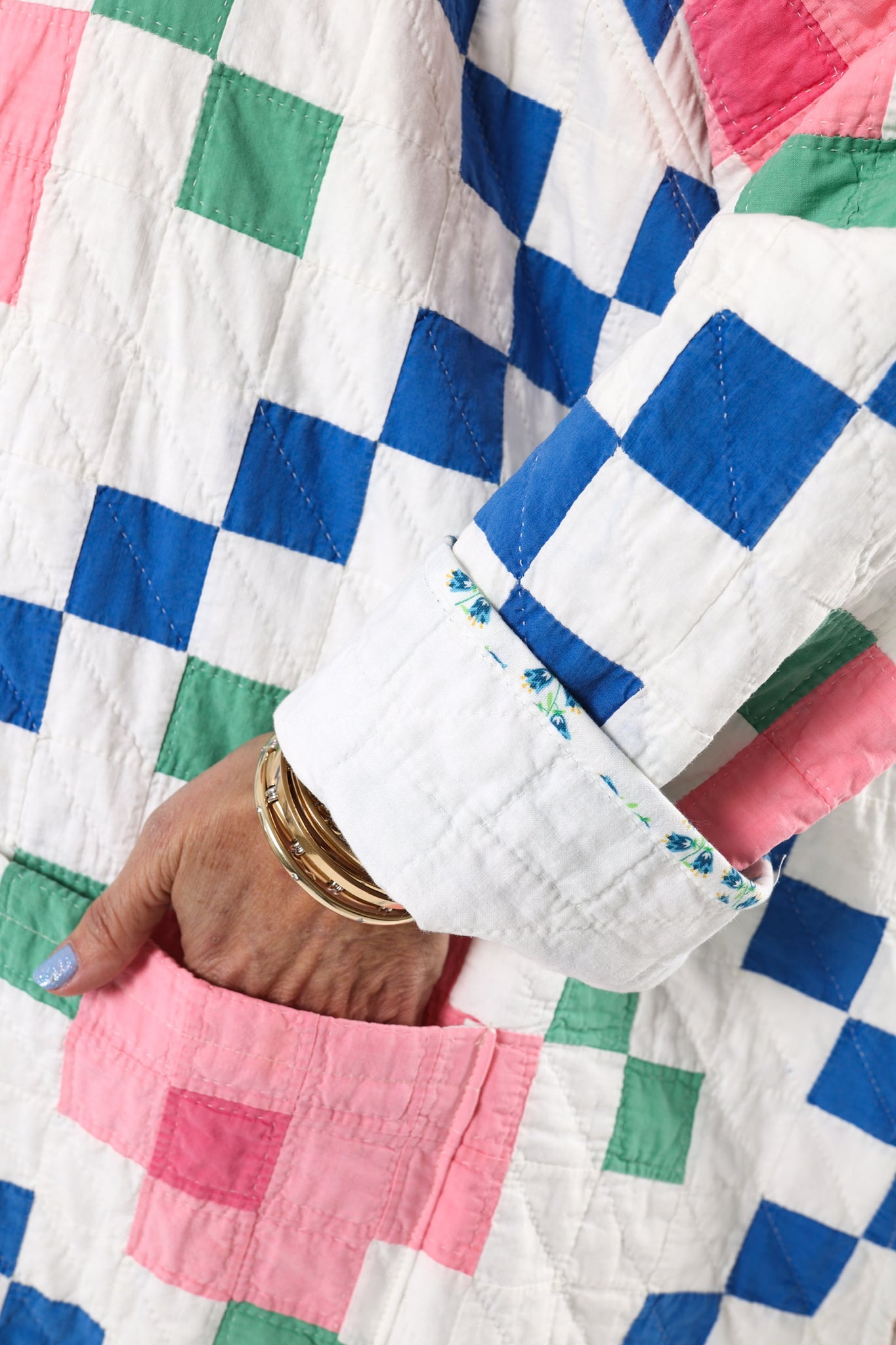 Please note that all of our jackets are made from antique quilts and the fabric reflects this. Our fabrics are sometimes older than 100 years old and are perfectly worn. We believe this is what makes them special and is part of their charm. All of our garments are pre-washed in a special restoration quilt wash. We recommend only spot cleaning if necessary.
