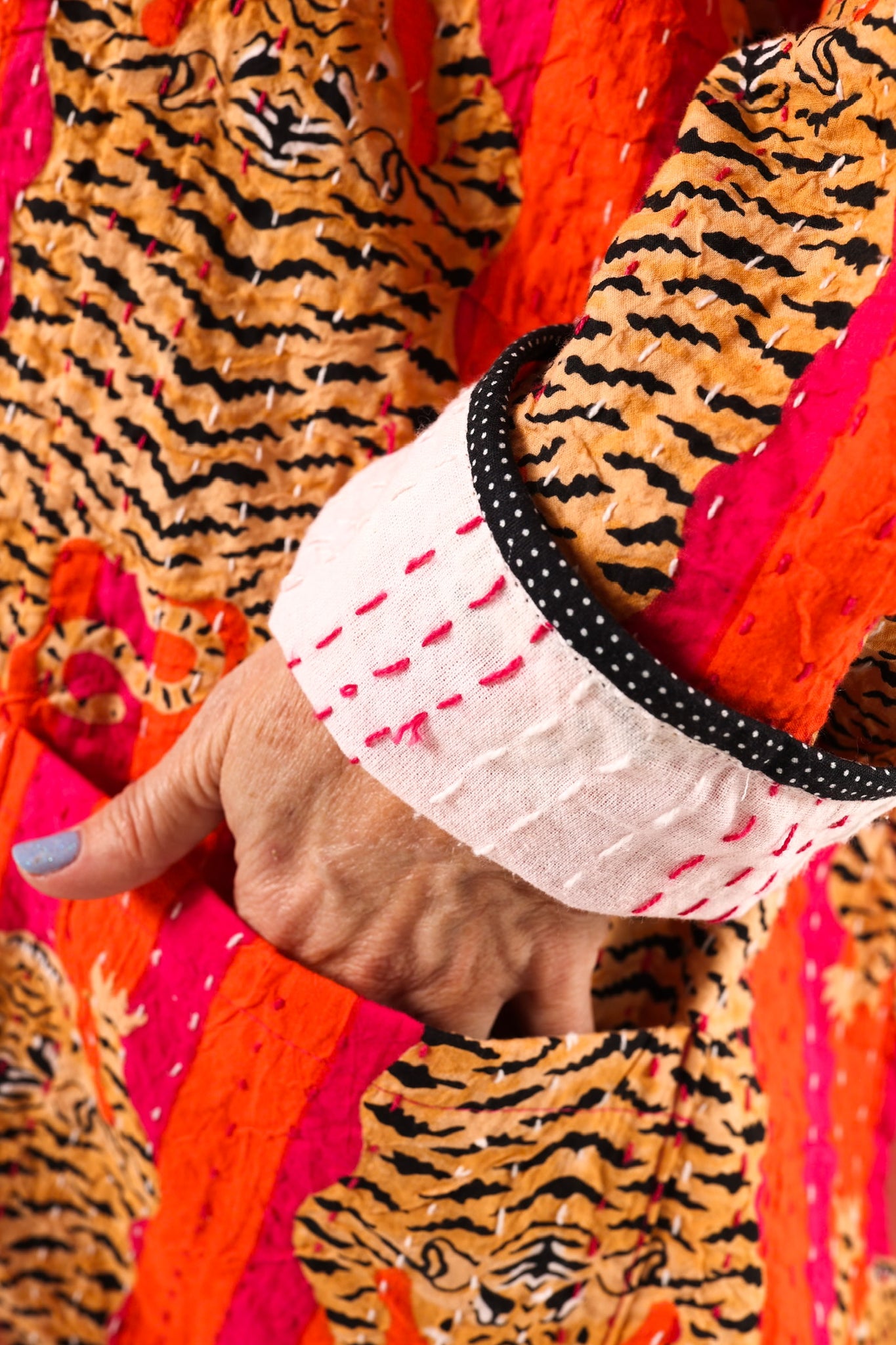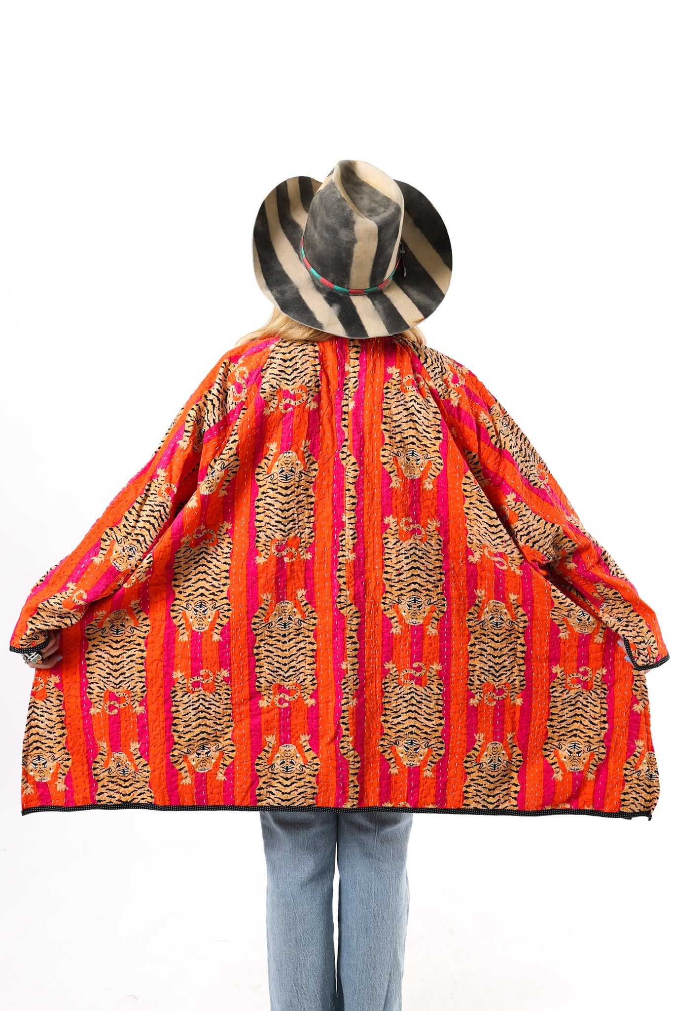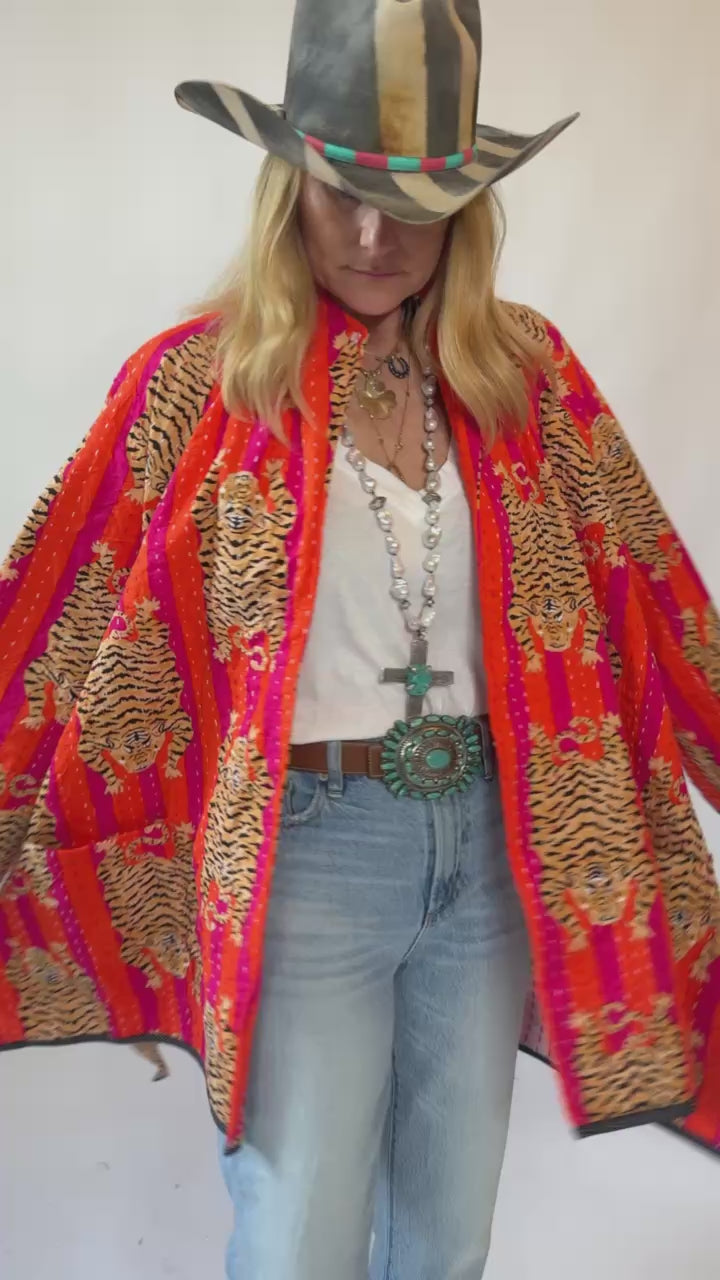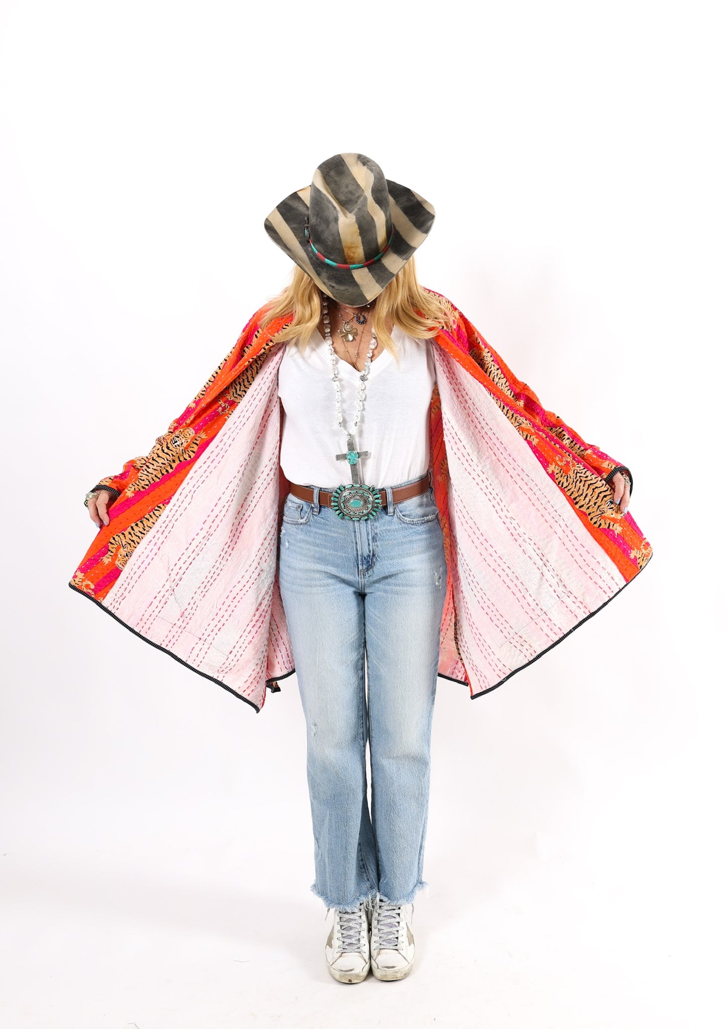 This is a contemporary Indian Kantha quilt. It is completely hand stitched and hand block printed in India. Similar to the American quilting technique, the Indian version of quilting was passed down from generation to generation. The running stitch is a much looser and straight stitch. This piece is extremely thin and lightweight. It is perfect for those who want a quilt but live in a hot climate or tend to overheat. The quilt contains no batting or loft (puffiness). The sleeves are 3” longer than our standard Helen pattern. It is important to note that Kantha quilts snag much easier than American quilts. If this is something that would bother you, please consider other items. If you have further questions, please direct message us and we are happy to send you a video.