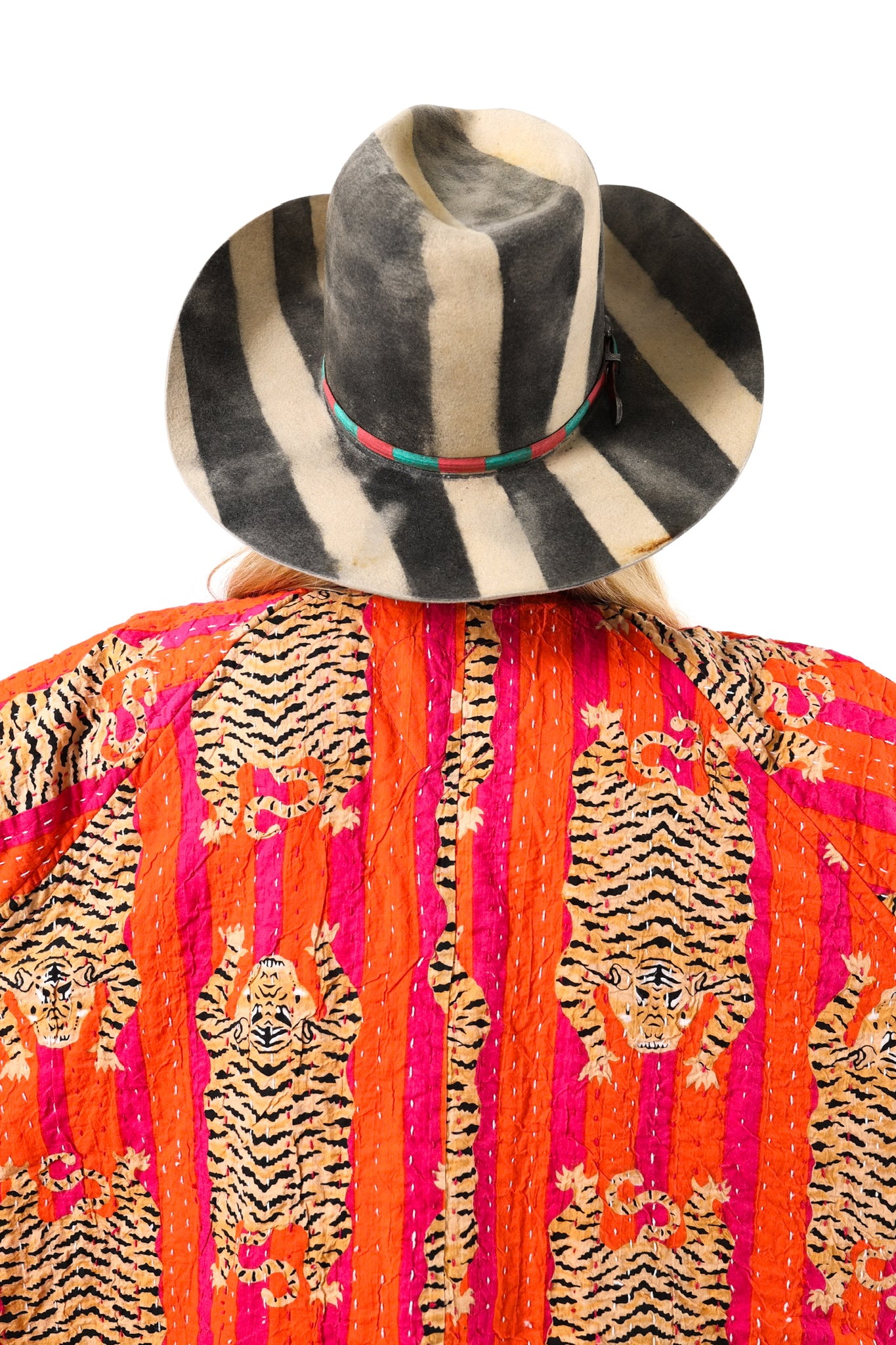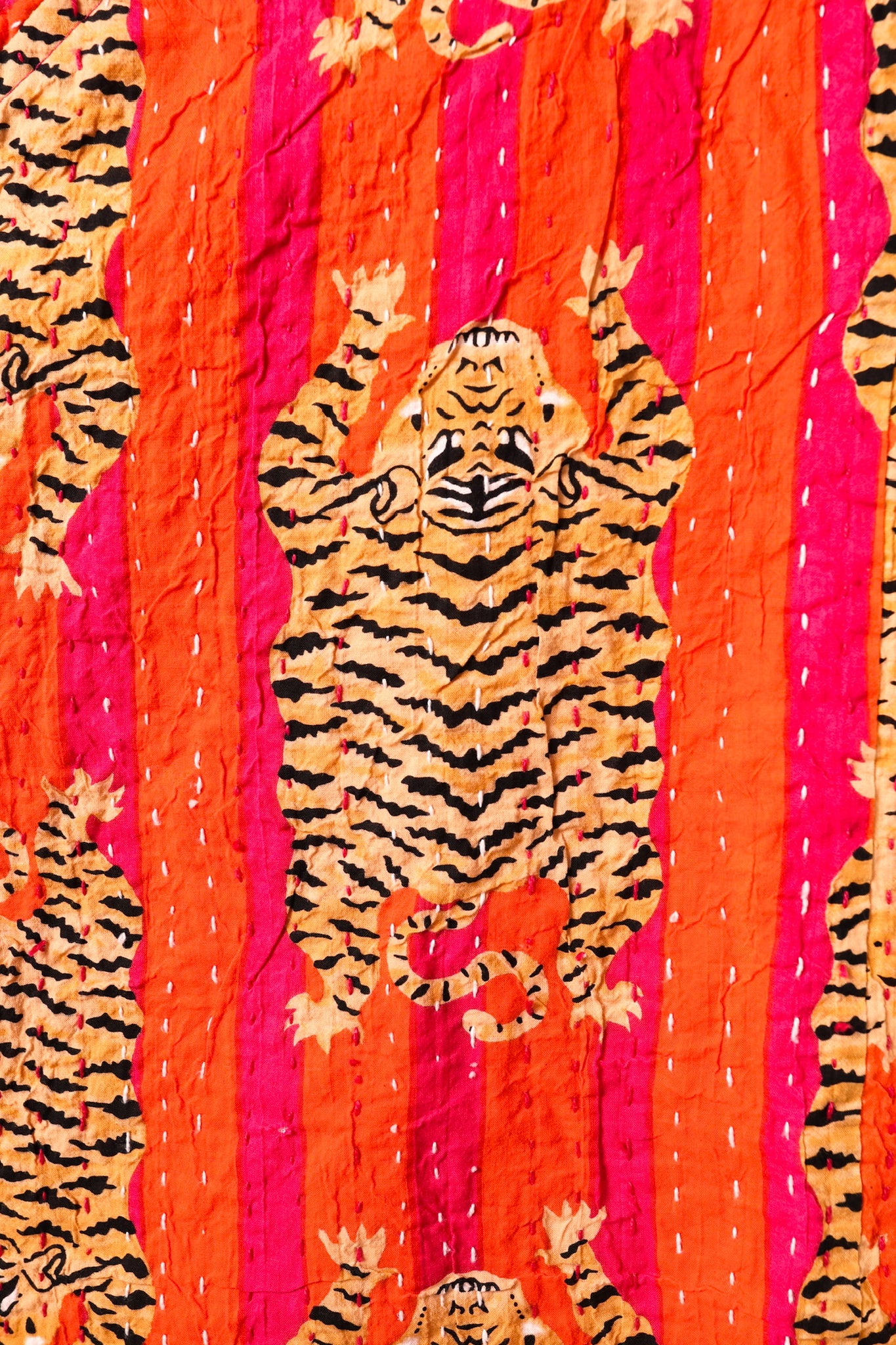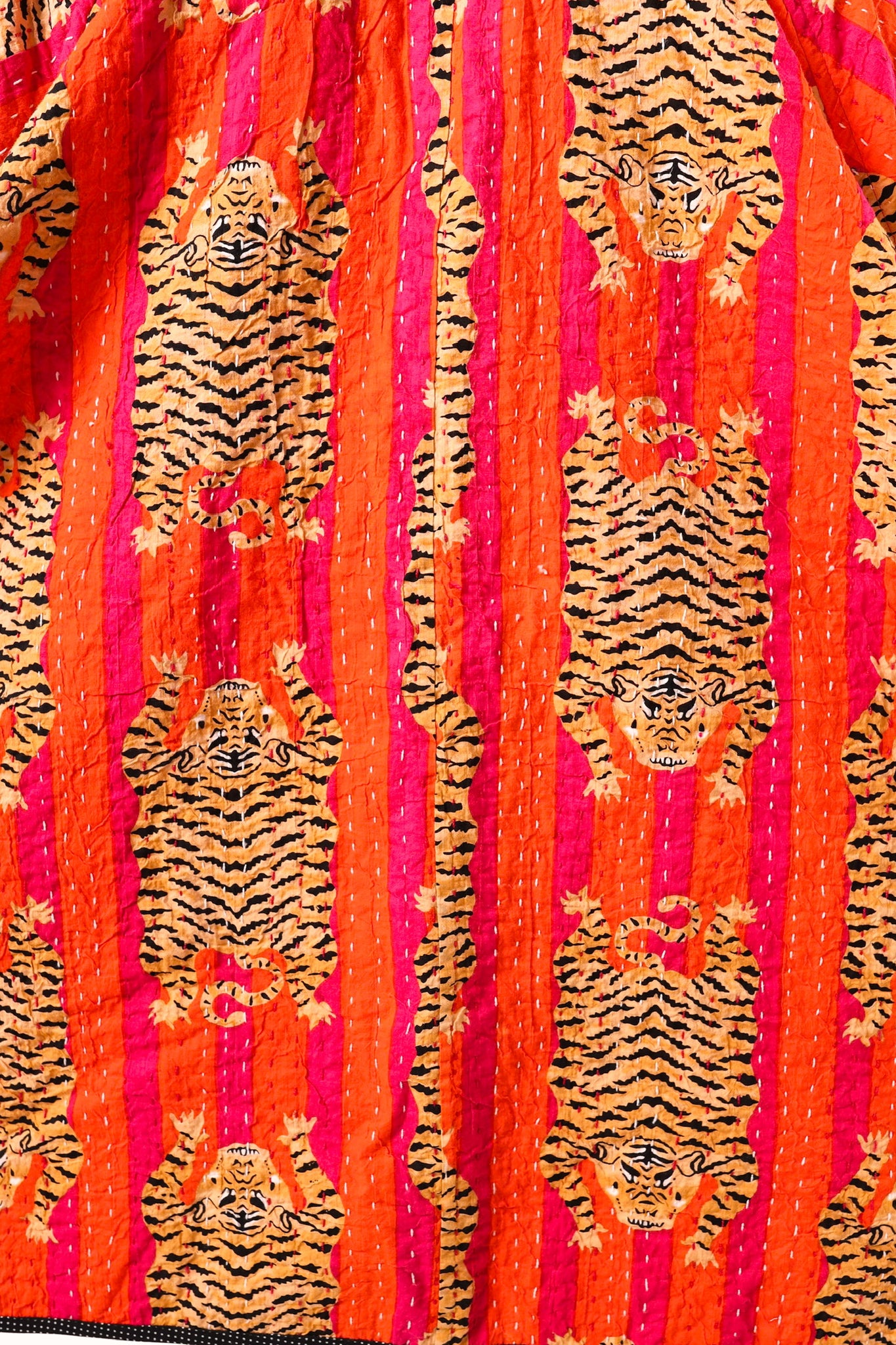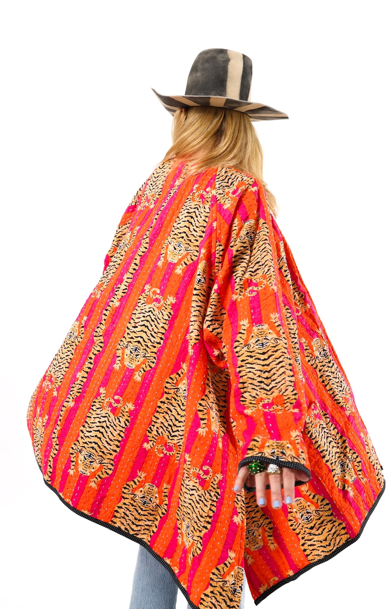 This is a contemporary Indian Kantha quilt. It is completely hand stitched and hand block printed in India. Similar to the American quilting technique, the Indian version of quilting was passed down from generation to generation. The running stitch is a much looser and straight stitch. This piece is extremely thin and lightweight. It is perfect for those who want a quilt but live in a hot climate or tend to overheat. The quilt contains no batting or loft (puffiness). The sleeves are 3” longer than our standard Helen pattern. It is important to note that Kantha quilts snag much easier than American quilts. If this is something that would bother you, please consider other items. If you have further questions, please direct message us and we are happy to send you a video.